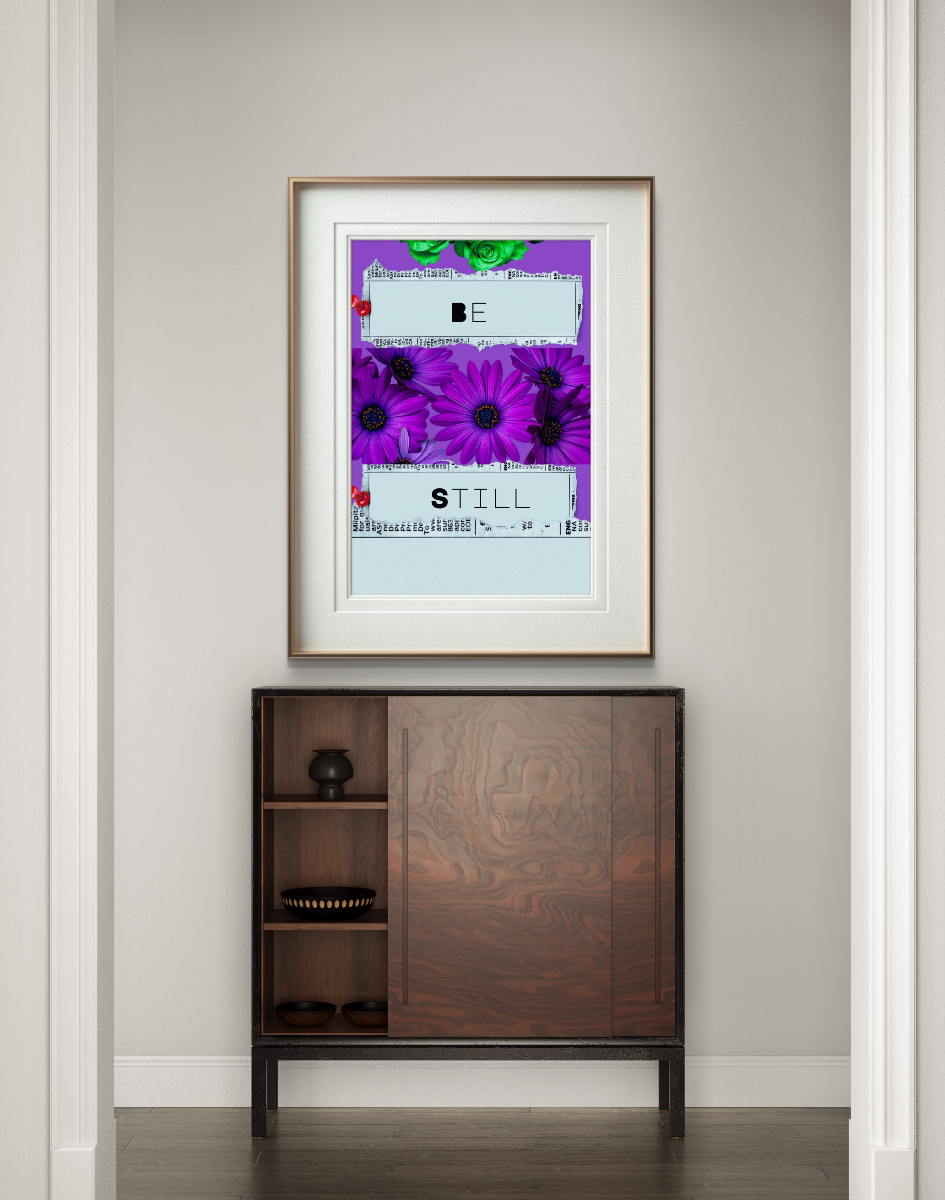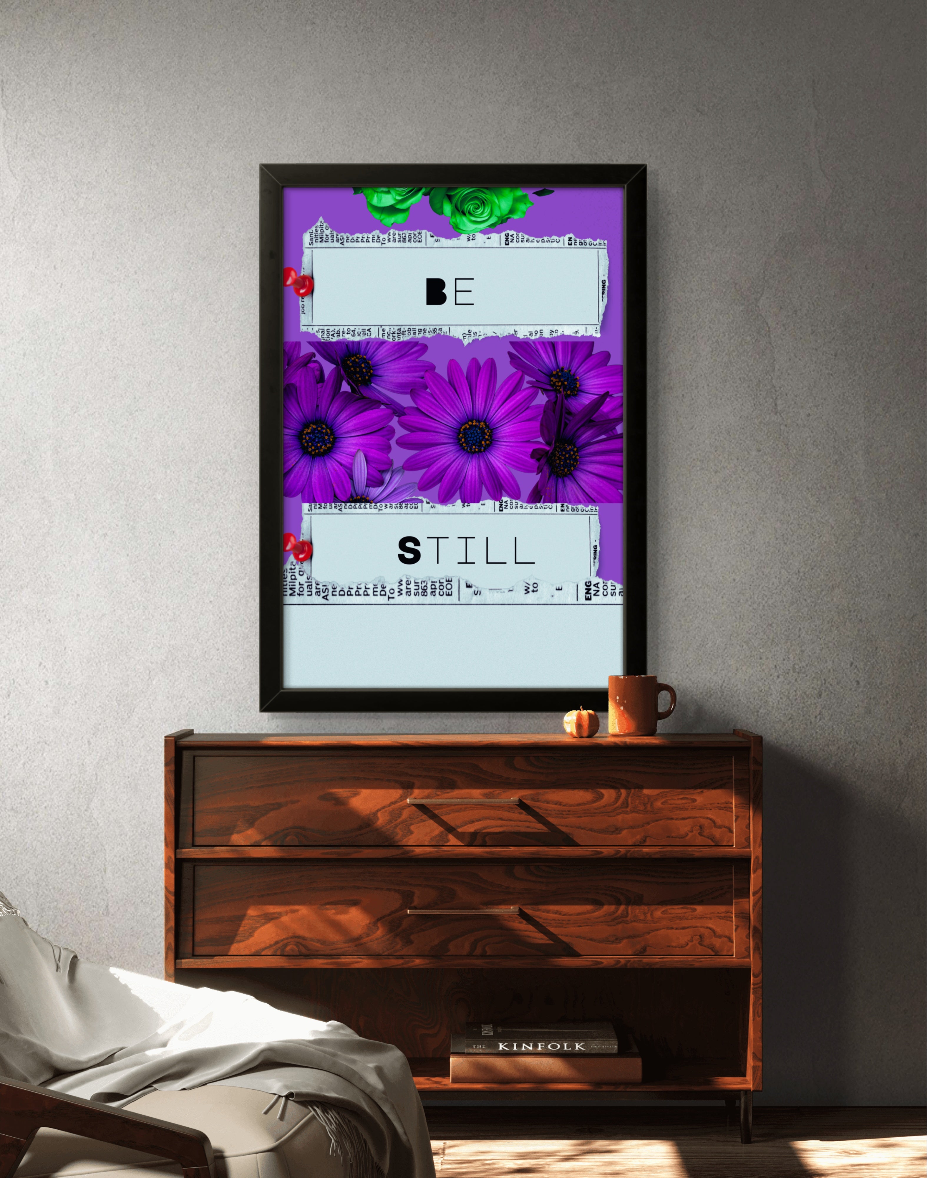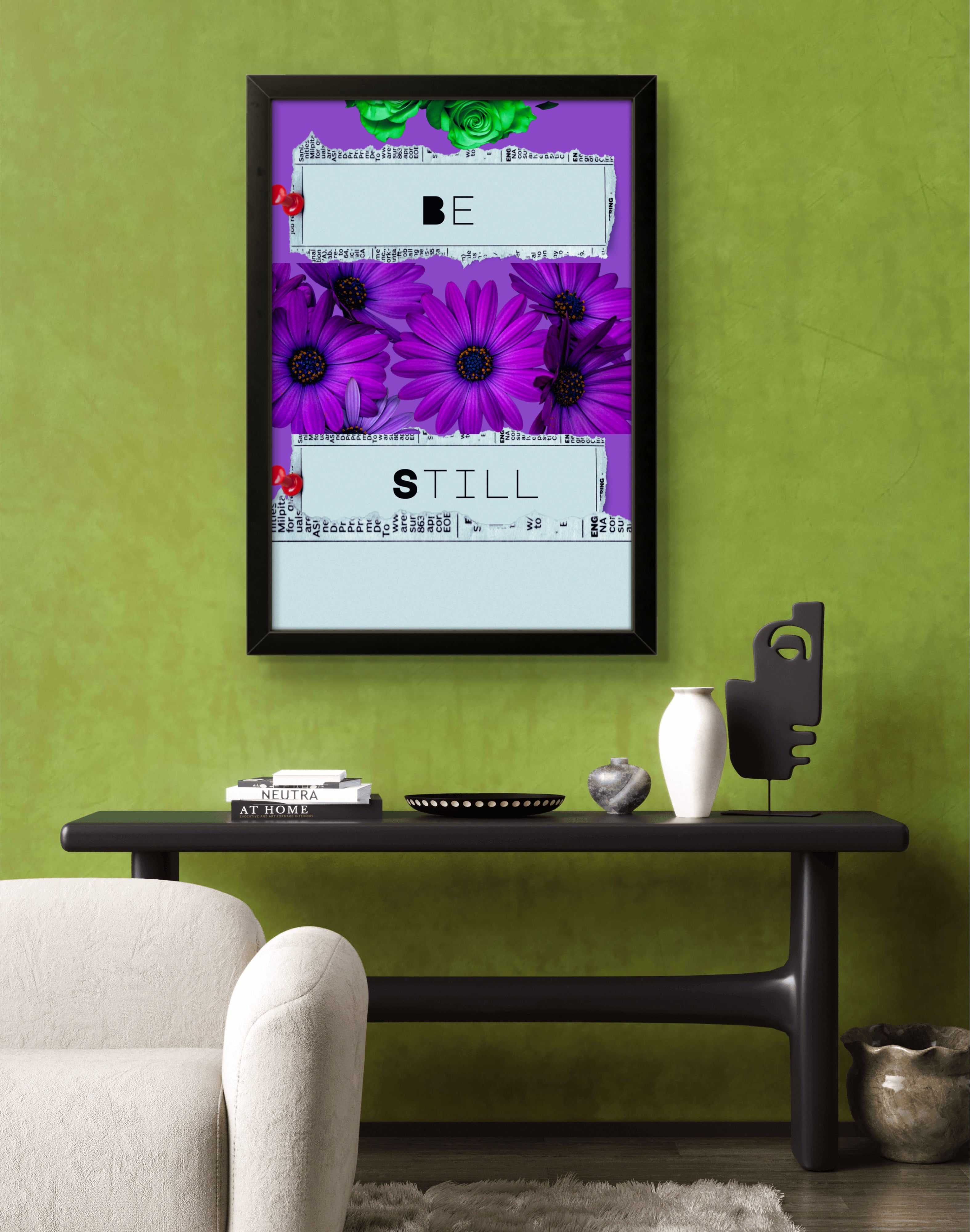 Discover the calming allure of Be Still, an abstract art print that harmoniously blends bold aesthetics with a profound message. Set against a backdrop of vibrant purple, this artwork captures attention with its striking color and compelling design.