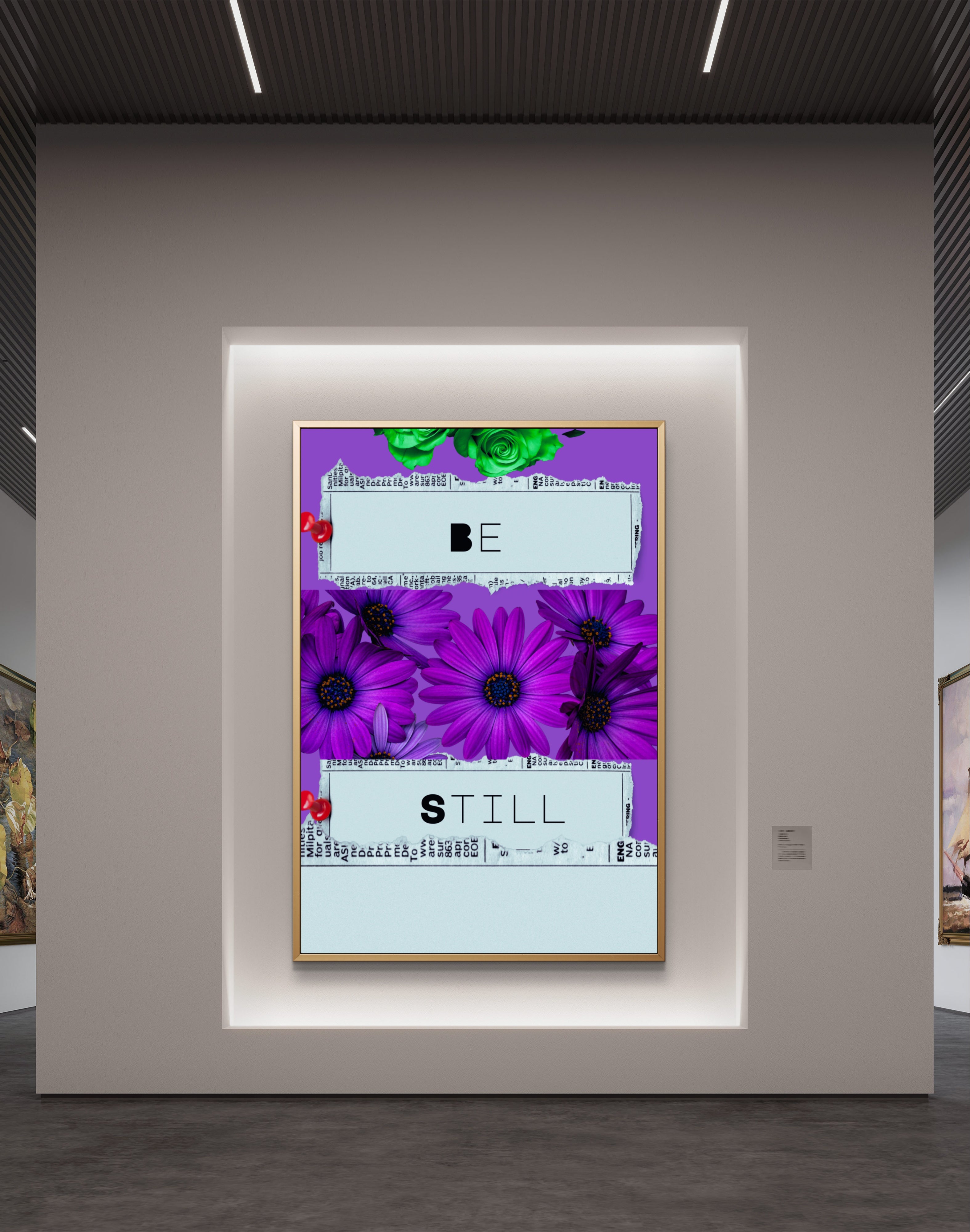 At the heart of the composition, newspaper shreds spell out the evocative phrase "Be Still," subtly layered into the art. These fragments of text are framed by delicate purple flowers that weave through the words, adding a touch of natural elegance and softness to the bold, energetic background.