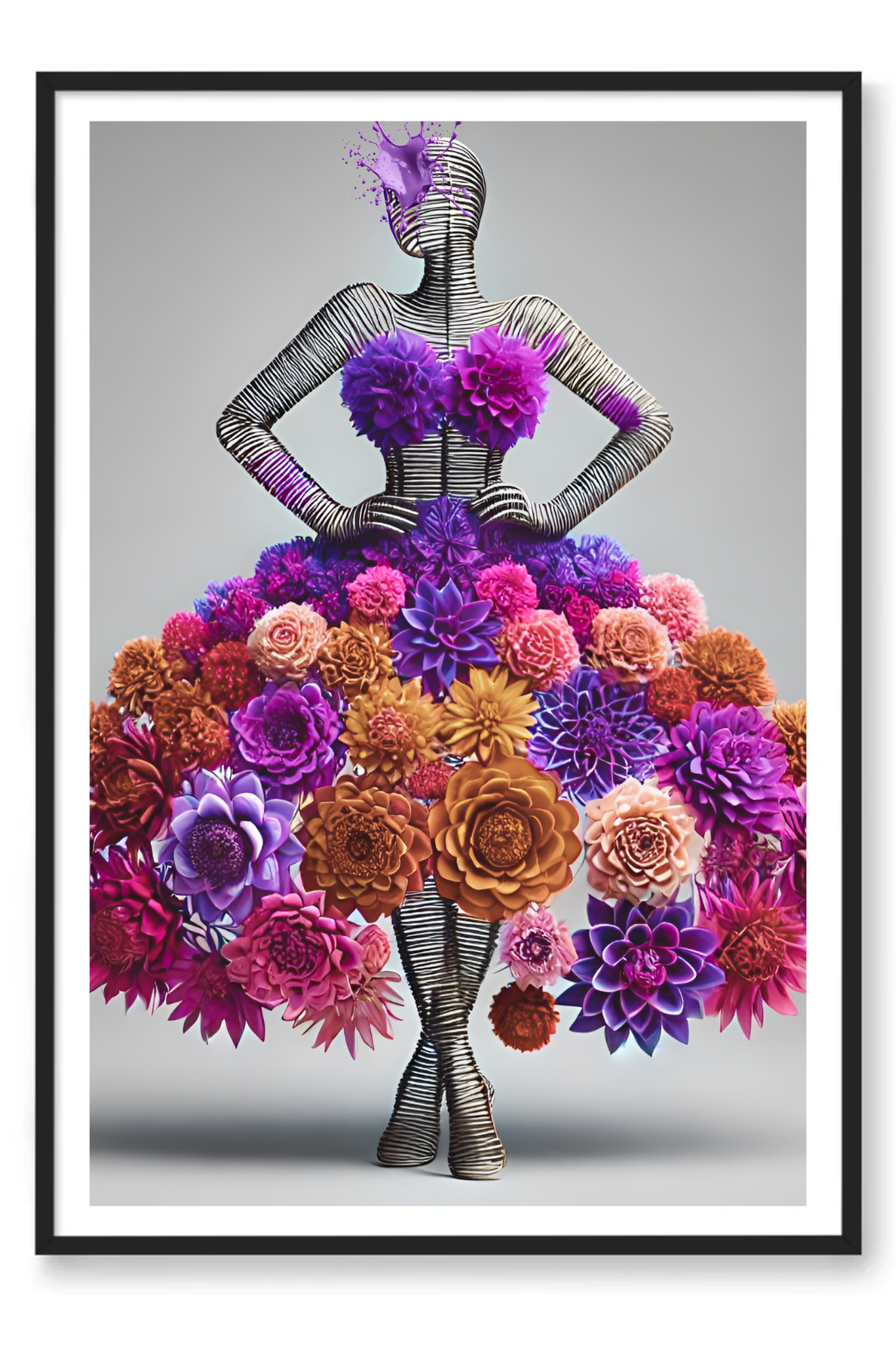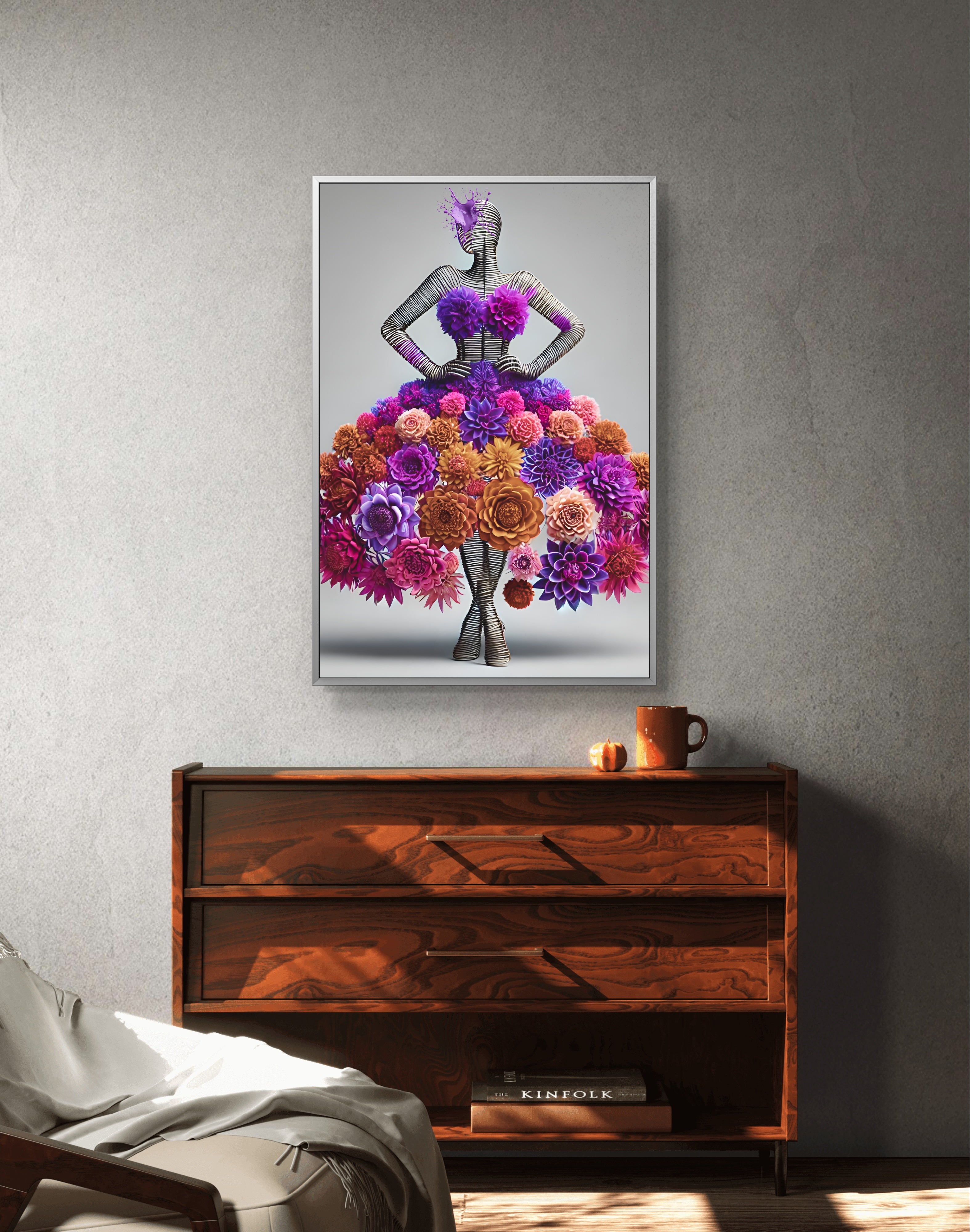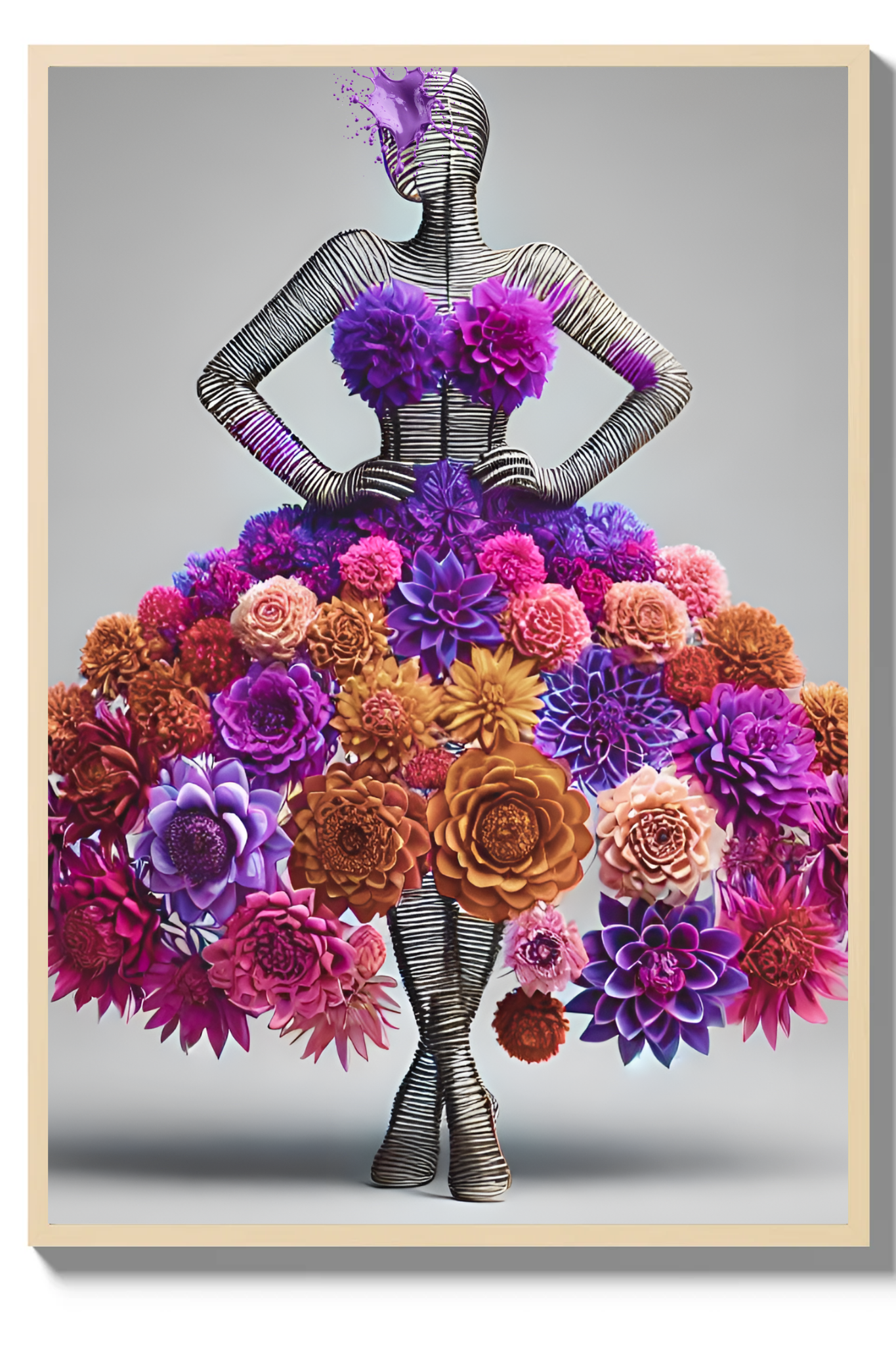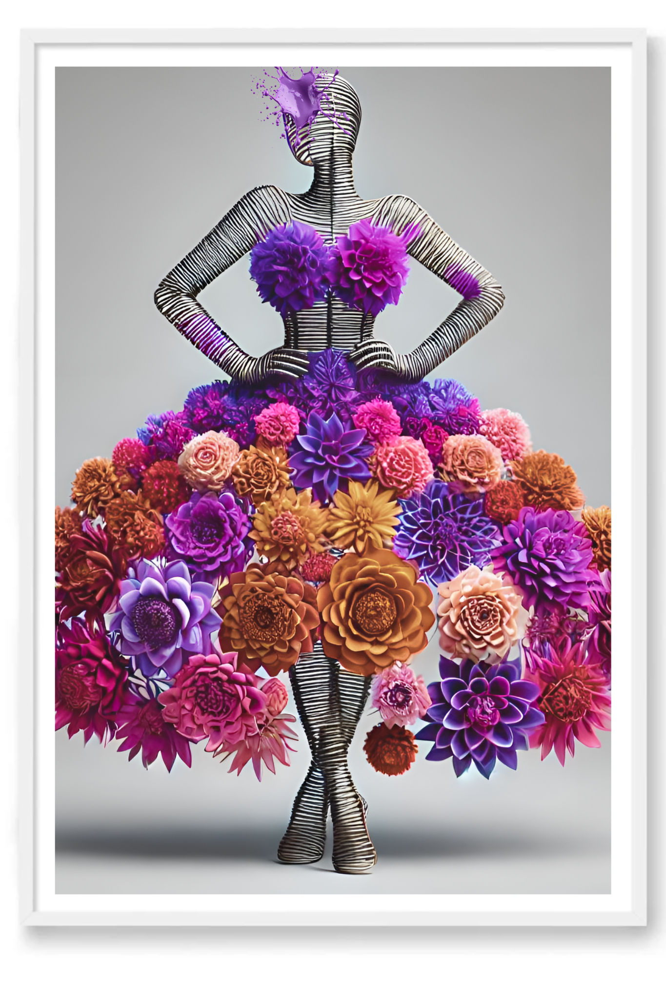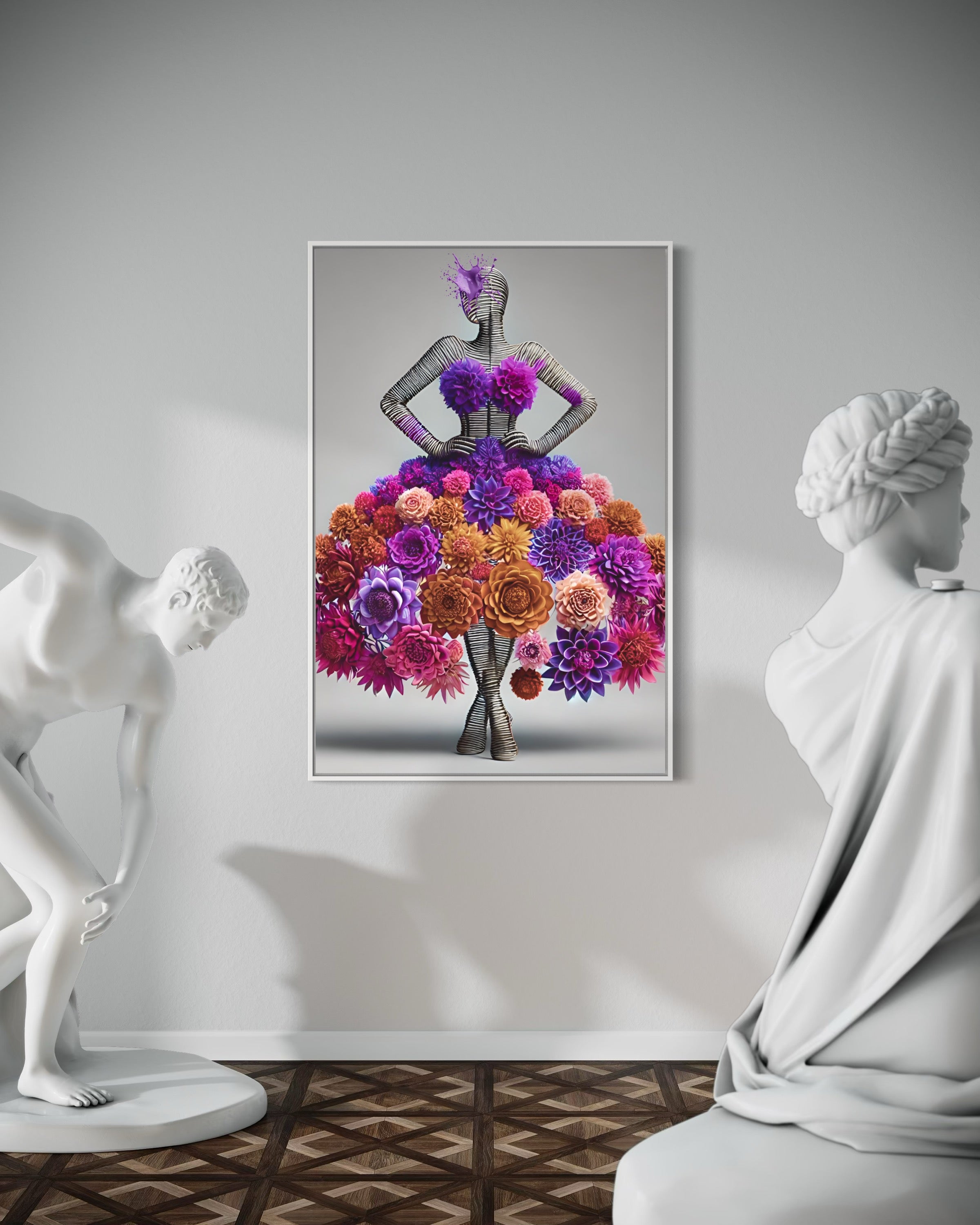 Infuse your space with the majestic allure of Blossom, a stunning abstract art print that captures the essence of royal flourishing. This evocative image showcases a roped, wired figure elegantly adorned in a cascade of purple roses, each one symbolizing the grandeur and vitality of regal growth.