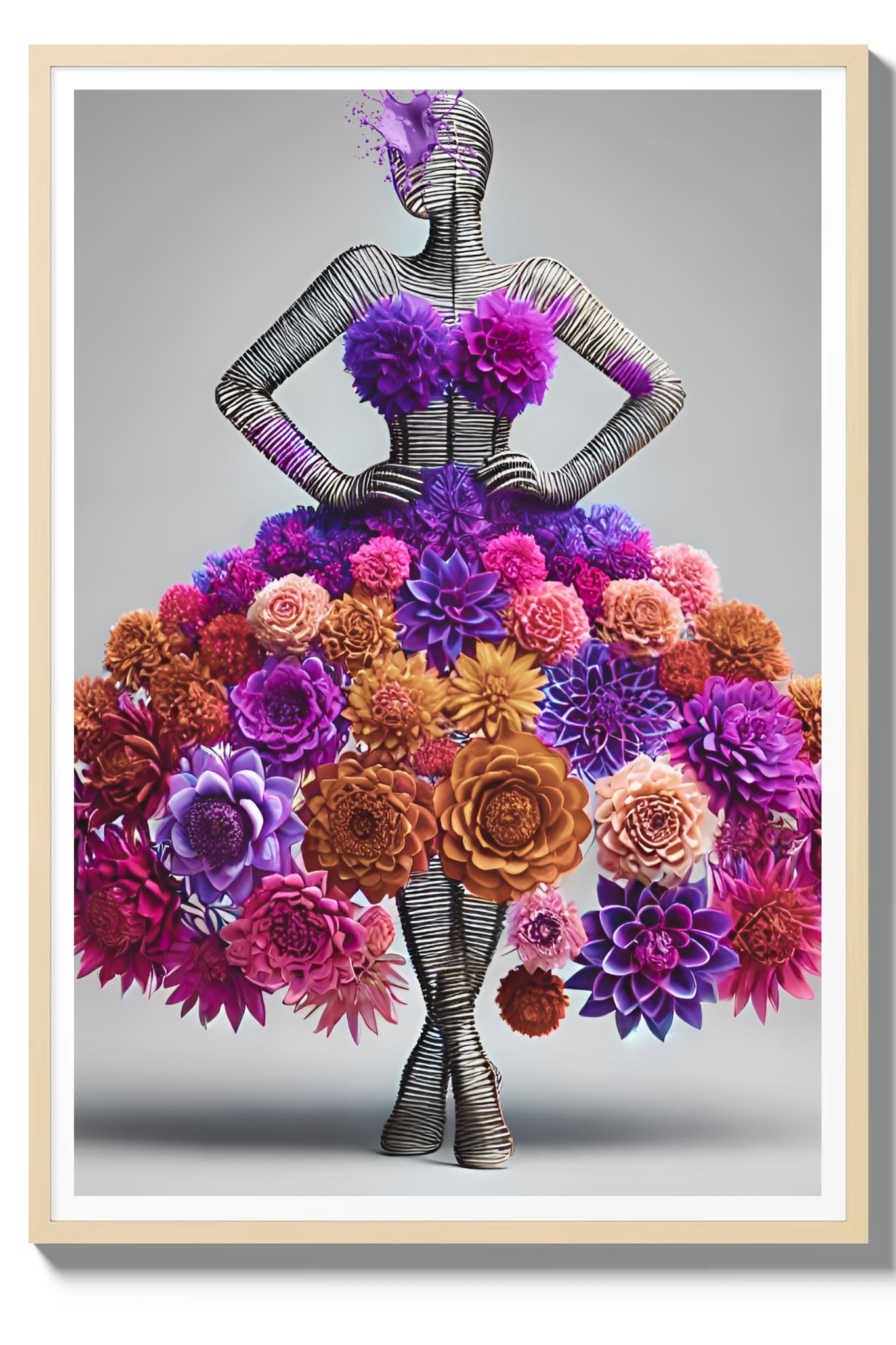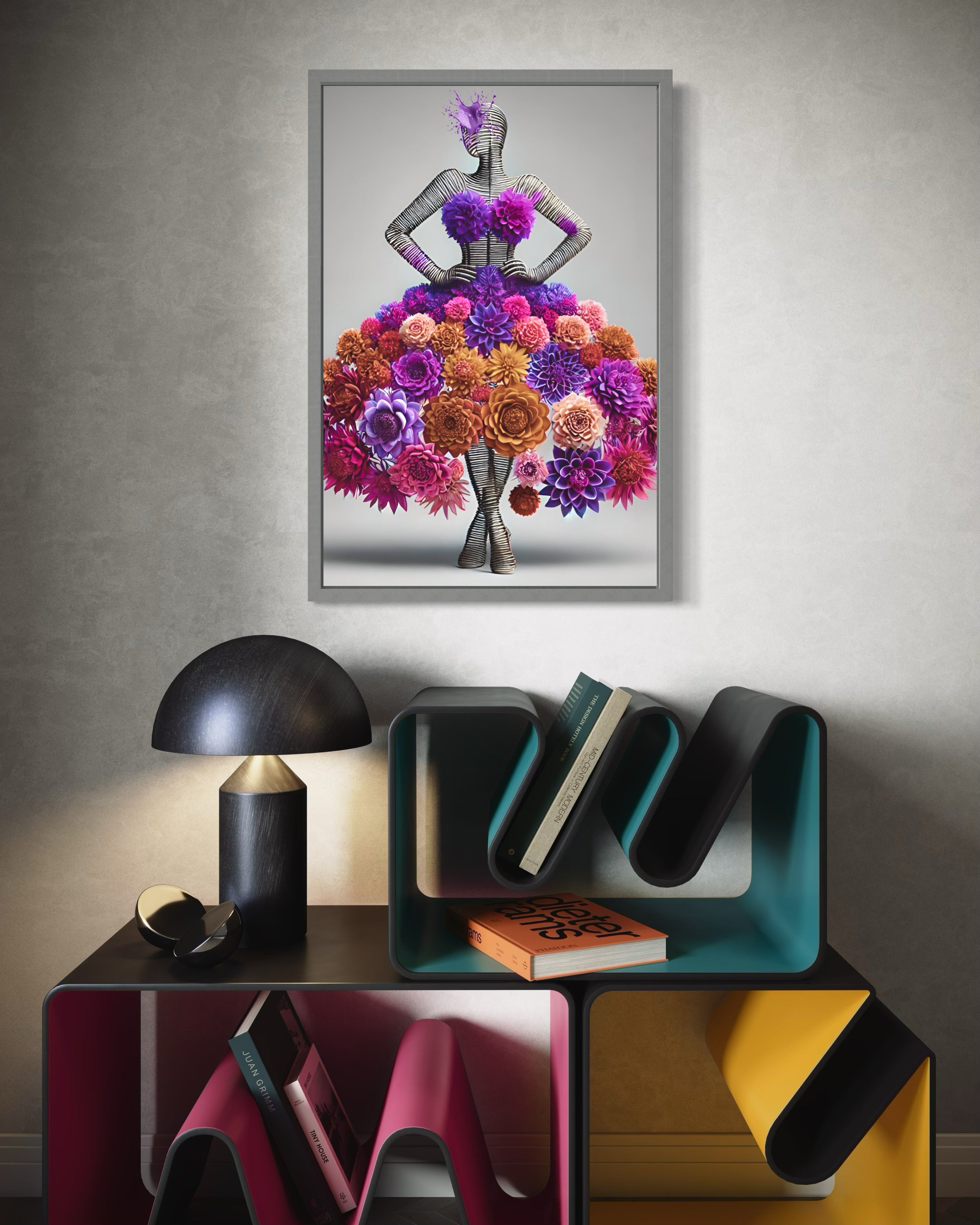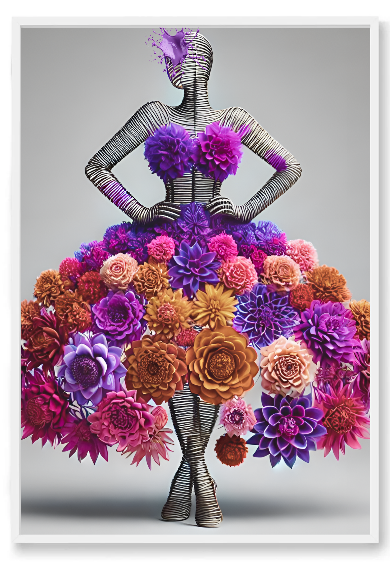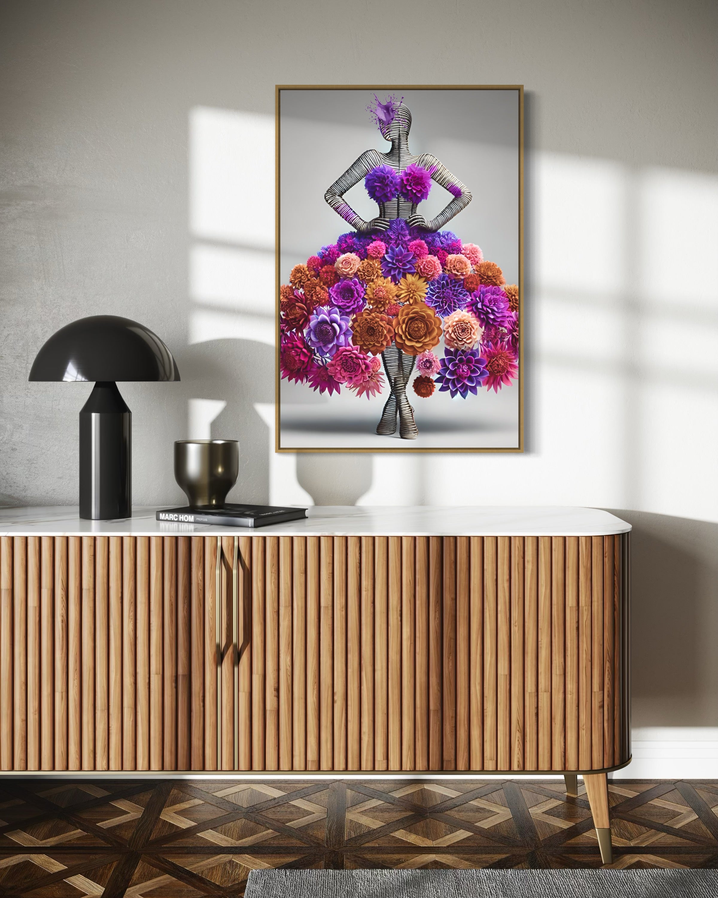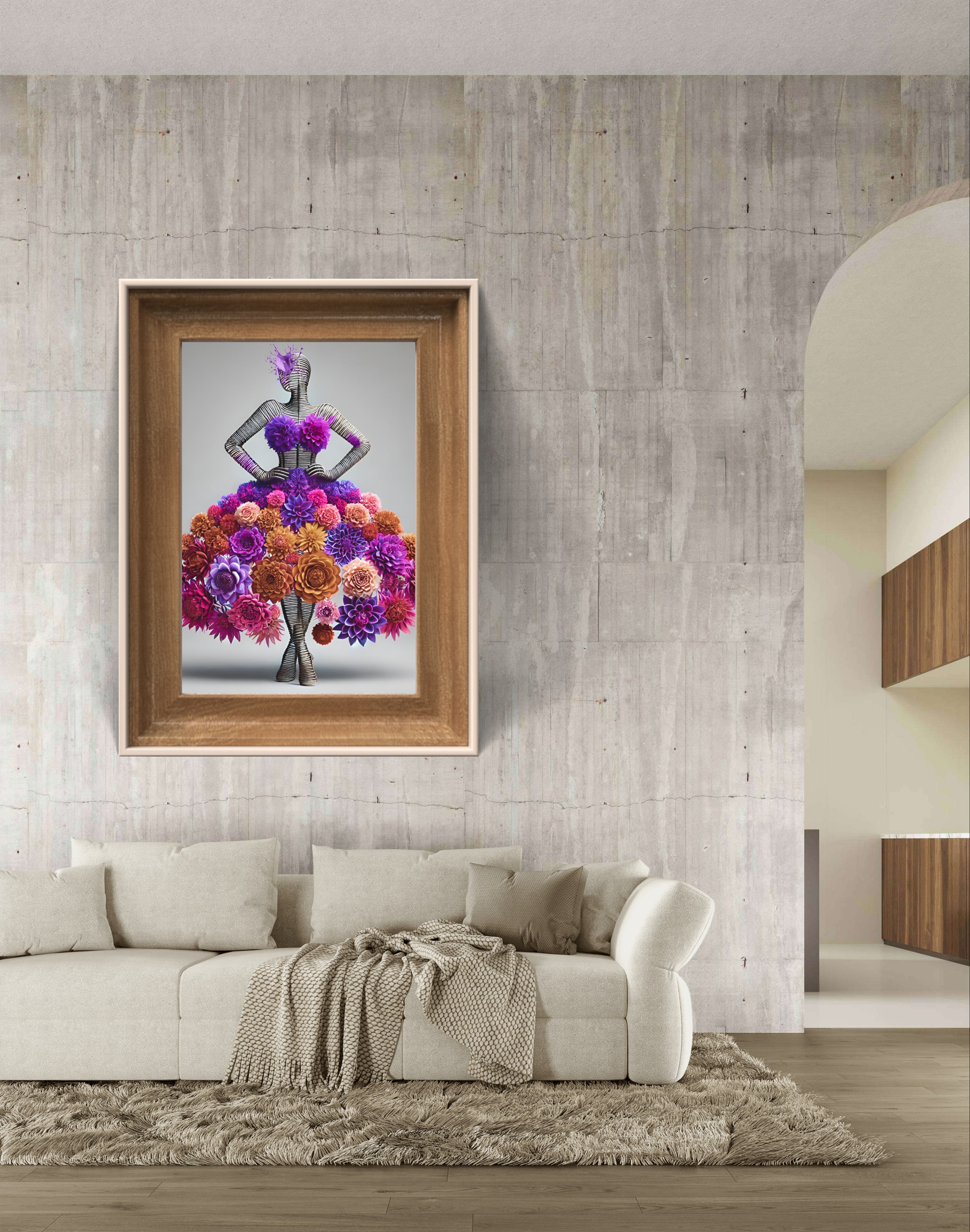 Infuse your space with the majestic allure of Blossom, a stunning abstract art print that captures the essence of royal flourishing. This evocative image showcases a roped, wired figure elegantly adorned in a cascade of purple roses, each one symbolizing the grandeur and vitality of regal growth.