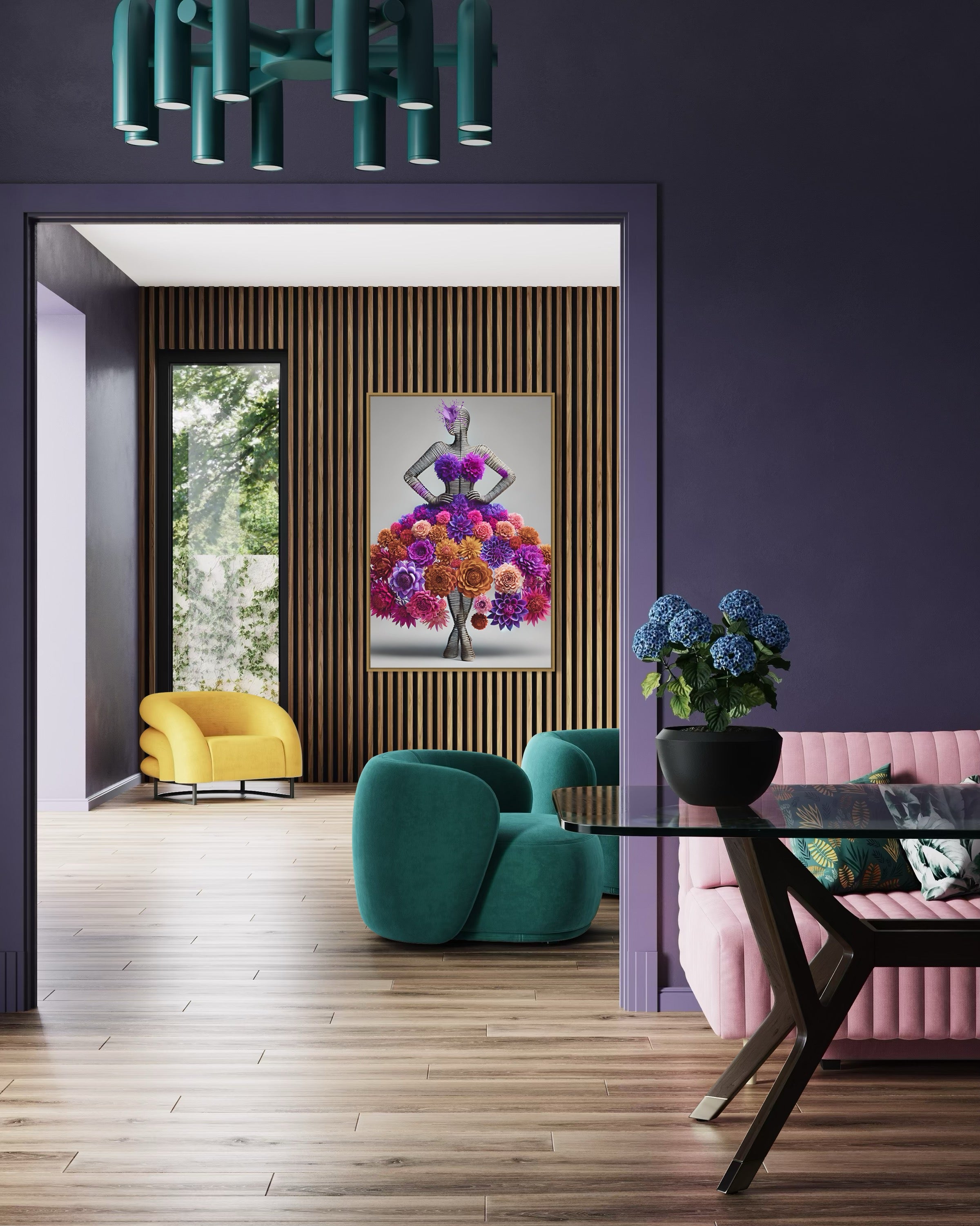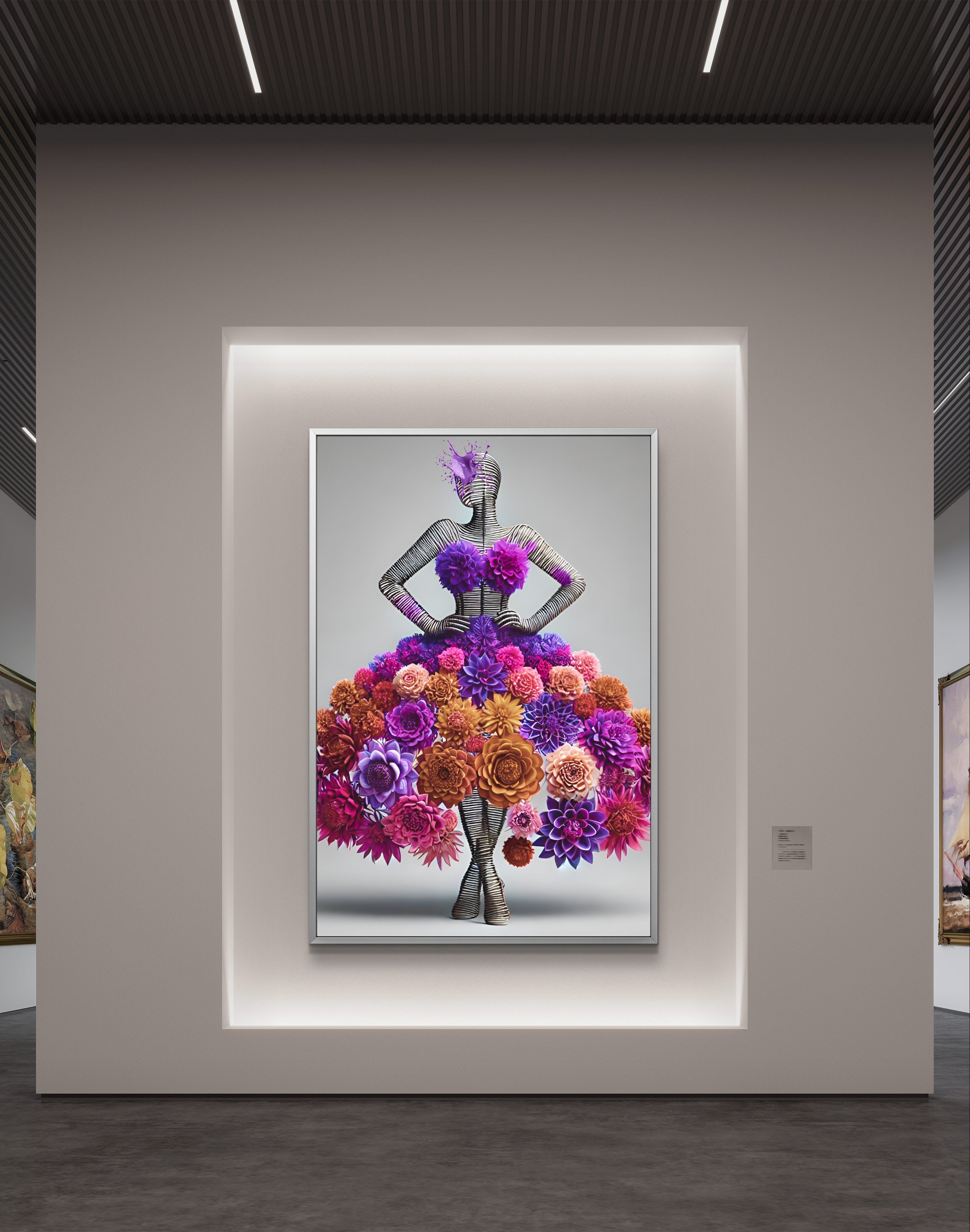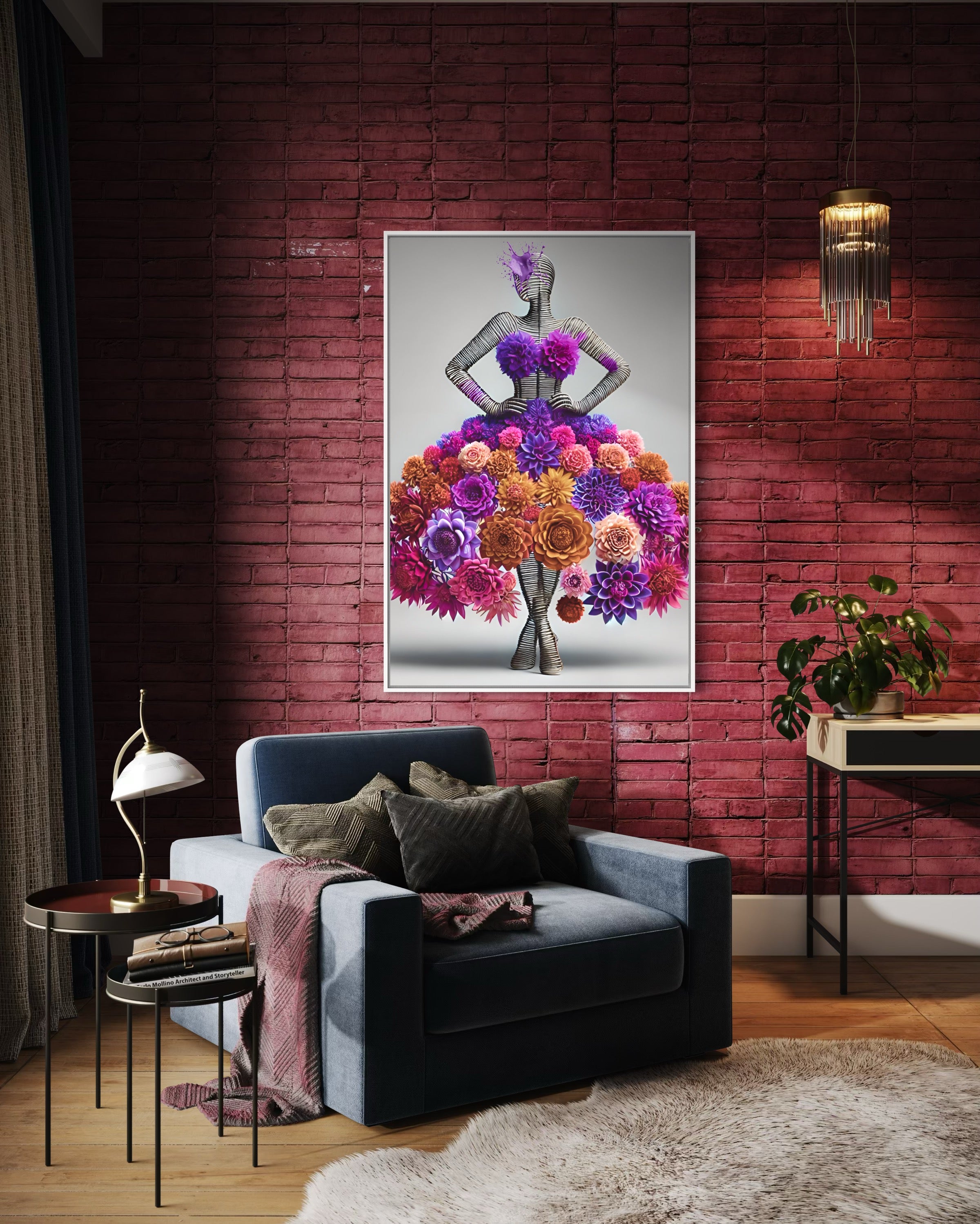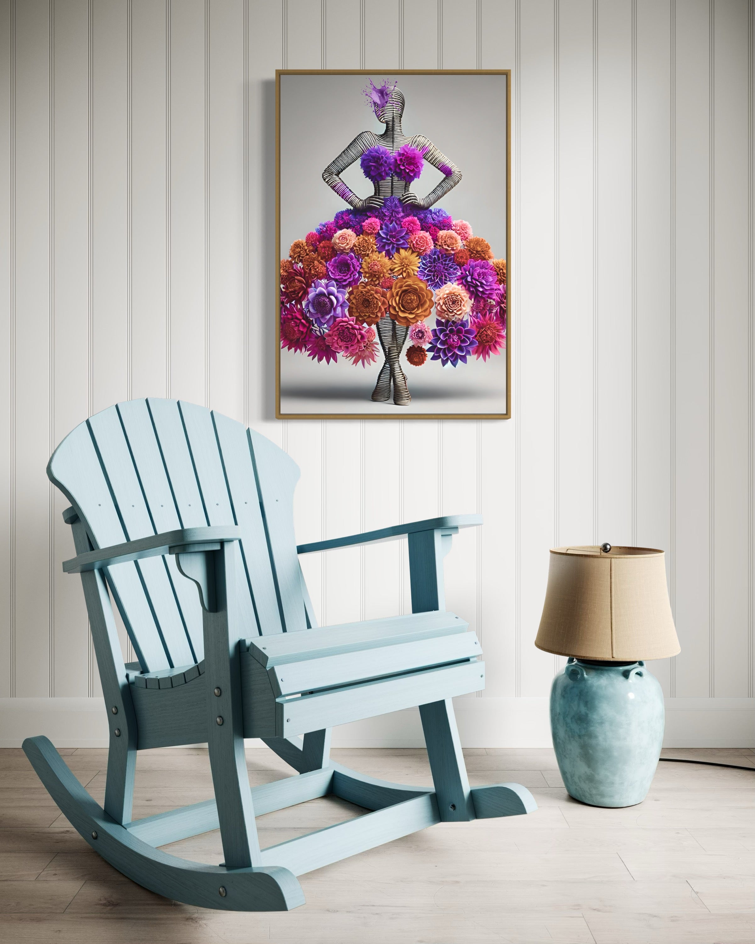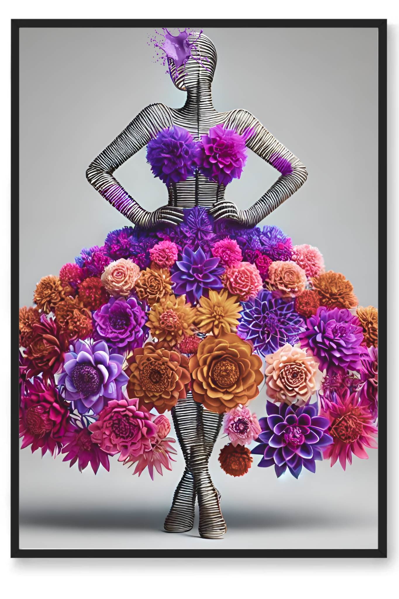 Infuse your space with the majestic allure of Blossom, a stunning abstract art print that captures the essence of royal flourishing. This evocative image showcases a roped, wired figure elegantly adorned in a cascade of purple roses, each one symbolizing the grandeur and vitality of regal growth.
