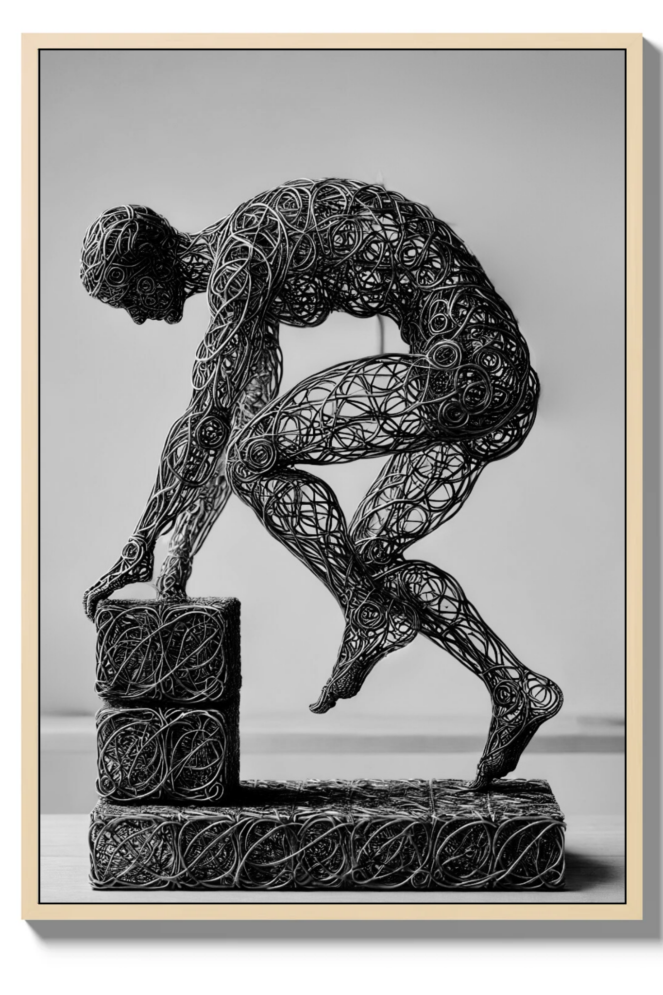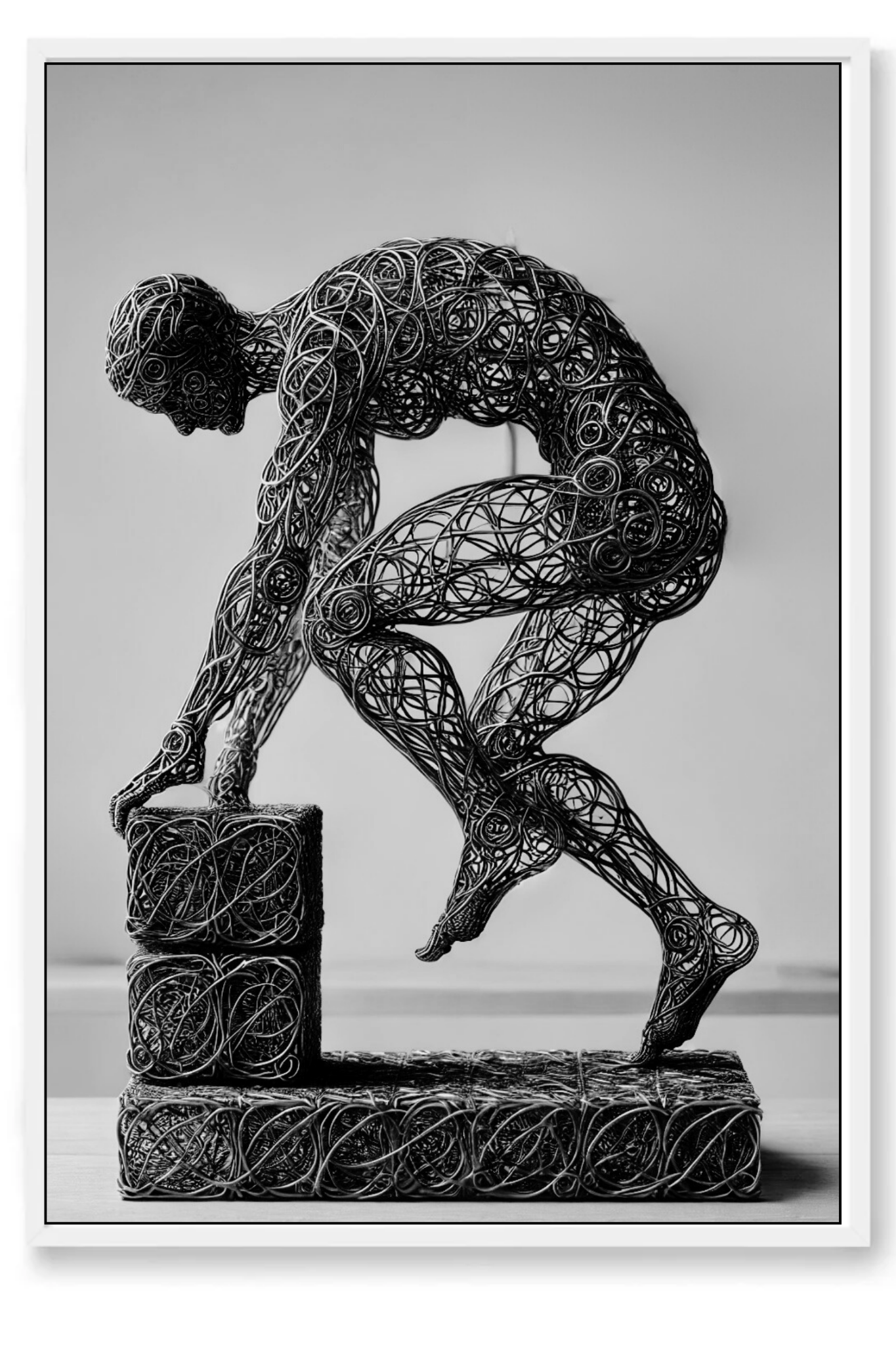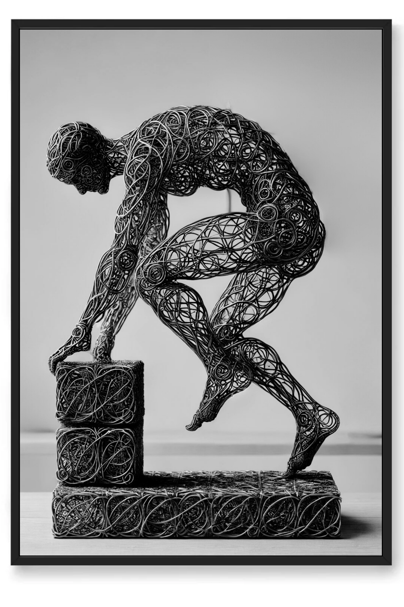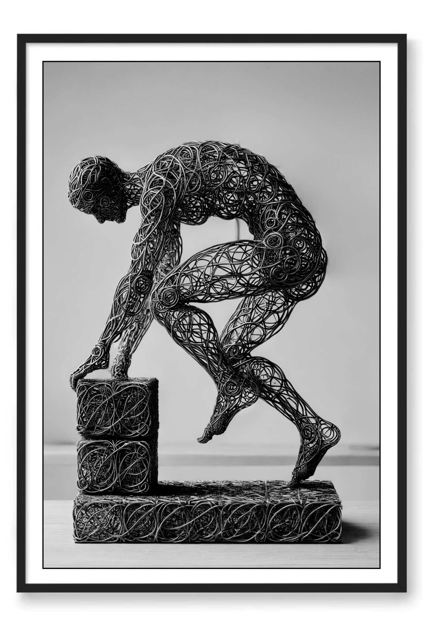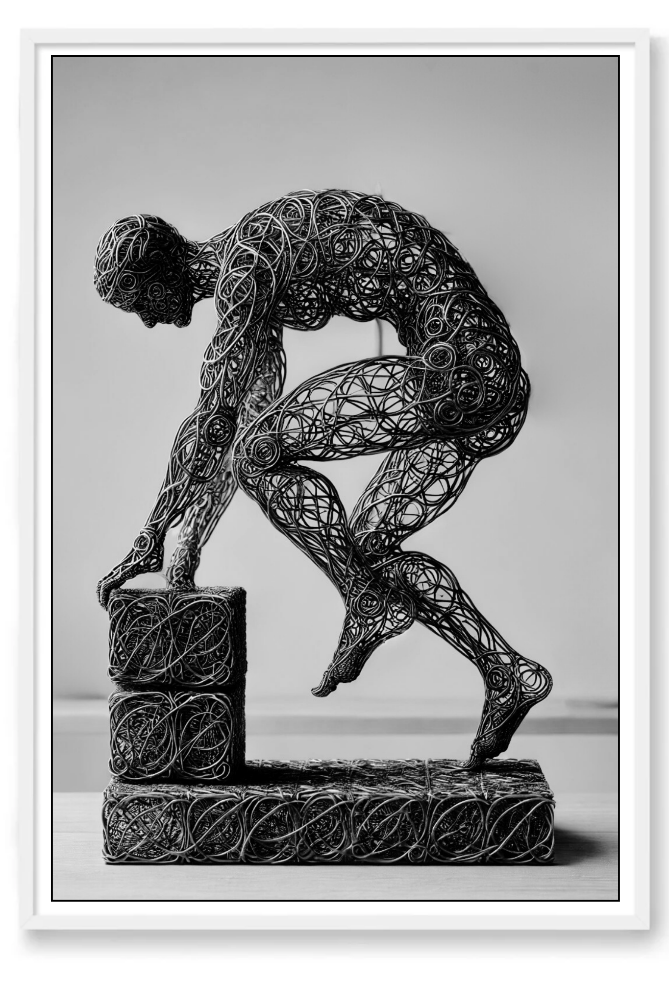 Enhance your space with the inspiring message of Build, a compelling abstract art print that symbolizes the strength and stability of faith. This powerful image features a wire-formed figure of a man, captured in mid-step on a block as he constructs a solid foundation. The figure’s dynamic pose and the detailed wireframe artistry emphasize the act of building with intention and purpose.