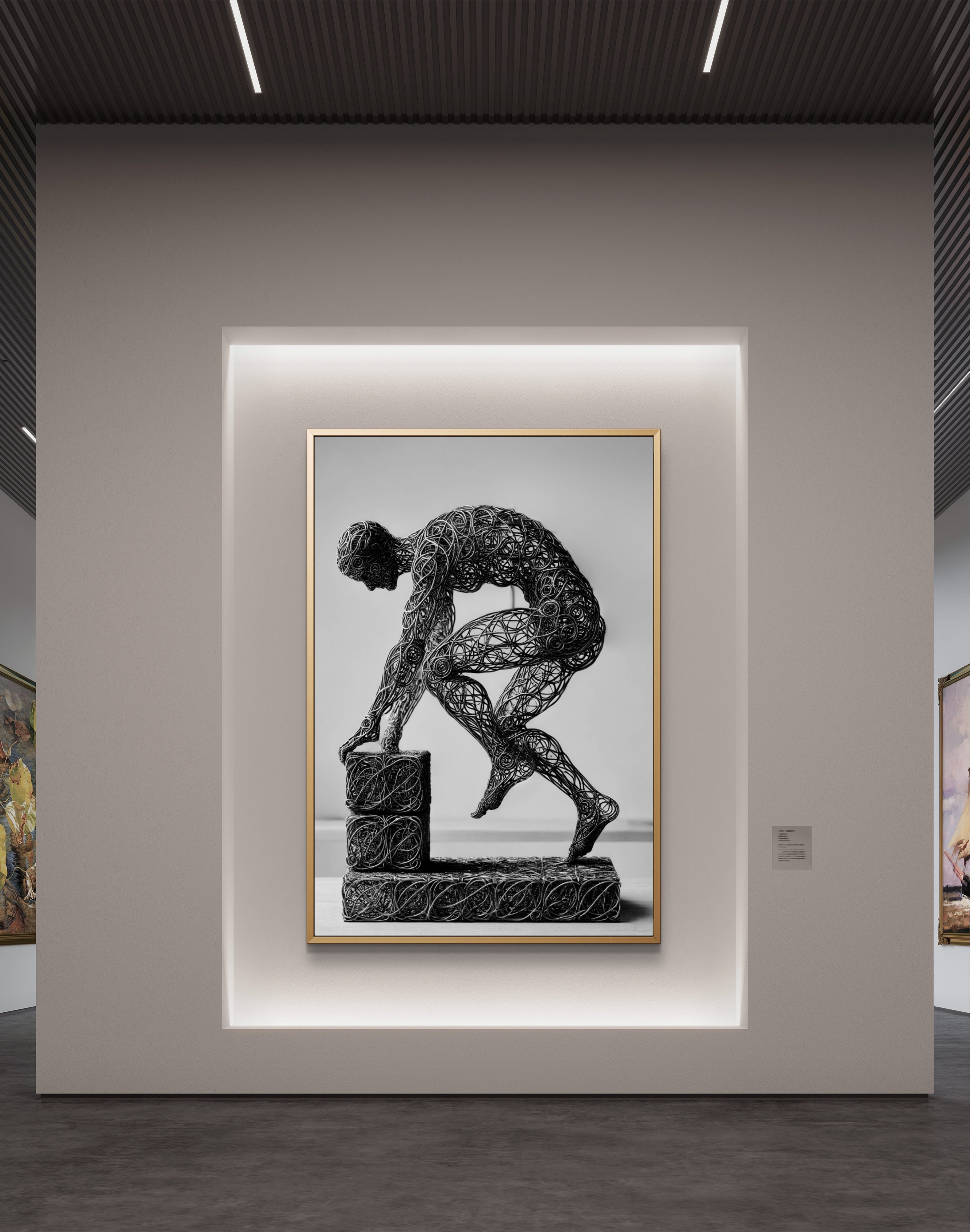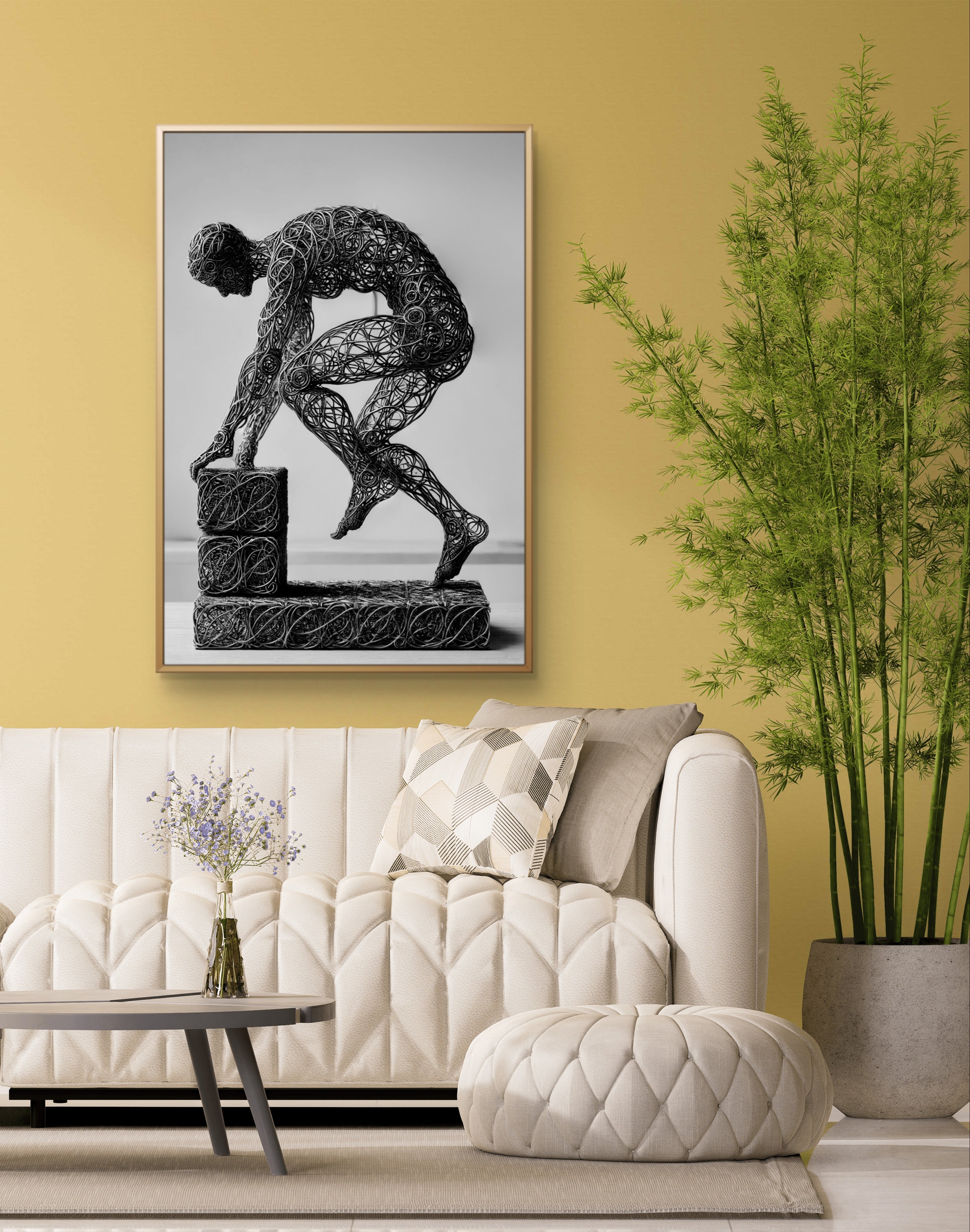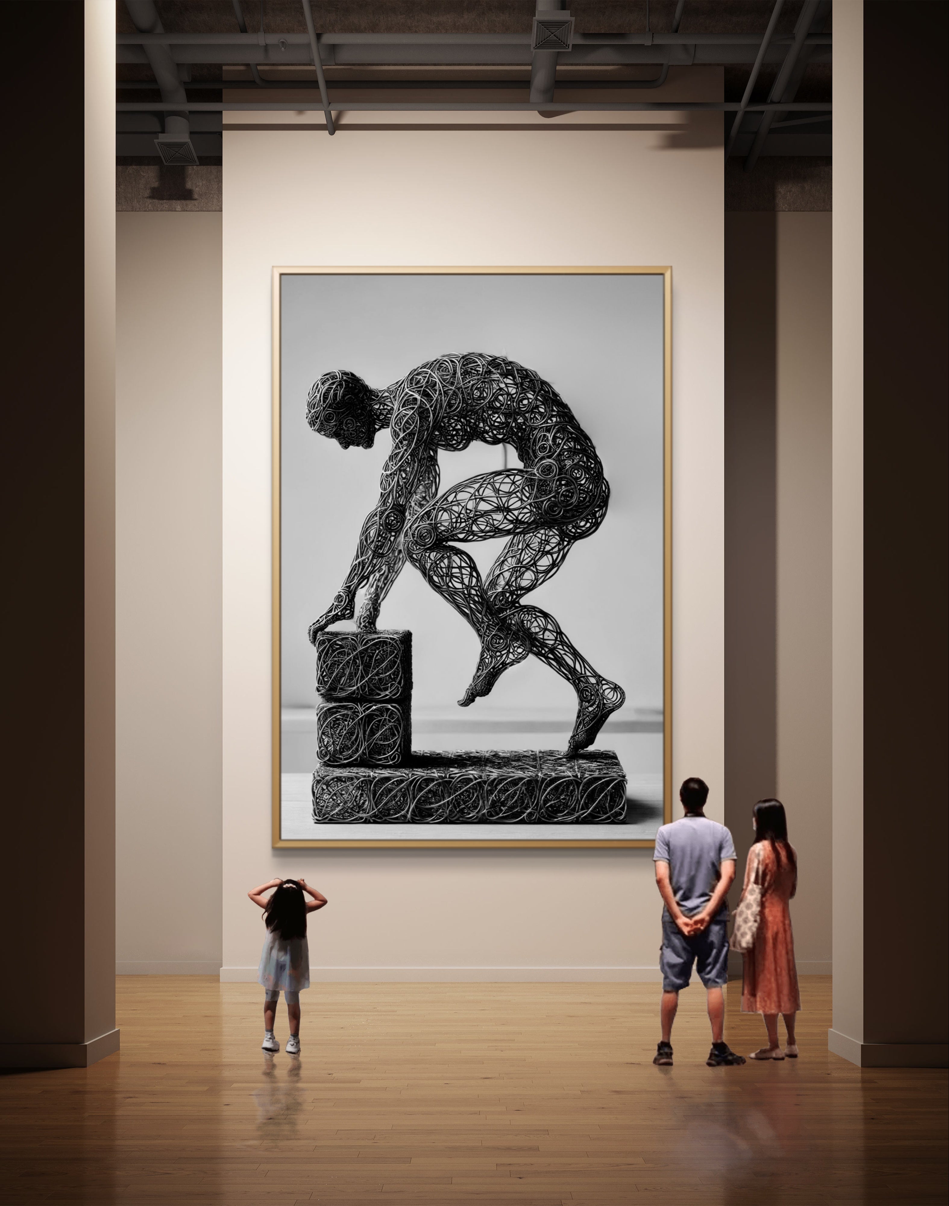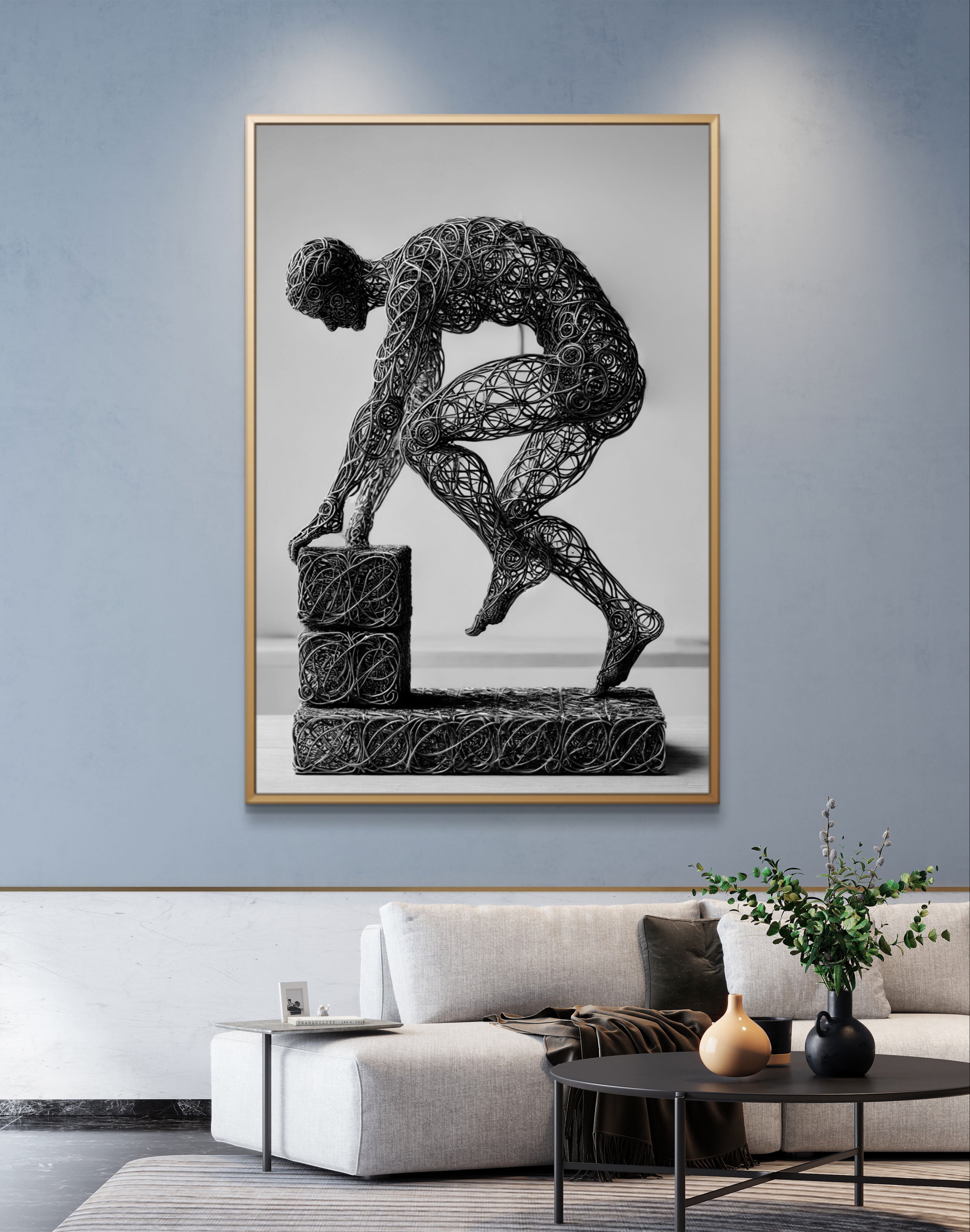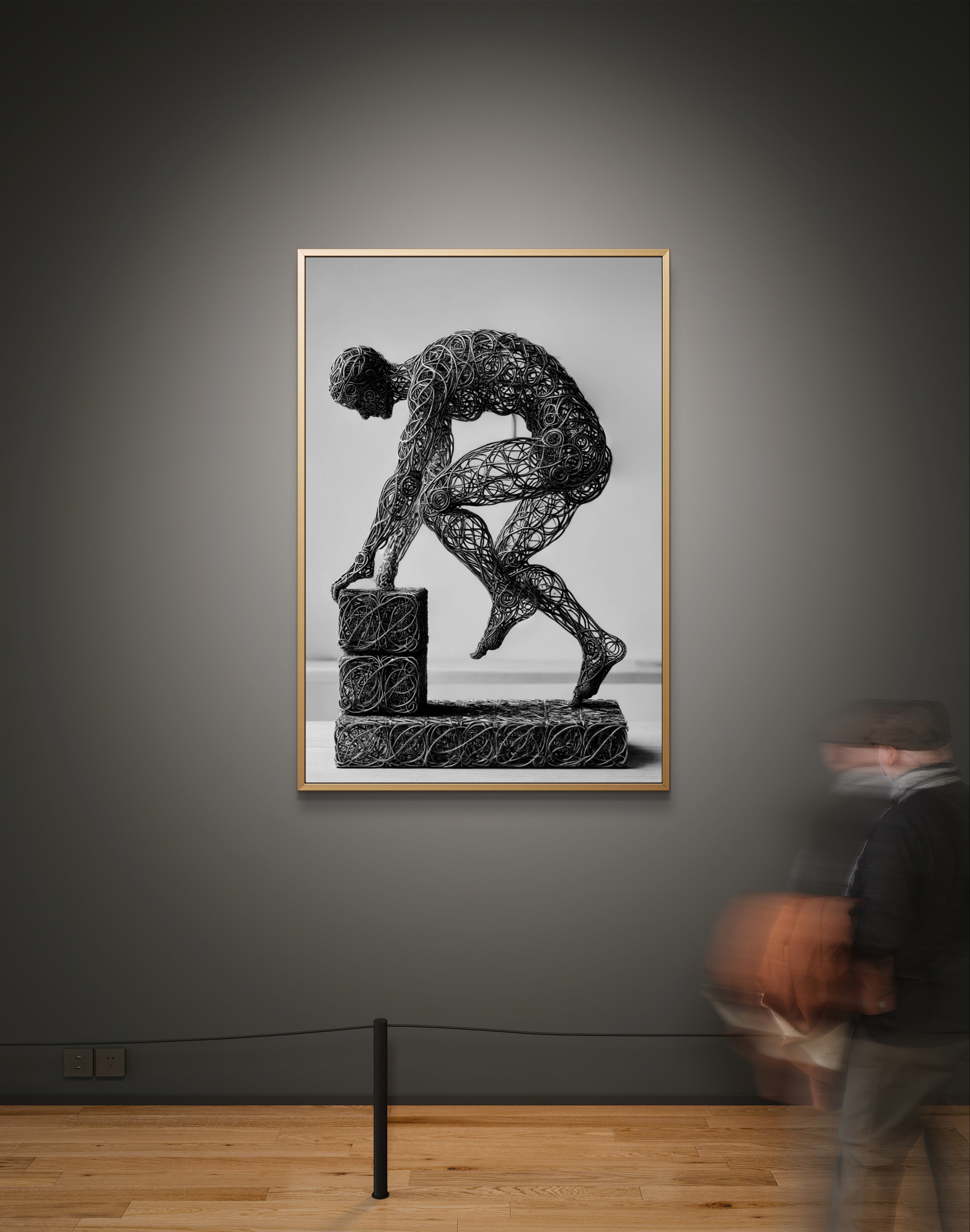Enhance your space with the inspiring message of Build, a compelling abstract art print that symbolizes the strength and stability of faith. This powerful image features a wire-formed figure of a man, captured in mid-step on a block as he constructs a solid foundation. The figure’s dynamic pose and the detailed wireframe artistry emphasize the act of building with intention and purpose.
