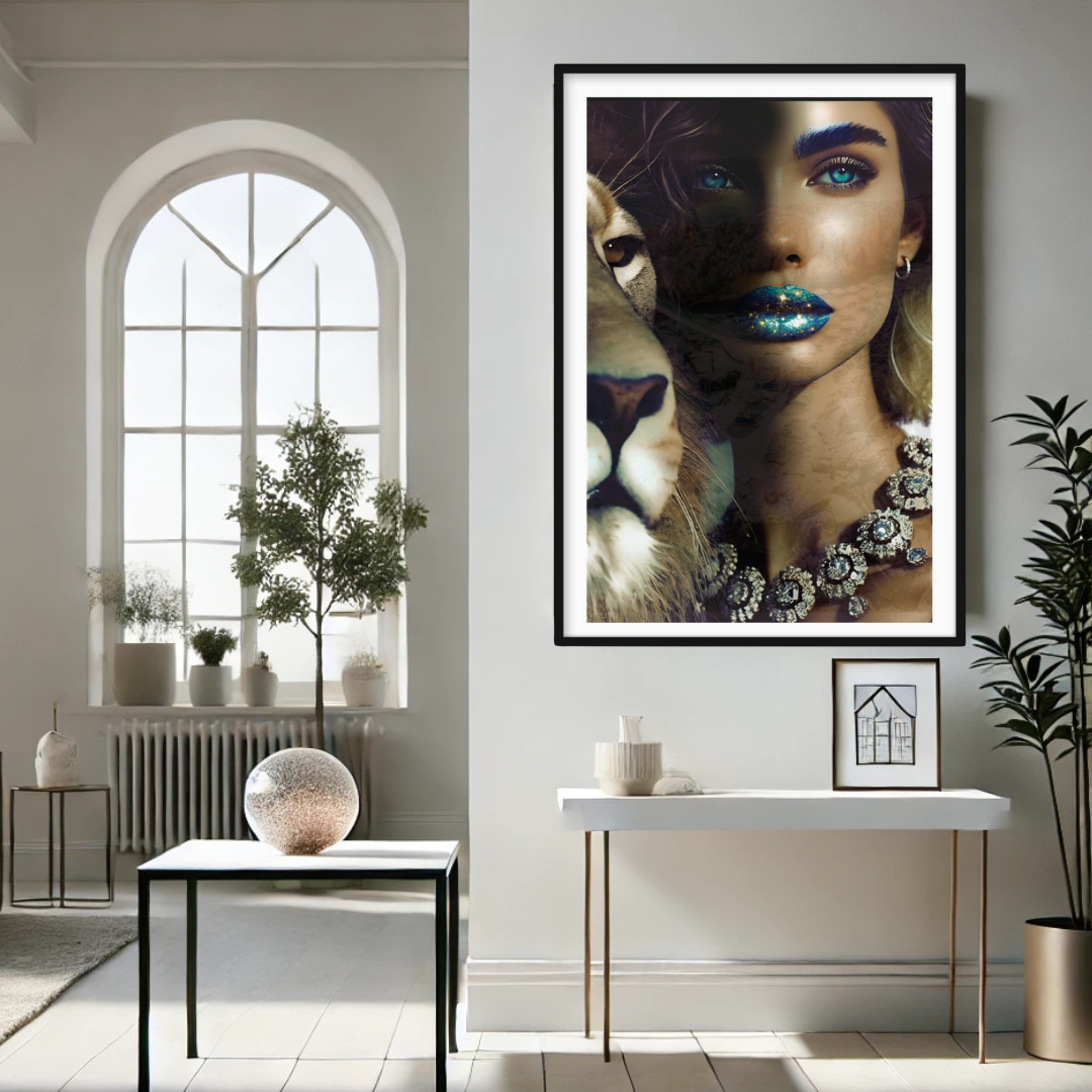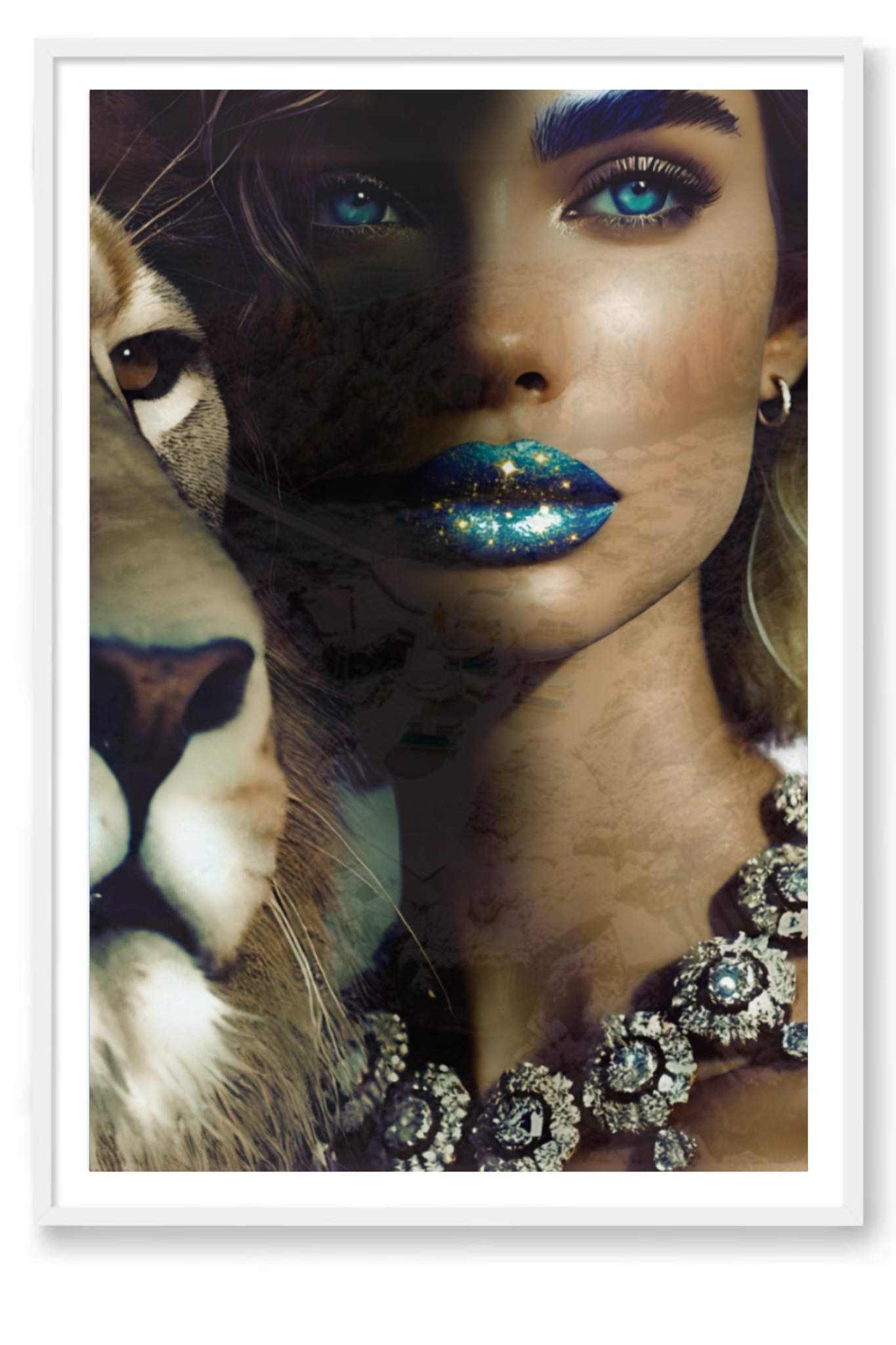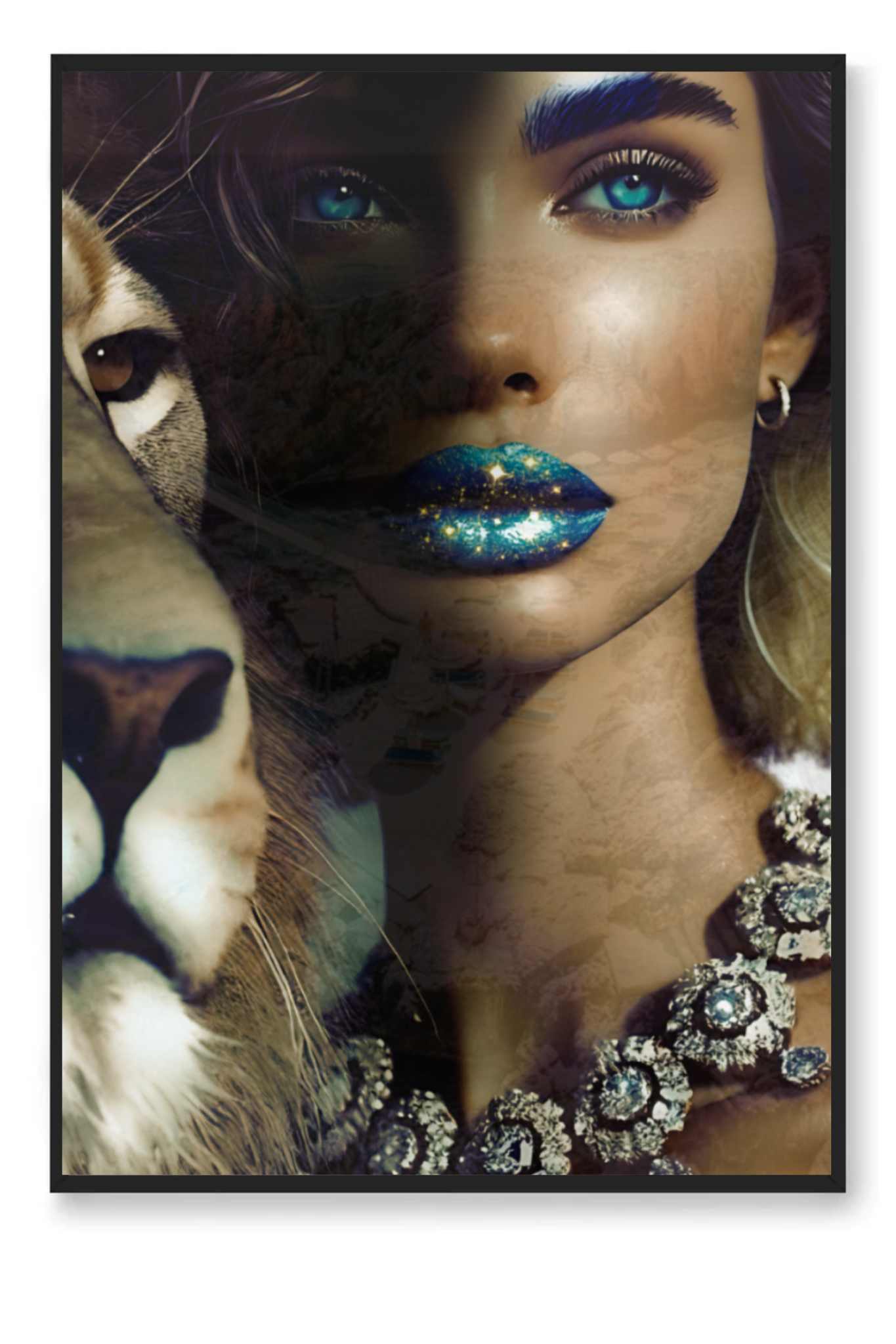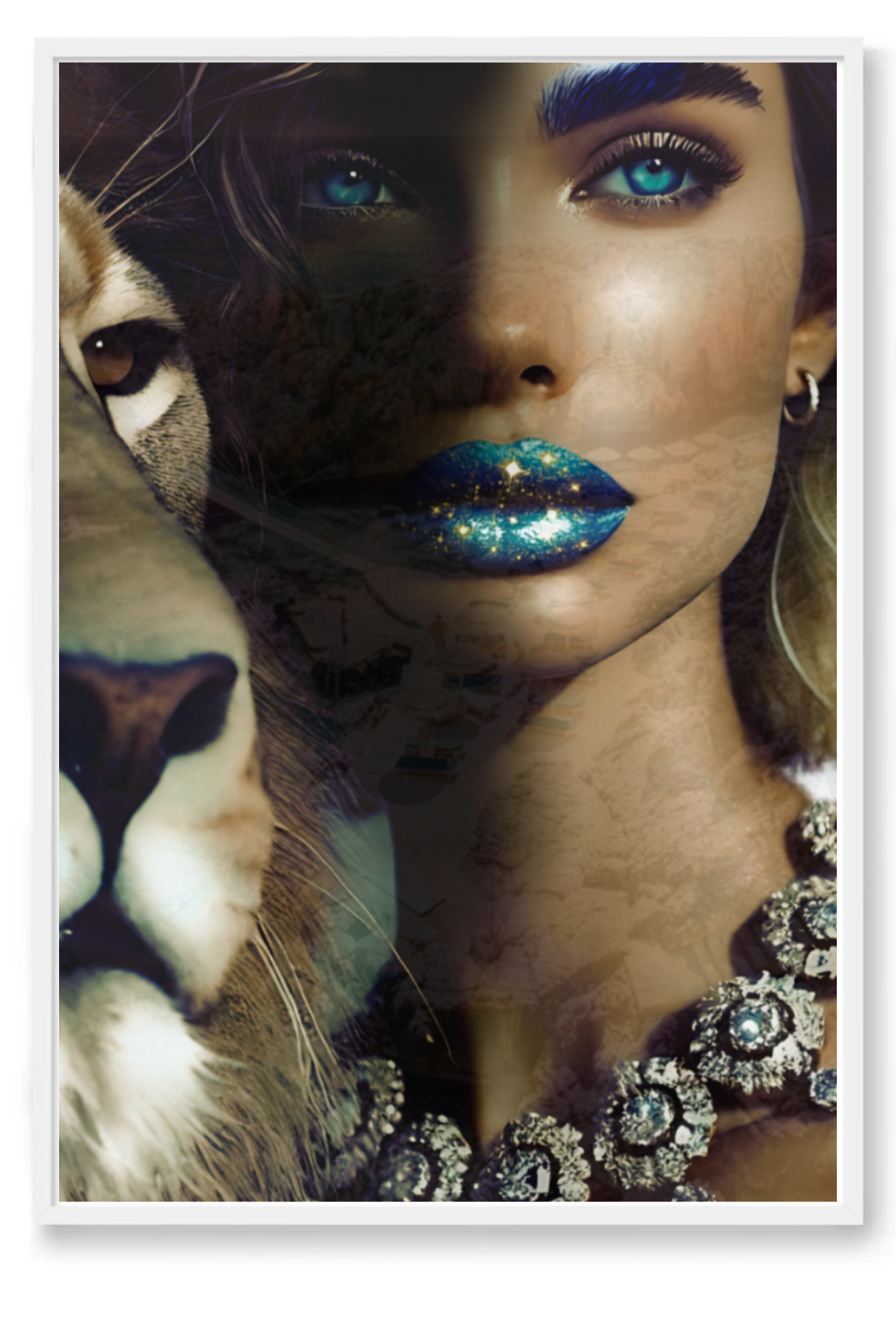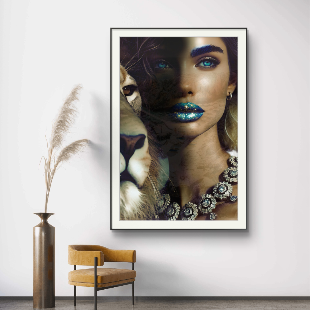 Step into the profound and captivating world of "Camouflage," a fine art print that masterfully intertwines beauty and symbolism. This mesmerizing photograph features a woman with glittering blue-gold lips and sparkling blue eyes, her face partially hidden in a blend of other images that create an intricate camouflage. Beside her stands a majestic lion, representing the King of Kings, who calls us to embrace our true identity.