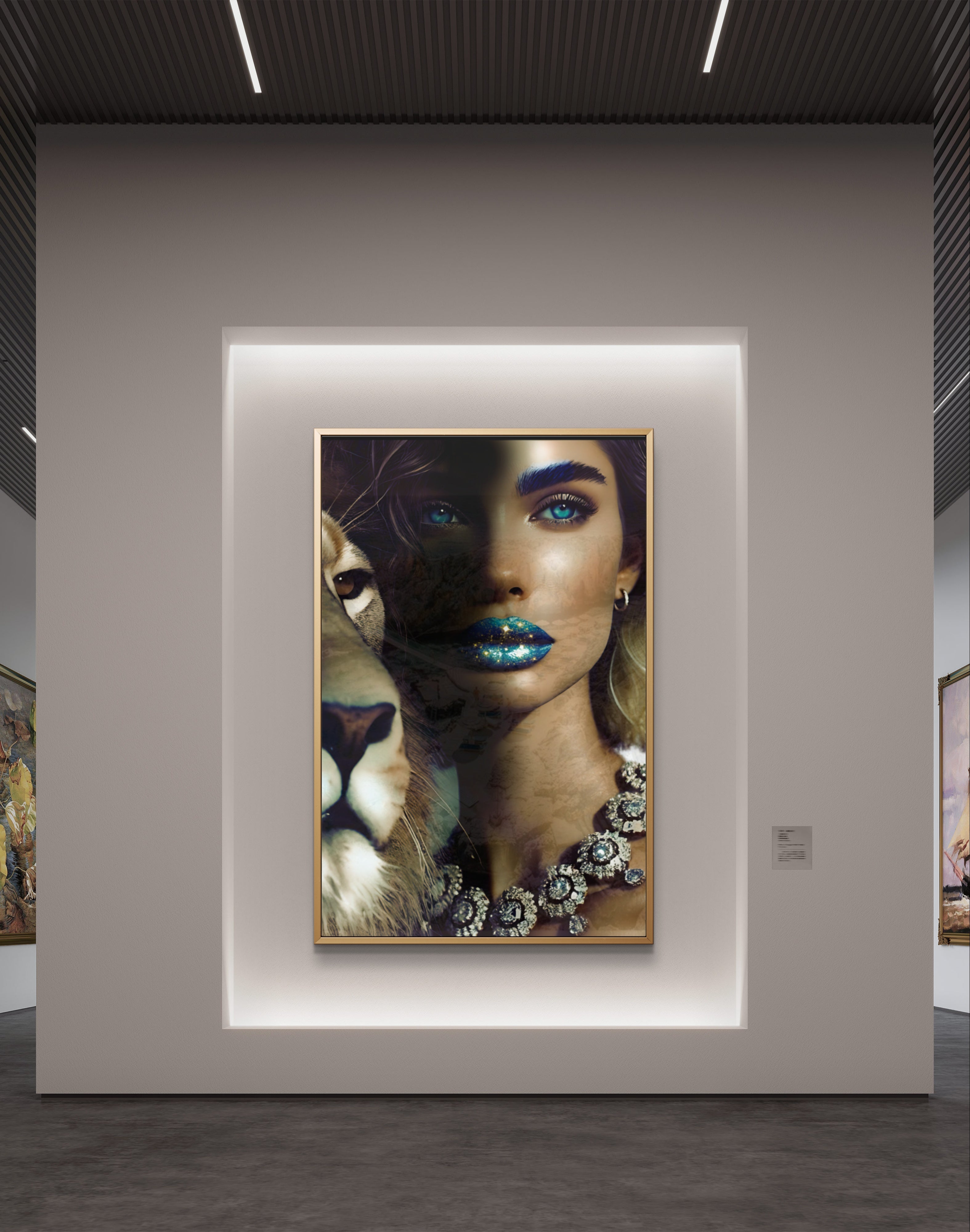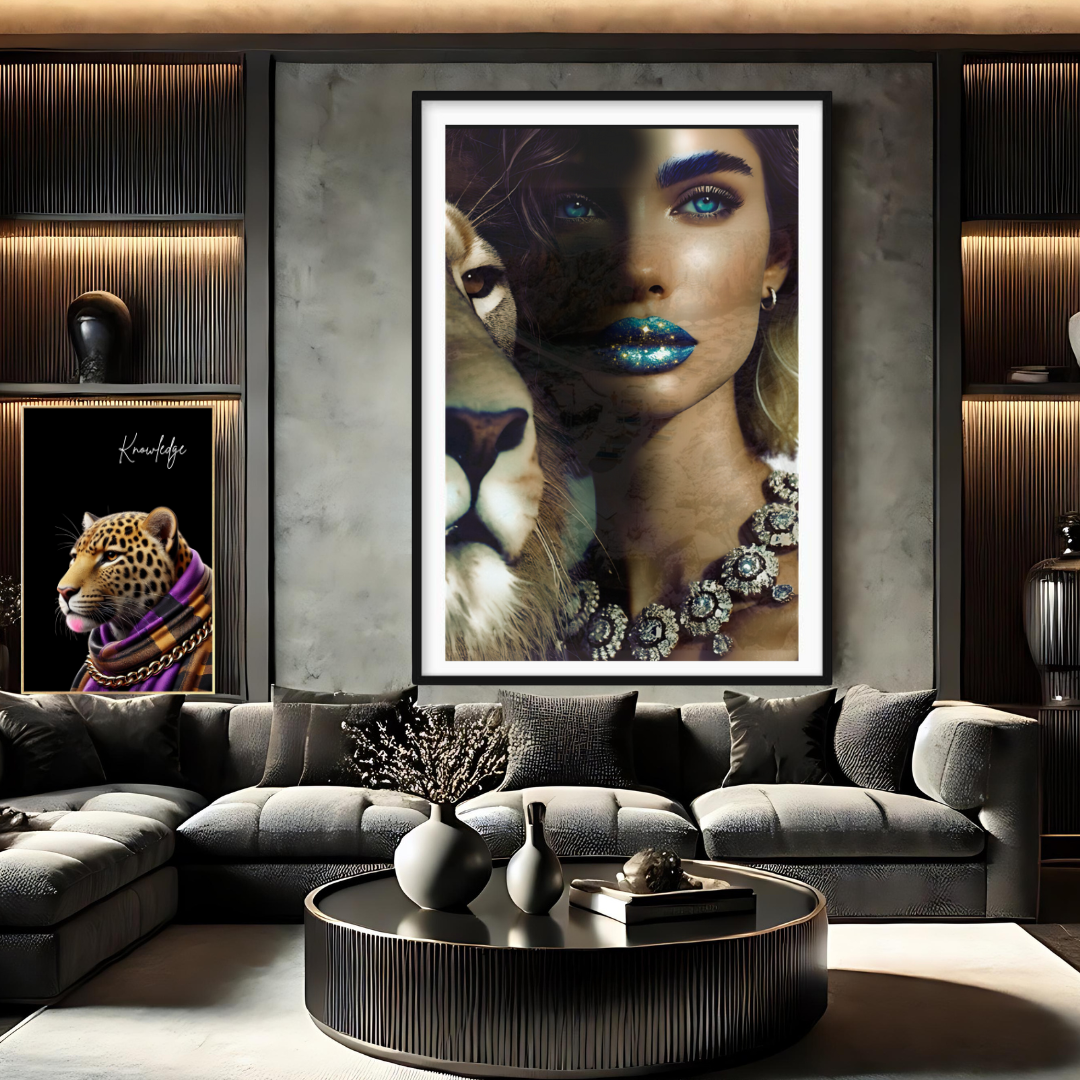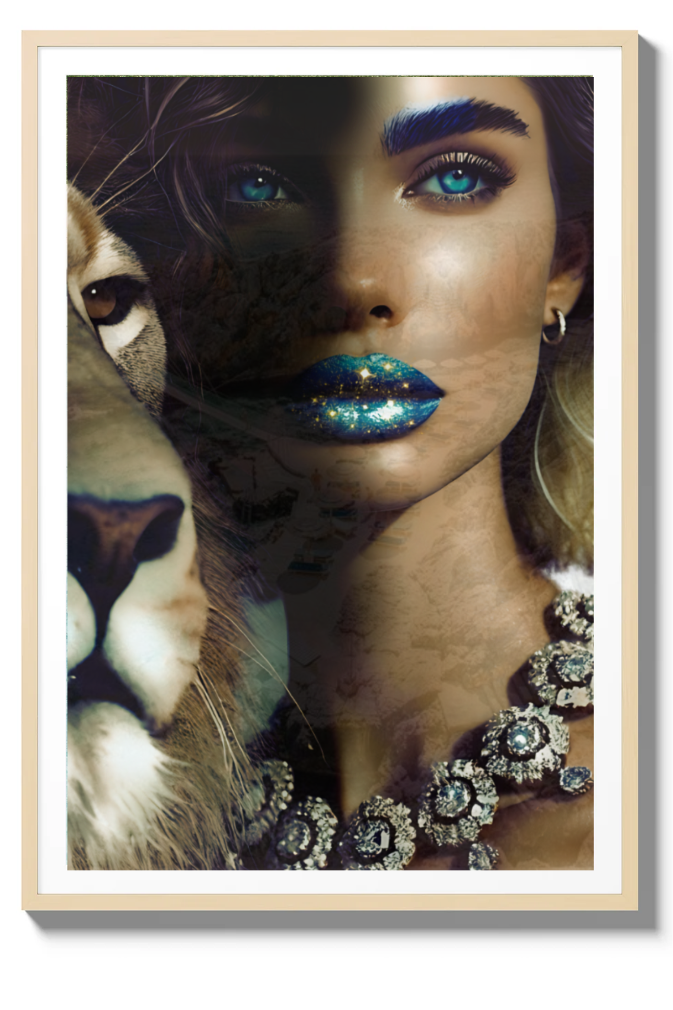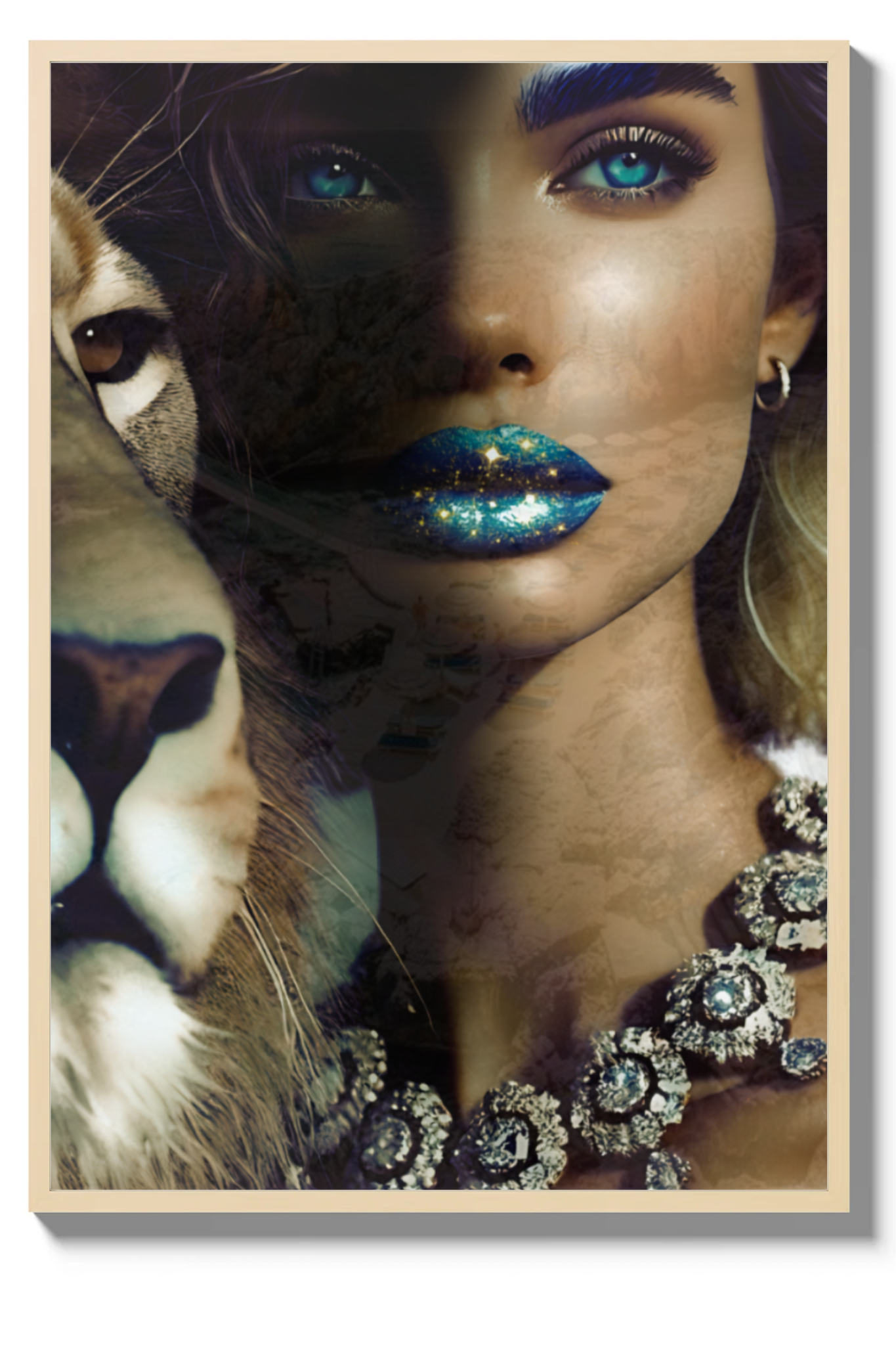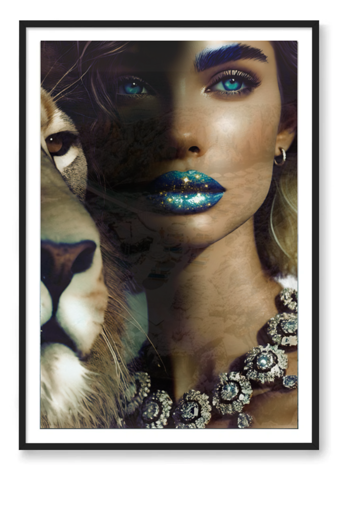 Step into the profound and captivating world of "Camouflage," a fine art print that masterfully intertwines beauty and symbolism. This mesmerizing photograph features a woman with glittering blue-gold lips and sparkling blue eyes, her face partially hidden in a blend of other images that create an intricate camouflage. Beside her stands a majestic lion, representing the King of Kings, who calls us to embrace our true identity.