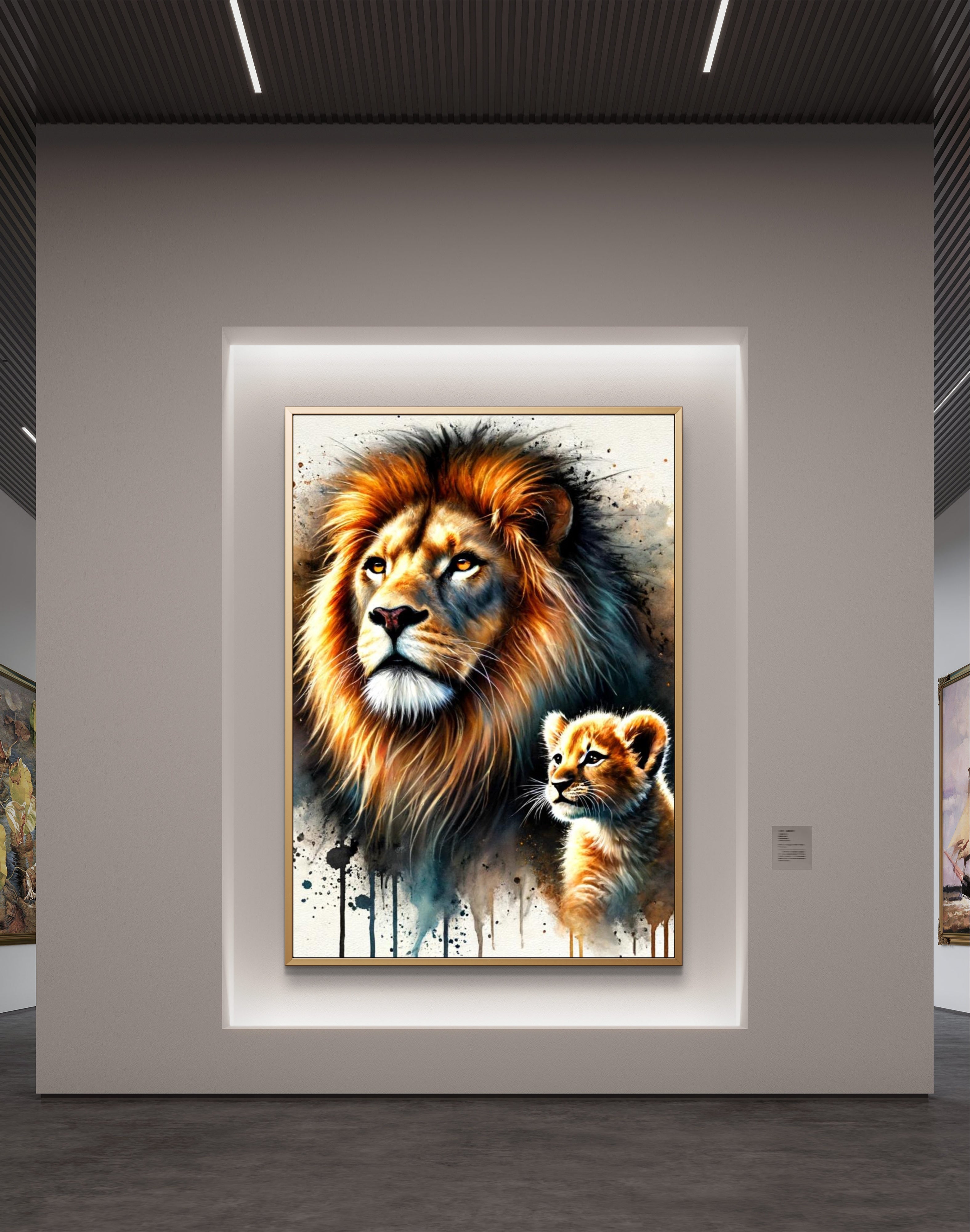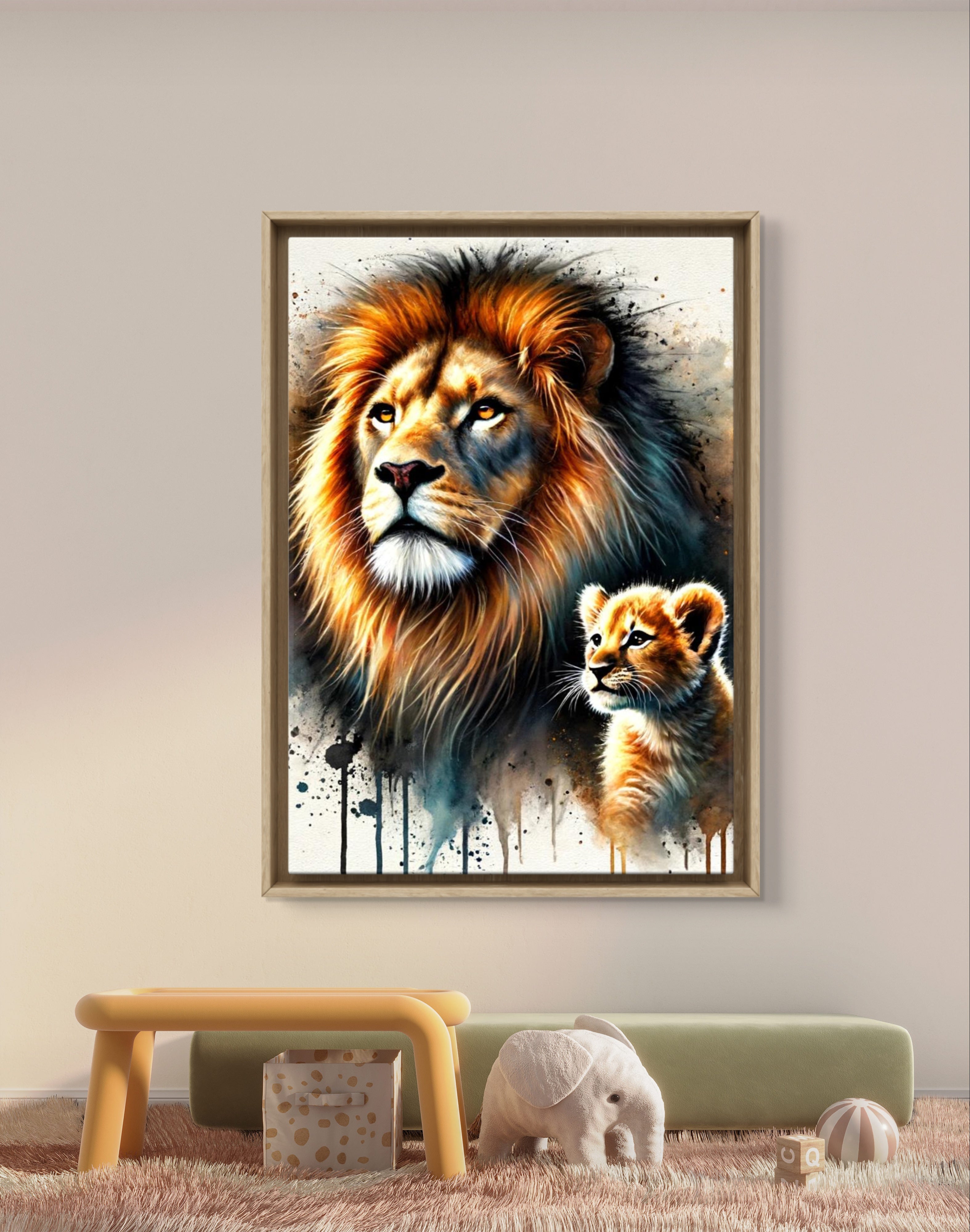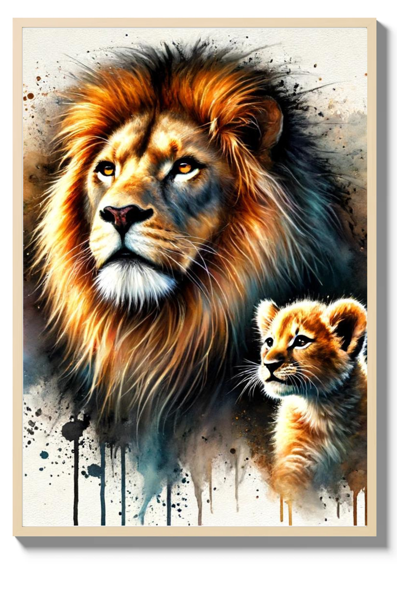 Step into the regal world of the wilderness with Conqueror, a stunning watercolor art print that captures the essence and aura of a lion and its cub in a burst of vibrant colors. This exquisite piece of art represents the lion's symbolic nature as a dominant force in nature, echoing its role as a fearless leader and protector.