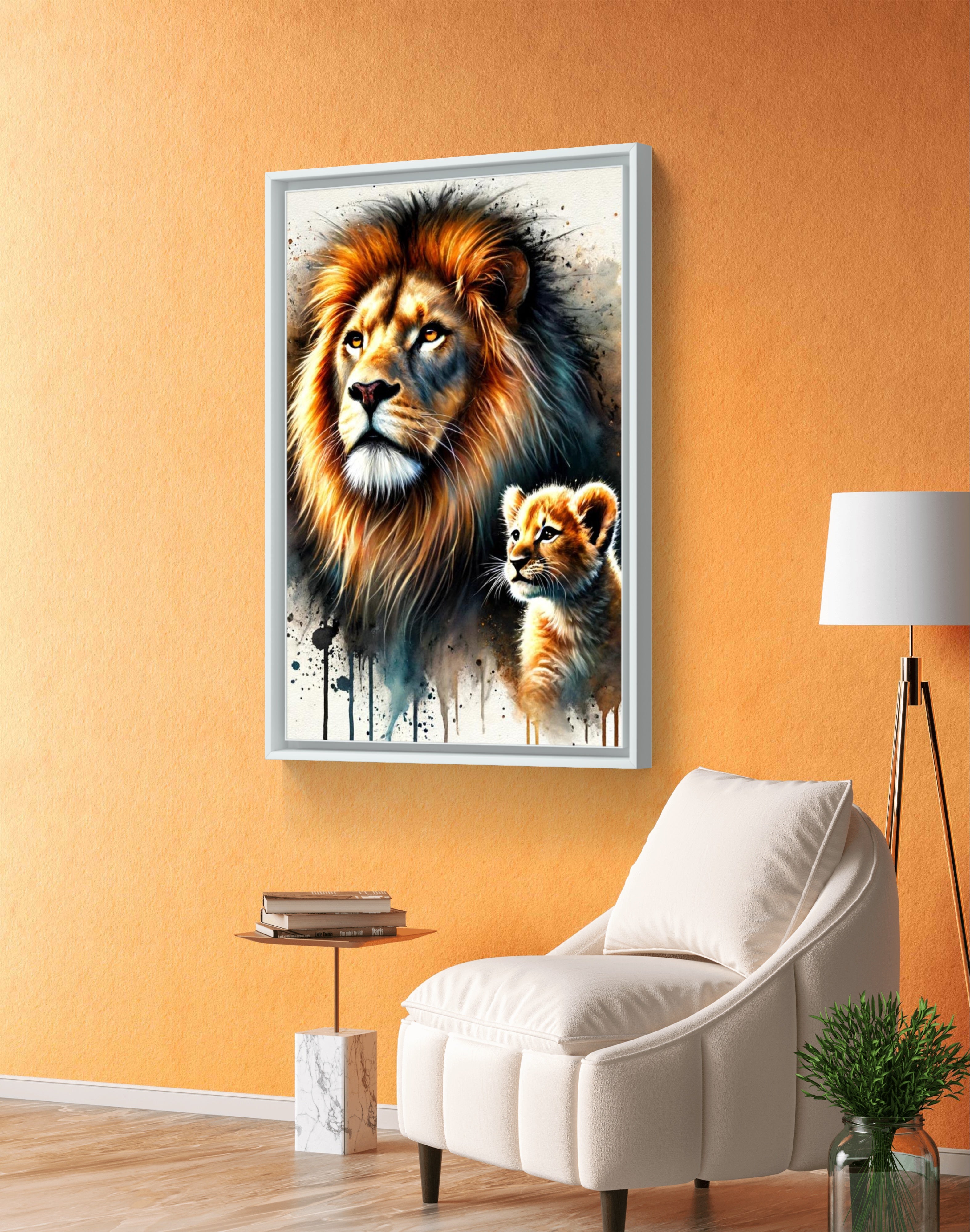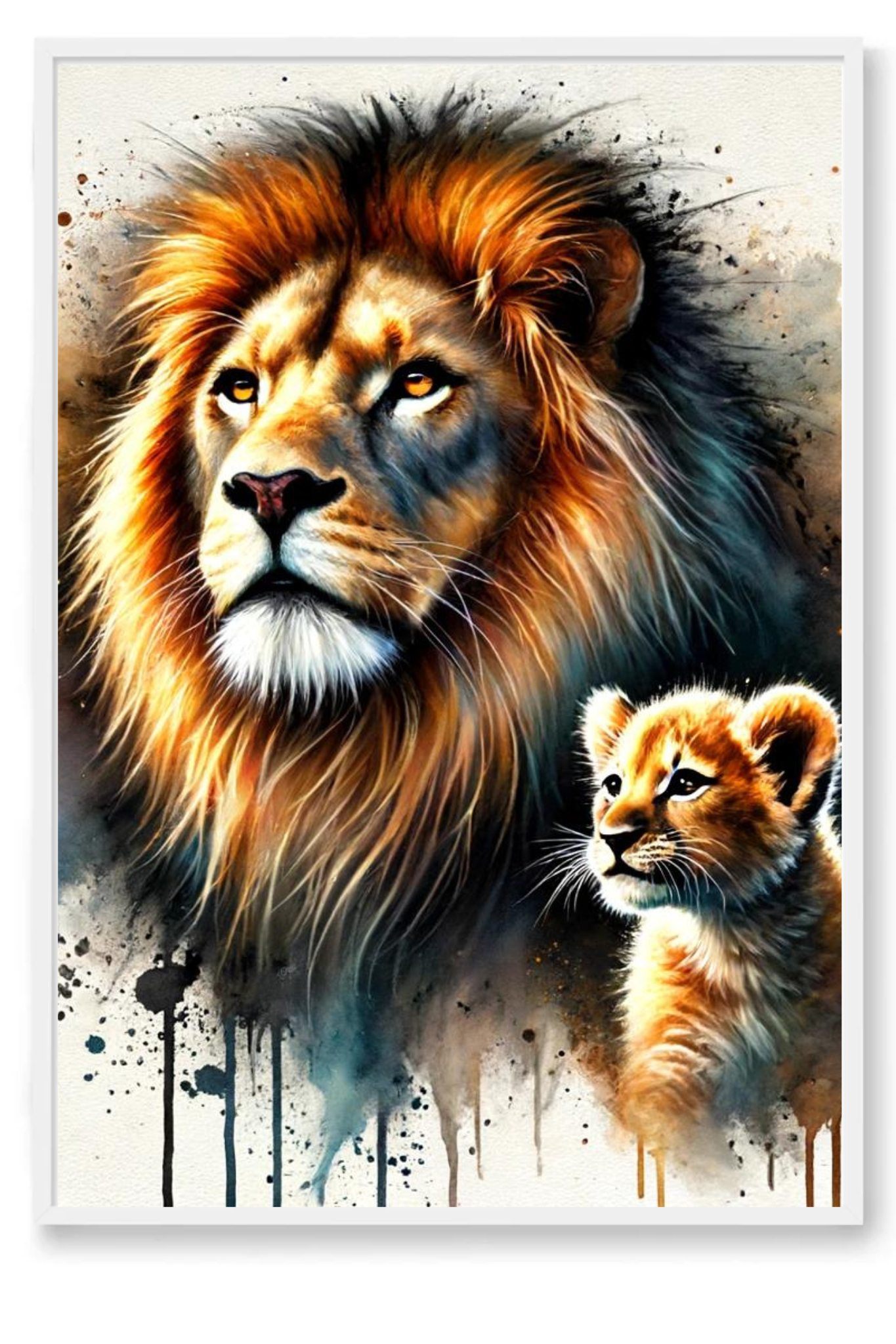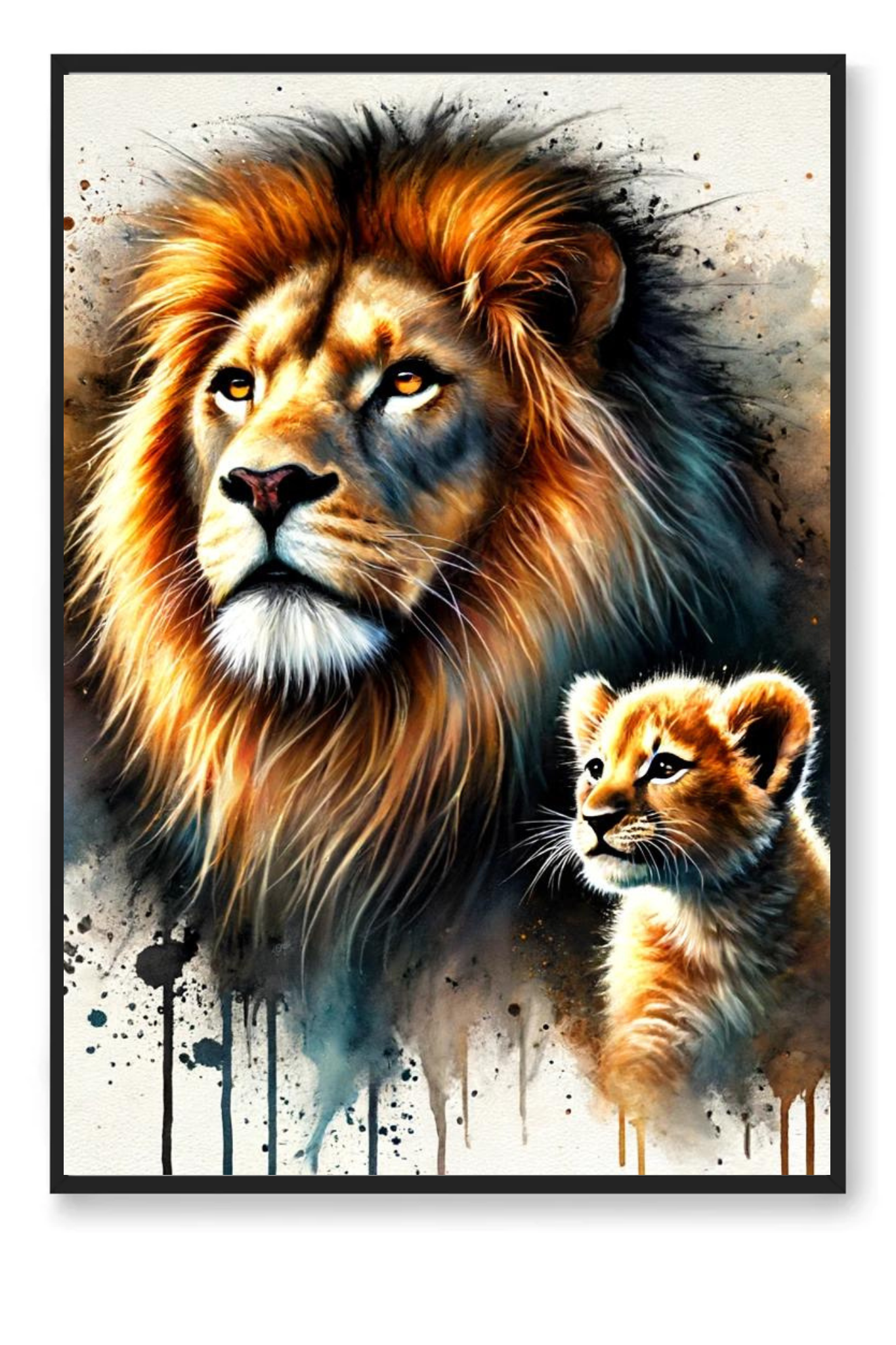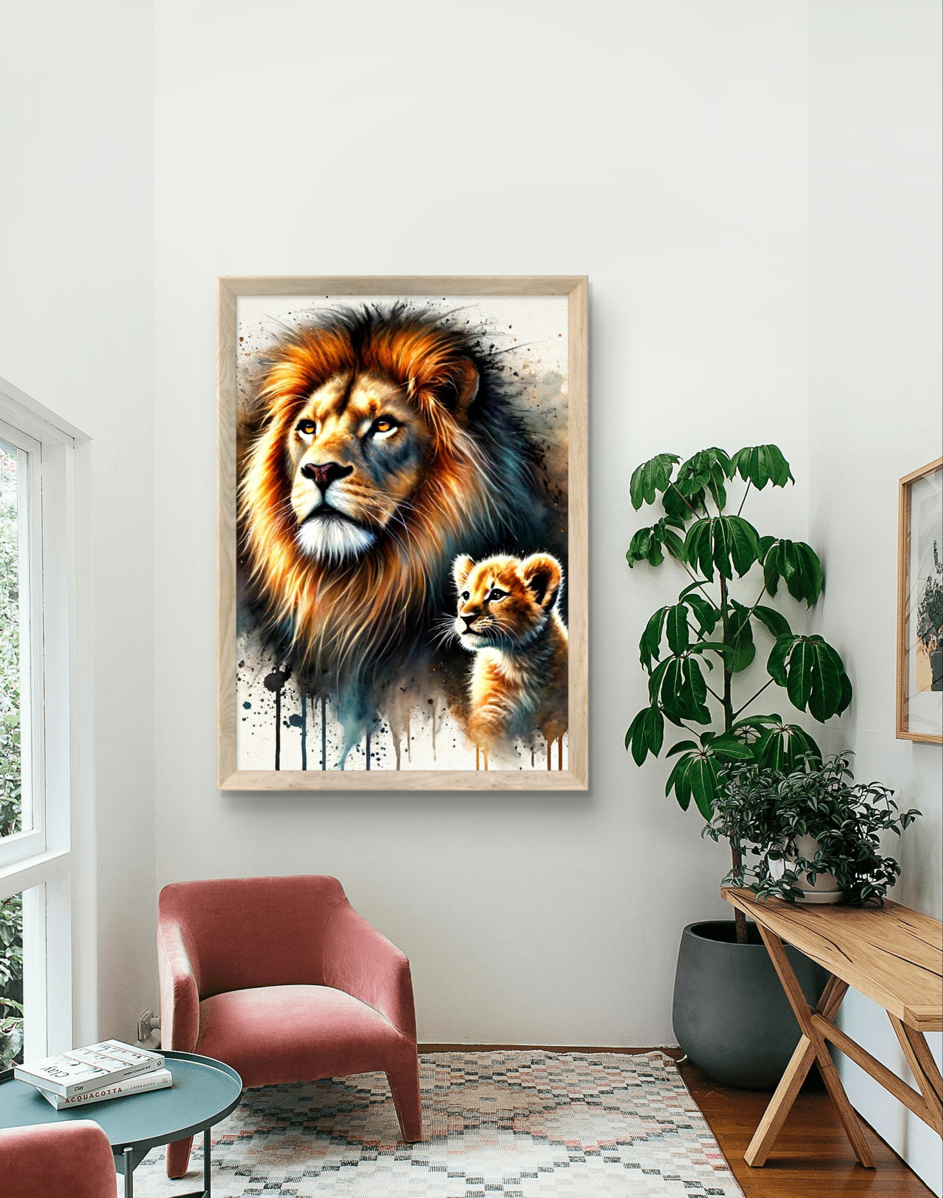 Step into the regal world of the wilderness with Conqueror, a stunning watercolor art print that captures the essence and aura of a lion and its cub in a burst of vibrant colors. This exquisite piece of art represents the lion's symbolic nature as a dominant force in nature, echoing its role as a fearless leader and protector.