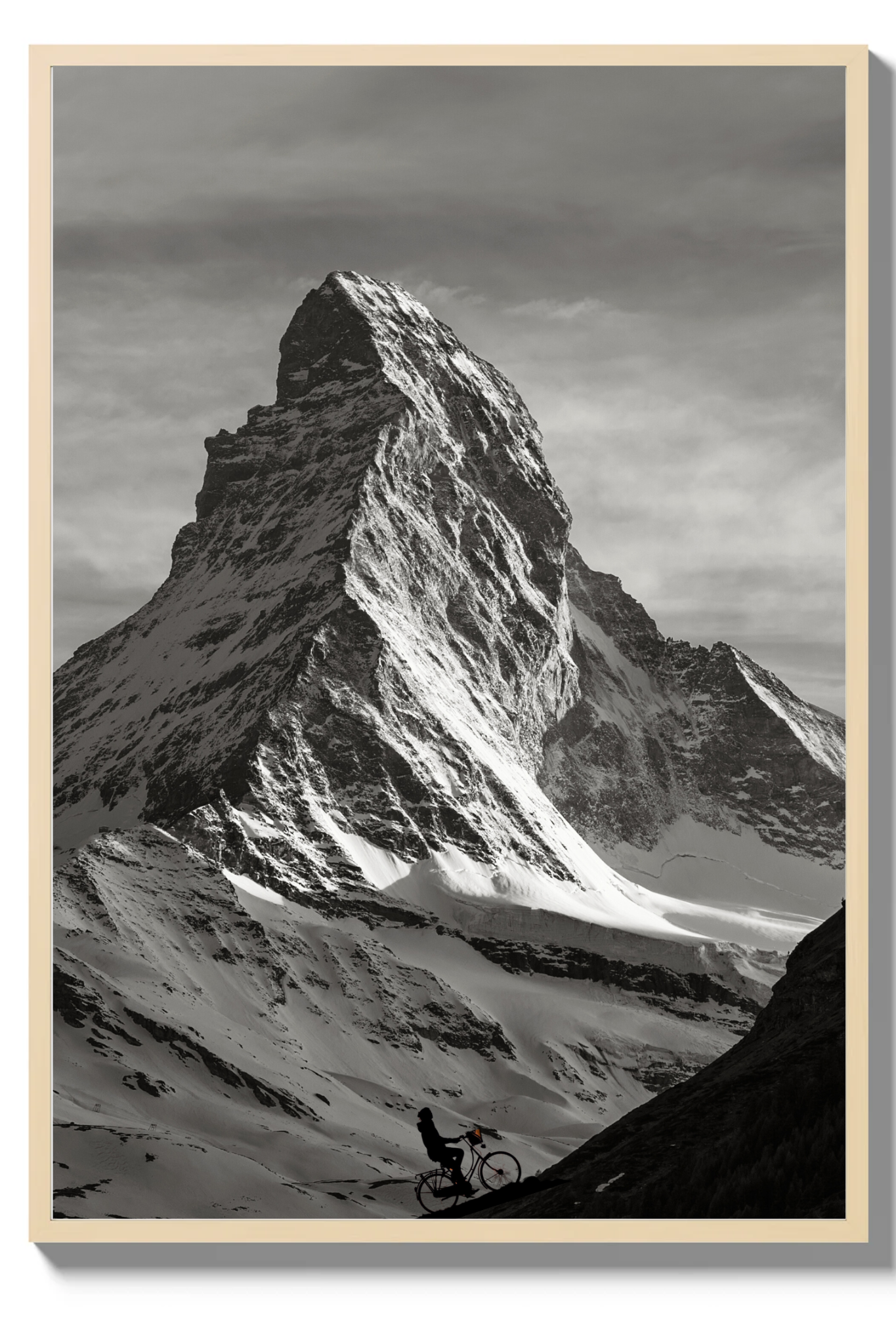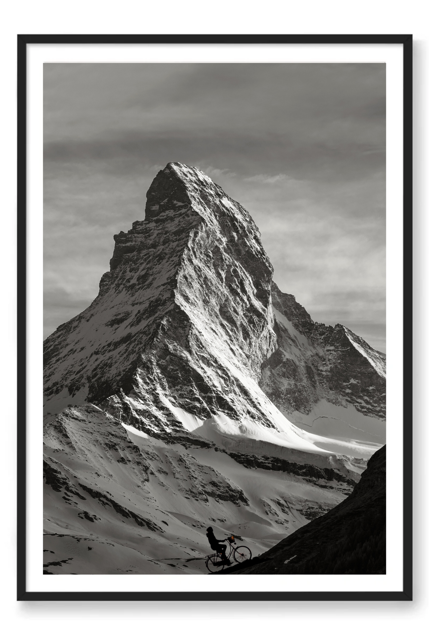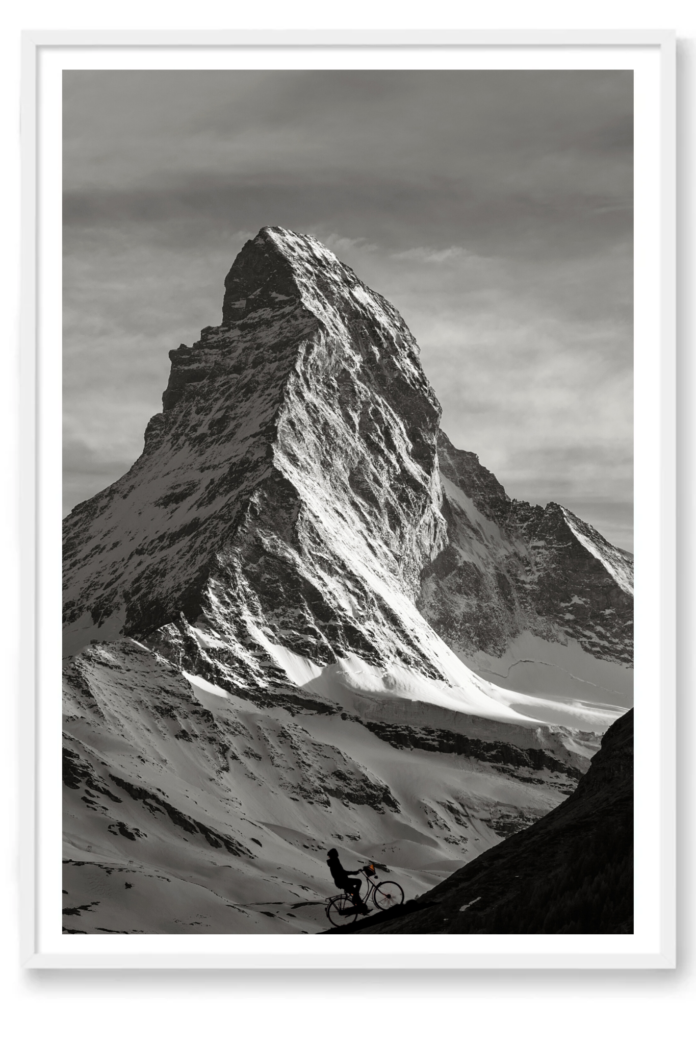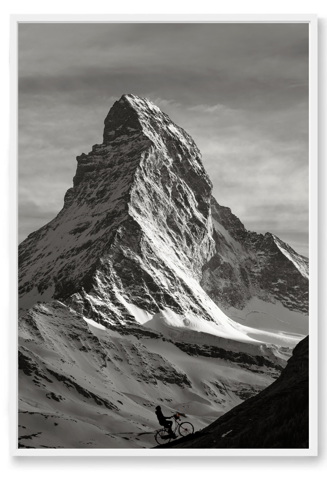 A delicate layer of light snow blankets the hills and ground, enhancing the stark contrast between the dark mountain edges and the pristine white snow. The scene is brought to life by the solitary figure of a cyclist ascending the mountain’s dark edge, embodying the spirit of adventure and perseverance.