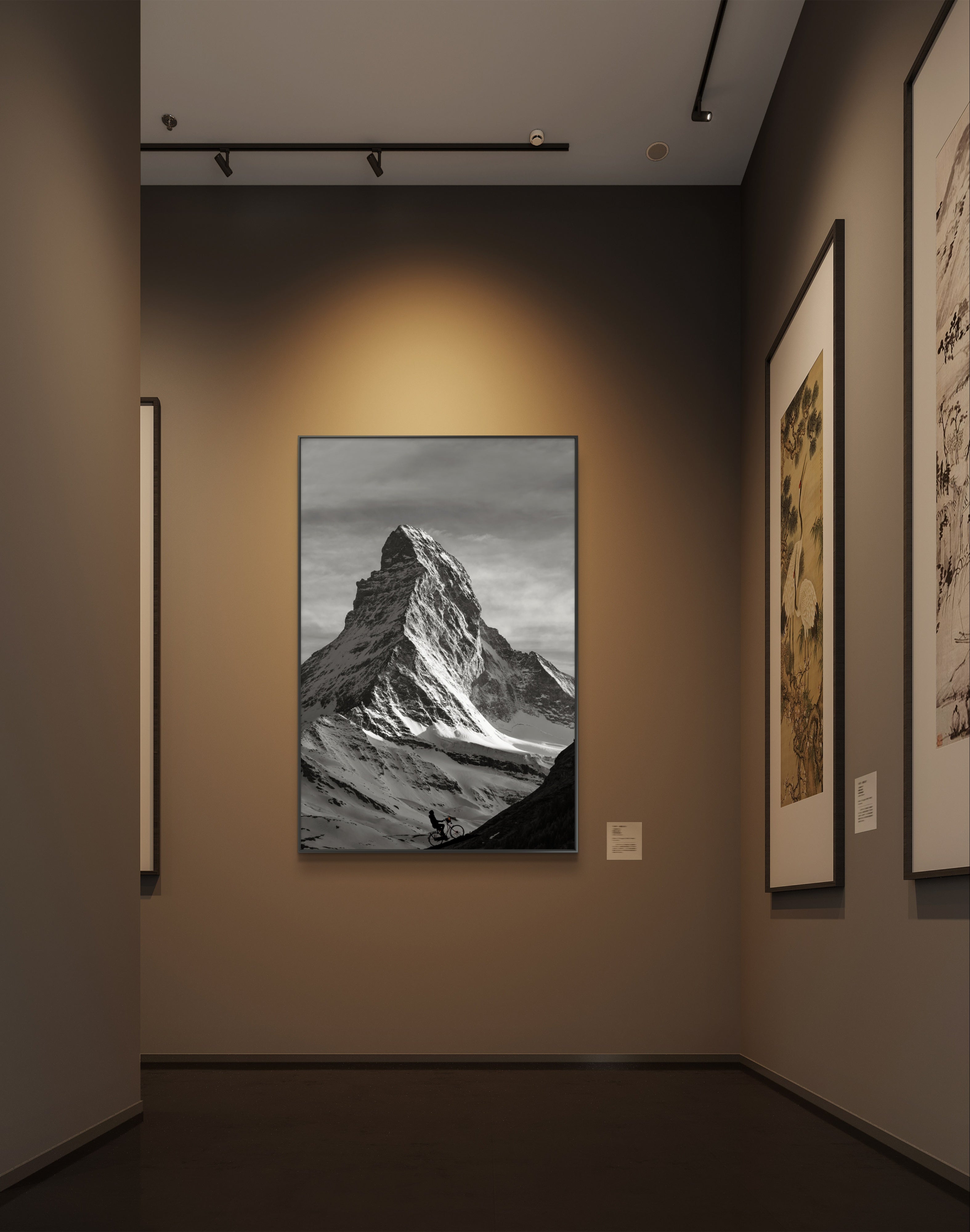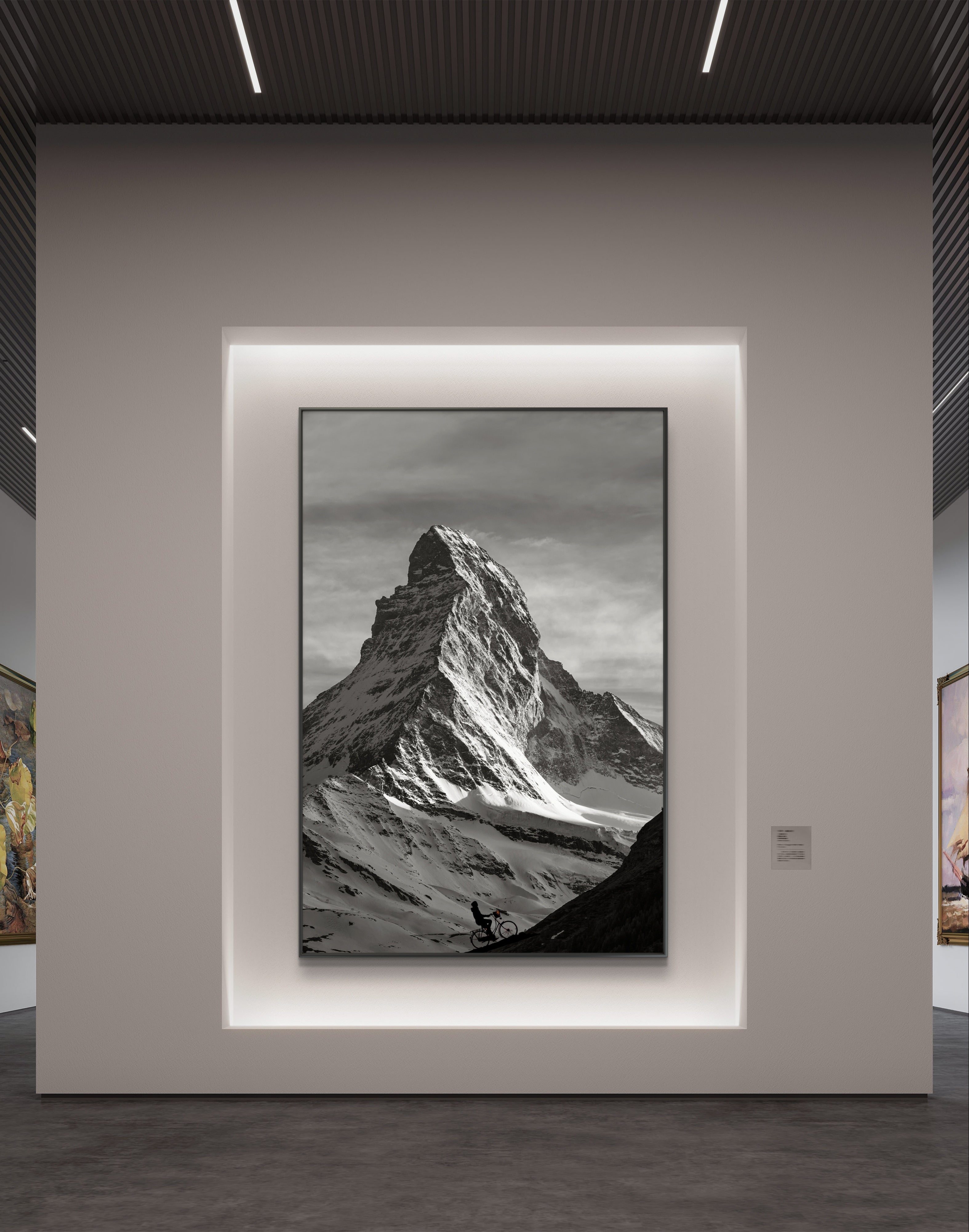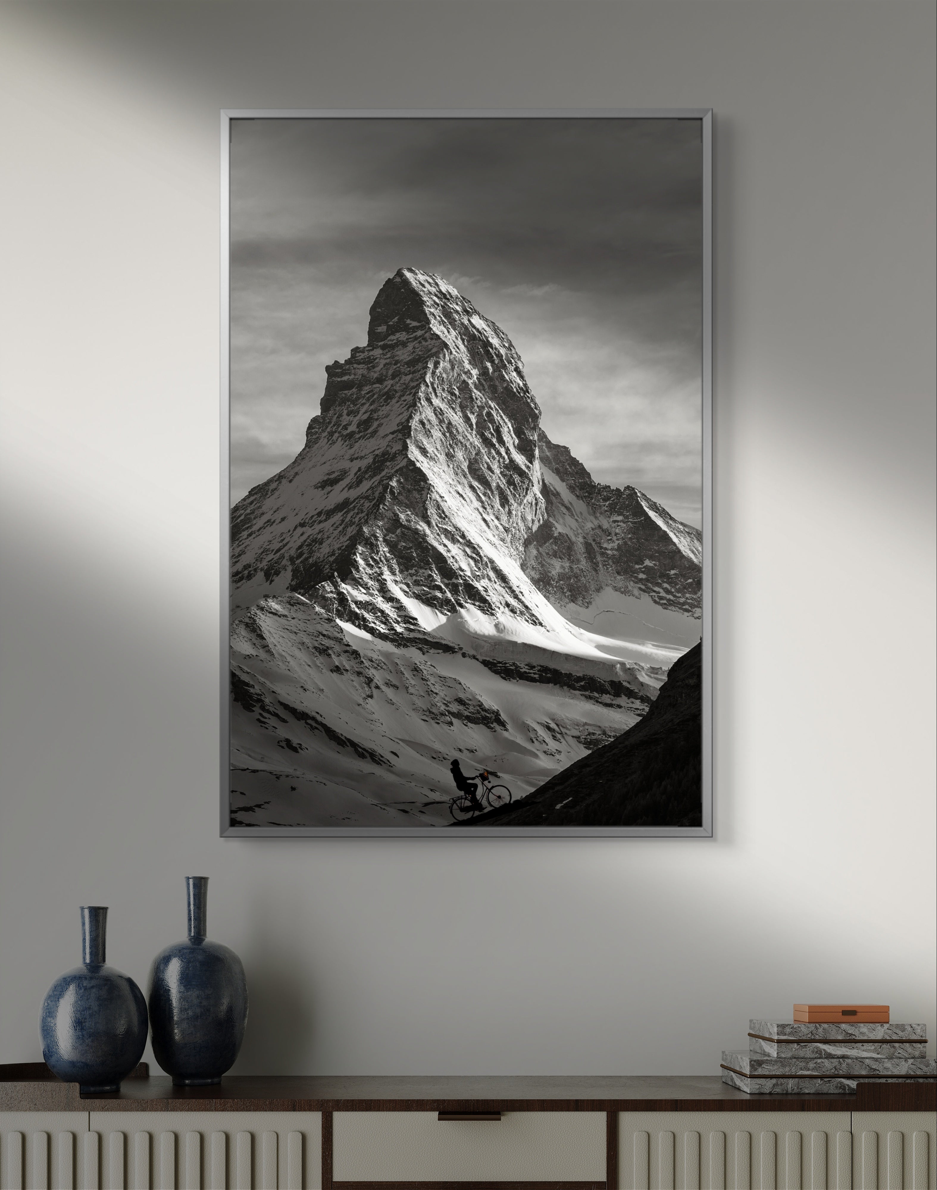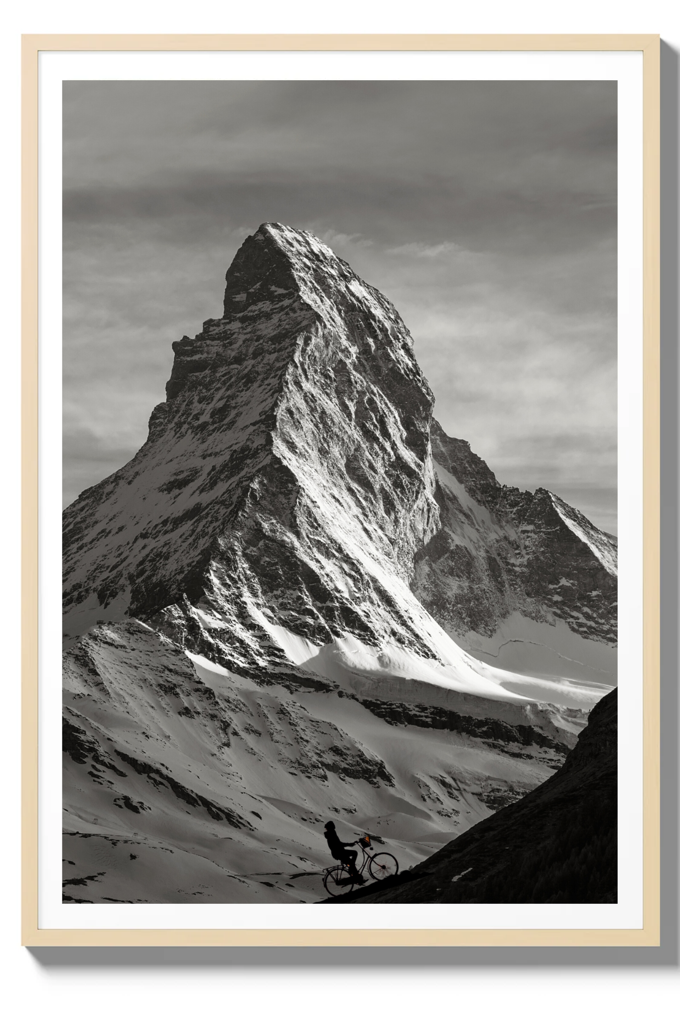 A delicate layer of light snow blankets the hills and ground, enhancing the stark contrast between the dark mountain edges and the pristine white snow. The scene is brought to life by the solitary figure of a cyclist ascending the mountain’s dark edge, embodying the spirit of adventure and perseverance.