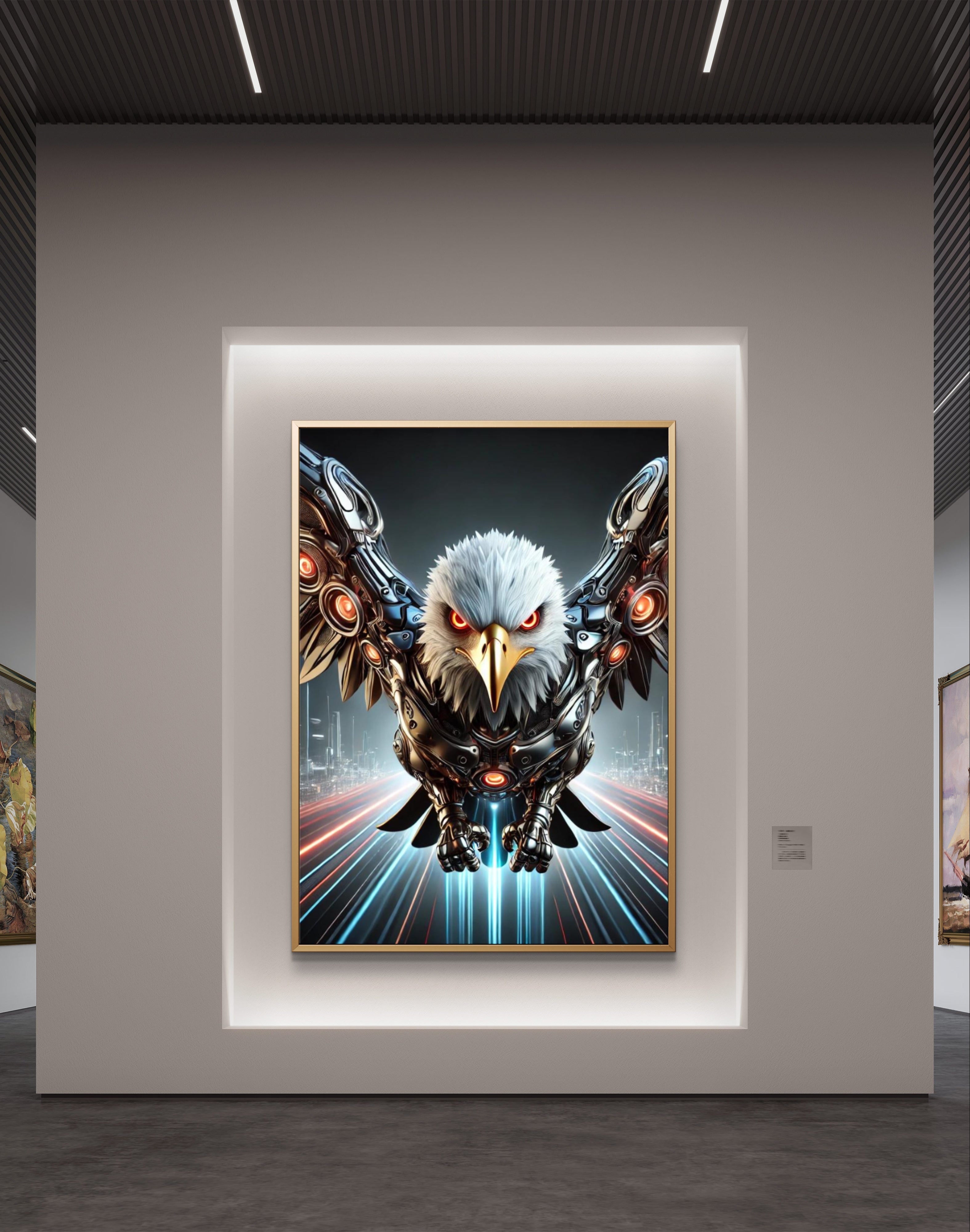 Soar into a visionary realm with Eyes of Future (Eagle Edition), a striking art print that embodies the majestic and prophetic spirit of the eagle. This dynamic photograph captures an awe-inspiring futuristic eagle, designed with wings forged from gleaming steel and piercing eyes ablaze with fire. The color palette is a bold and vibrant mix of silver, orange, blue, black, and white, emphasizing the eagle's fierce and unyielding nature.