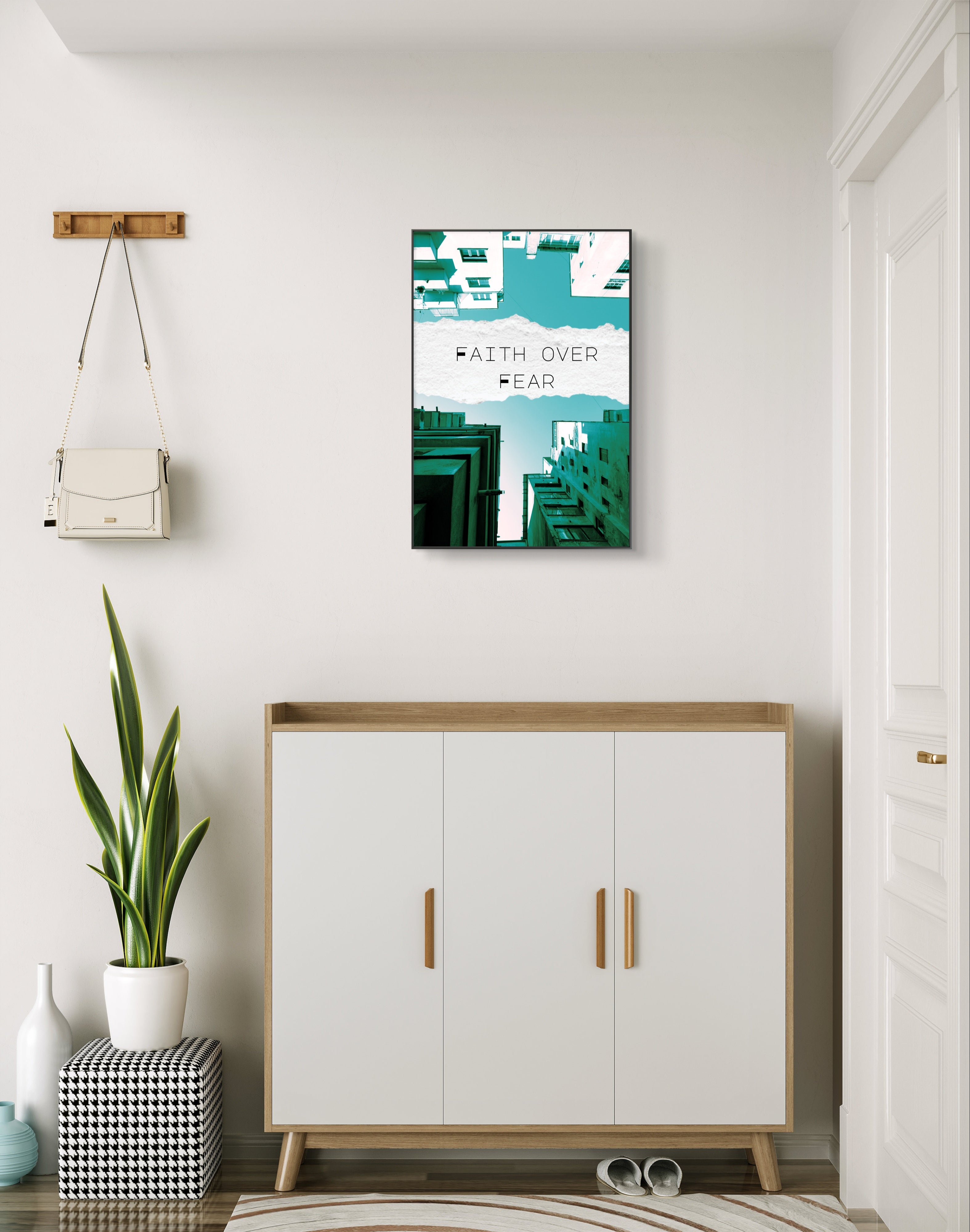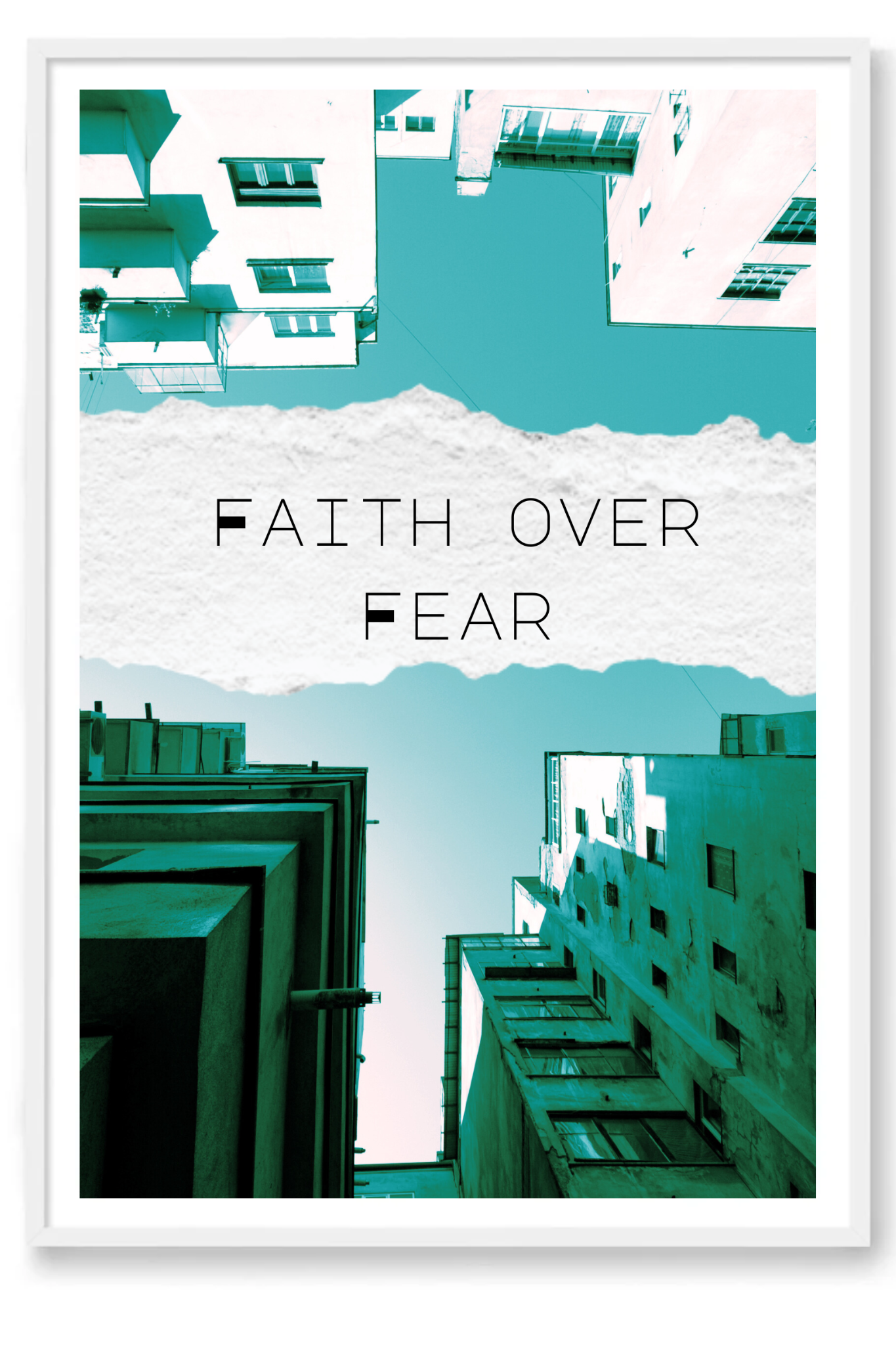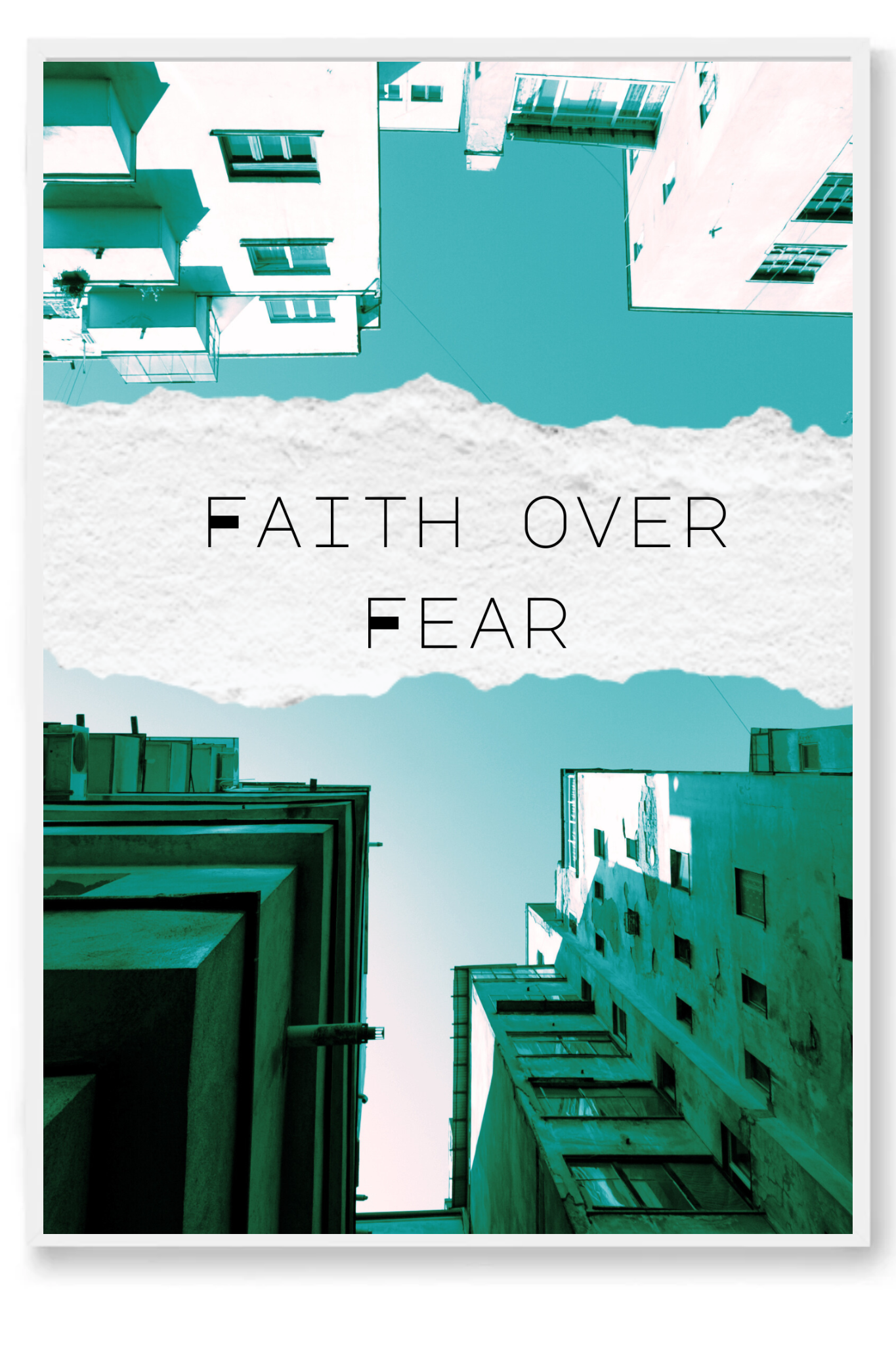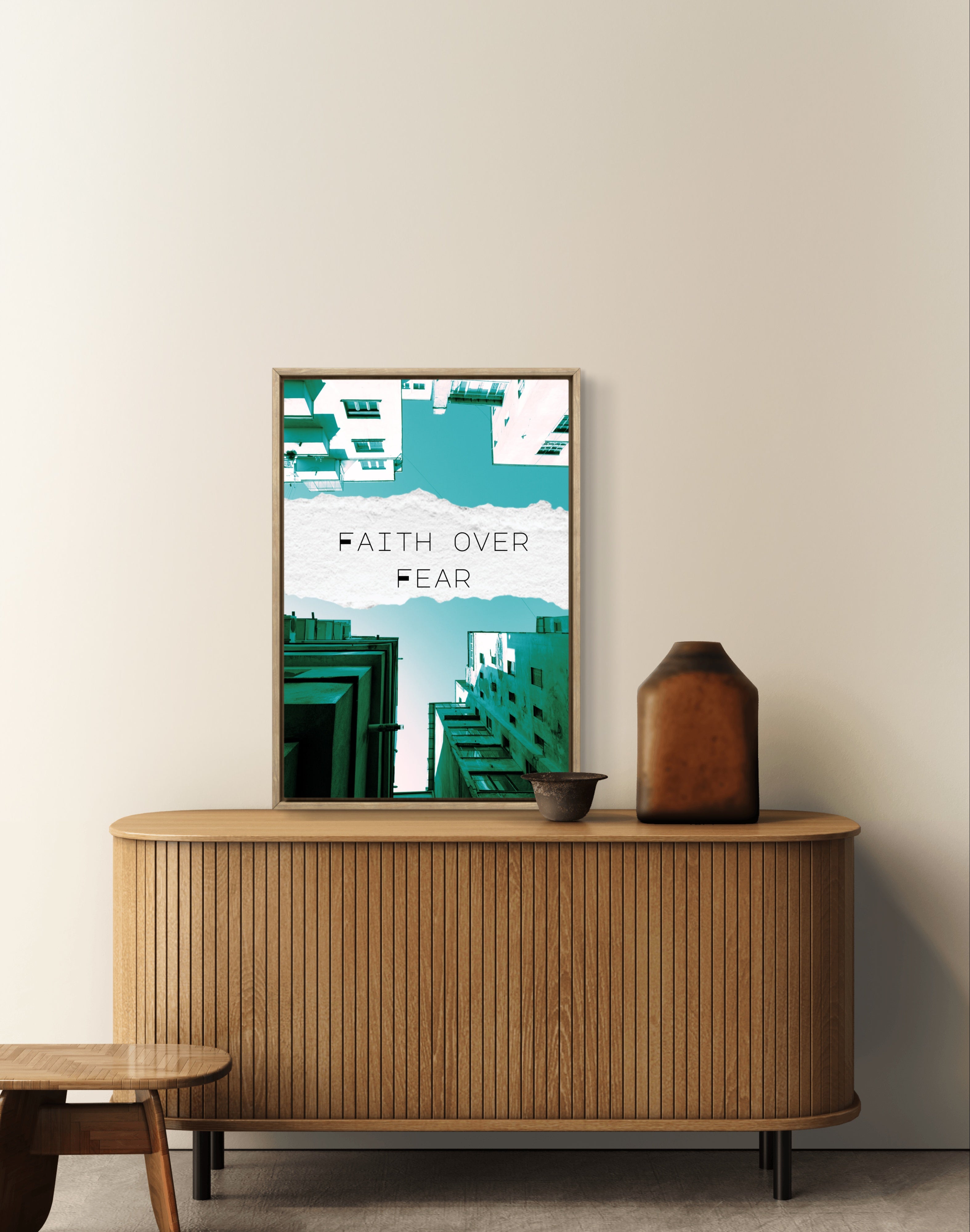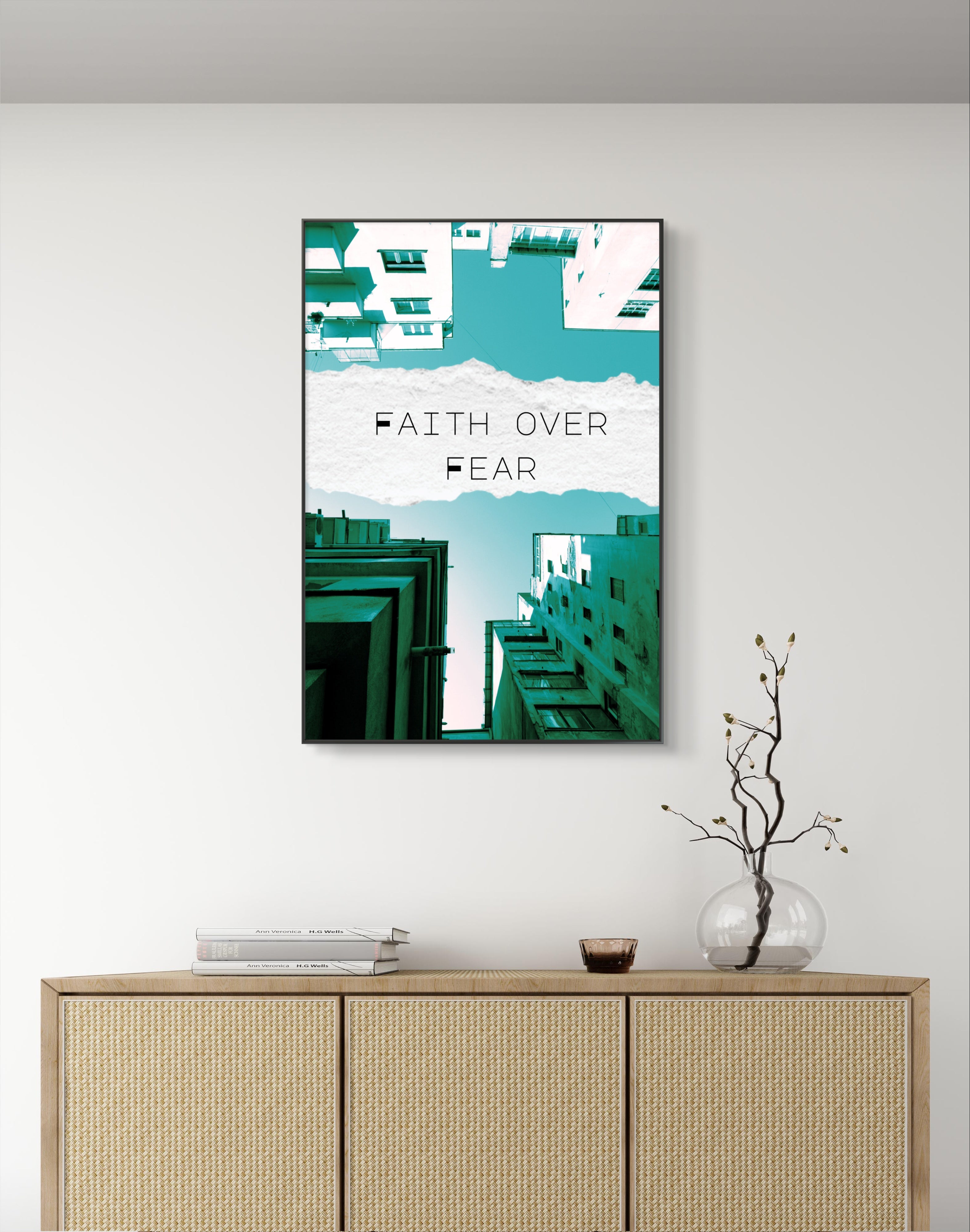 Elevate your space with Faith Over Fear, an abstract art print that powerfully combines urban architecture with an inspiring message. This striking piece captures a dramatic view of towering high-rise buildings, seen from the bottom up, which leads the eye to the expansive sky above. The cityscape, depicted in rustic greenish tones, creates a bold yet grounded visual that adds depth and character to any room.