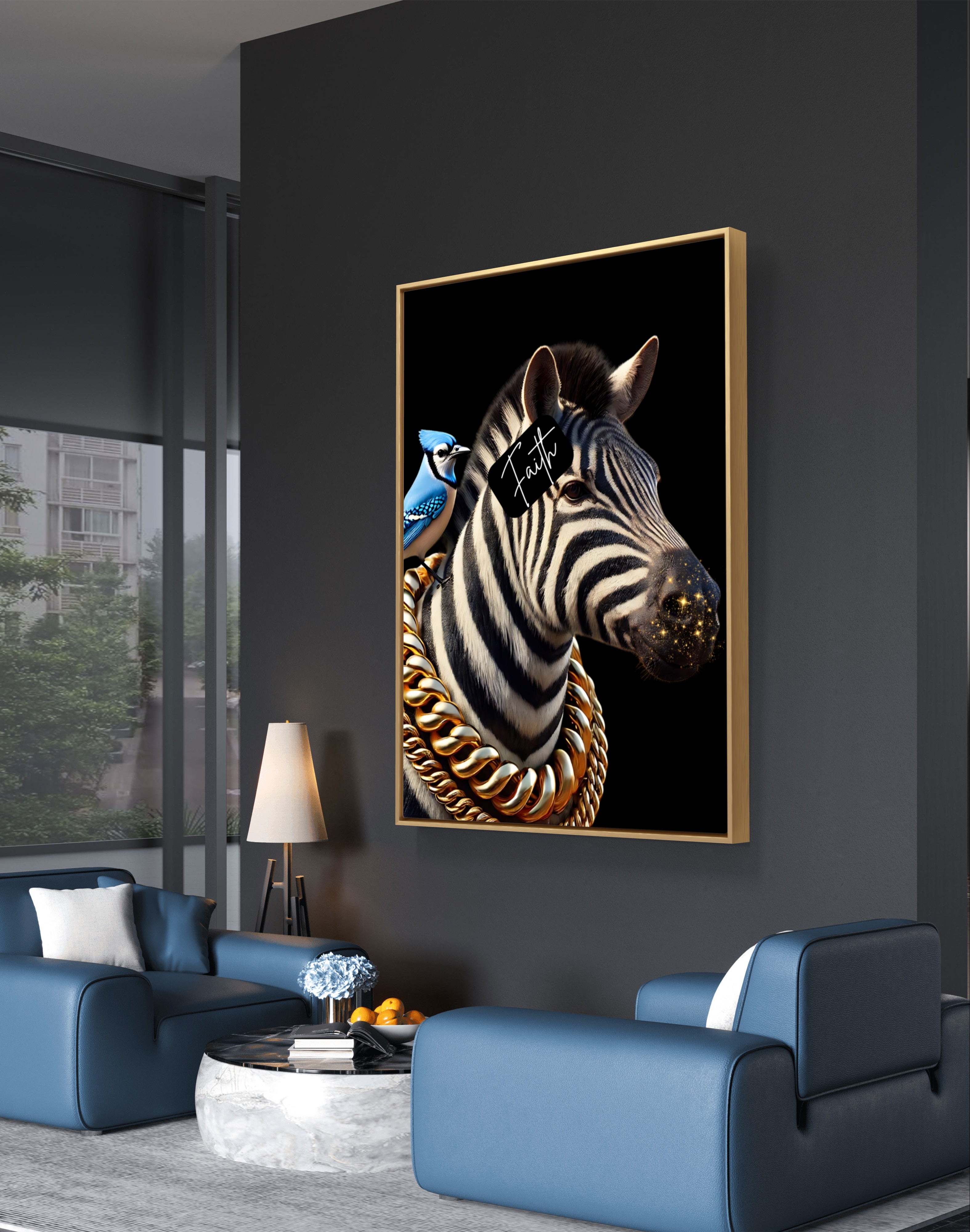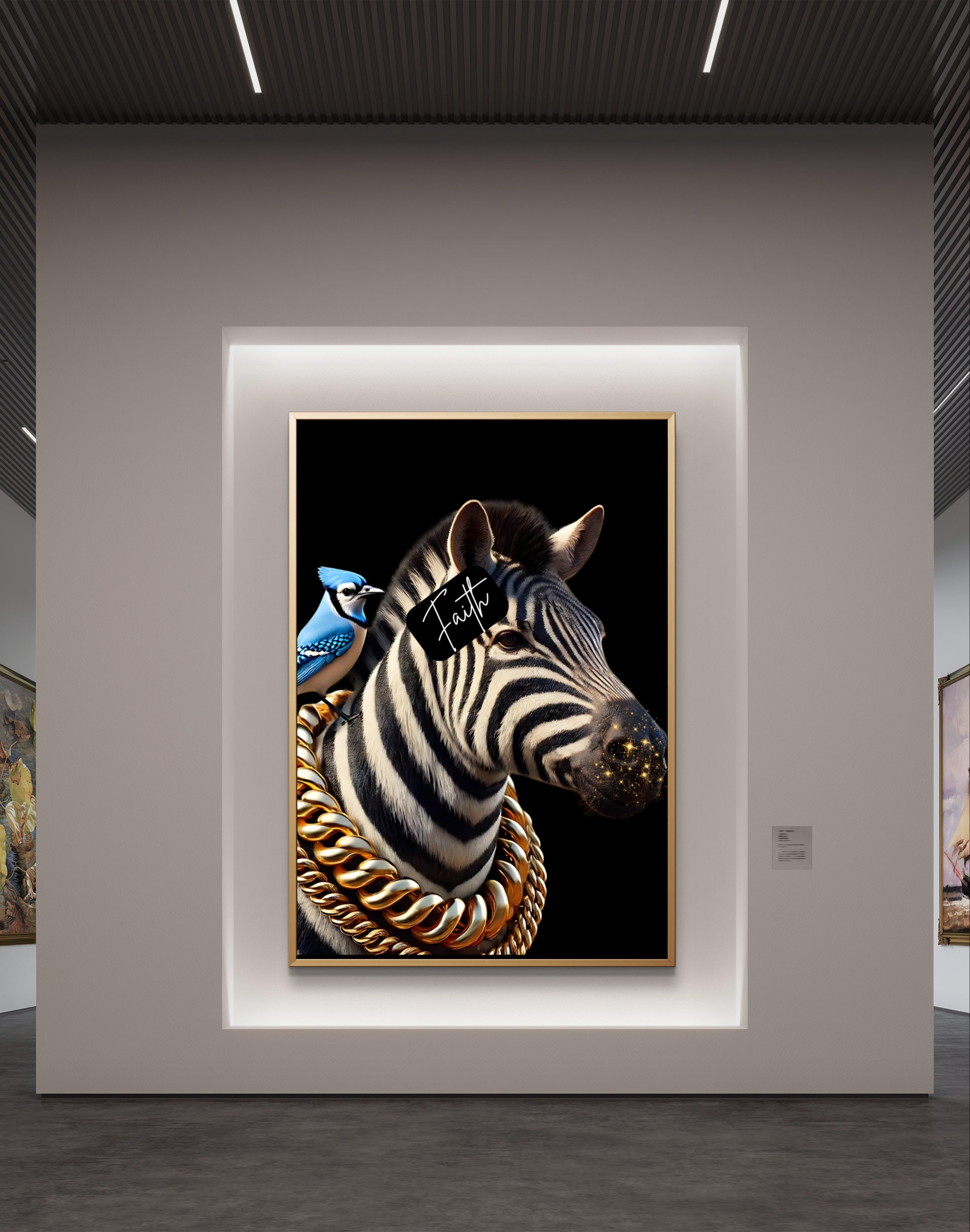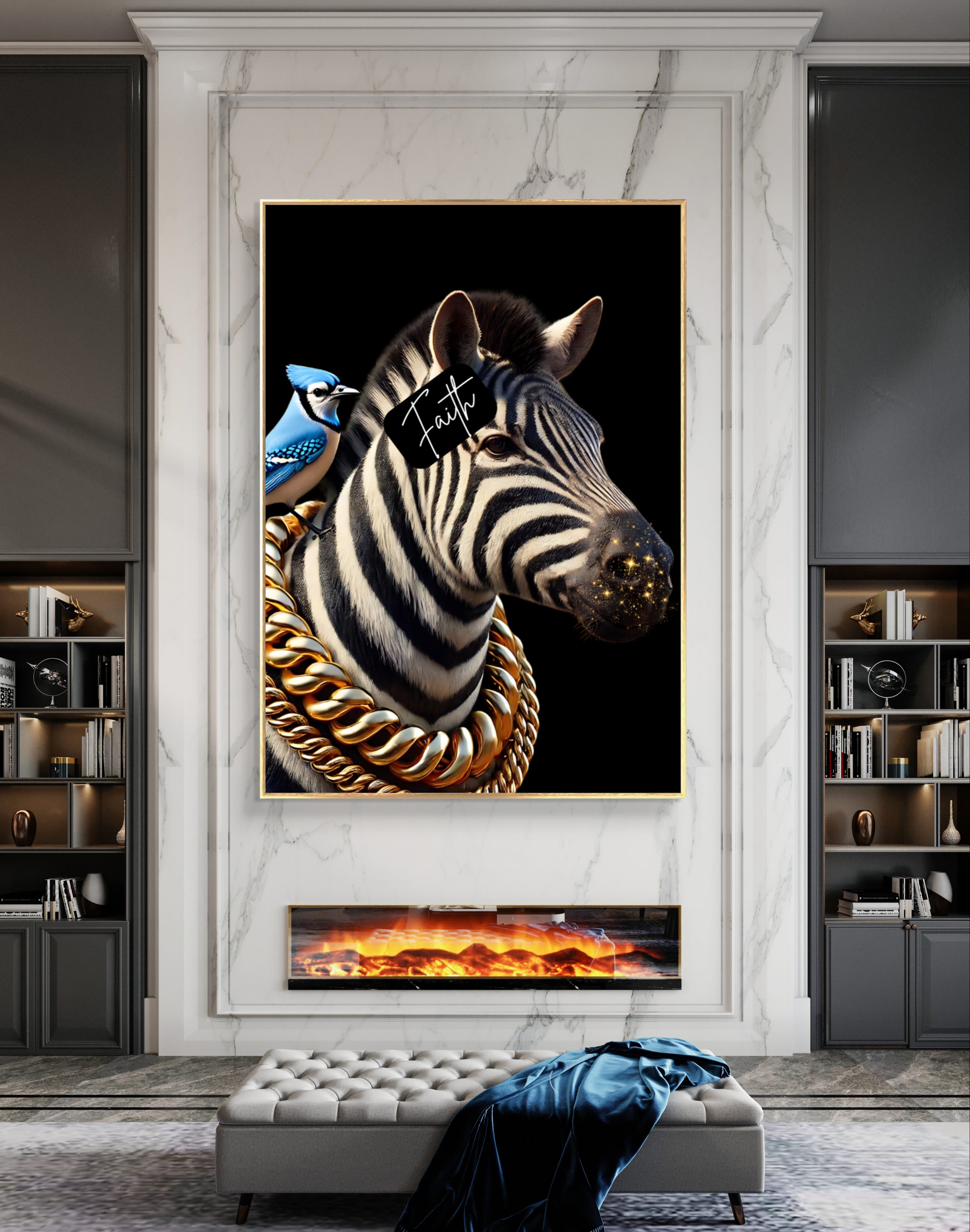 Faith & Stripes is a powerful reminder that the stripes we bear in life are not just marks of struggle but symbols of strength and faith. Each stripe represents a testimony of perseverance and the unwavering belief that our trials are meant to fortify our spirits. The glittering gold mouth and the blue jay signify the beauty and freedom that come from embracing faith, while the gold chains add a touch of regality, underscoring the noble journey of faith.