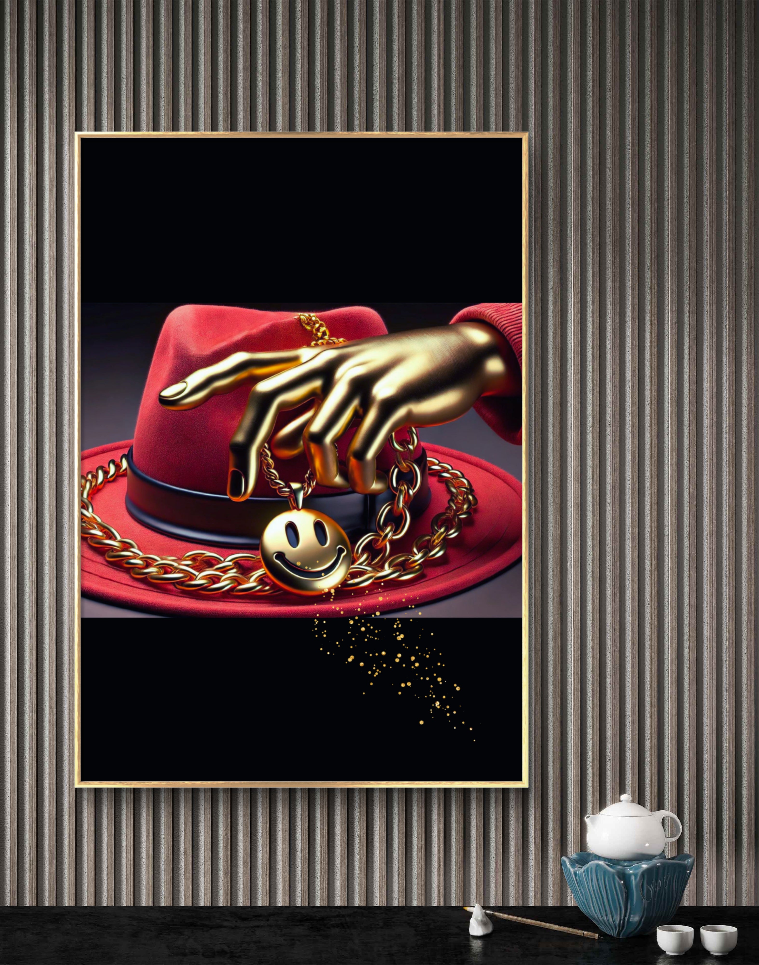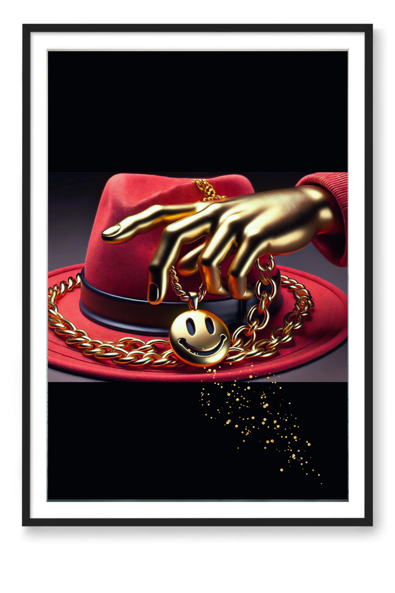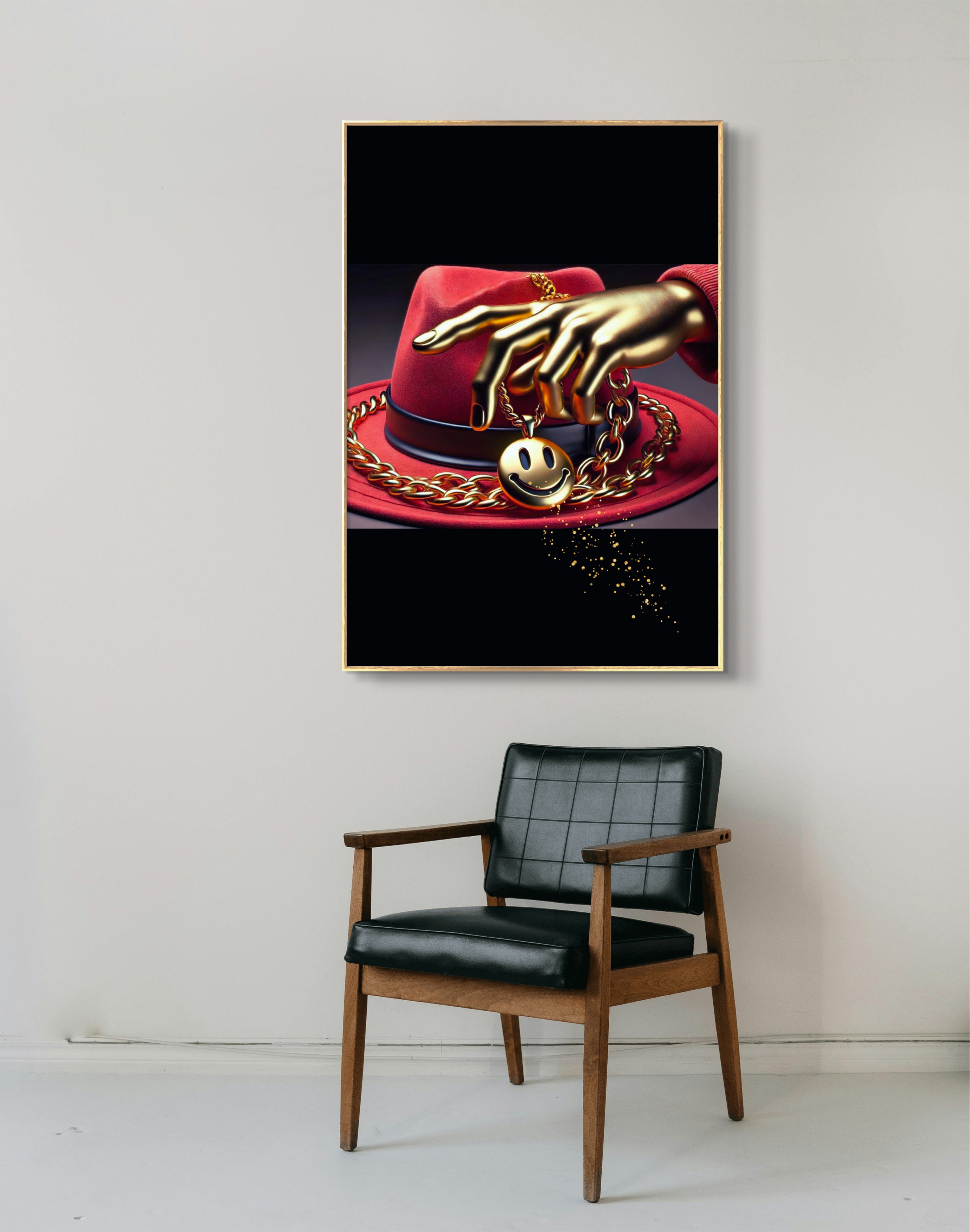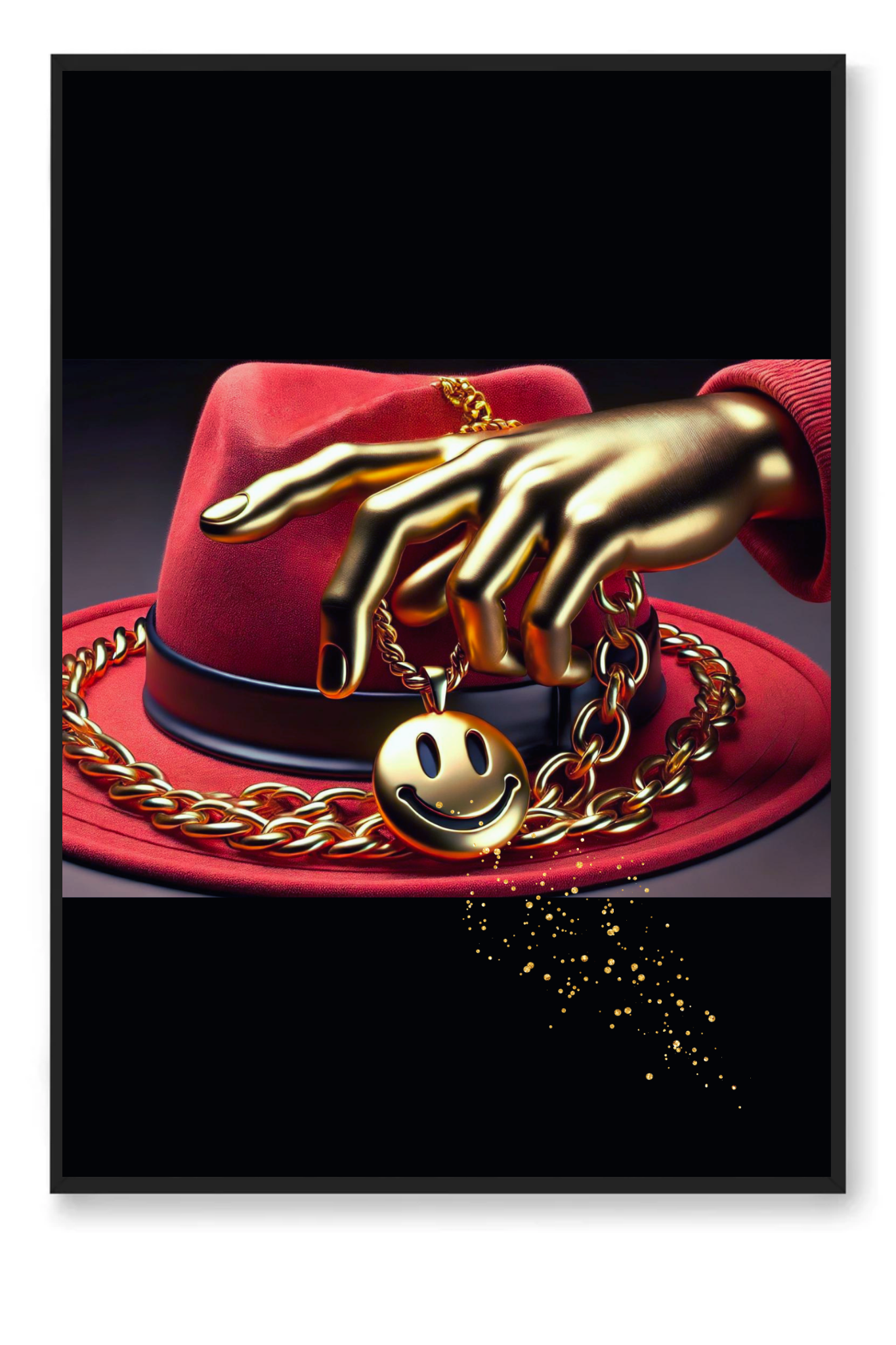 Unleash the essence of boldness and luxury with "Favor,Faith & Prosperity," a captivating 3D art print that combines daring style with a touch of opulence. This striking piece features a vivid red hat, meticulously detailed and wrapped with a lustrous gold chain. Clasped by gold hands that grip the chain with determined grace, the image stands out dramatically against a deep black backdrop, creating a stunning visual contrast that draws the eye and captivates the mind.