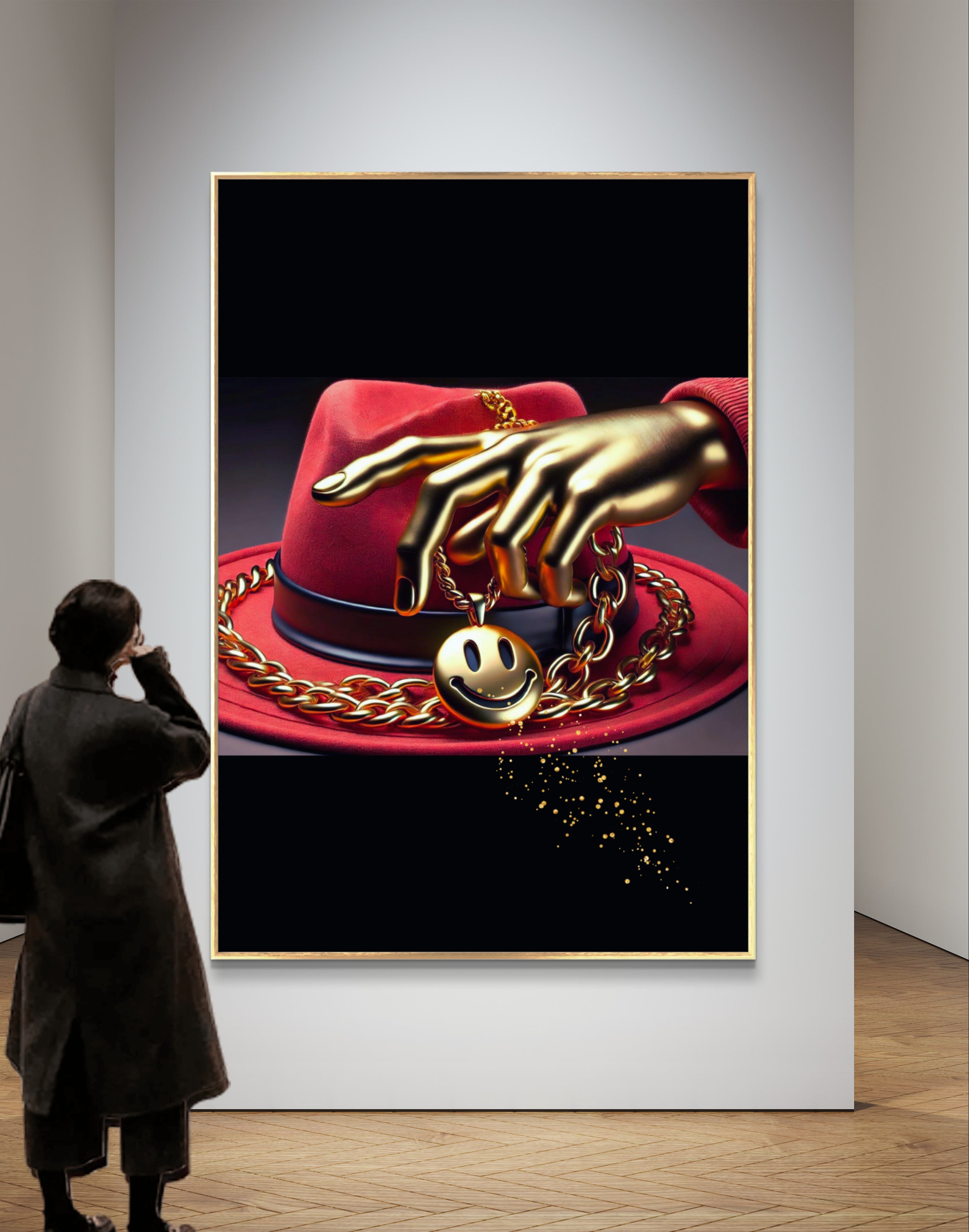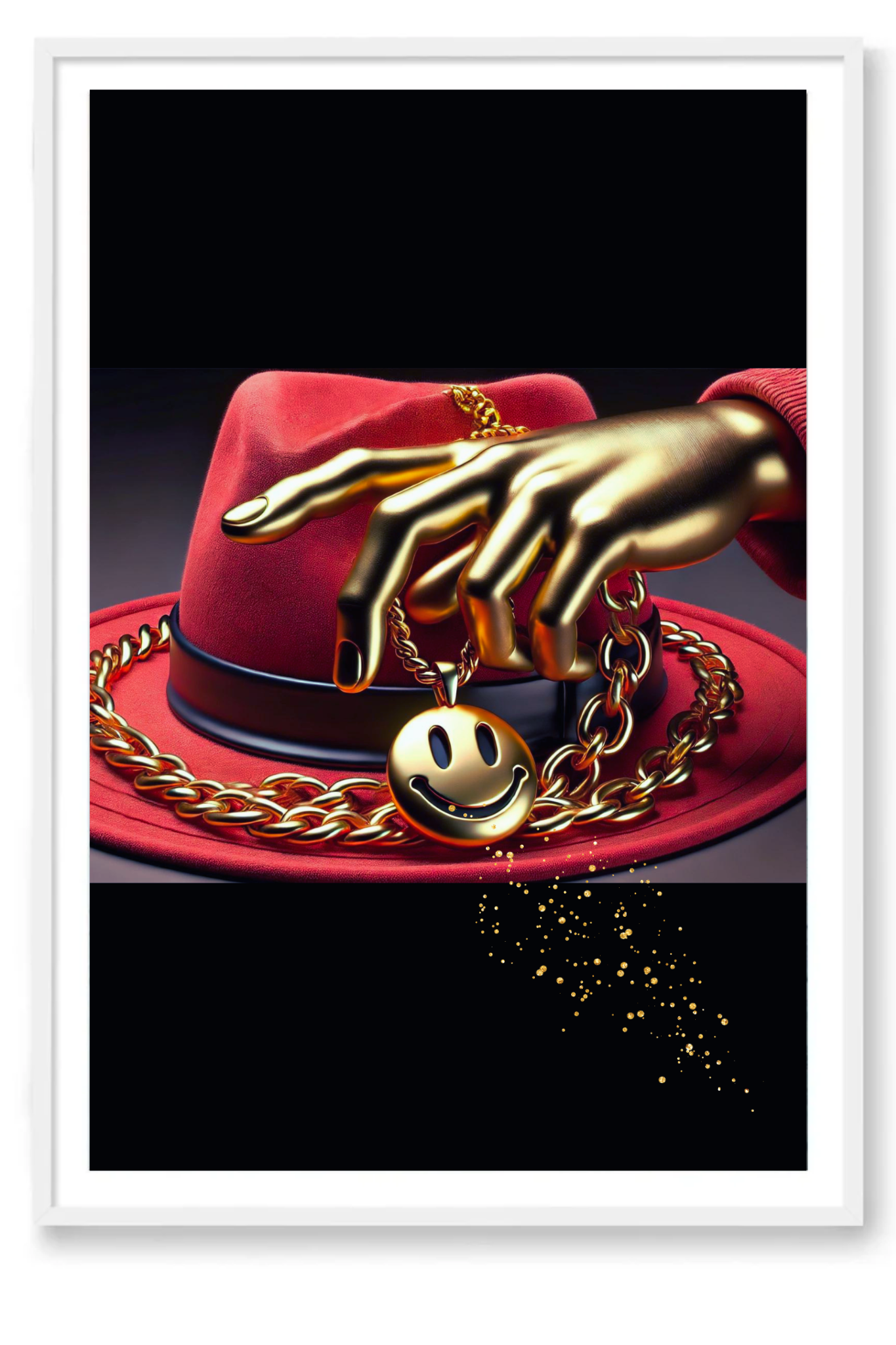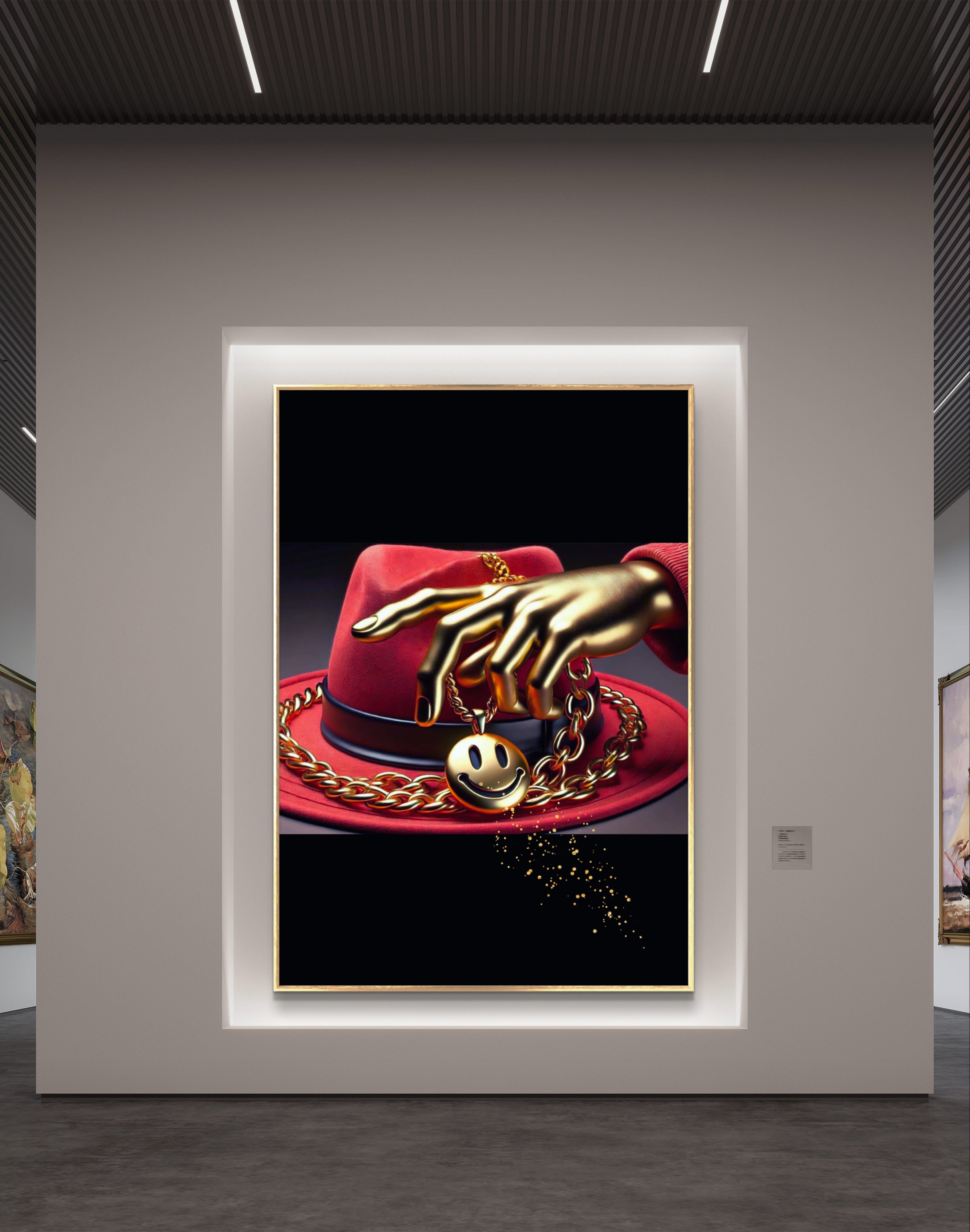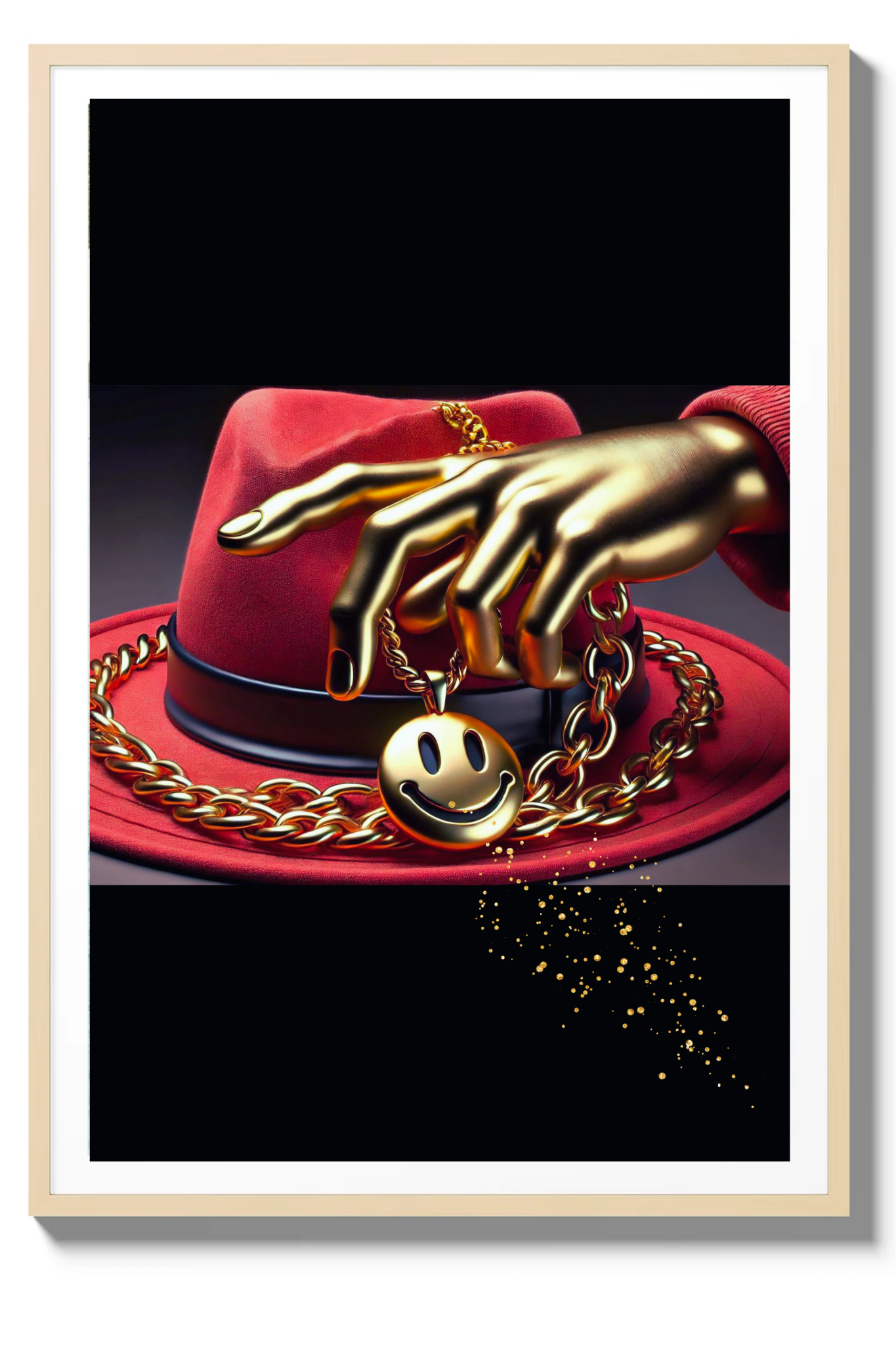 Unleash the essence of boldness and luxury with "Favor,Faith & Prosperity," a captivating 3D art print that combines daring style with a touch of opulence. This striking piece features a vivid red hat, meticulously detailed and wrapped with a lustrous gold chain. Clasped by gold hands that grip the chain with determined grace, the image stands out dramatically against a deep black backdrop, creating a stunning visual contrast that draws the eye and captivates the mind.