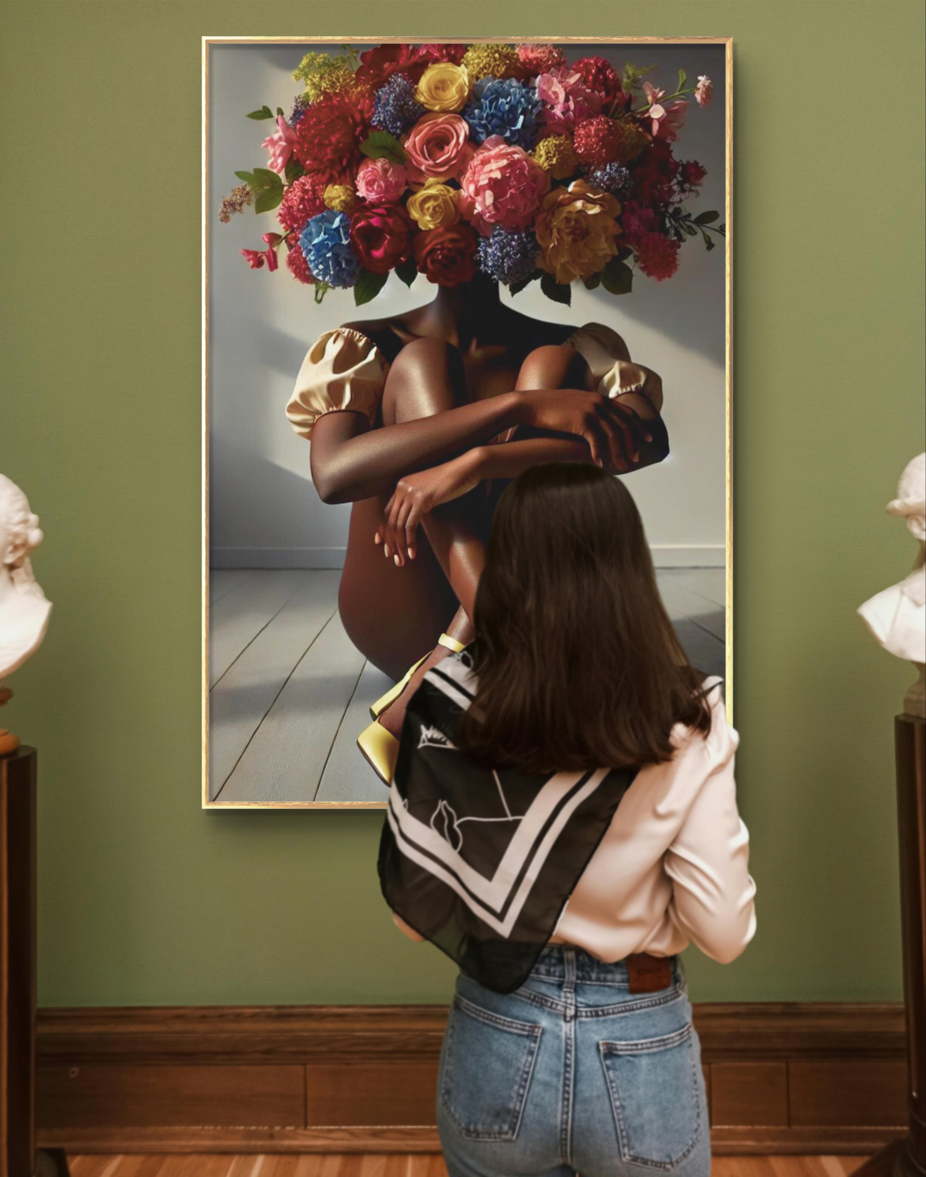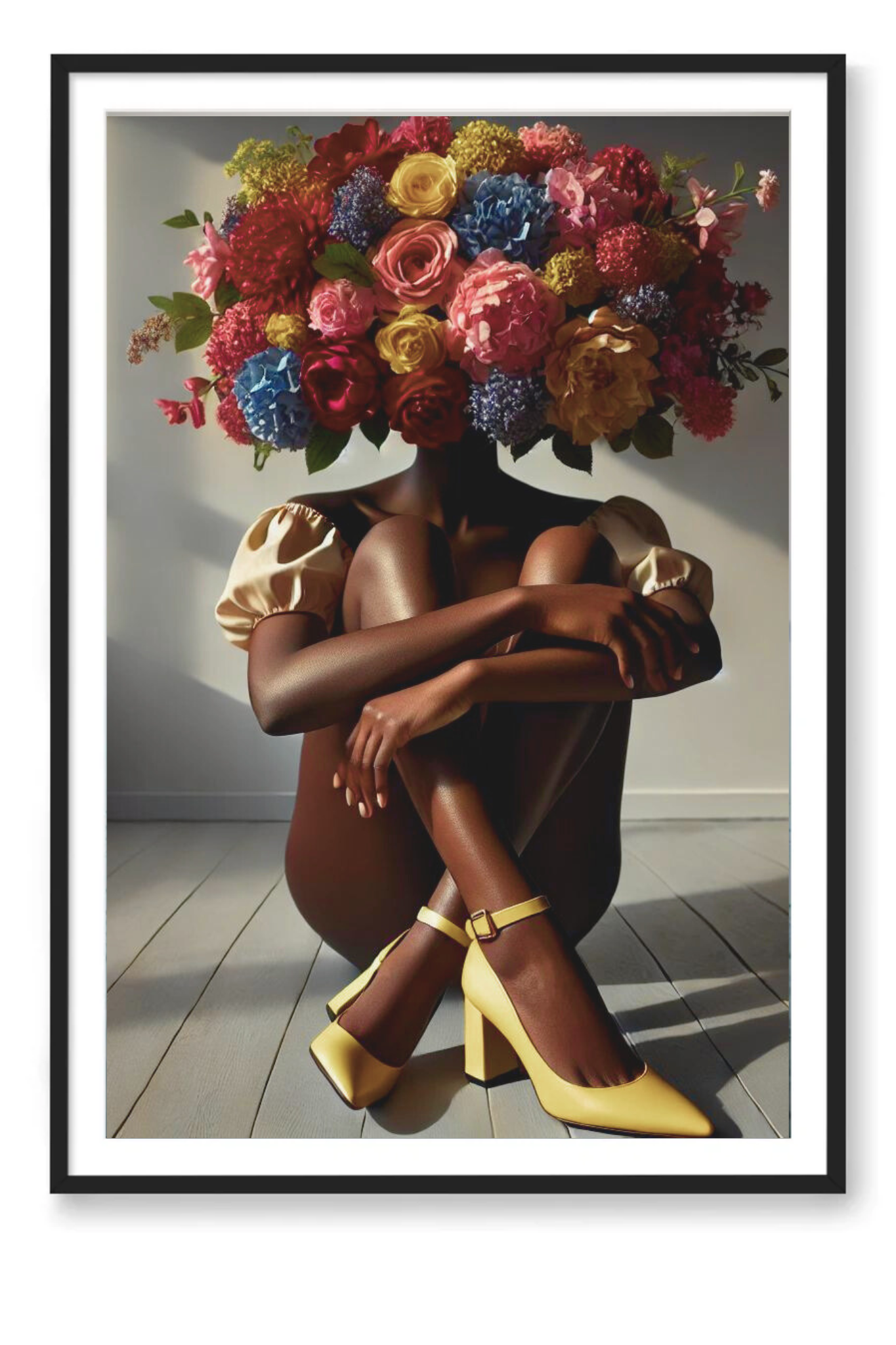 Embrace the transformative power of "Fruitfulness," a mesmerizing fine art print that captures the essence of spiritual growth and prosperity. This striking photograph features a woman seated in serene contemplation, her head adorned with a cascade of vibrant, colorful flowers. Her face remains hidden, symbolizing the profound, personal journey of flourishing through divine wisdom.