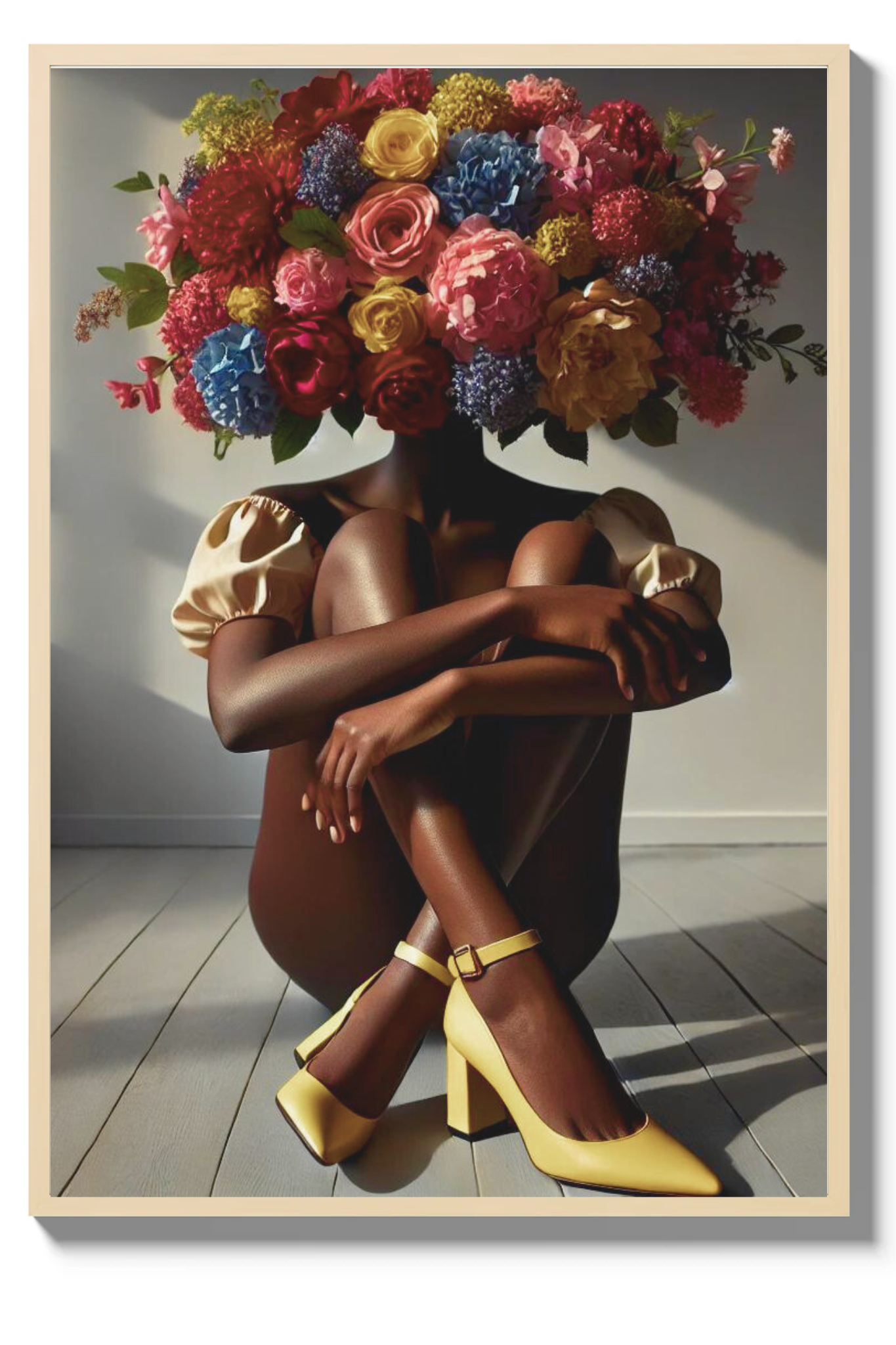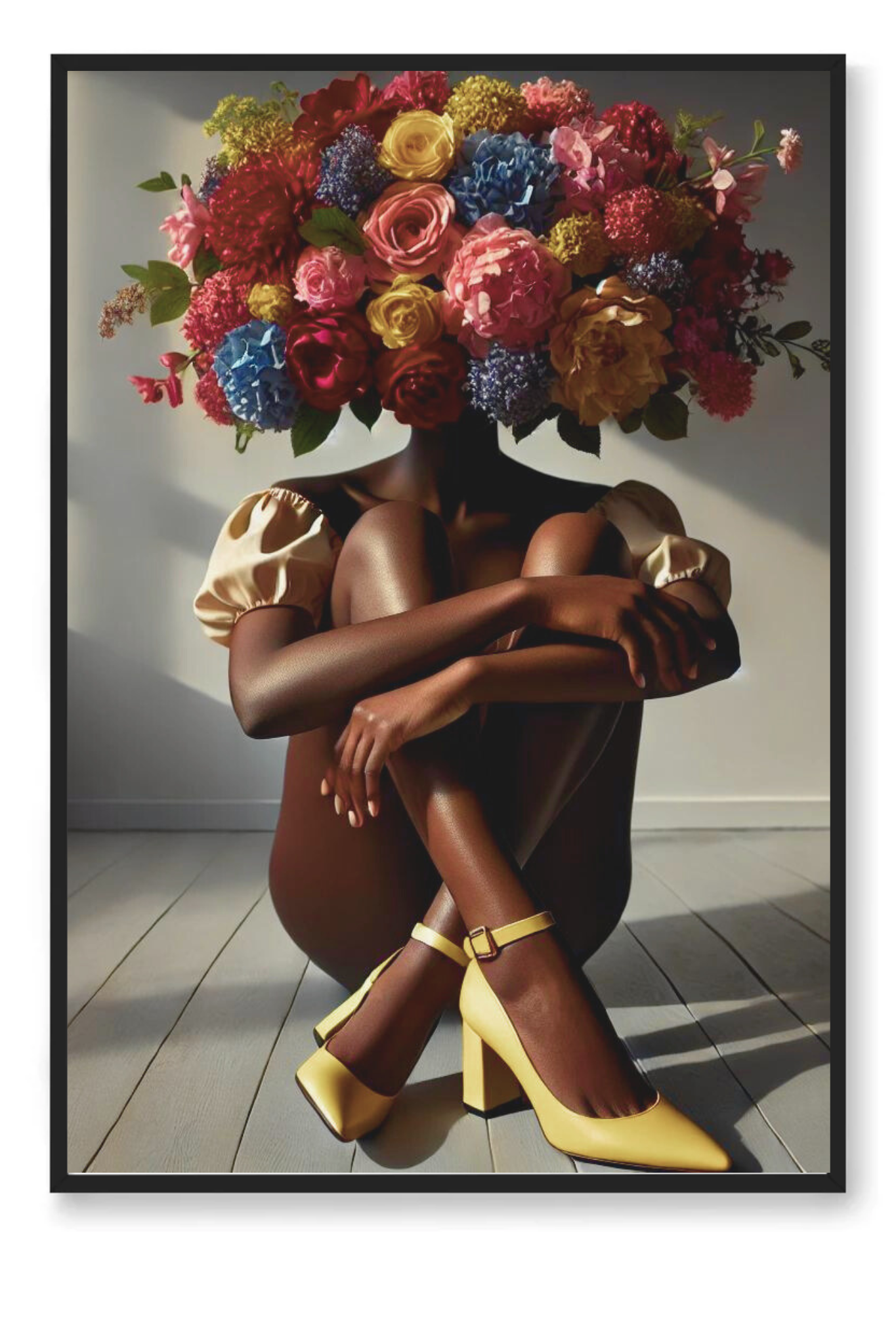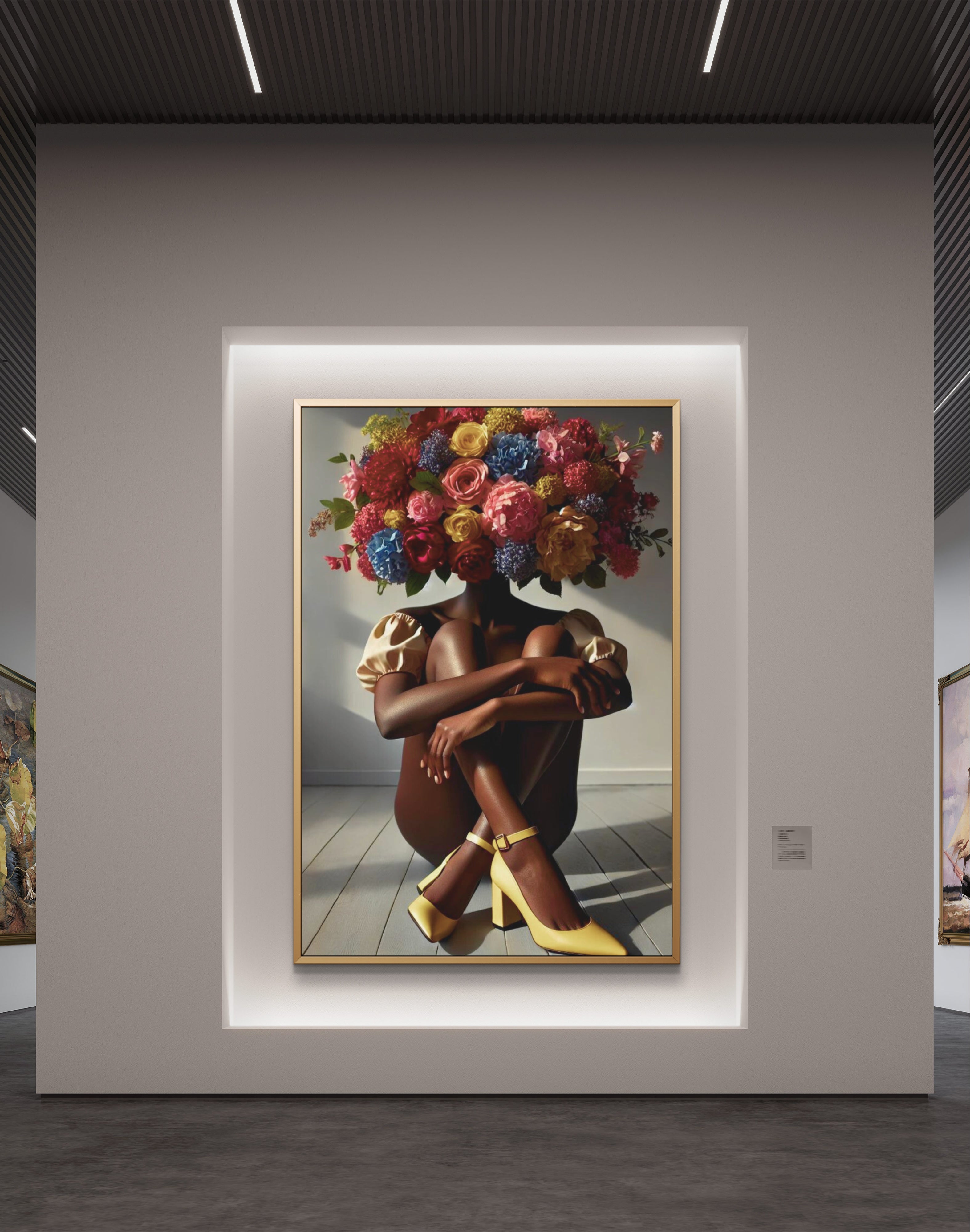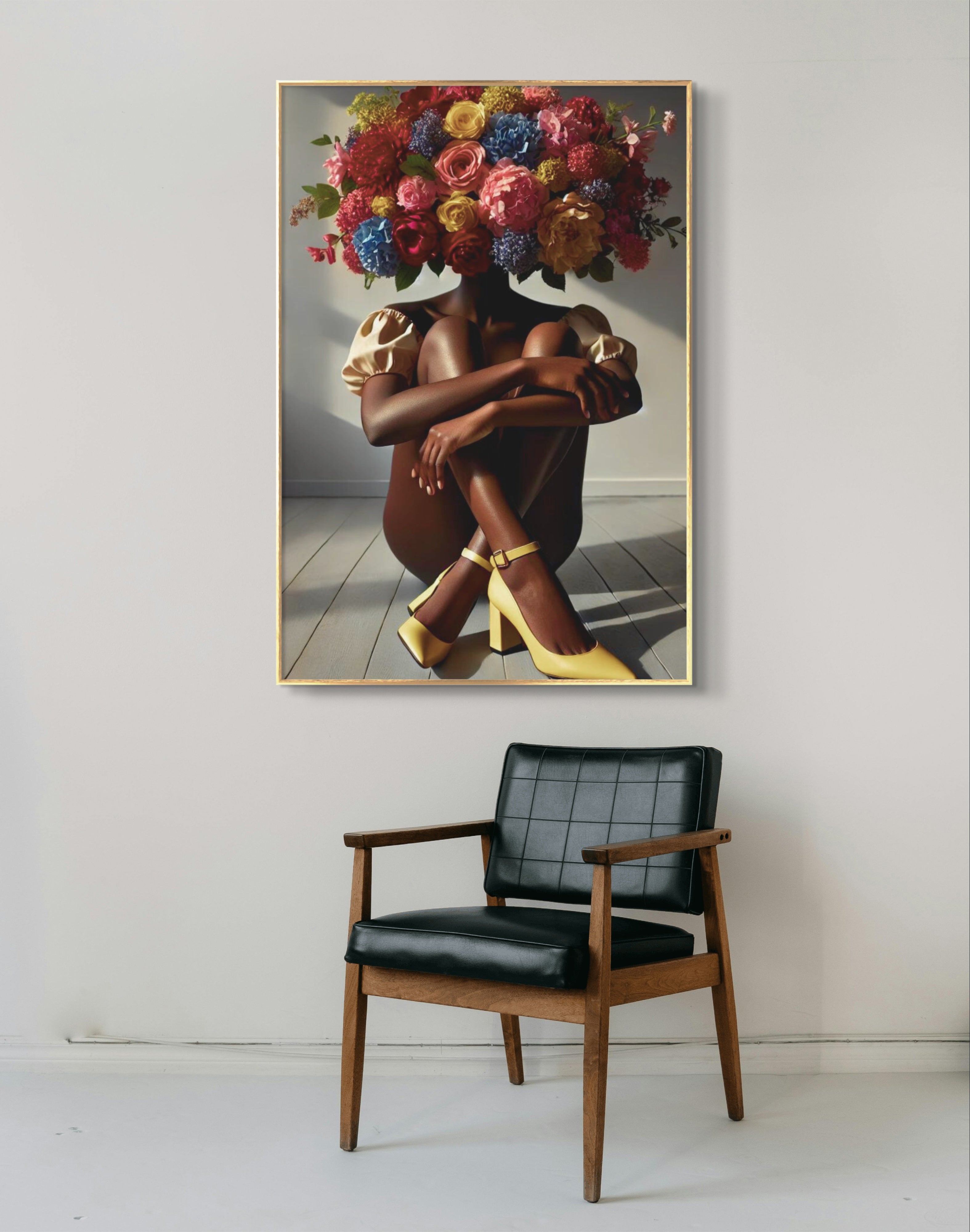 The vivid flowers emerging from her head are a visual metaphor for the fruitfulness that comes from living a life deeply rooted in God's word. The bright yellow shoes she wears signify healing and the boundless prosperity that flows from a faith-filled existence.