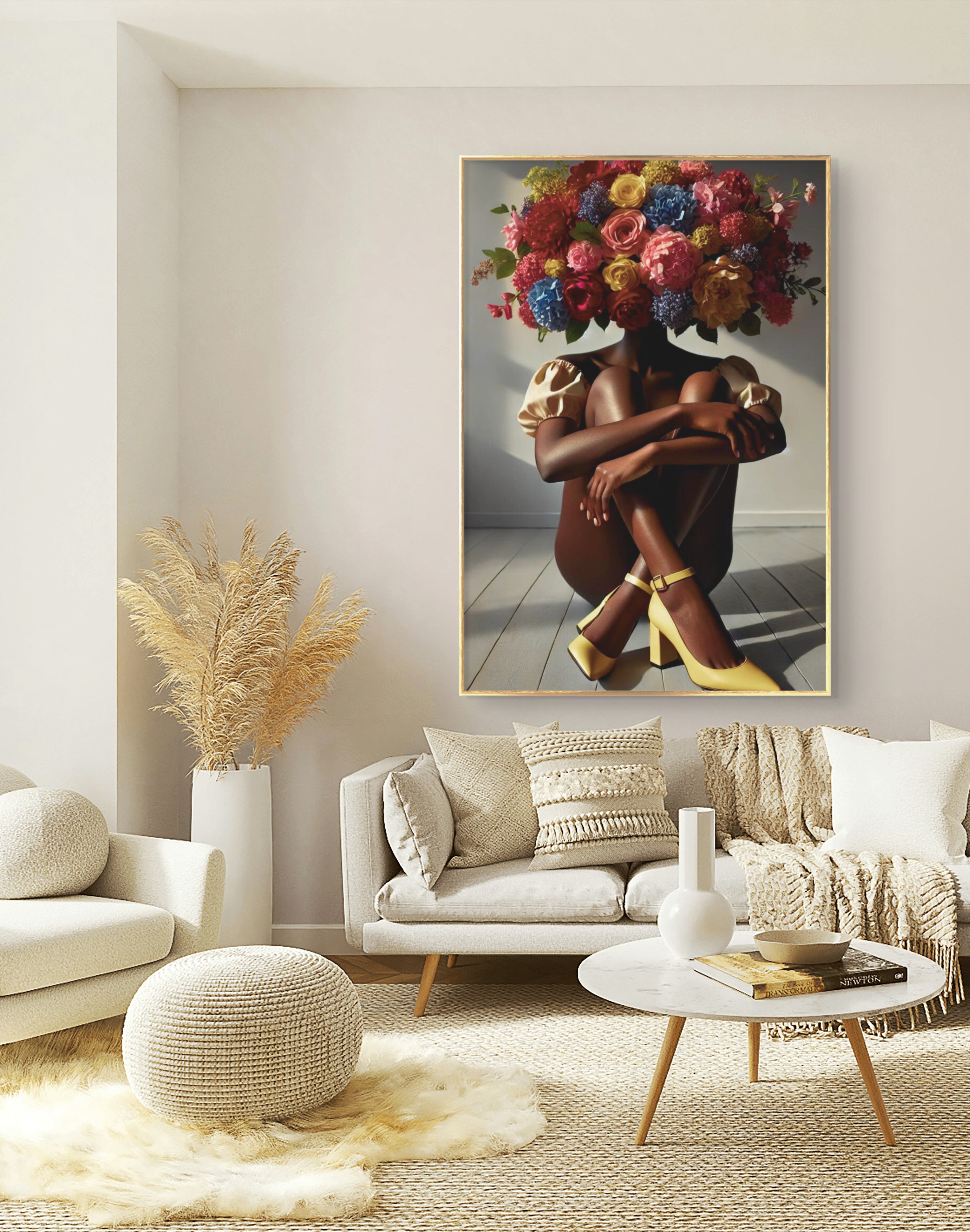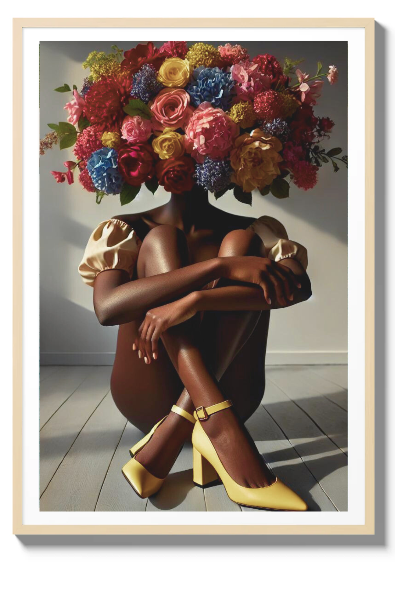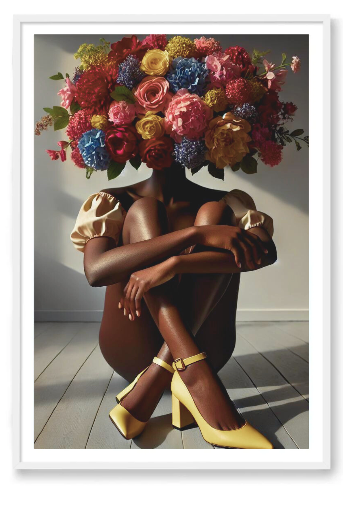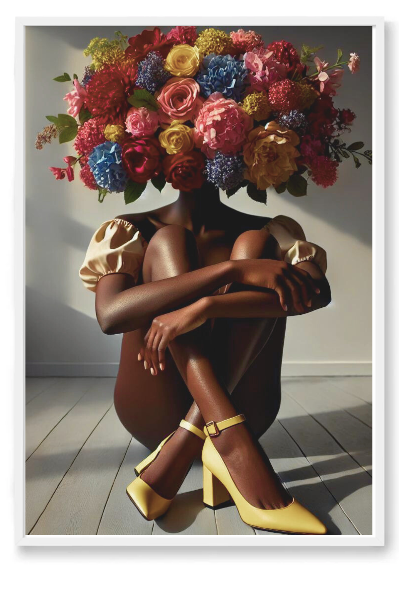The vivid flowers emerging from her head are a visual metaphor for the fruitfulness that comes from living a life deeply rooted in God's word. The bright yellow shoes she wears signify healing and the boundless prosperity that flows from a faith-filled existence.