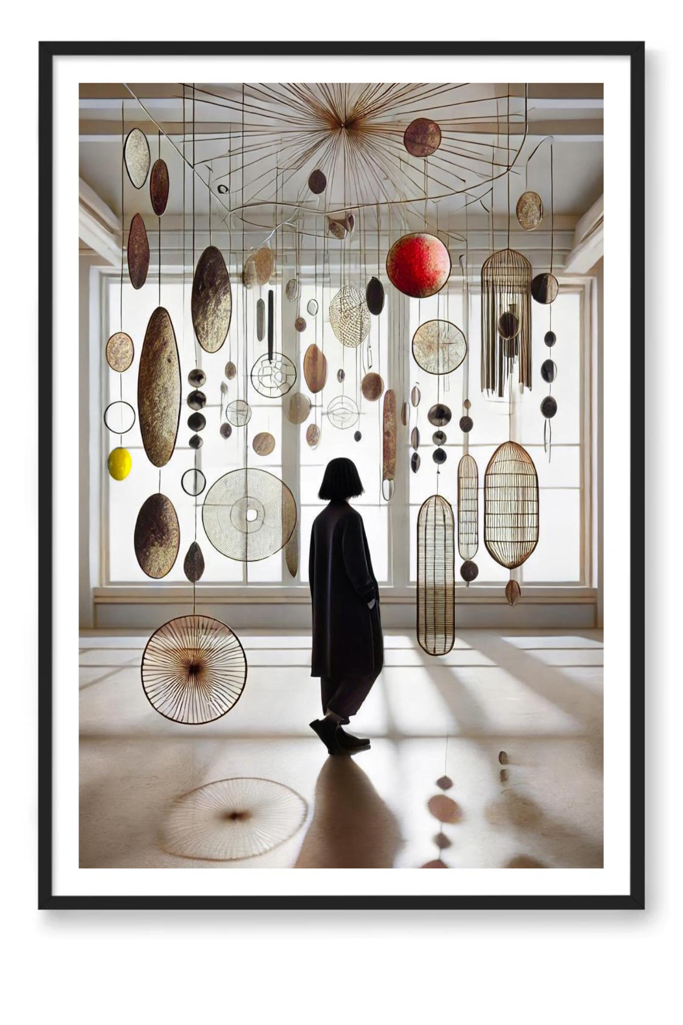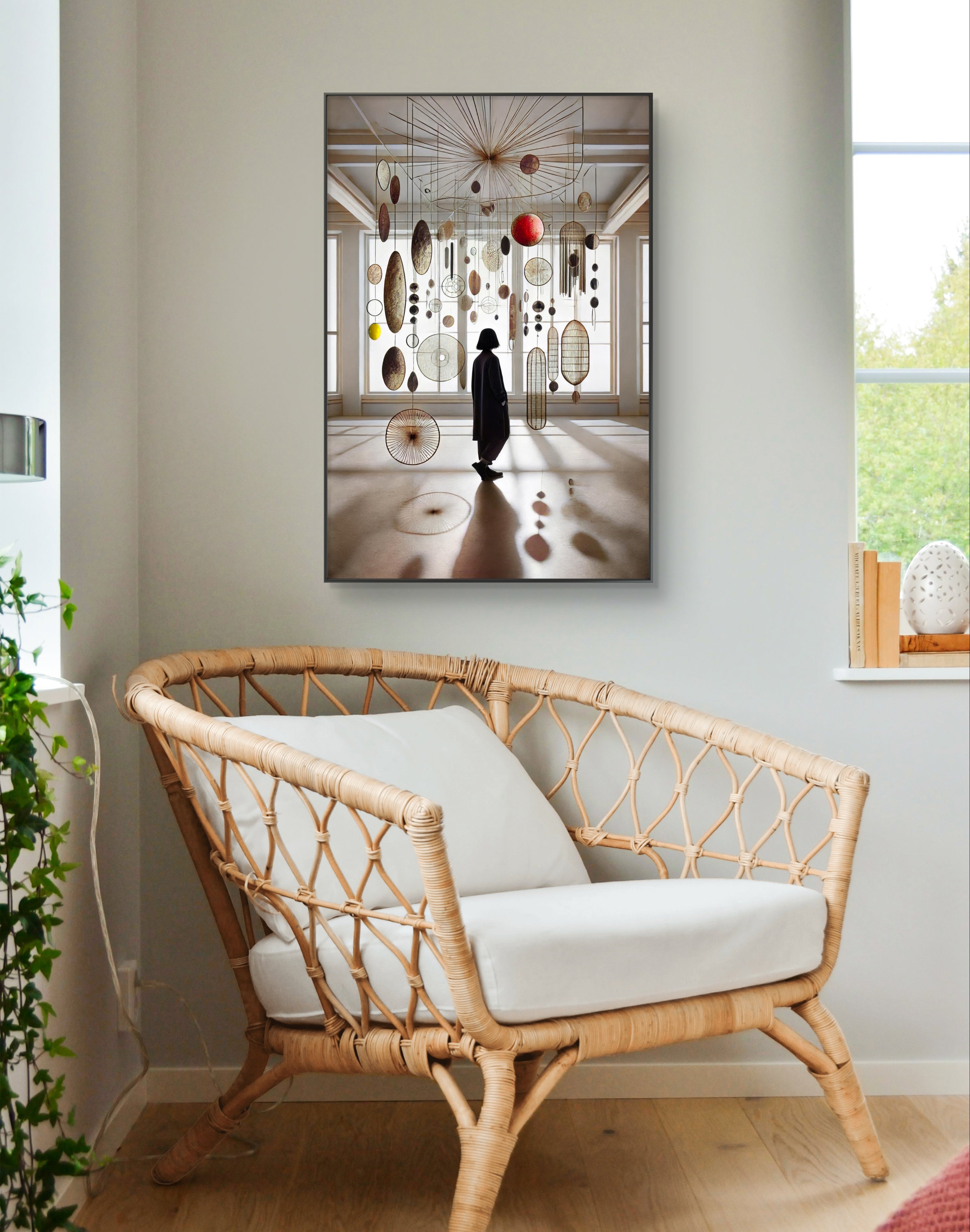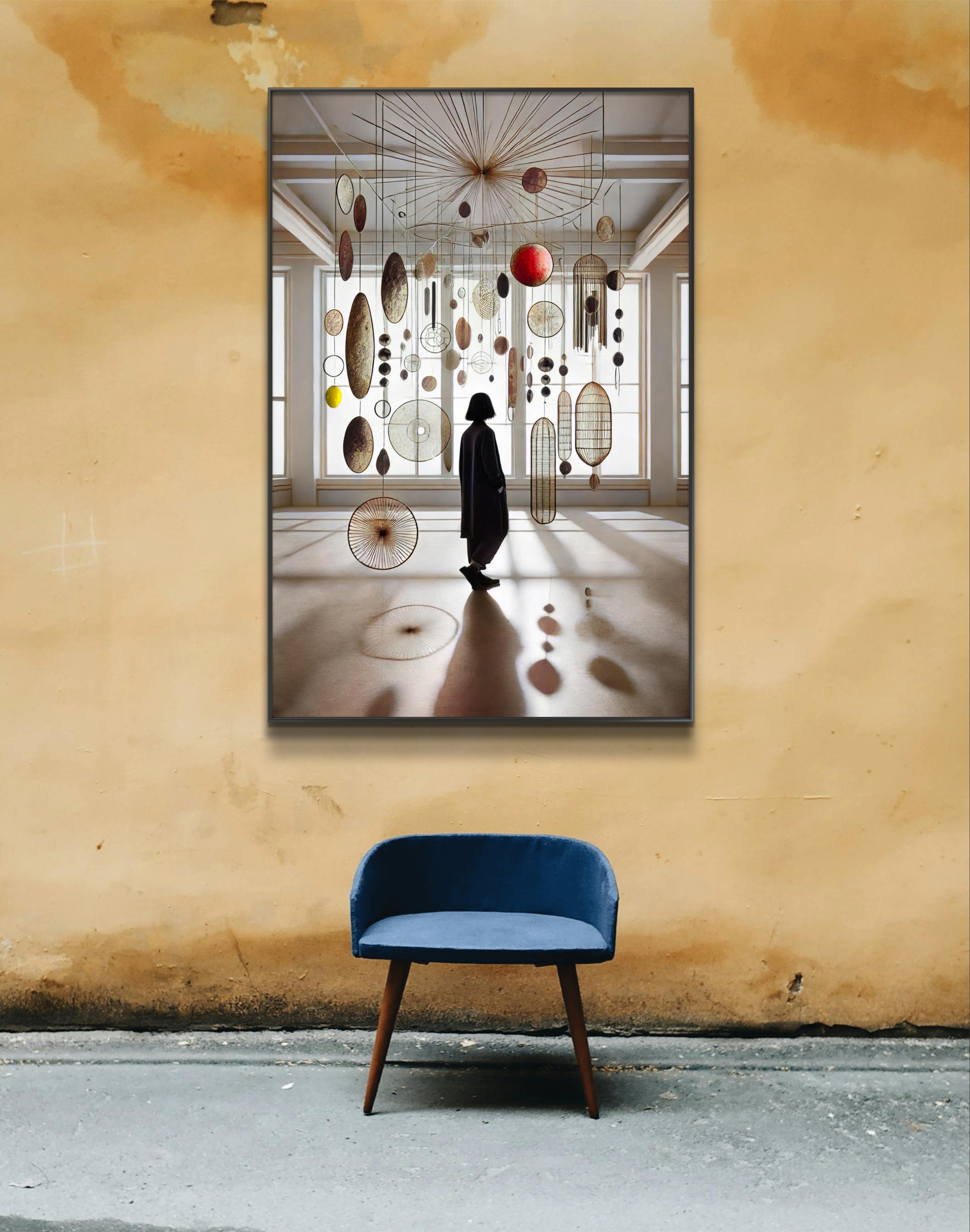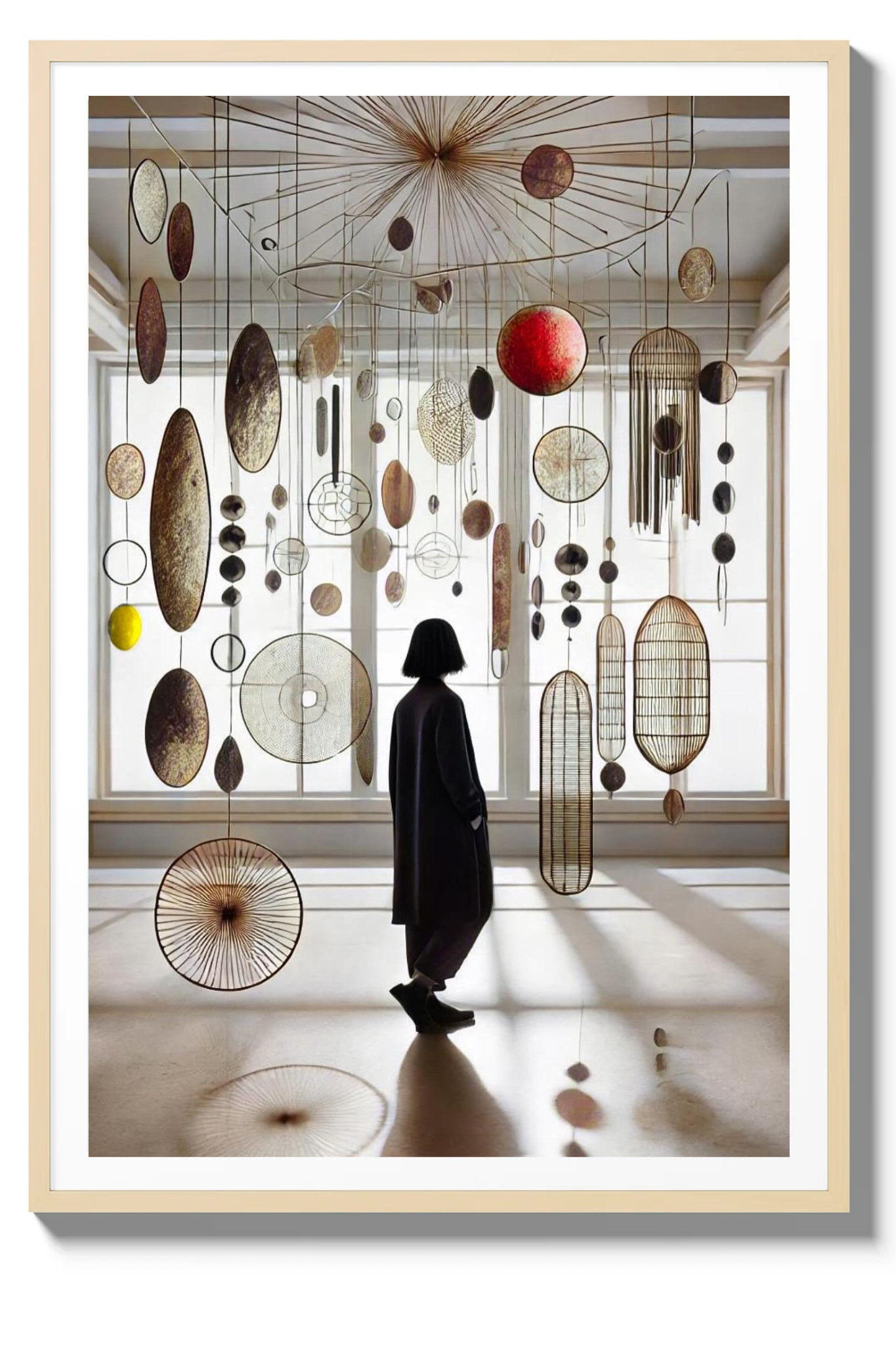 Illuminate your space with the thought-provoking art print Geometry, an abstract wall art print that combines vintage charm with profound symbolism. This captivating image features a woman bathed in natural light, surrounded by the play of shadows and light from multiple abstract shapes hanging from a chandelier.