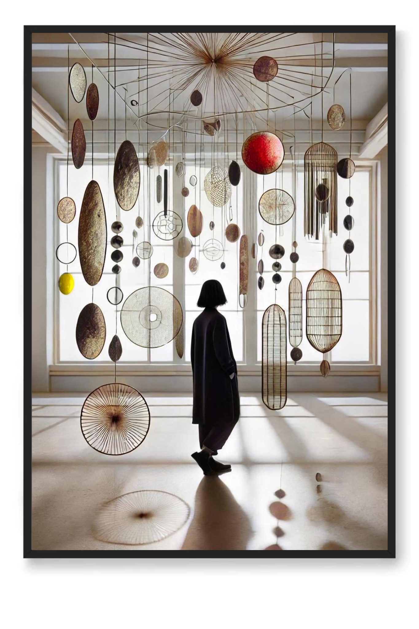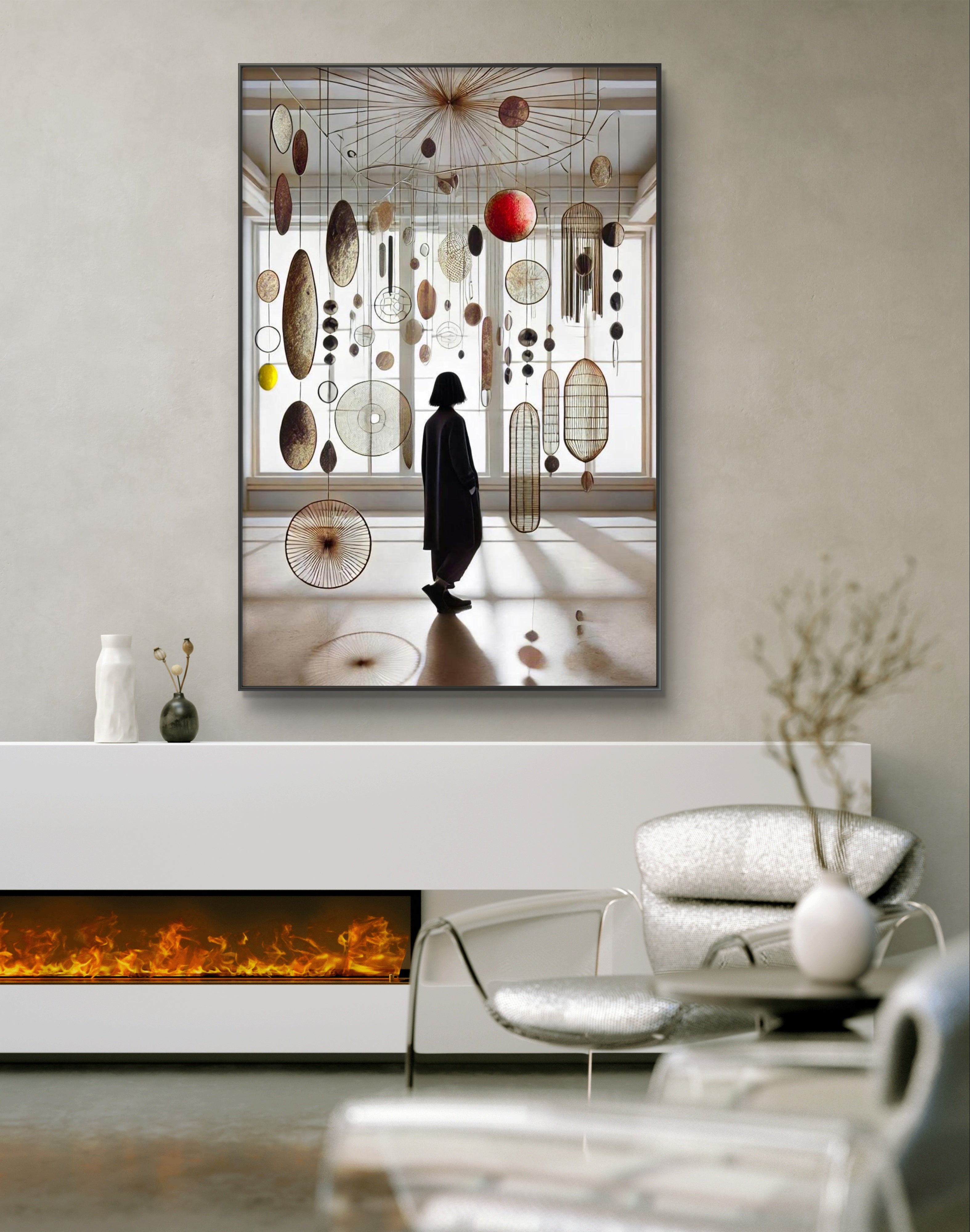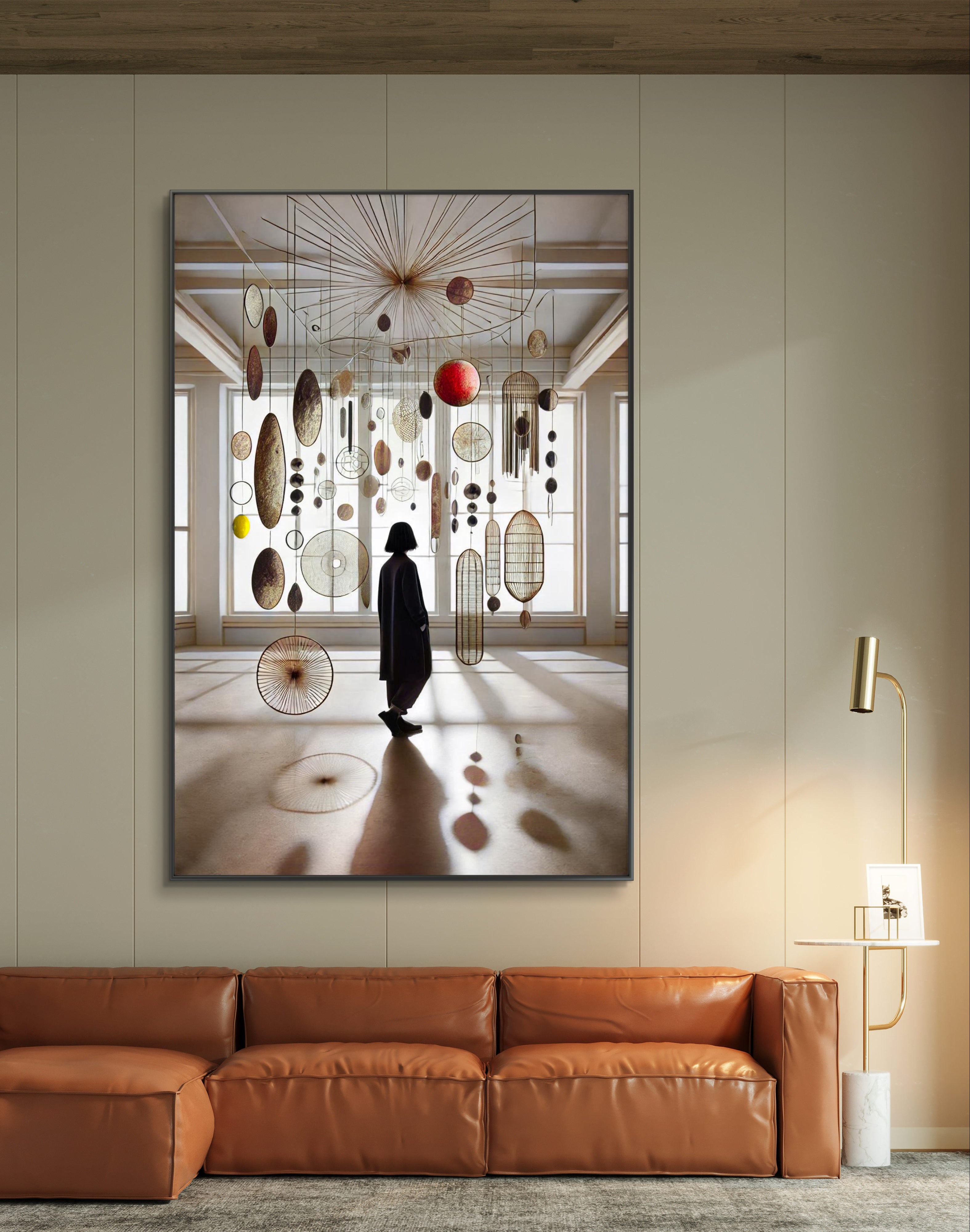 Illuminate your space with the thought-provoking art print Geometry, an abstract wall art print that combines vintage charm with profound symbolism. This captivating image features a woman bathed in natural light, surrounded by the play of shadows and light from multiple abstract shapes hanging from a chandelier.