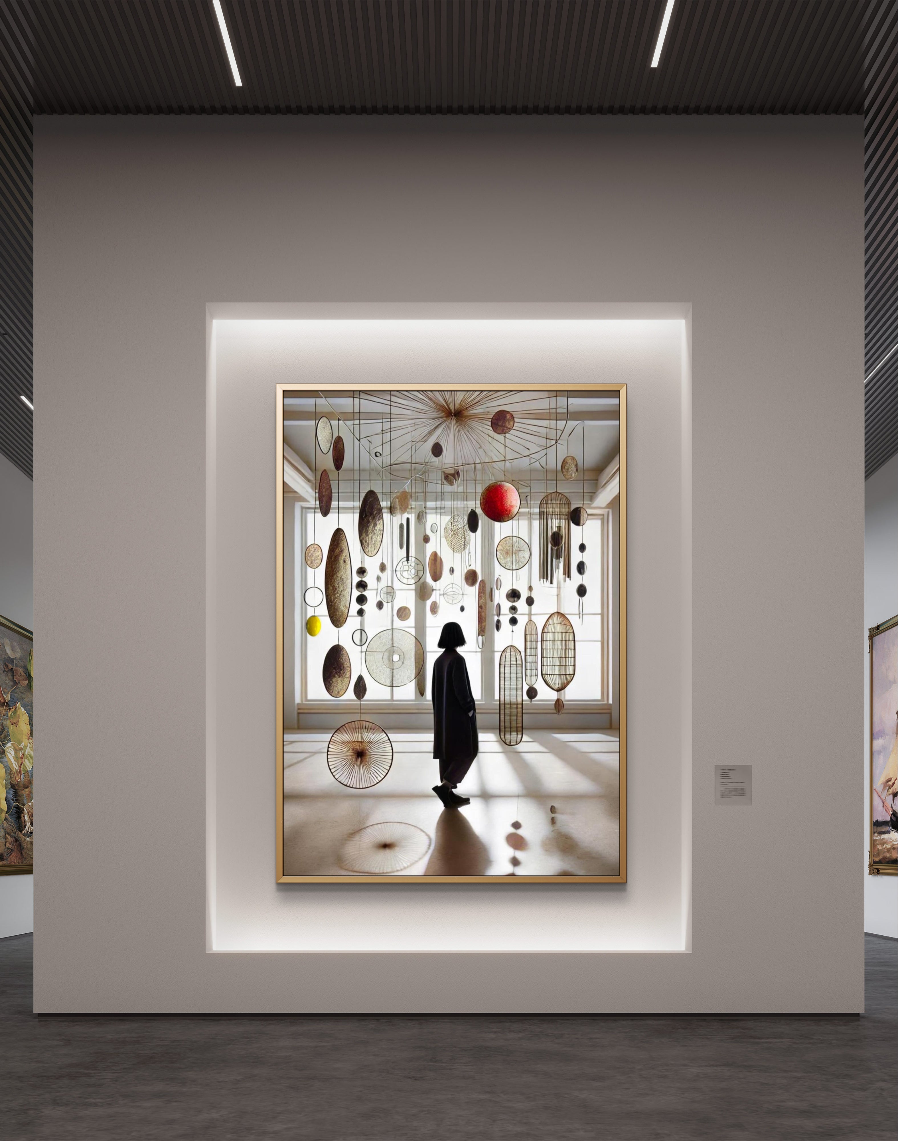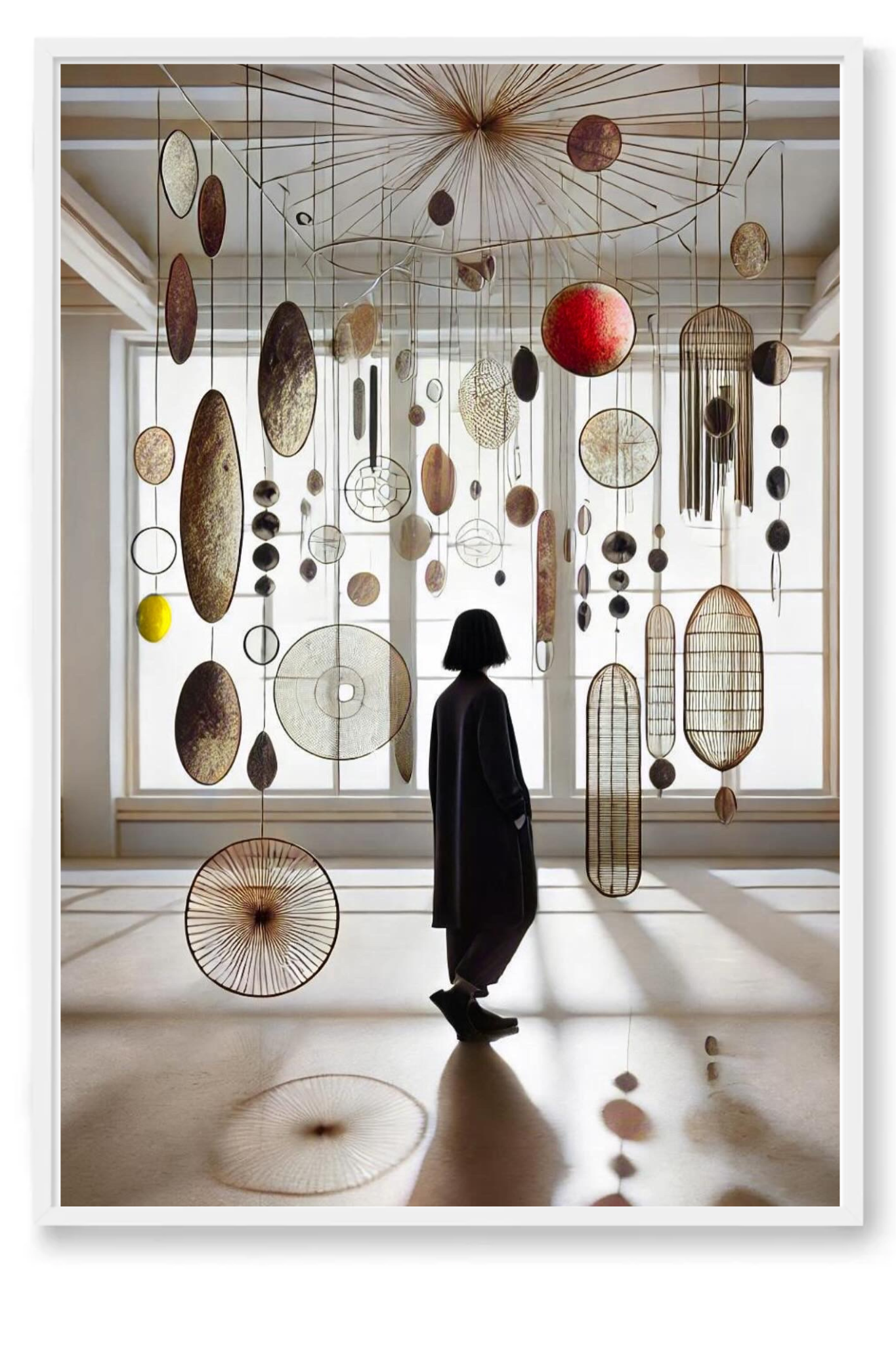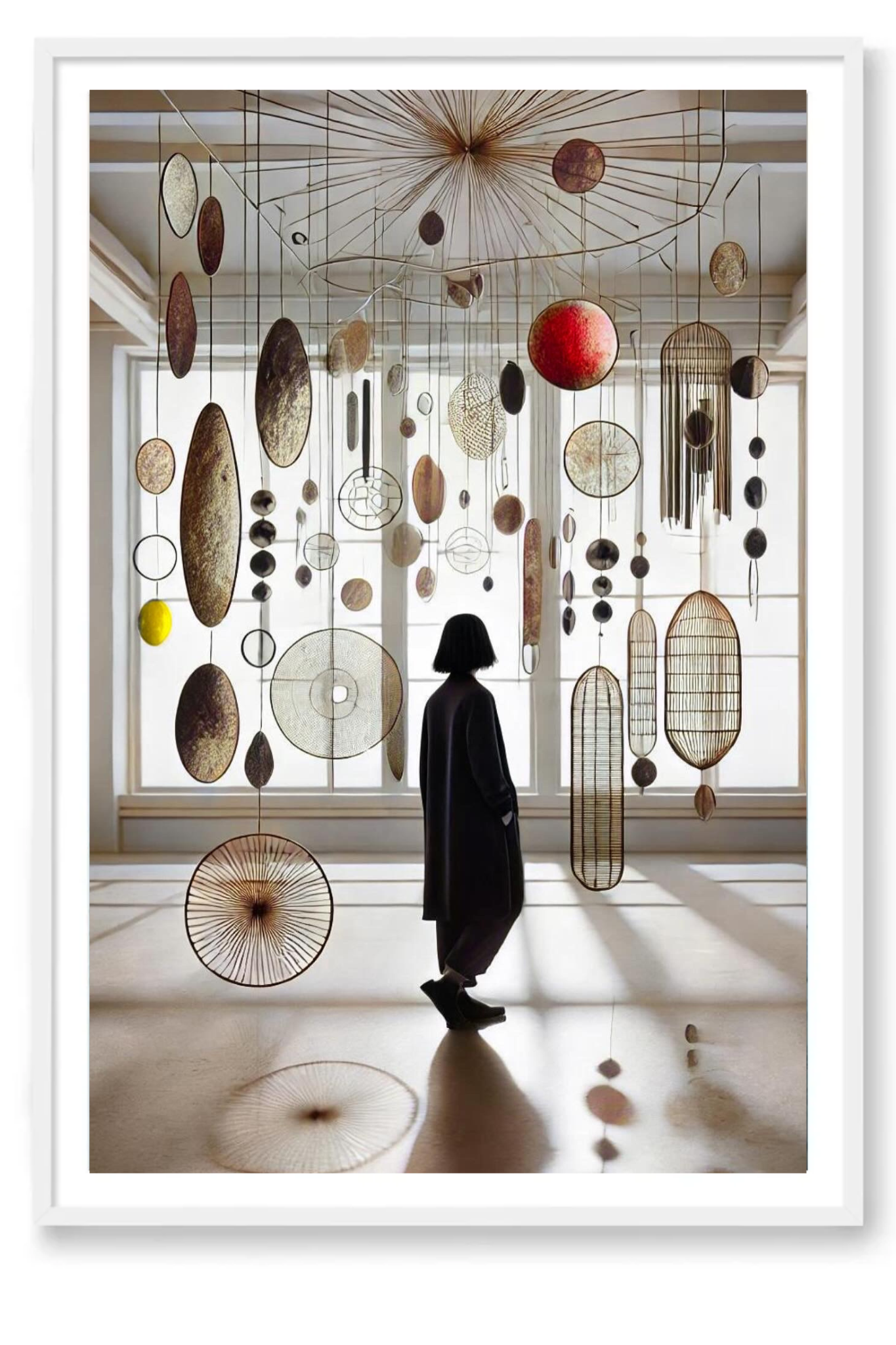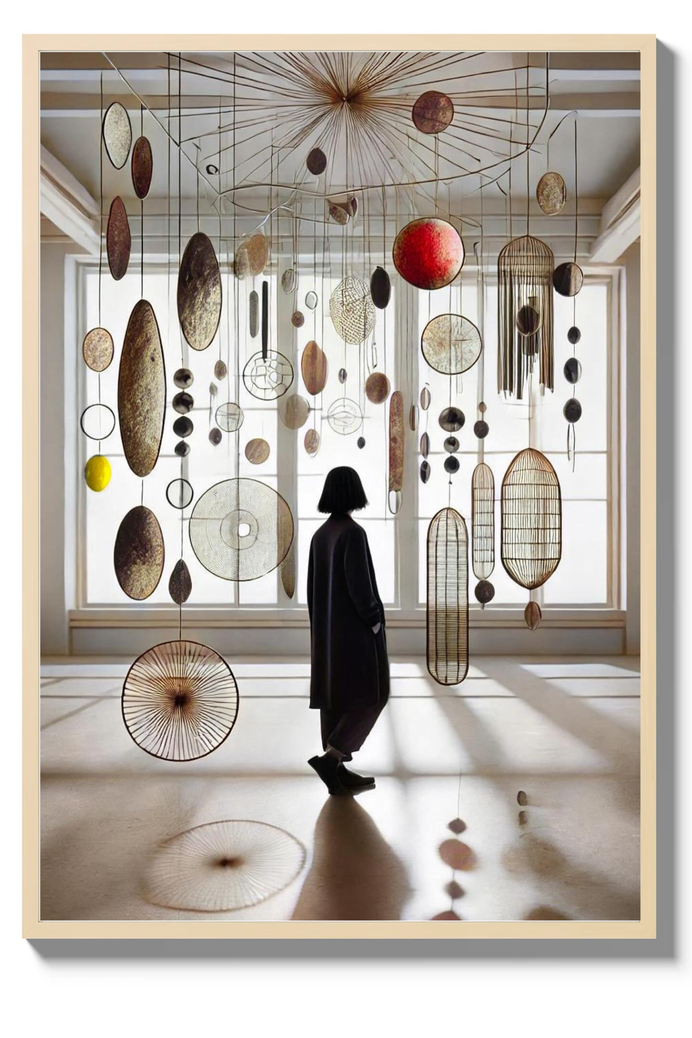 Illuminate your space with the thought-provoking art print Geometry, an abstract wall art print that combines vintage charm with profound symbolism. This captivating image features a woman bathed in natural light, surrounded by the play of shadows and light from multiple abstract shapes hanging from a chandelier.