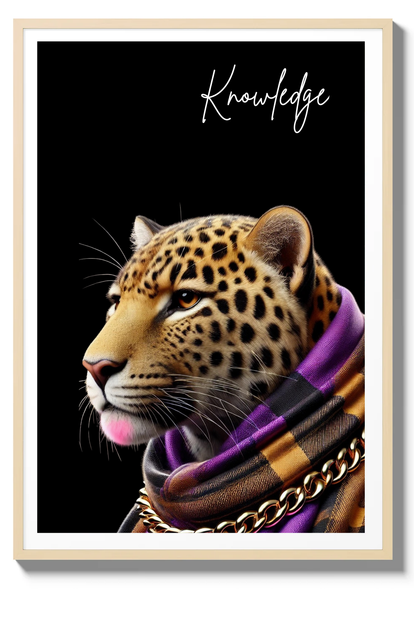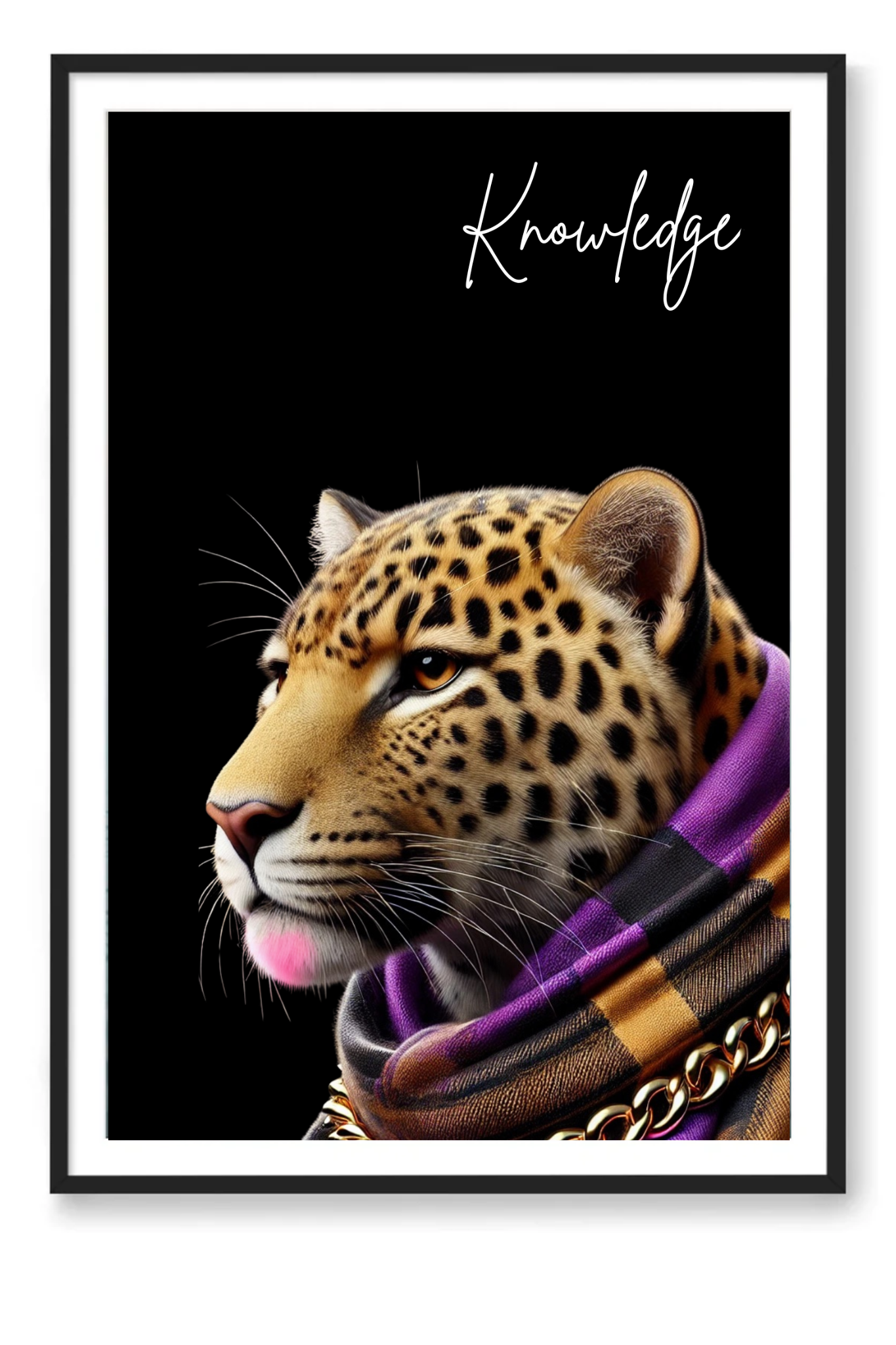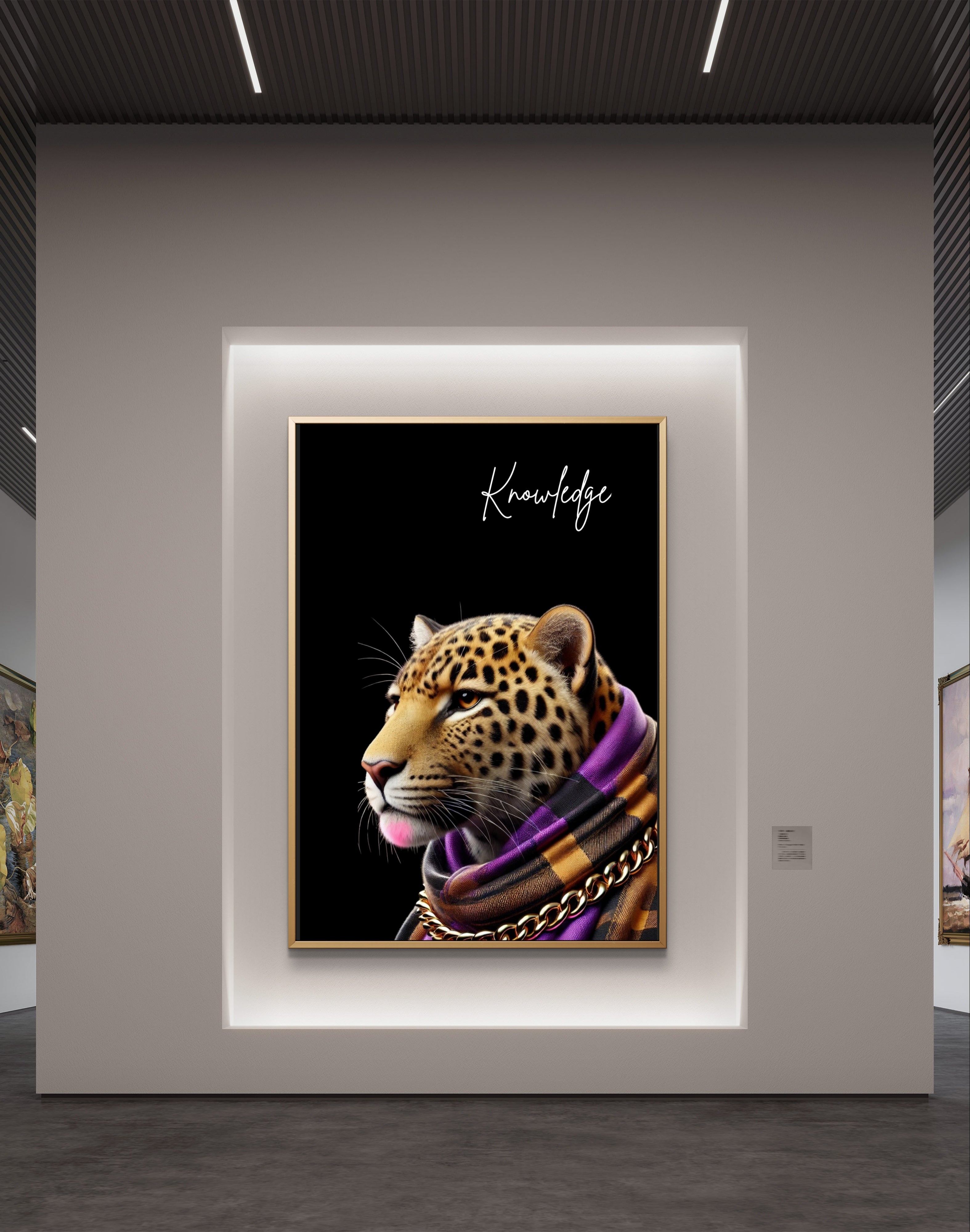 This striking fine art photograph "Knowledge" captures a regal tiger adorned in a sumptuous purple shawl and a gleaming gold chain, set against a deep black background. The tiger’s intense gaze and luxurious attire are a powerful symbol of wisdom, strength, and the protective nature of knowledge.