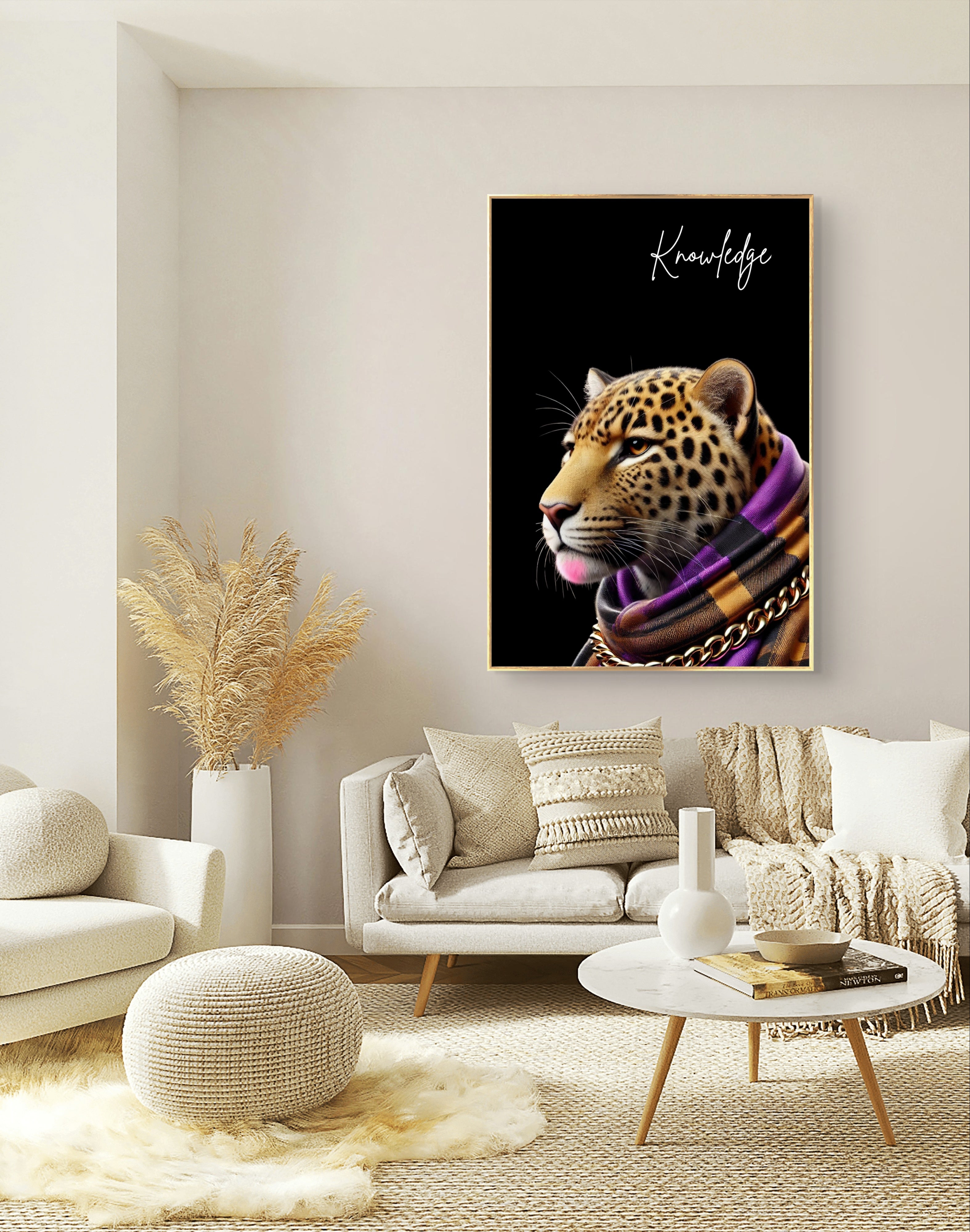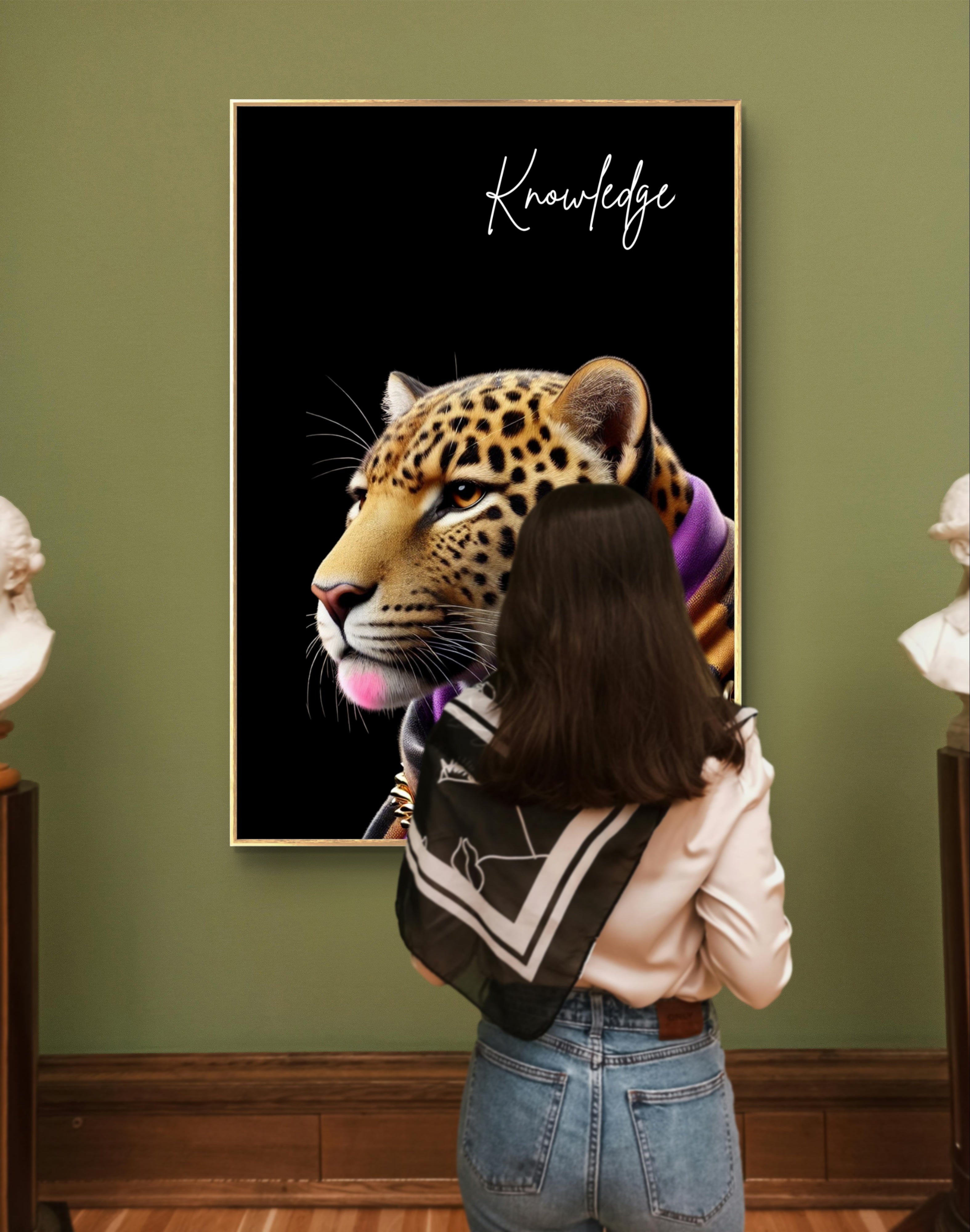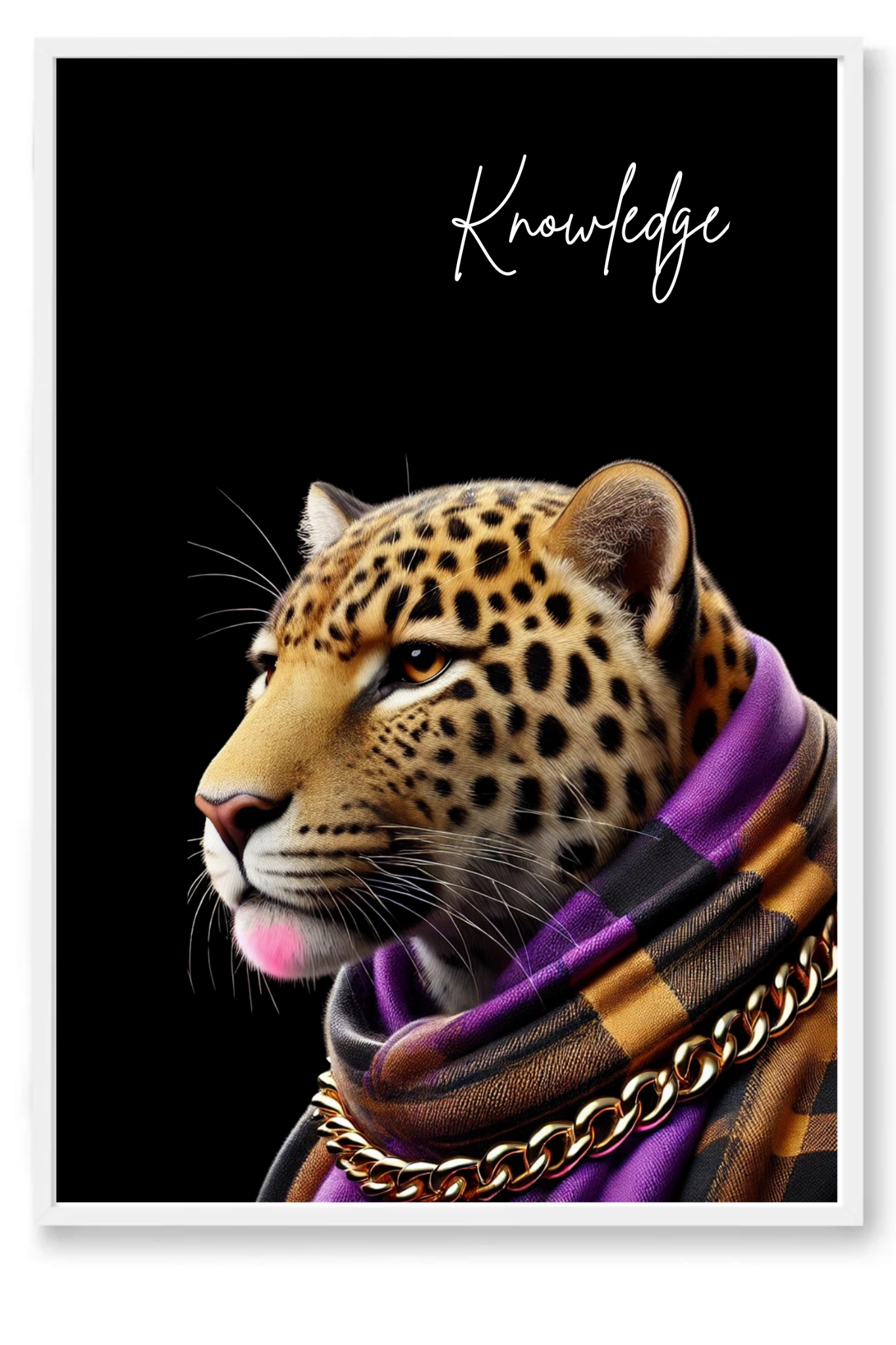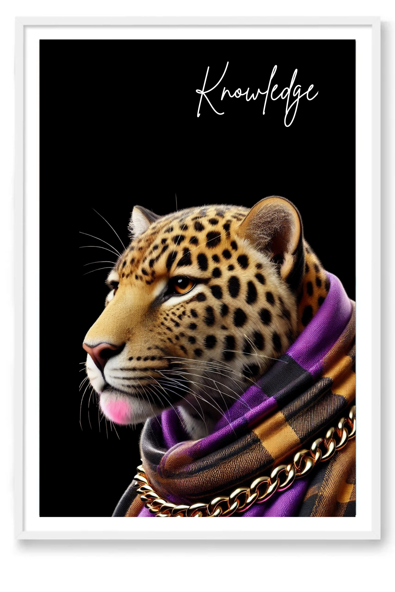 This striking fine art photograph "Knowledge" captures a regal tiger adorned in a sumptuous purple shawl and a gleaming gold chain, set against a deep black background. The tiger’s intense gaze and luxurious attire are a powerful symbol of wisdom, strength, and the protective nature of knowledge.
