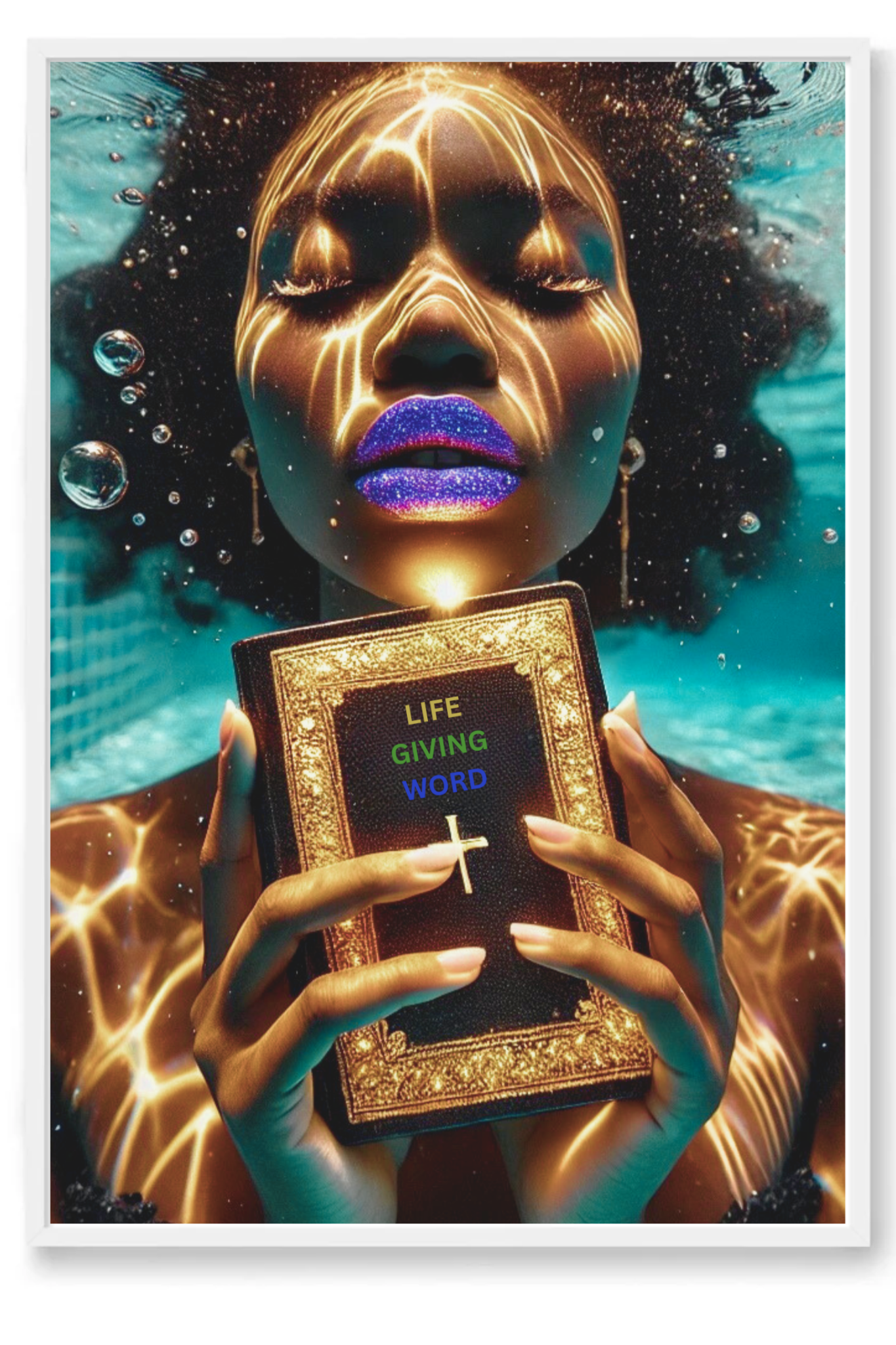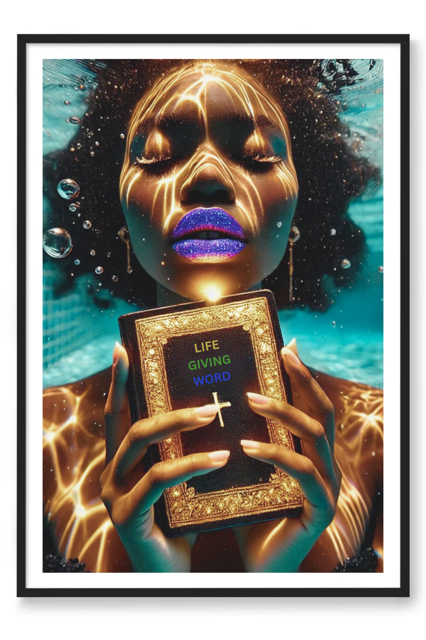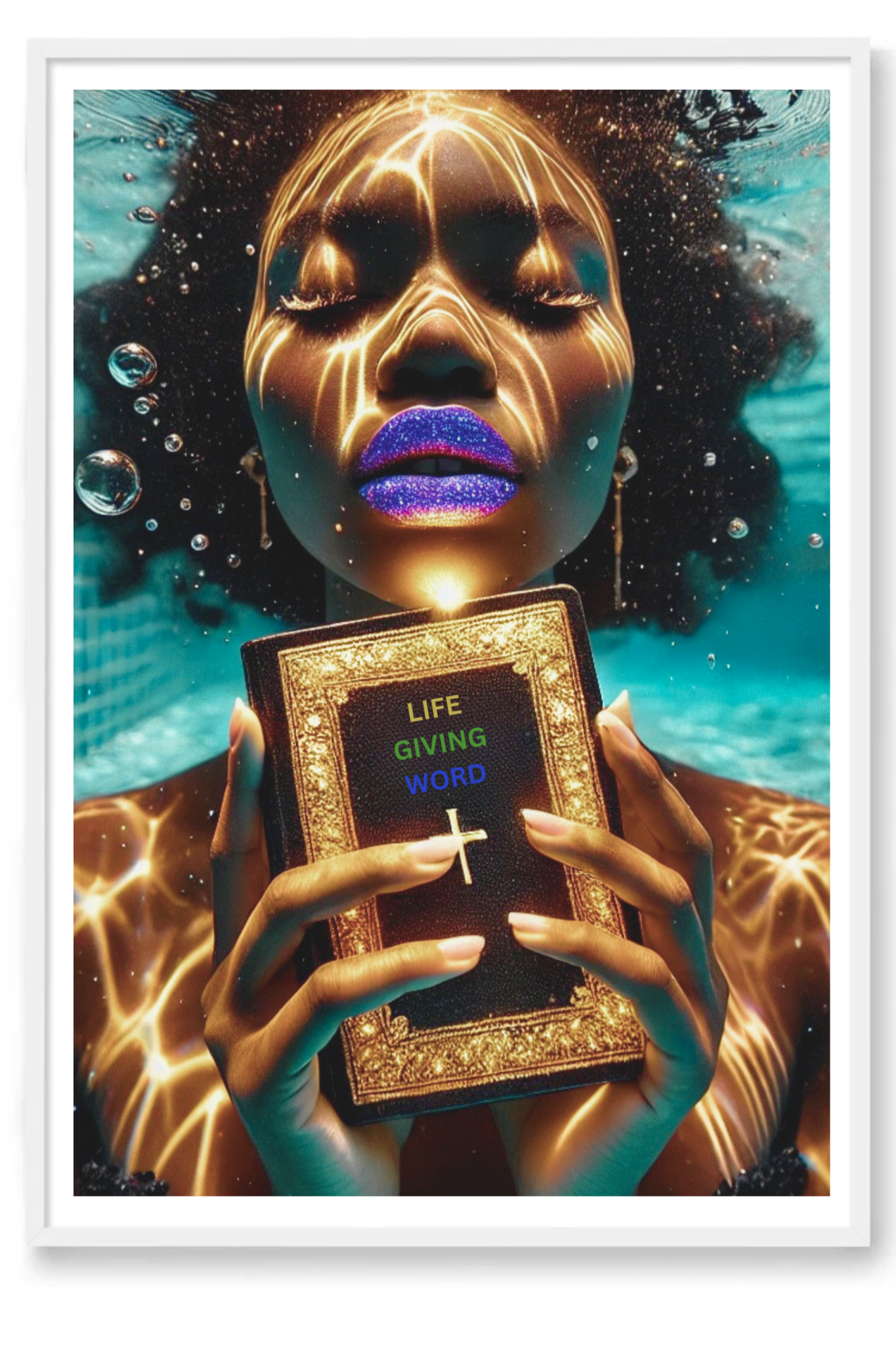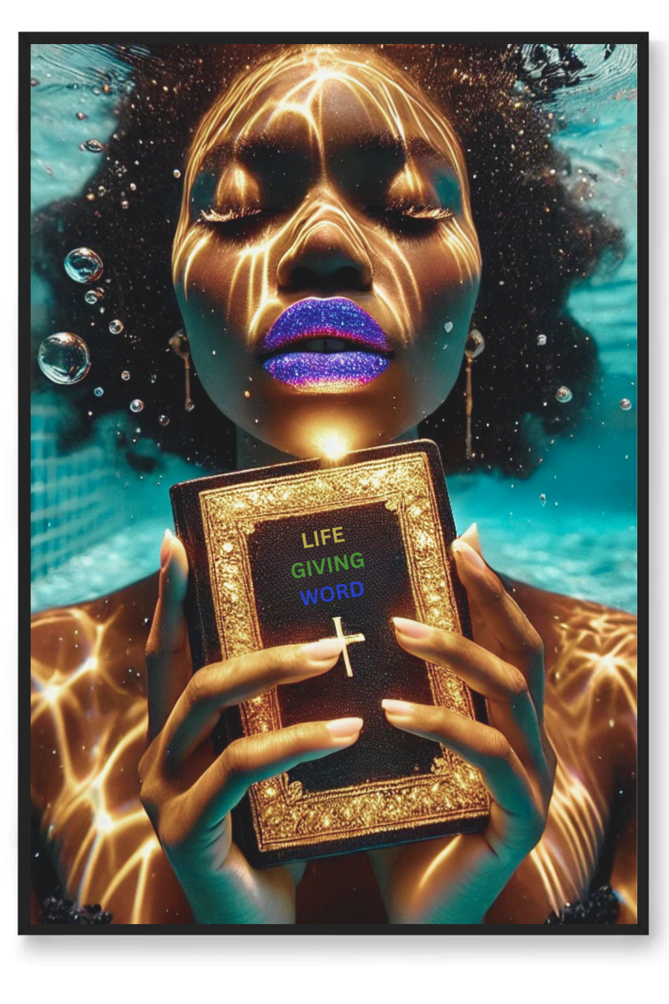Transform your space into a sanctuary of peace and spiritual reflection with Meditate, a stunning art print that beautifully encapsulates the essence of divine contemplation. This evocative image portrays a serene woman gracefully submerged in water, her eyes gently closed as she cradles a miniature Bible bathed in a radiant, life-giving glow.
