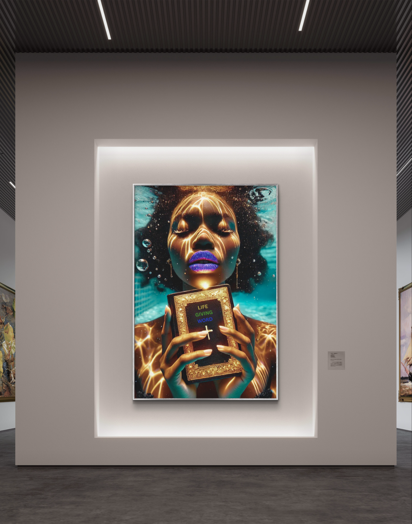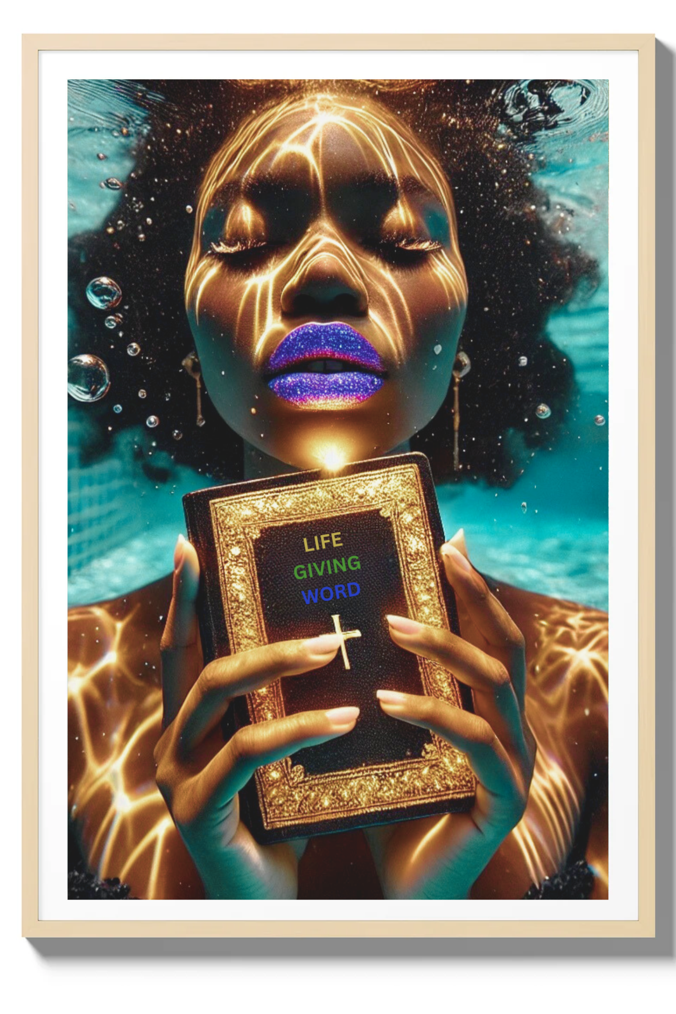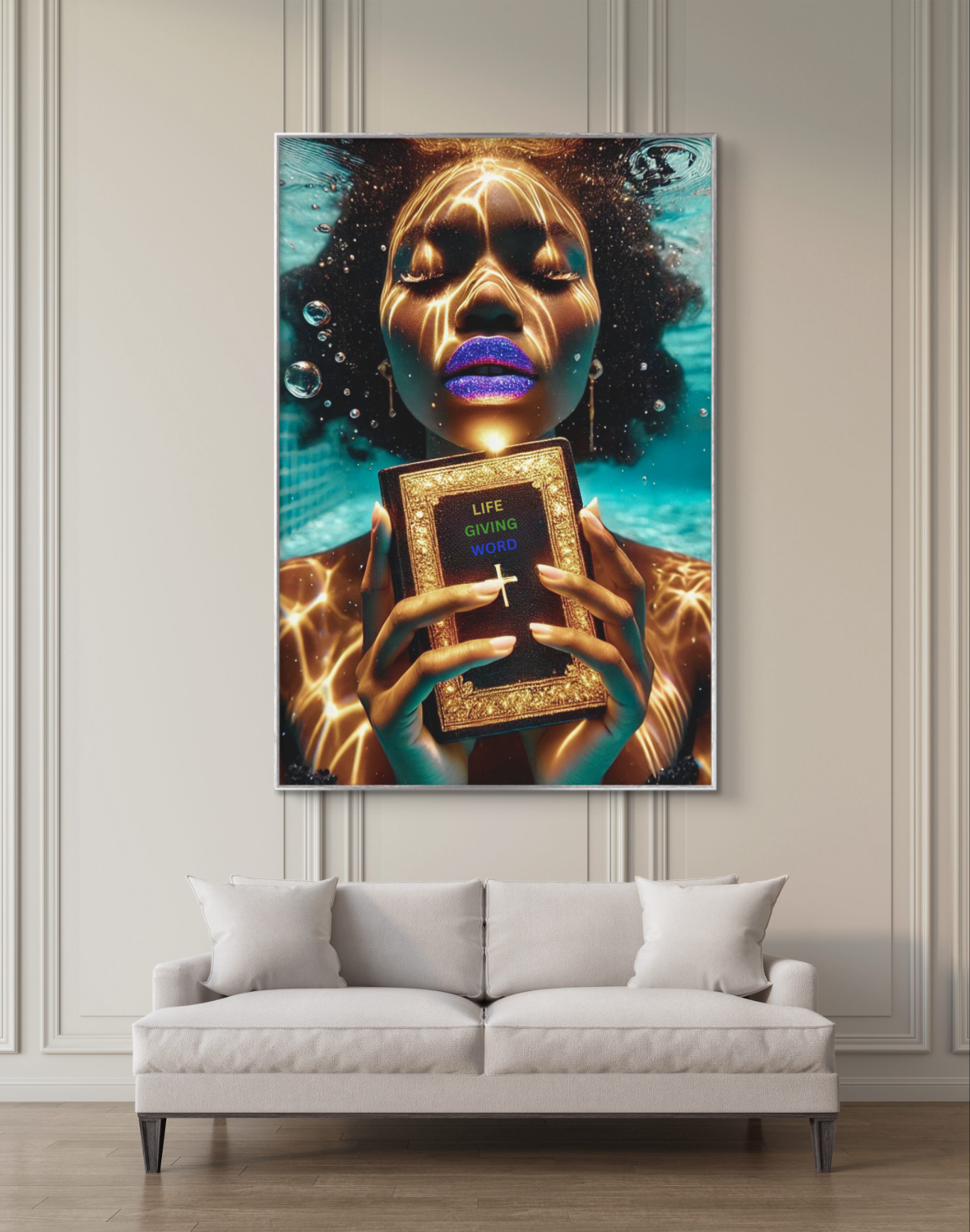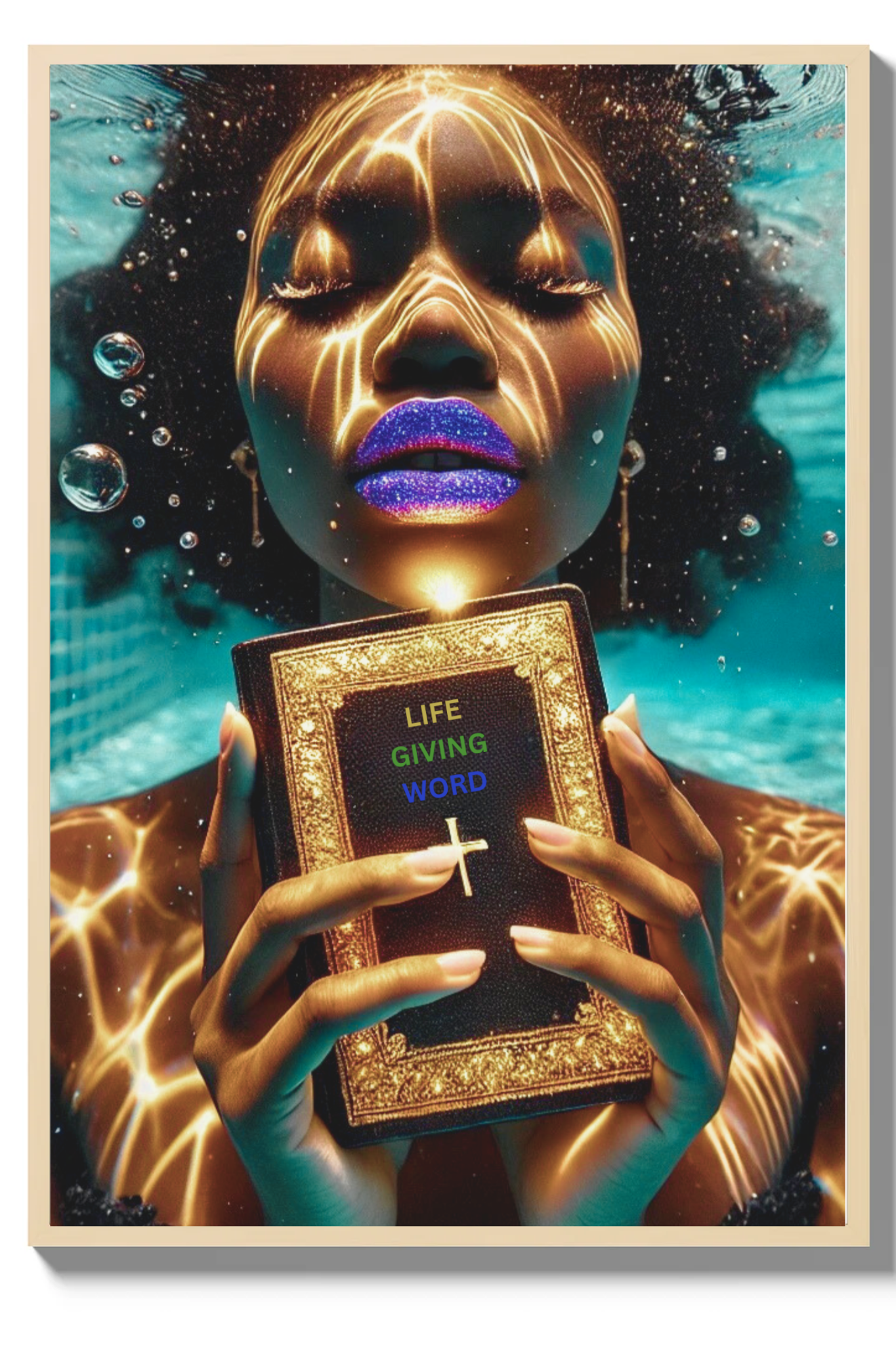 Transform your space into a sanctuary of peace and spiritual reflection with Meditate, a stunning art print that beautifully encapsulates the essence of divine contemplation. This evocative image portrays a serene woman gracefully submerged in water, her eyes gently closed as she cradles a miniature Bible bathed in a radiant, life-giving glow.