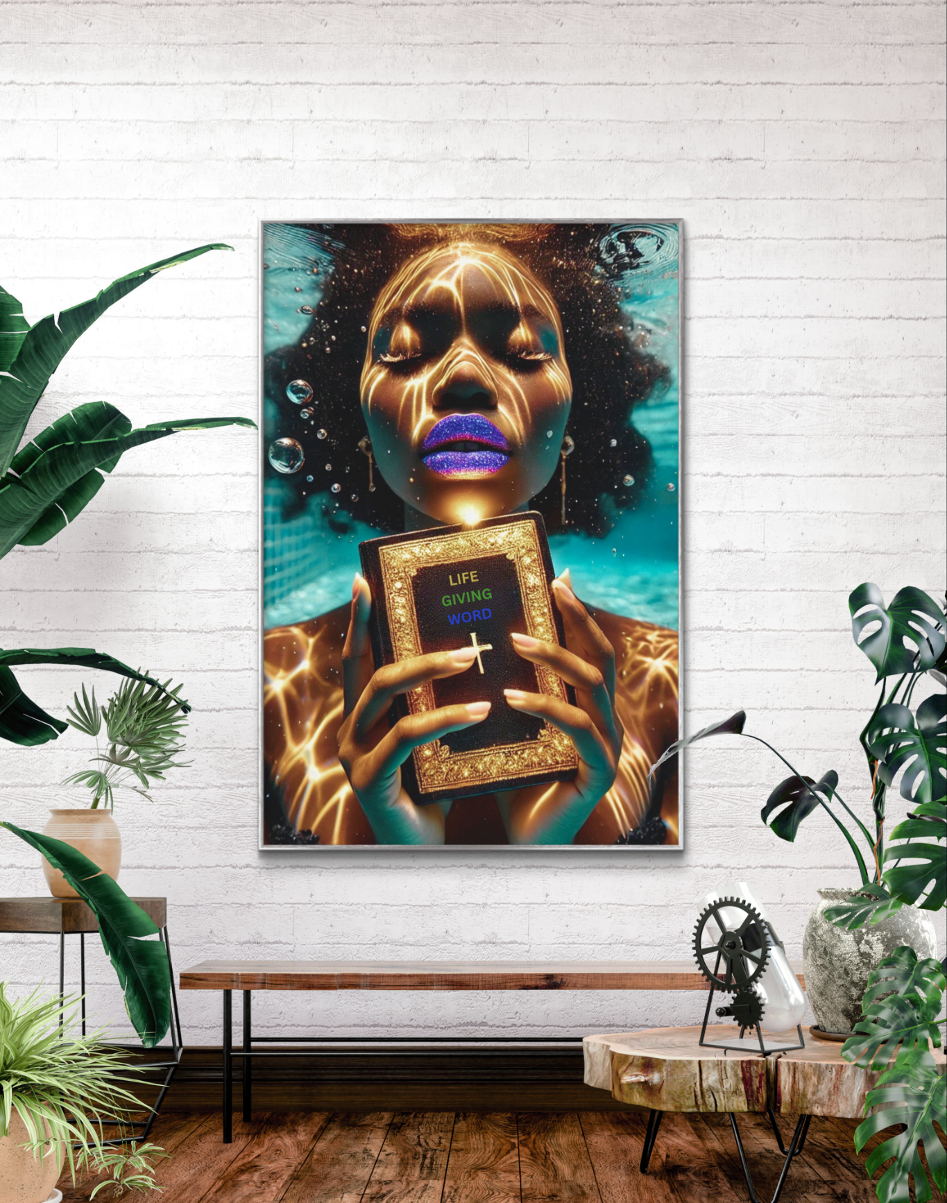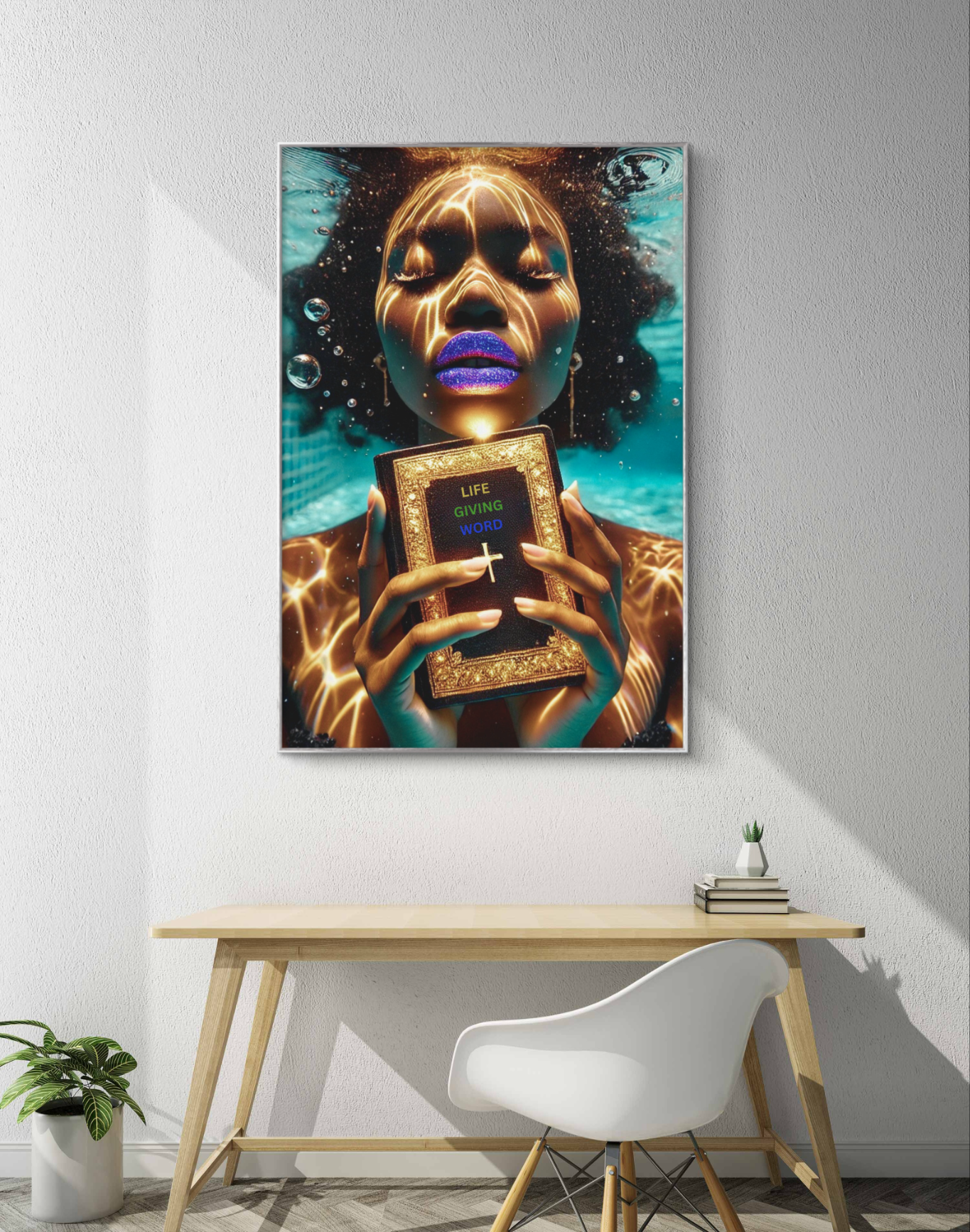This piece is more than a beautiful visual; it’s an invitation to embrace spiritual reflection and the nourishing power of faith. Perfect for any space seeking a touch of elegance and spiritual depth, this art print serves as a daily reminder of the importance of immersing oneself in the Word and the Holy Spirit.