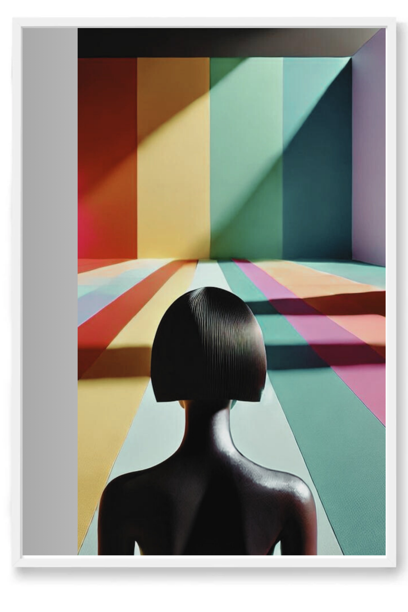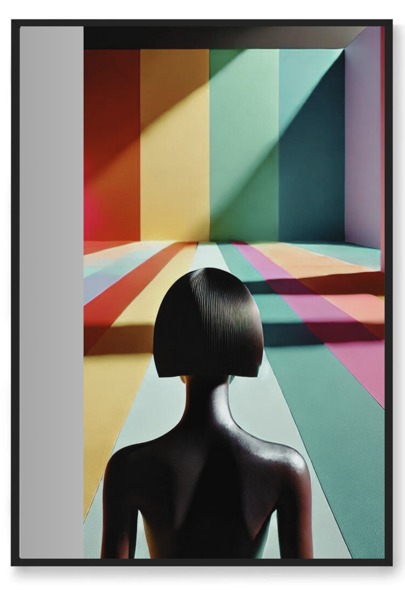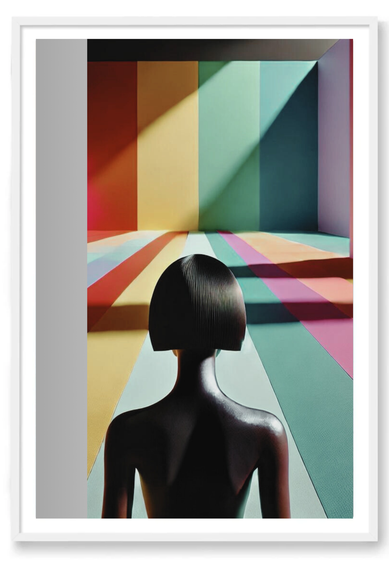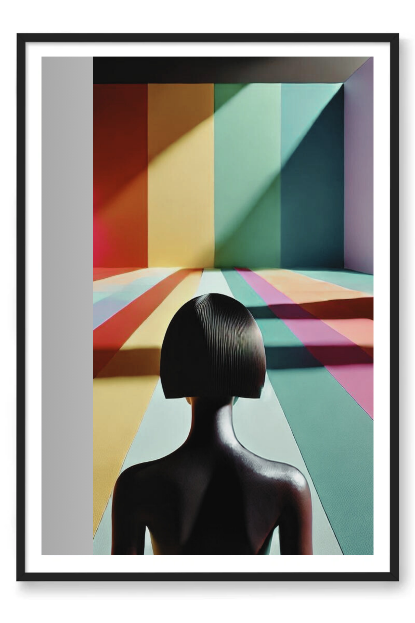 Step into a world of vibrant intrigue with Middle Lane, a captivating art print that blends color, mystery, and elegance. This striking photograph features a woman with a chic bob cut, poised confidently in the center of a colorful maze. Her presence in the middle lane is accentuated by a shimmering line of silver that cascades down her back, adding a touch of luminous sophistication.