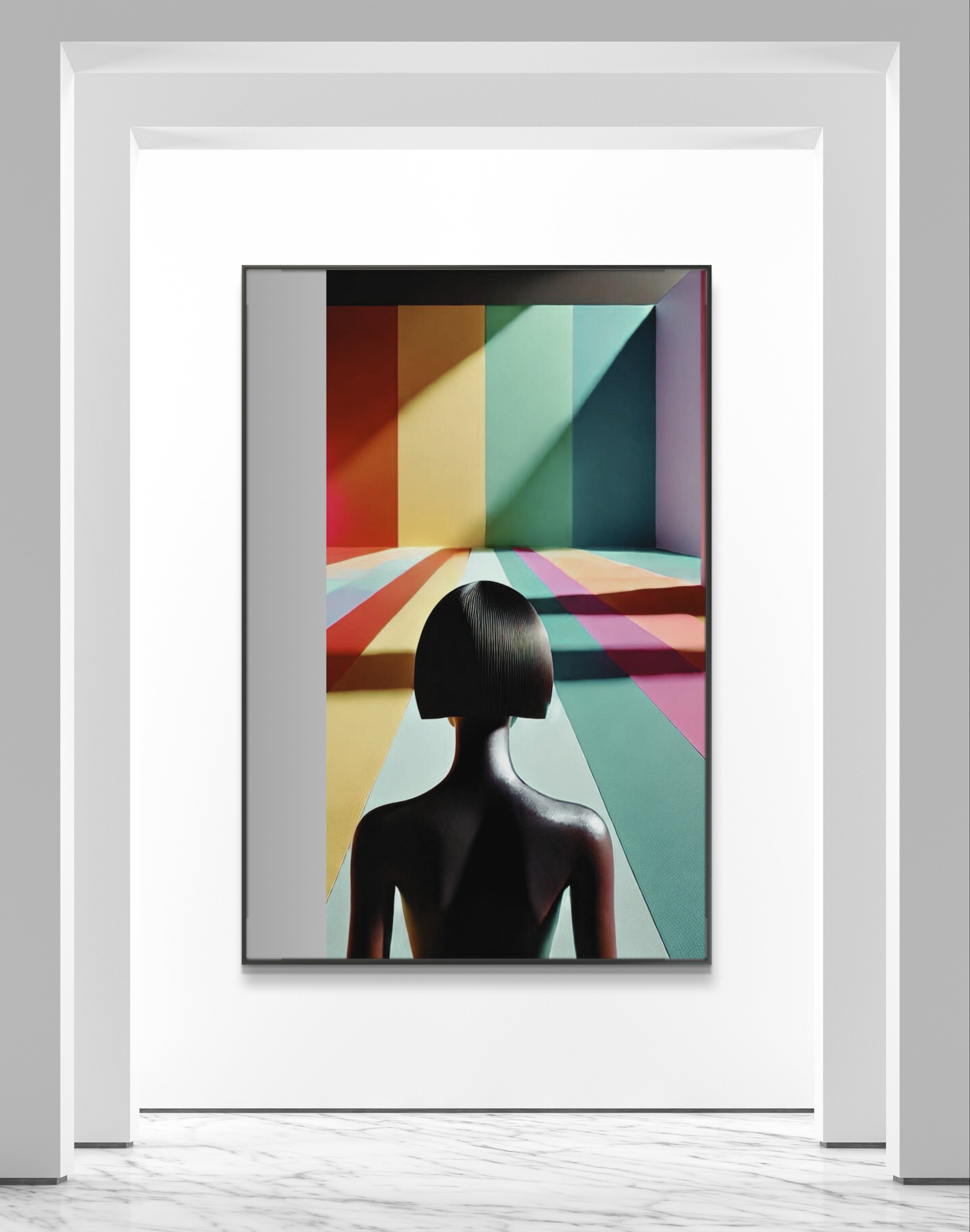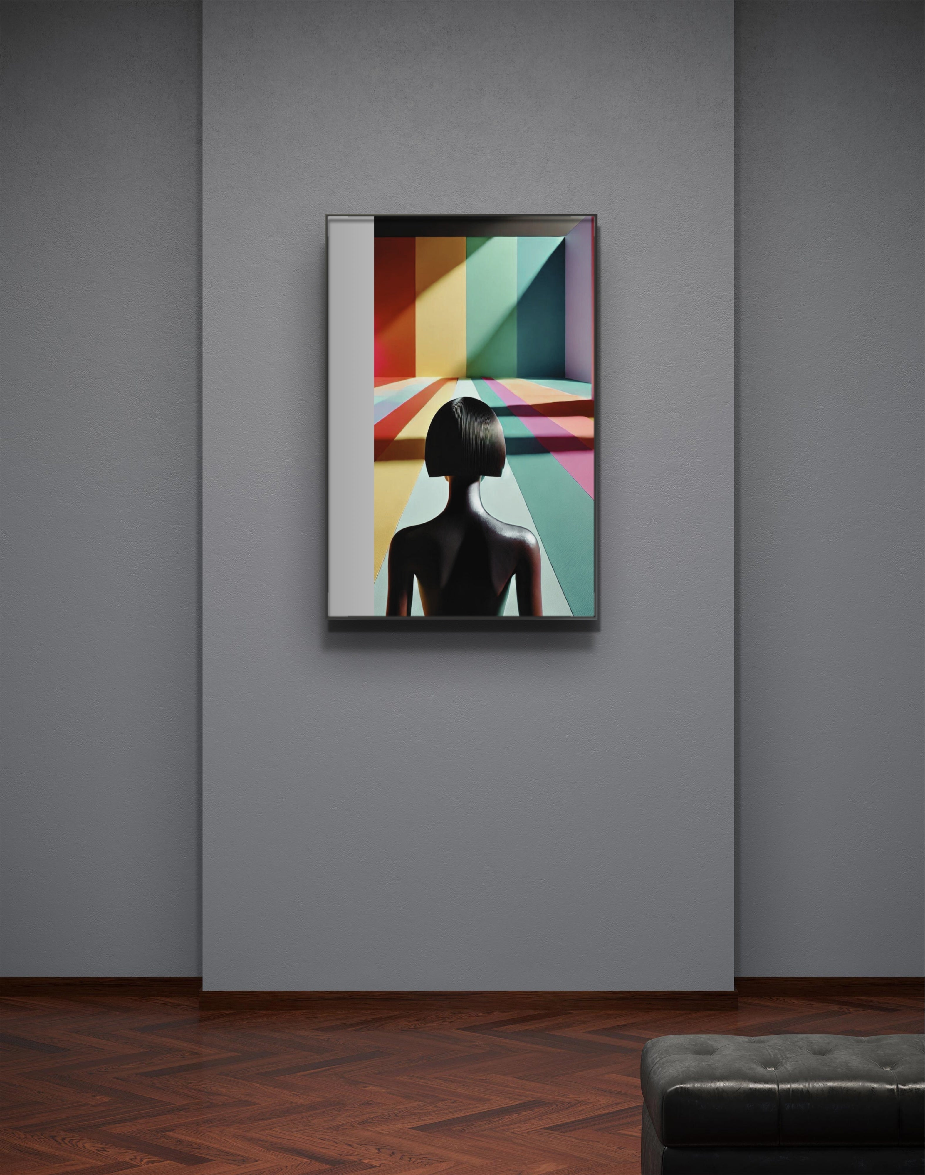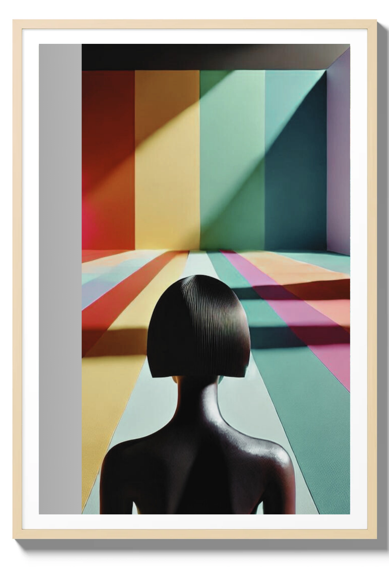Step into a world of vibrant intrigue with Middle Lane, a captivating art print that blends color, mystery, and elegance. This striking photograph features a woman with a chic bob cut, poised confidently in the center of a colorful maze. Her presence in the middle lane is accentuated by a shimmering line of silver that cascades down her back, adding a touch of luminous sophistication.