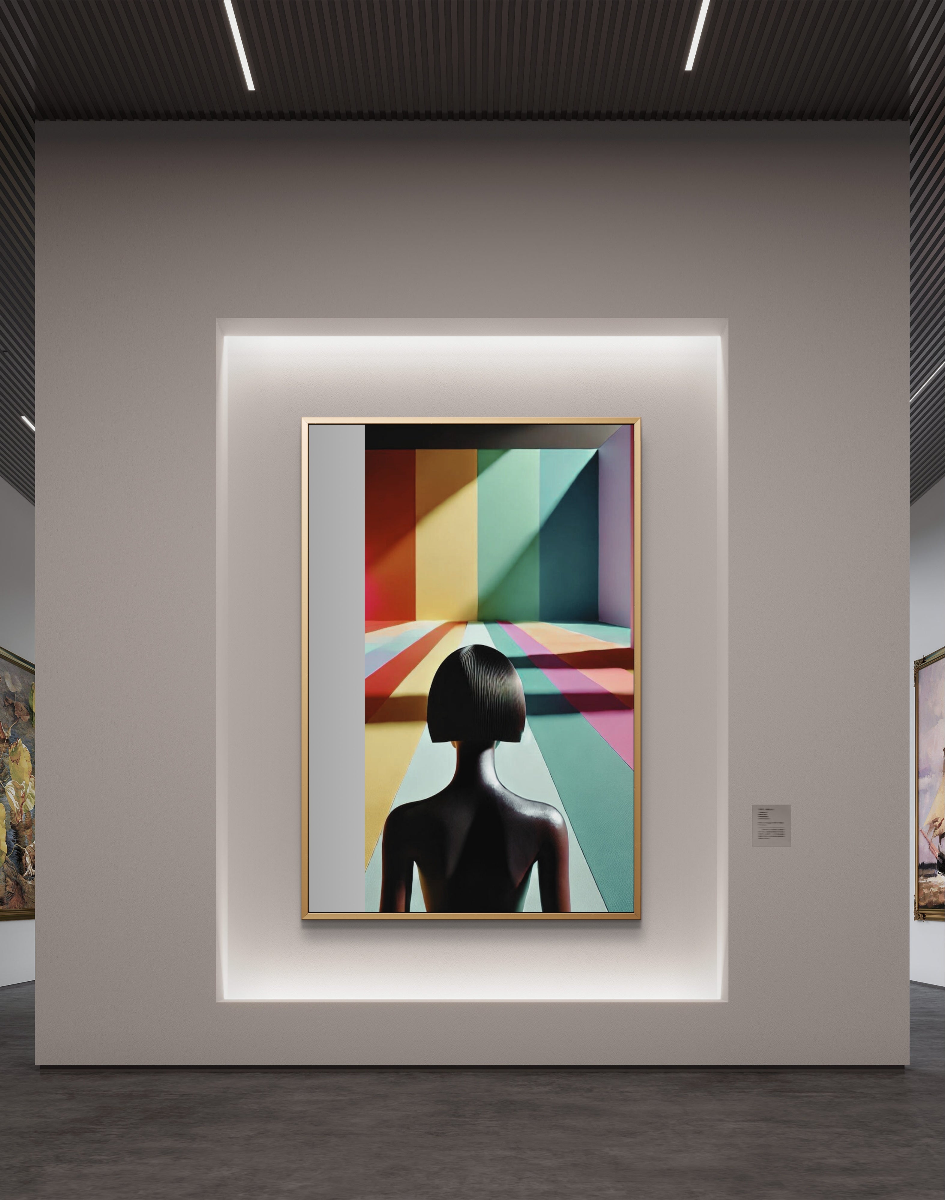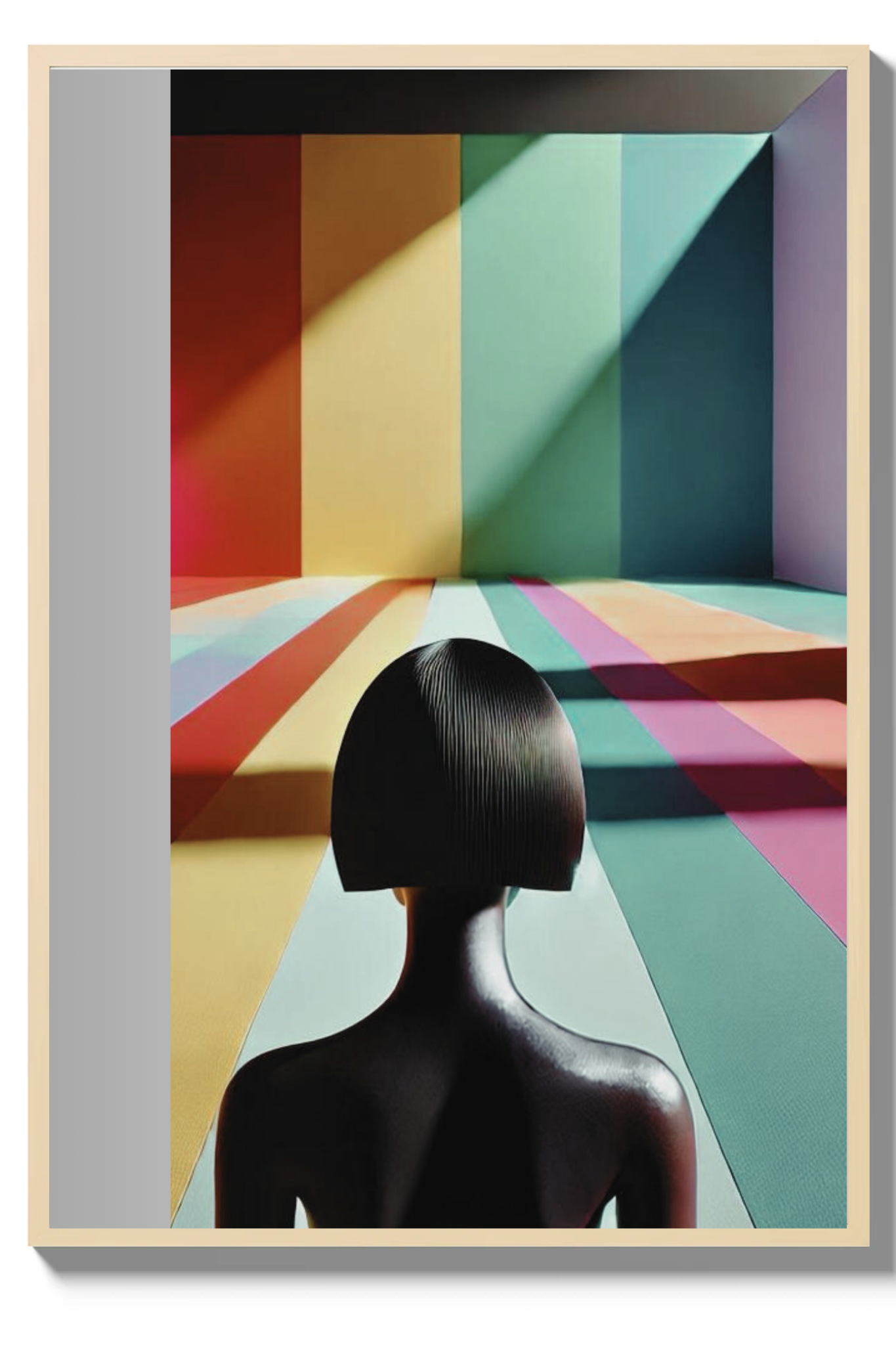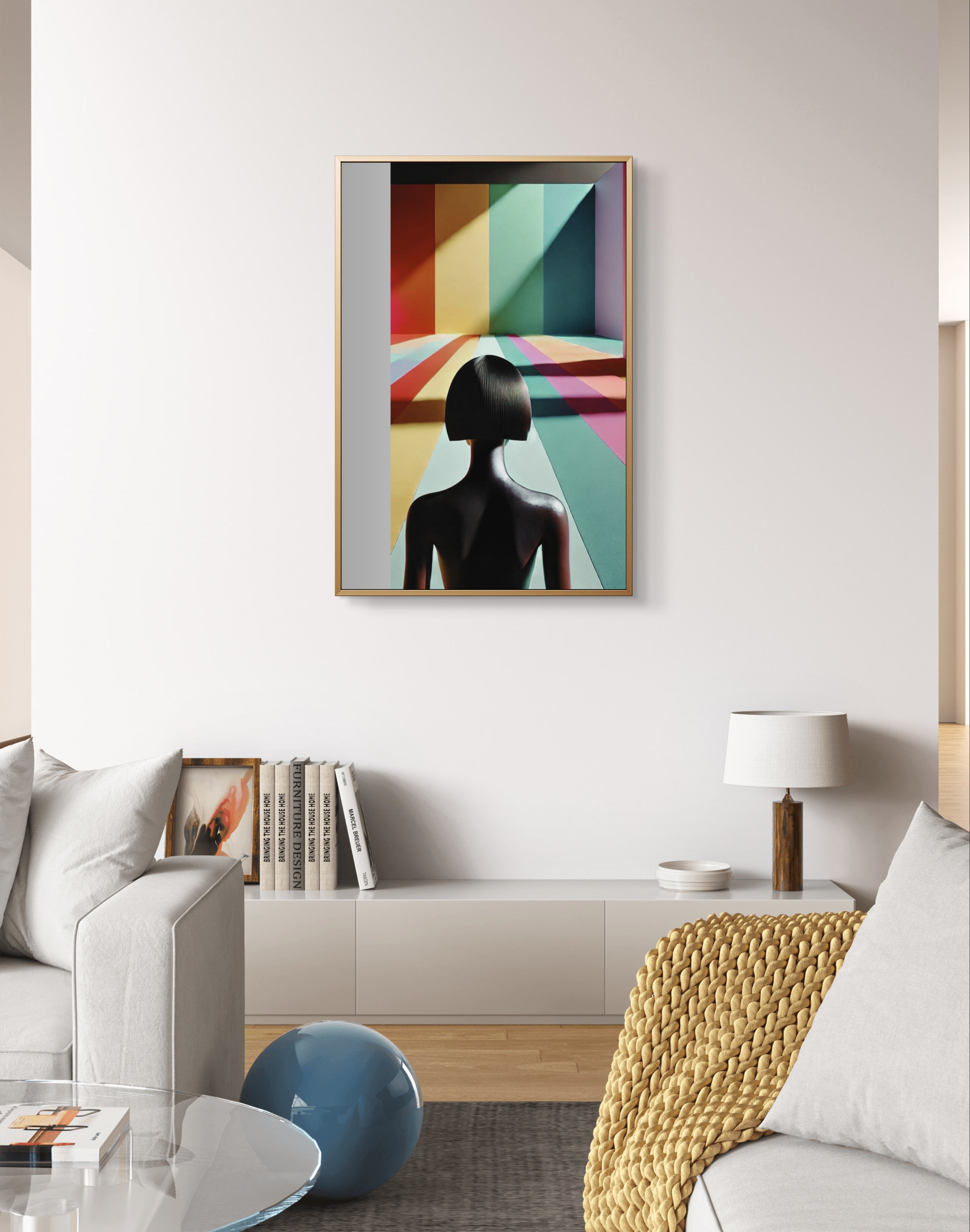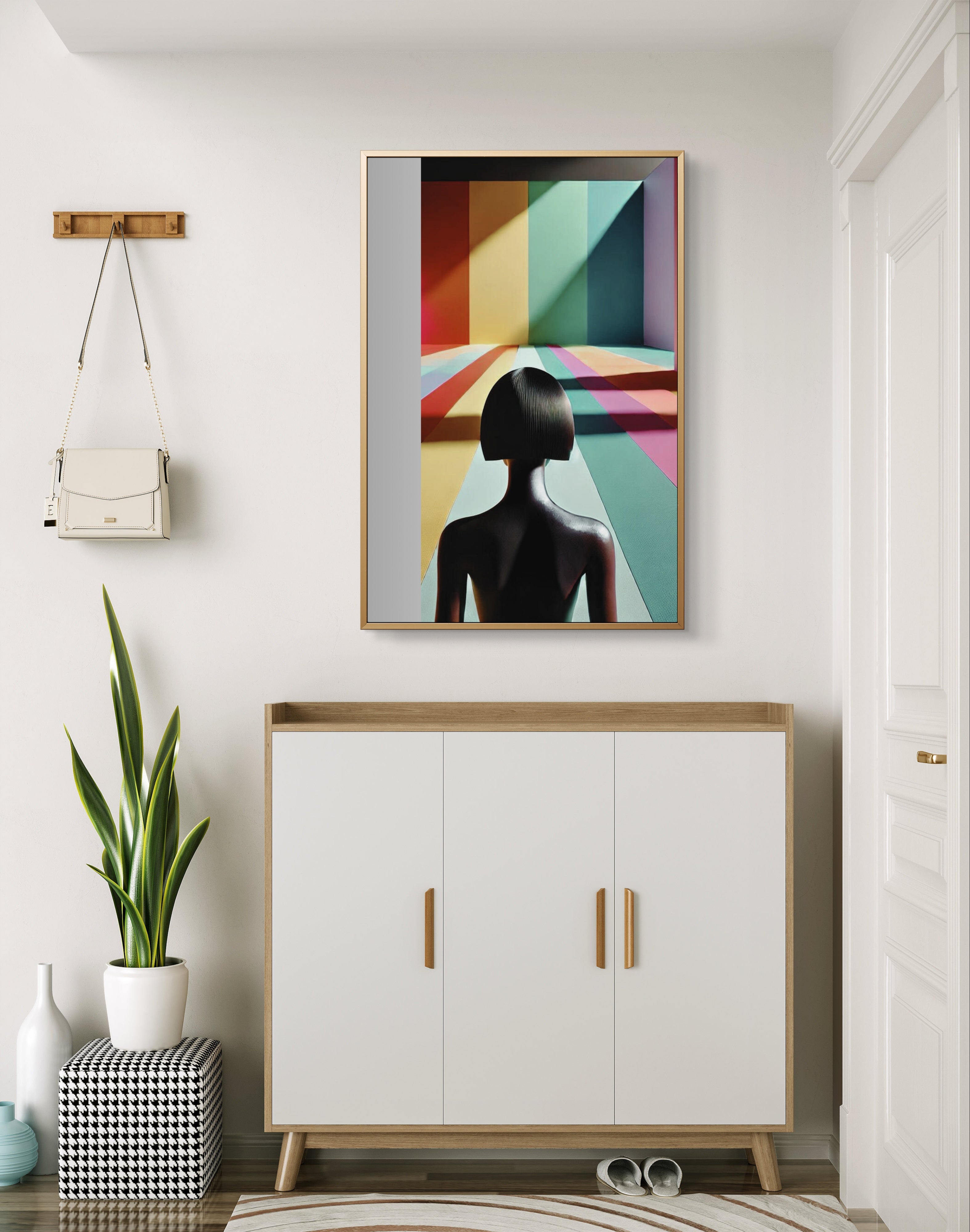 Step into a world of vibrant intrigue with Middle Lane, a captivating art print that blends color, mystery, and elegance. This striking photograph features a woman with a chic bob cut, poised confidently in the center of a colorful maze. Her presence in the middle lane is accentuated by a shimmering line of silver that cascades down her back, adding a touch of luminous sophistication.