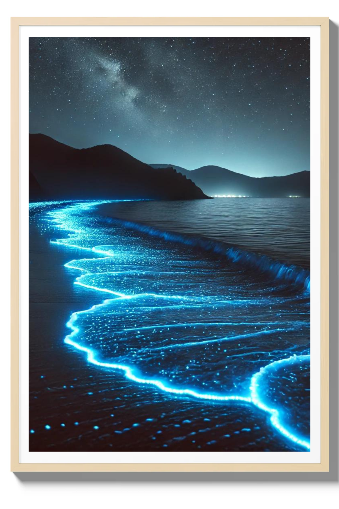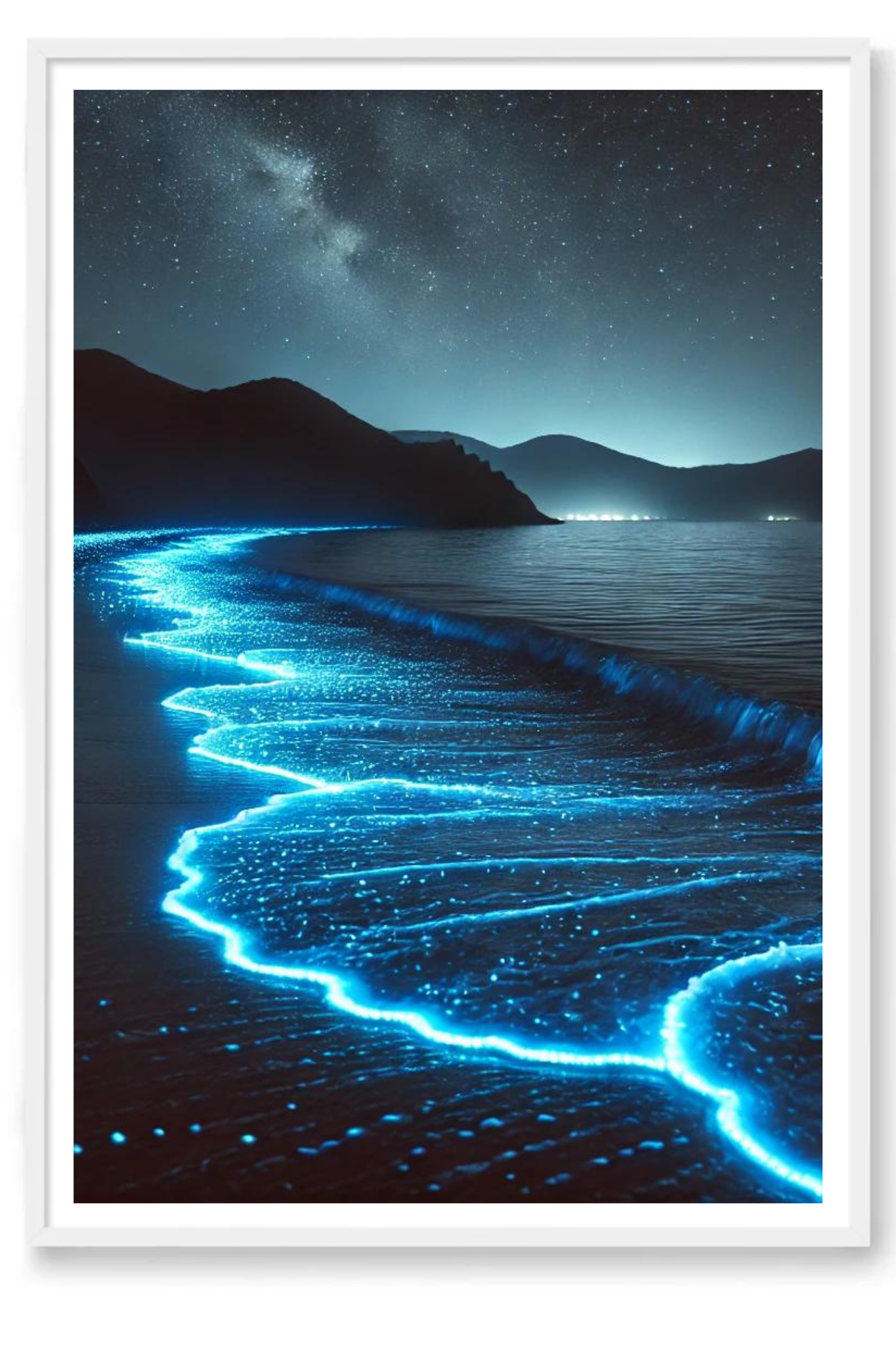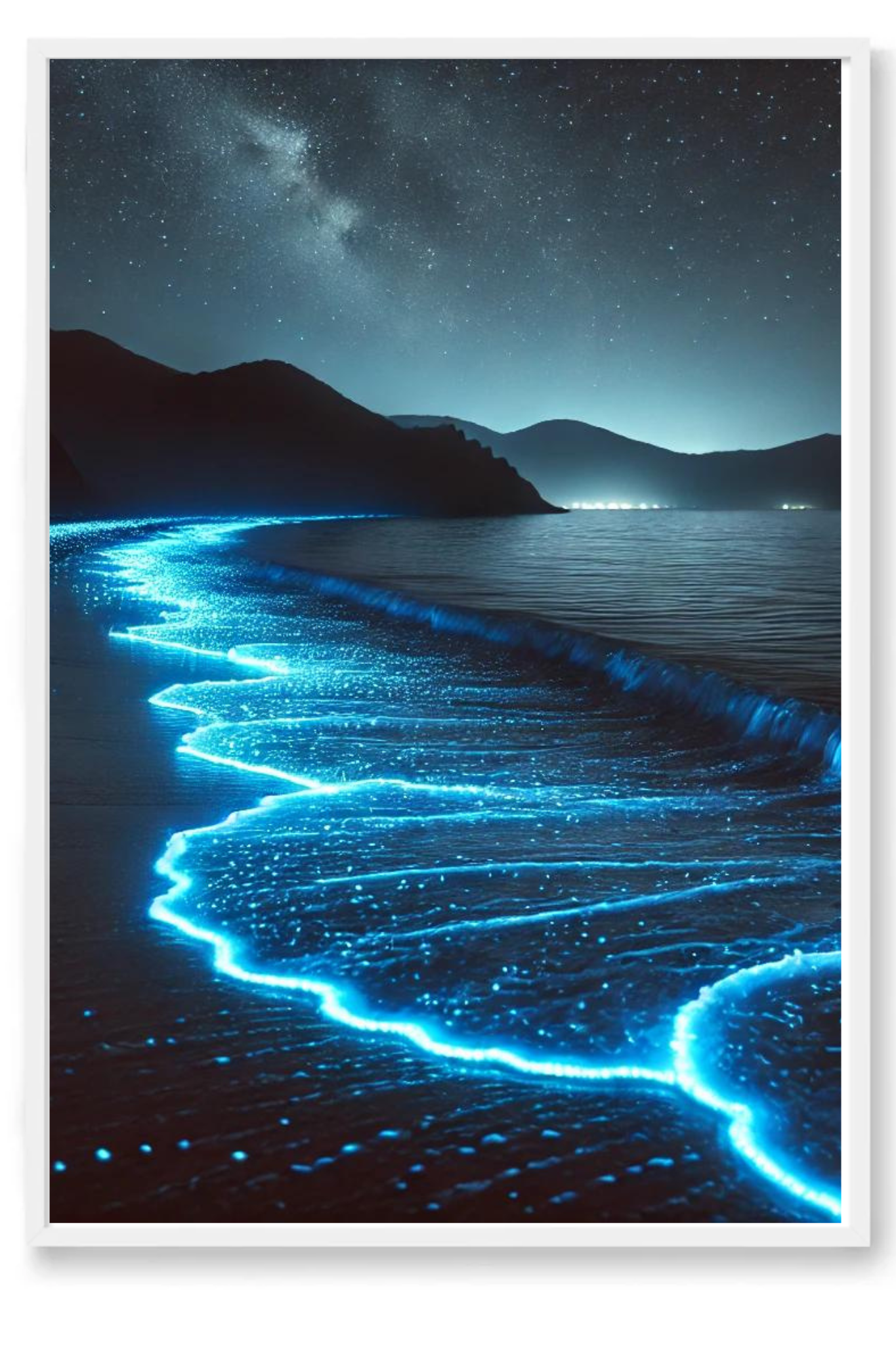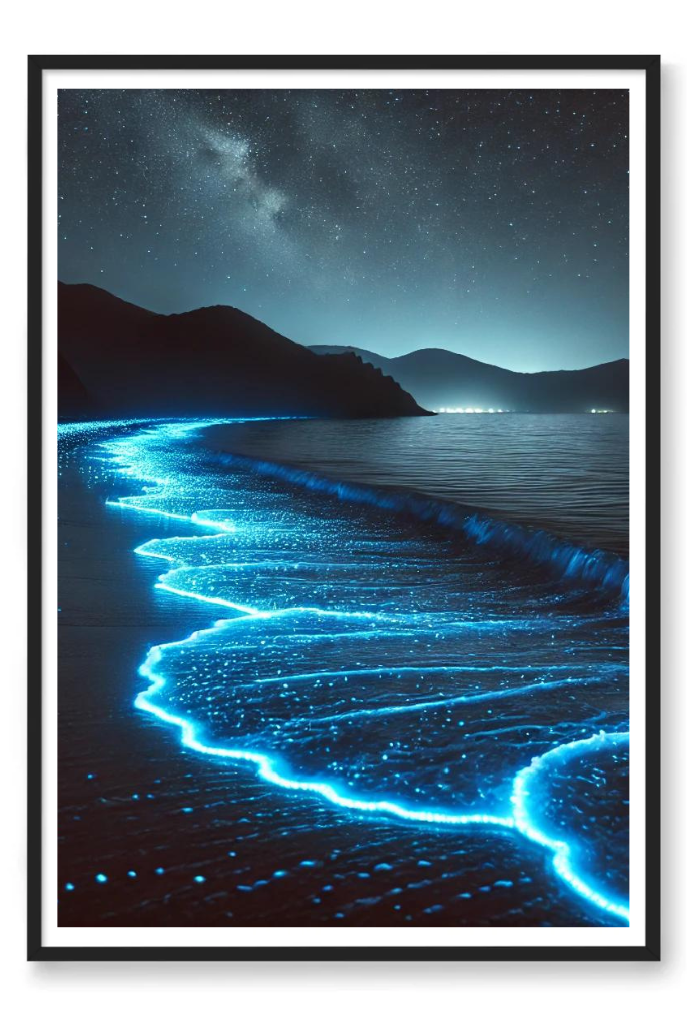 Transport yourself to a realm of nocturnal enchantment with Midnight Dream, a mesmerizing art print that captures the serene beauty of a glowing blue beach under a starlit sky. This captivating photograph showcases a tranquil nighttime scene where the waves are gently illuminated, casting a soft, magical glow across the water.