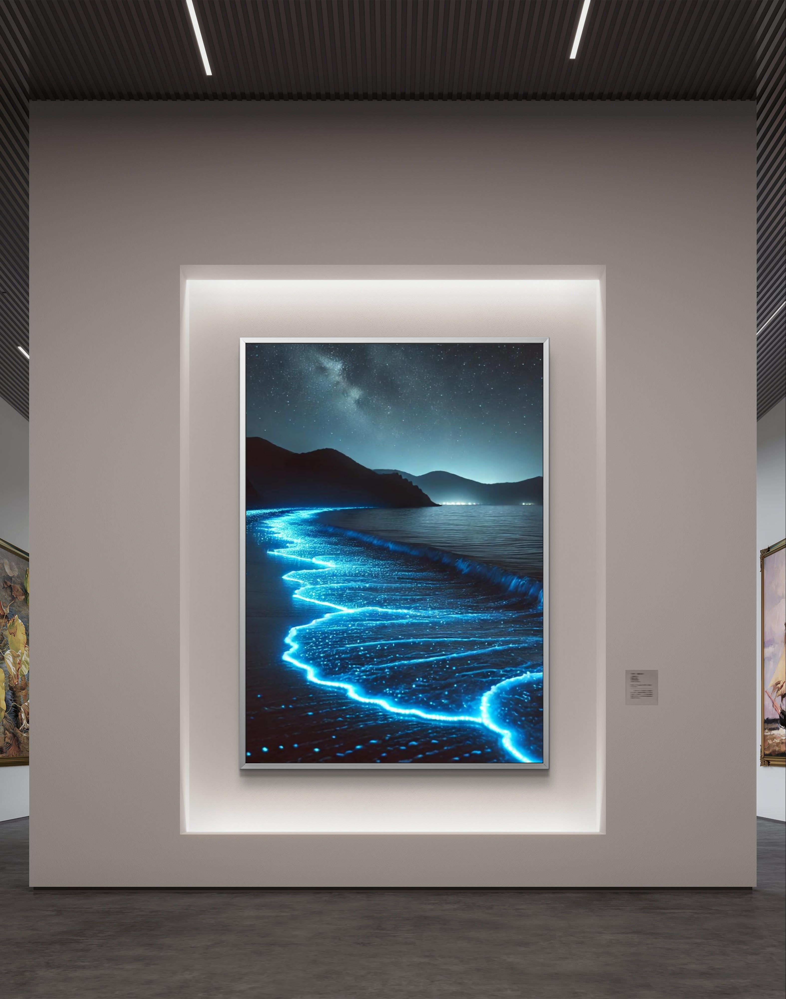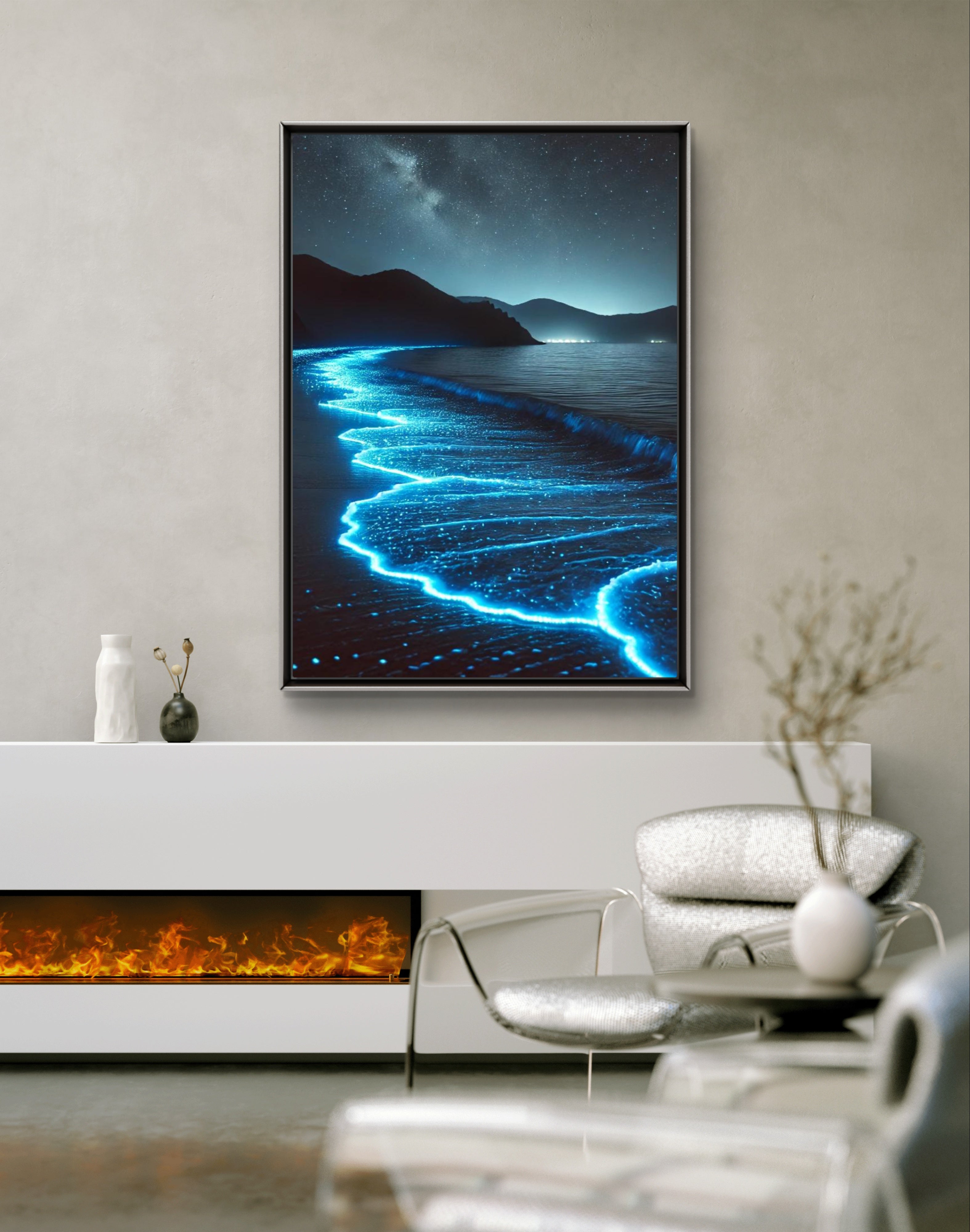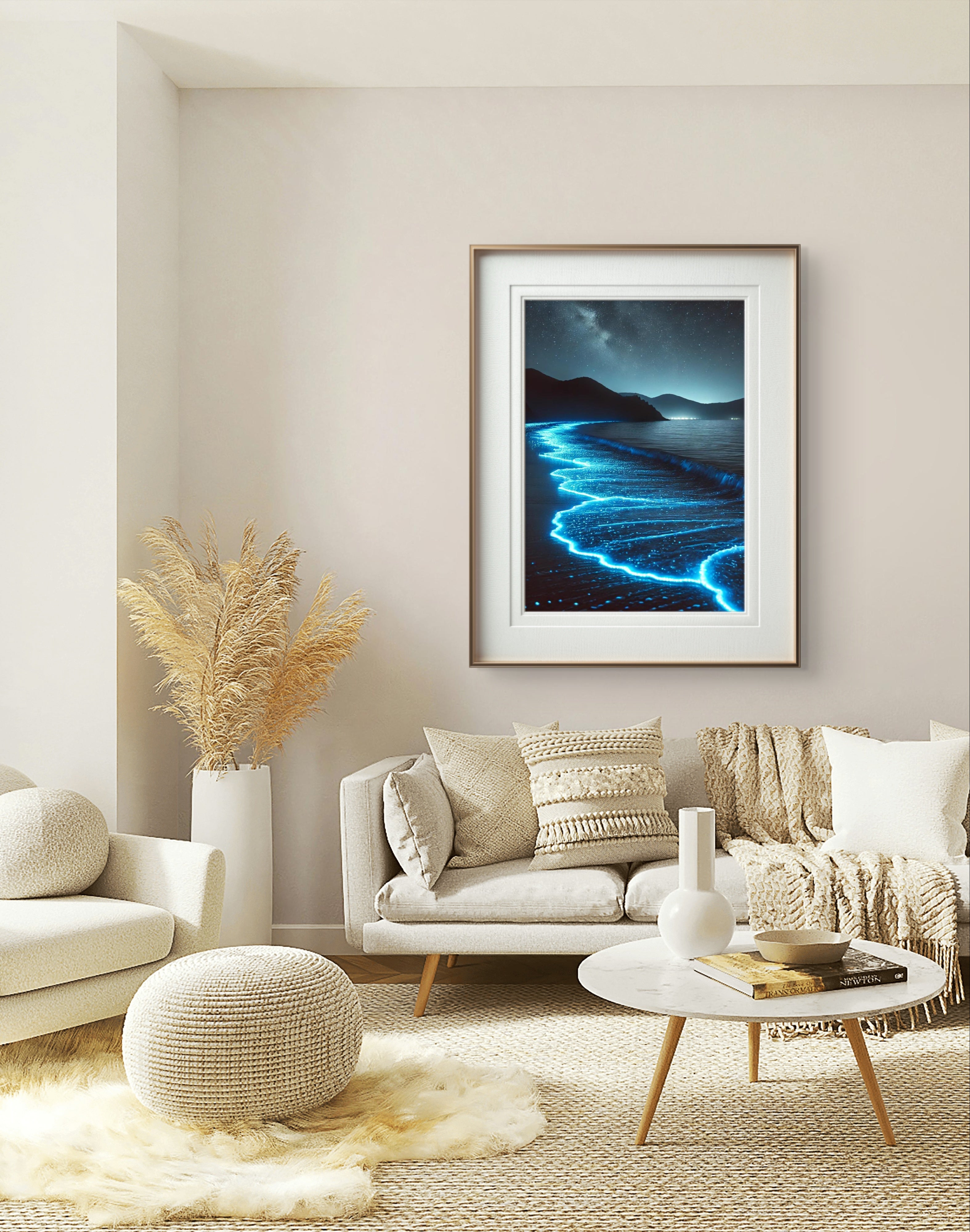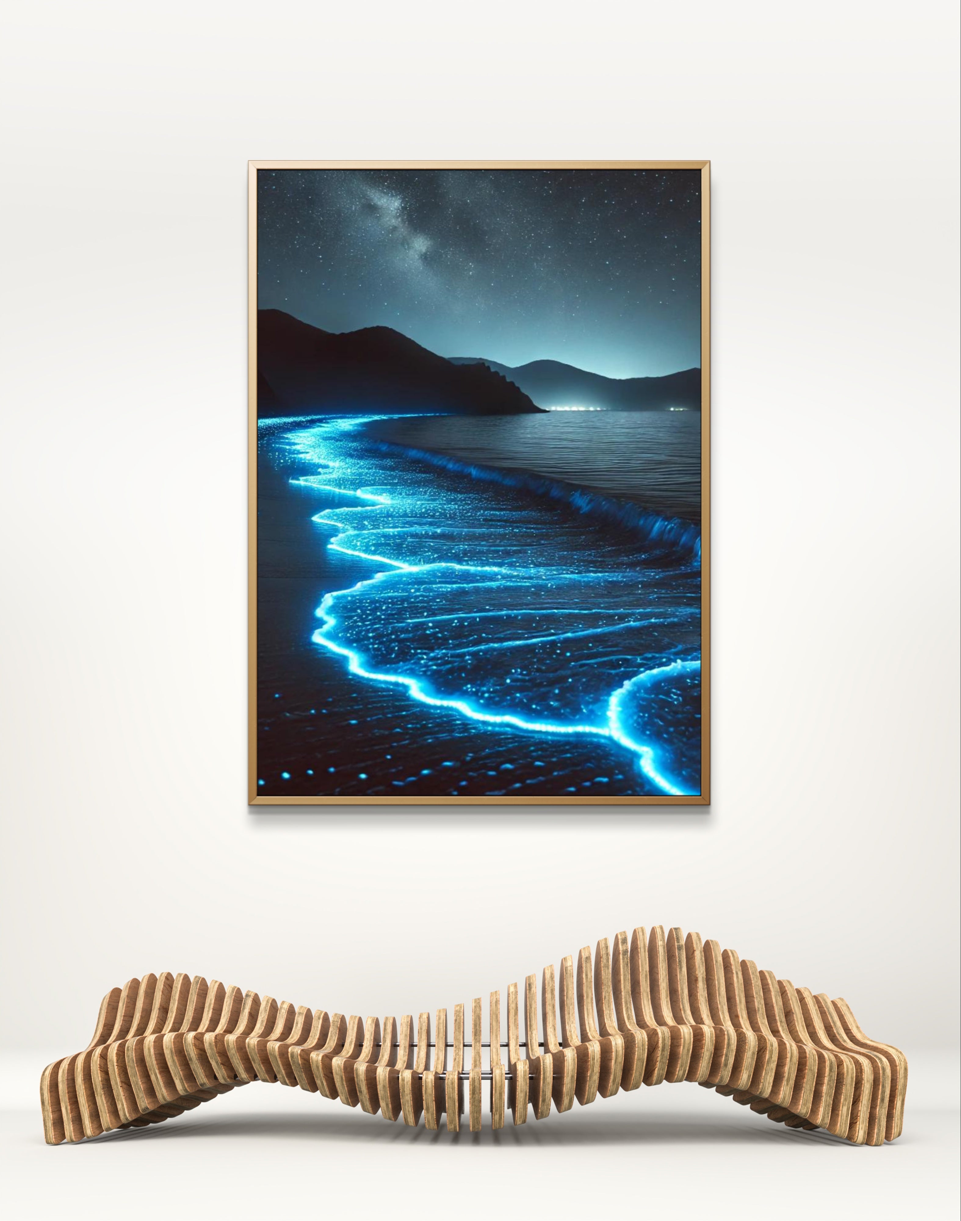Transport yourself to a realm of nocturnal enchantment with Midnight Dream, a mesmerizing art print that captures the serene beauty of a glowing blue beach under a starlit sky. This captivating photograph showcases a tranquil nighttime scene where the waves are gently illuminated, casting a soft, magical glow across the water.