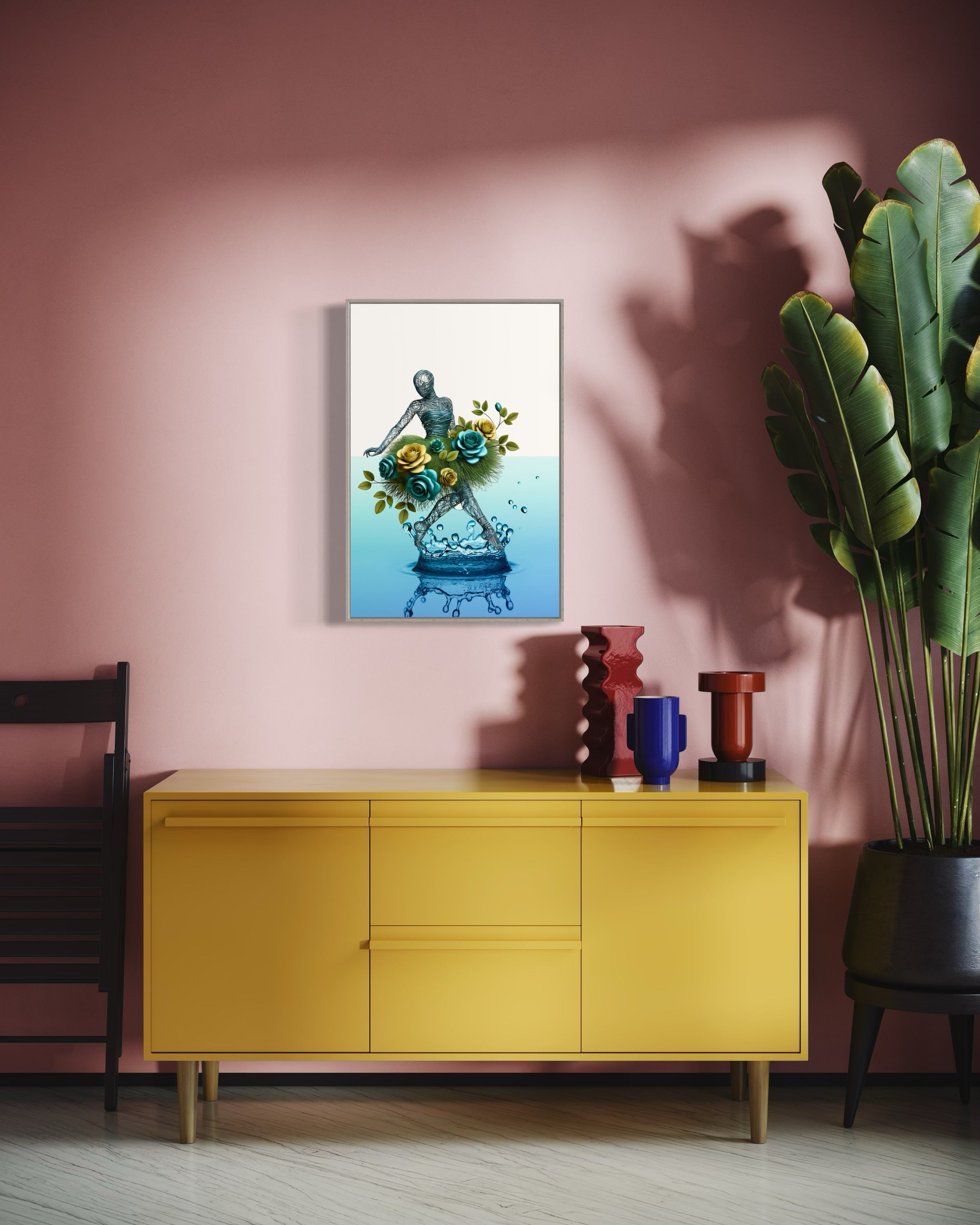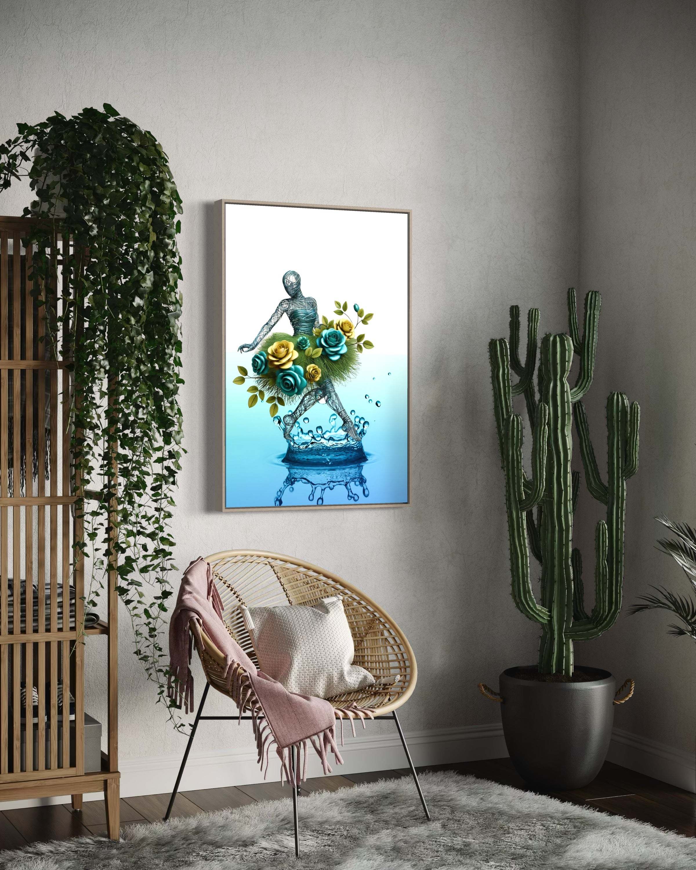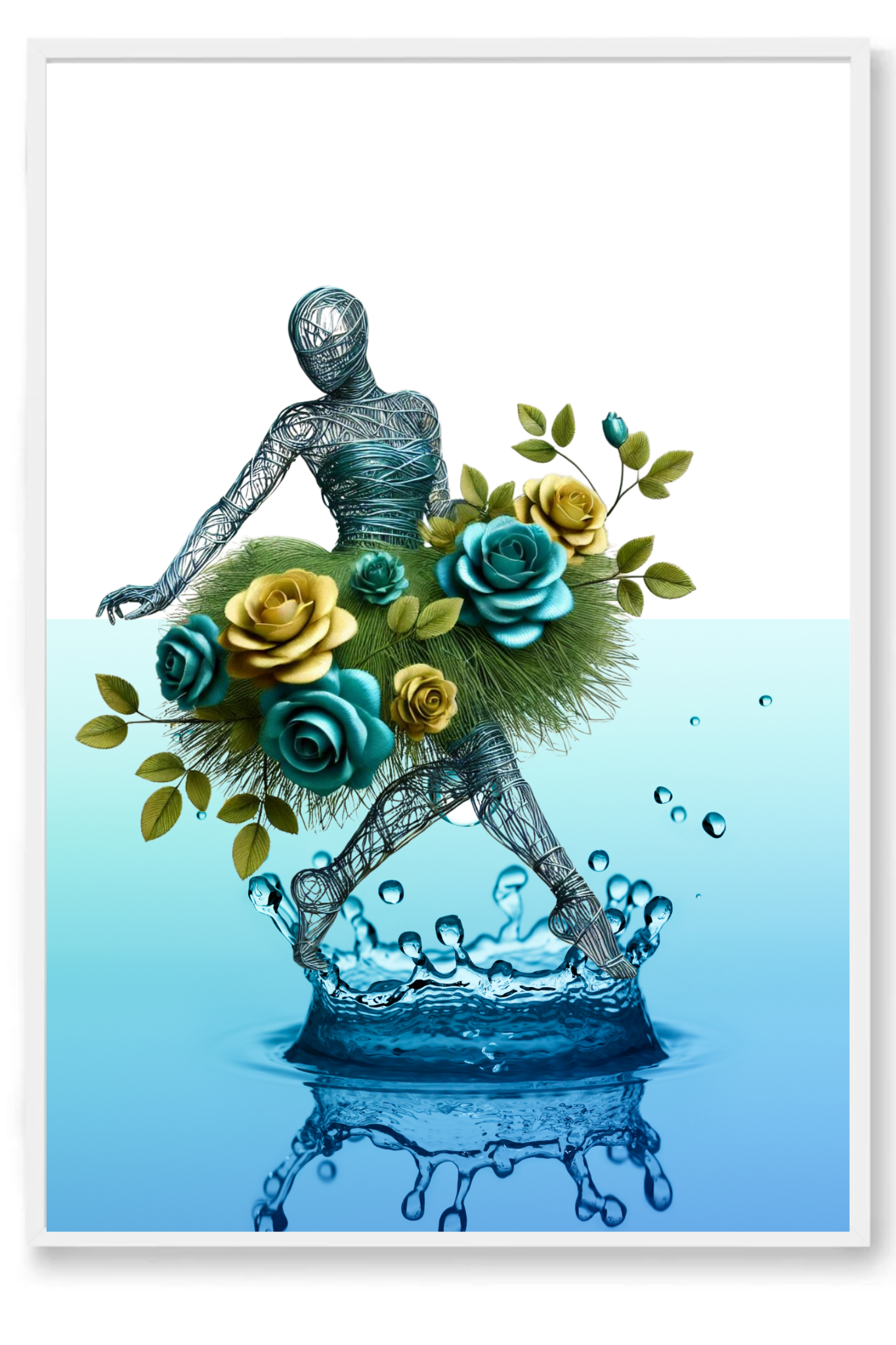 Transform your space with the enchanting elegance of Roses & Tear Drops, an abstract art print that captures the whimsical dance of nature and emotion. This captivating piece features a wire figure adorned with a vibrant skirt of green and yellow roses, seamlessly intertwined with lush grass. The figure’s graceful dance is set against the backdrop of a colossal tropical tear drop, symbolizing both the fragility and beauty of life's moments.
