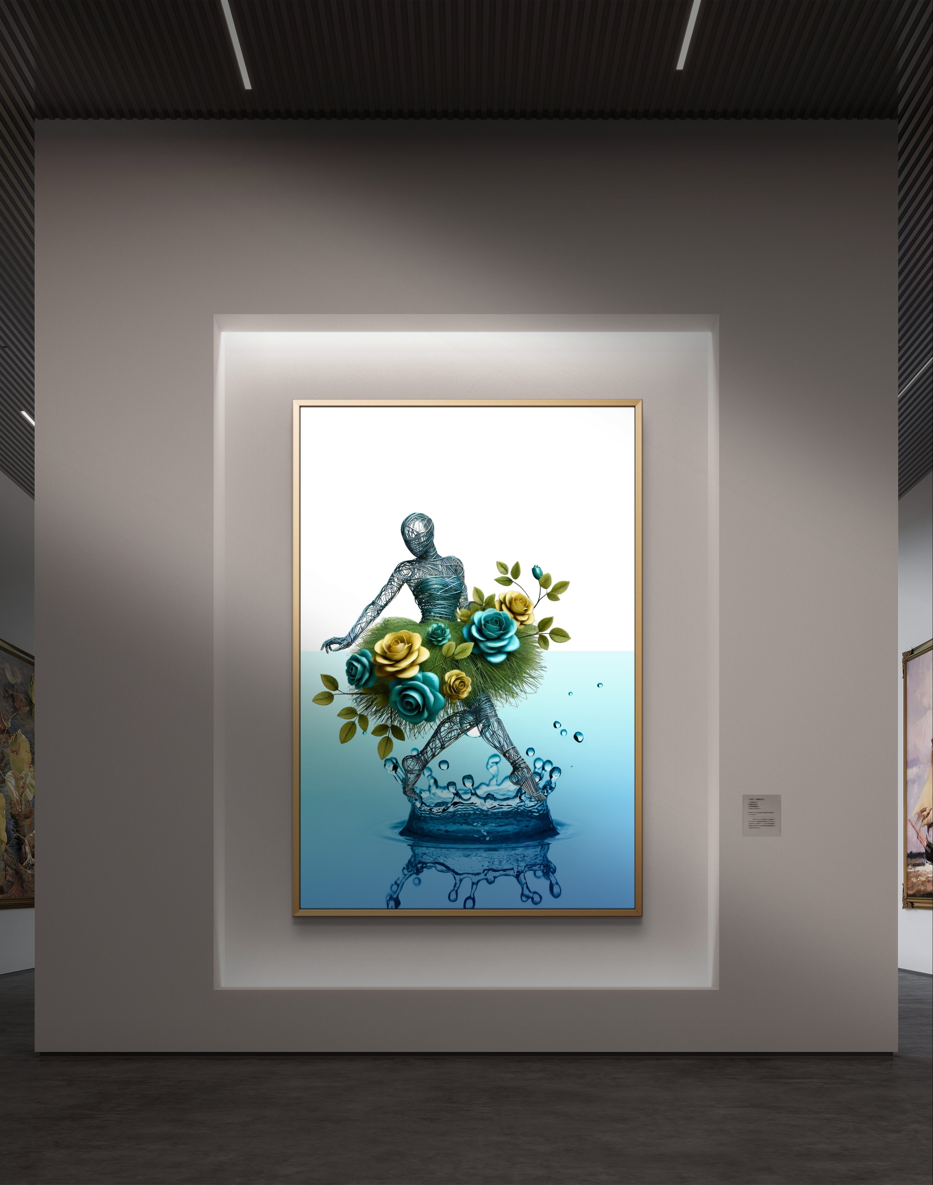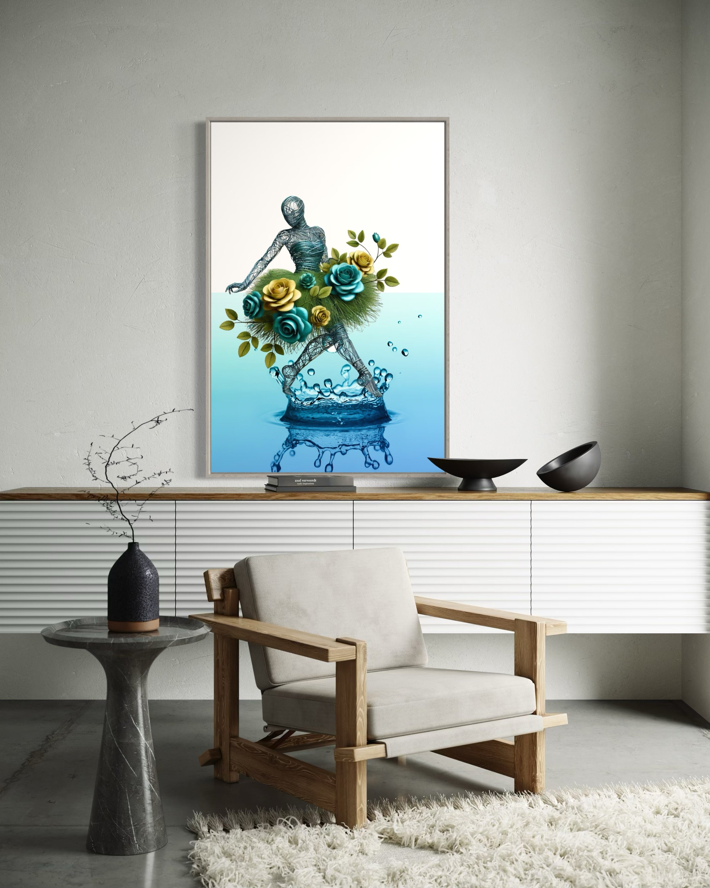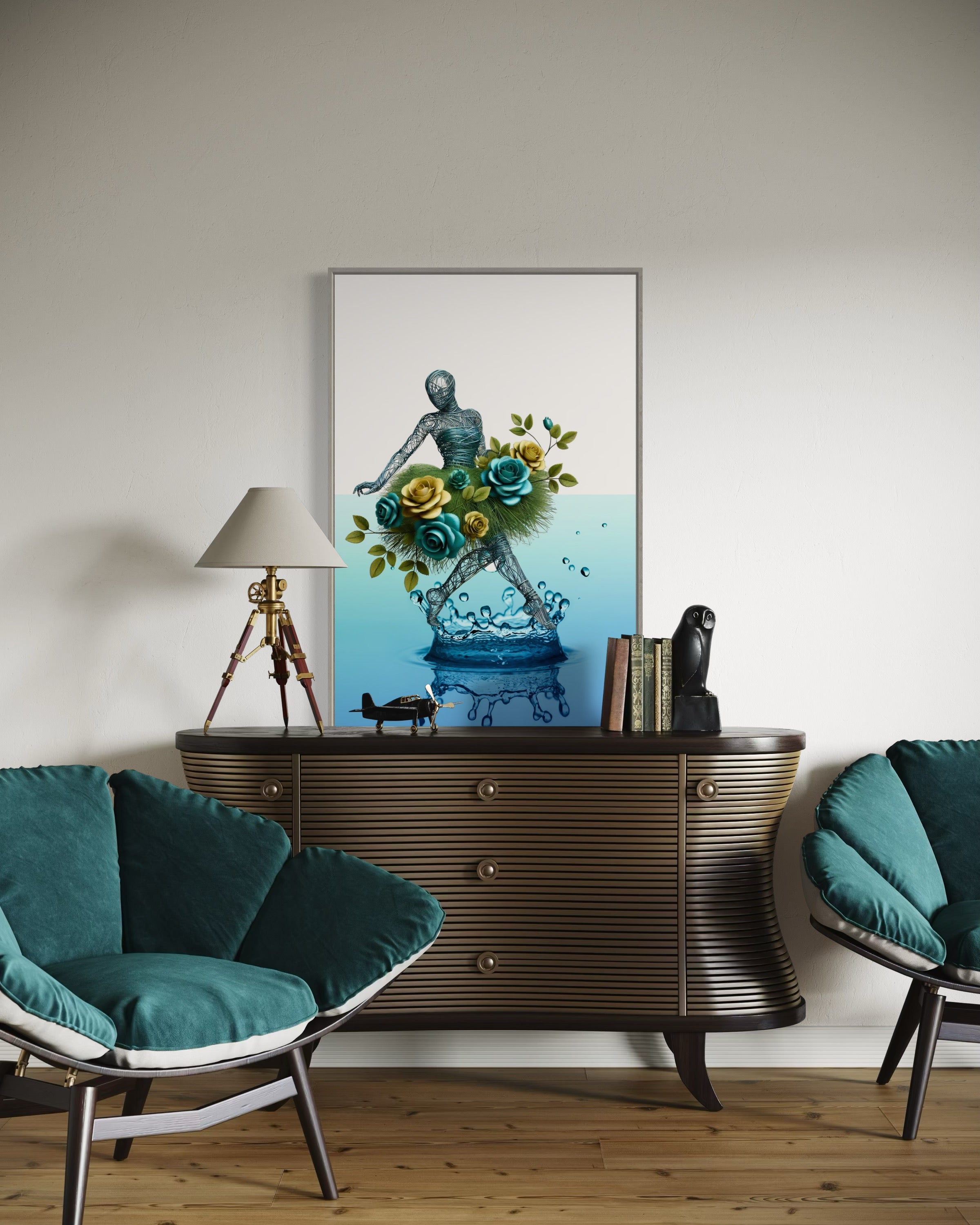 Transform your space with the enchanting elegance of Roses & Tear Drops, an abstract art print that captures the whimsical dance of nature and emotion. This captivating piece features a wire figure adorned with a vibrant skirt of green and yellow roses, seamlessly intertwined with lush grass. The figure’s graceful dance is set against the backdrop of a colossal tropical tear drop, symbolizing both the fragility and beauty of life's moments.