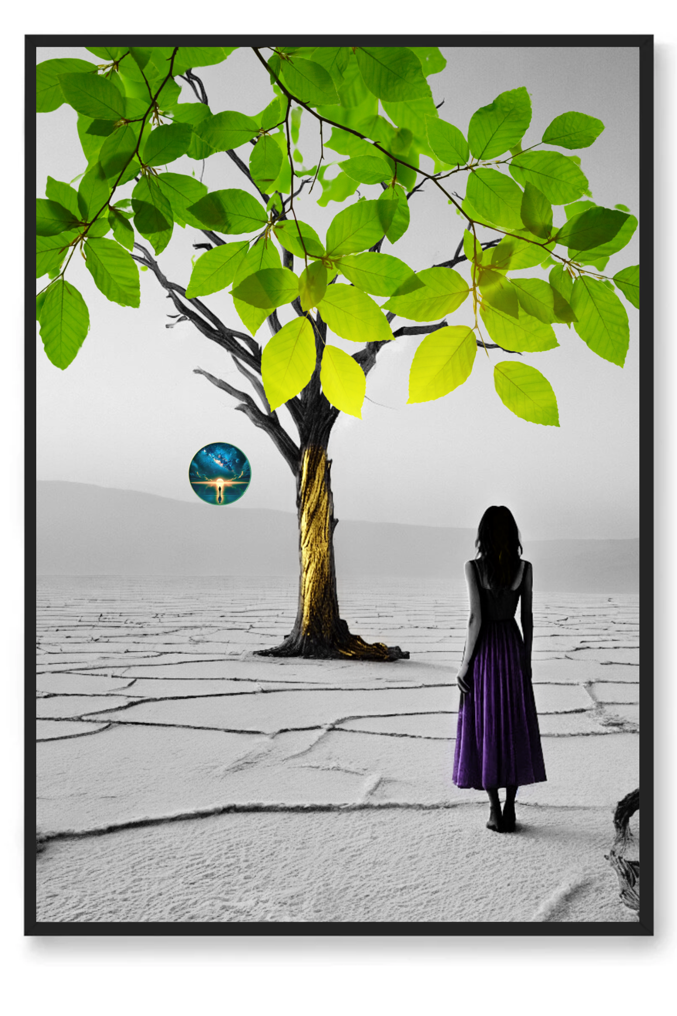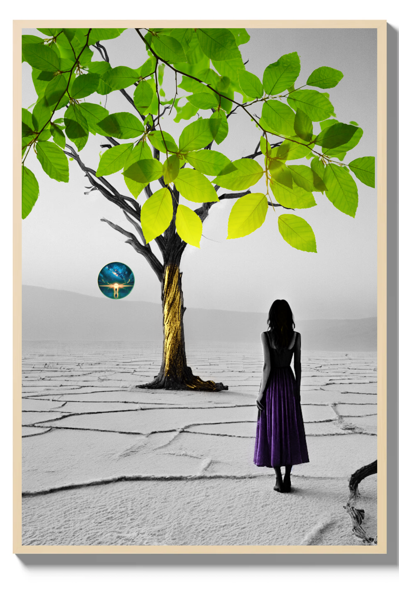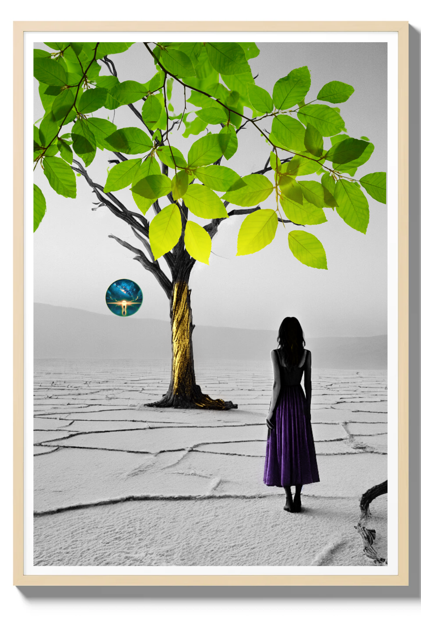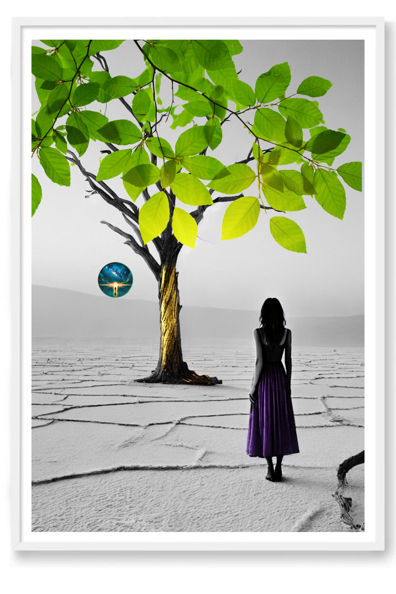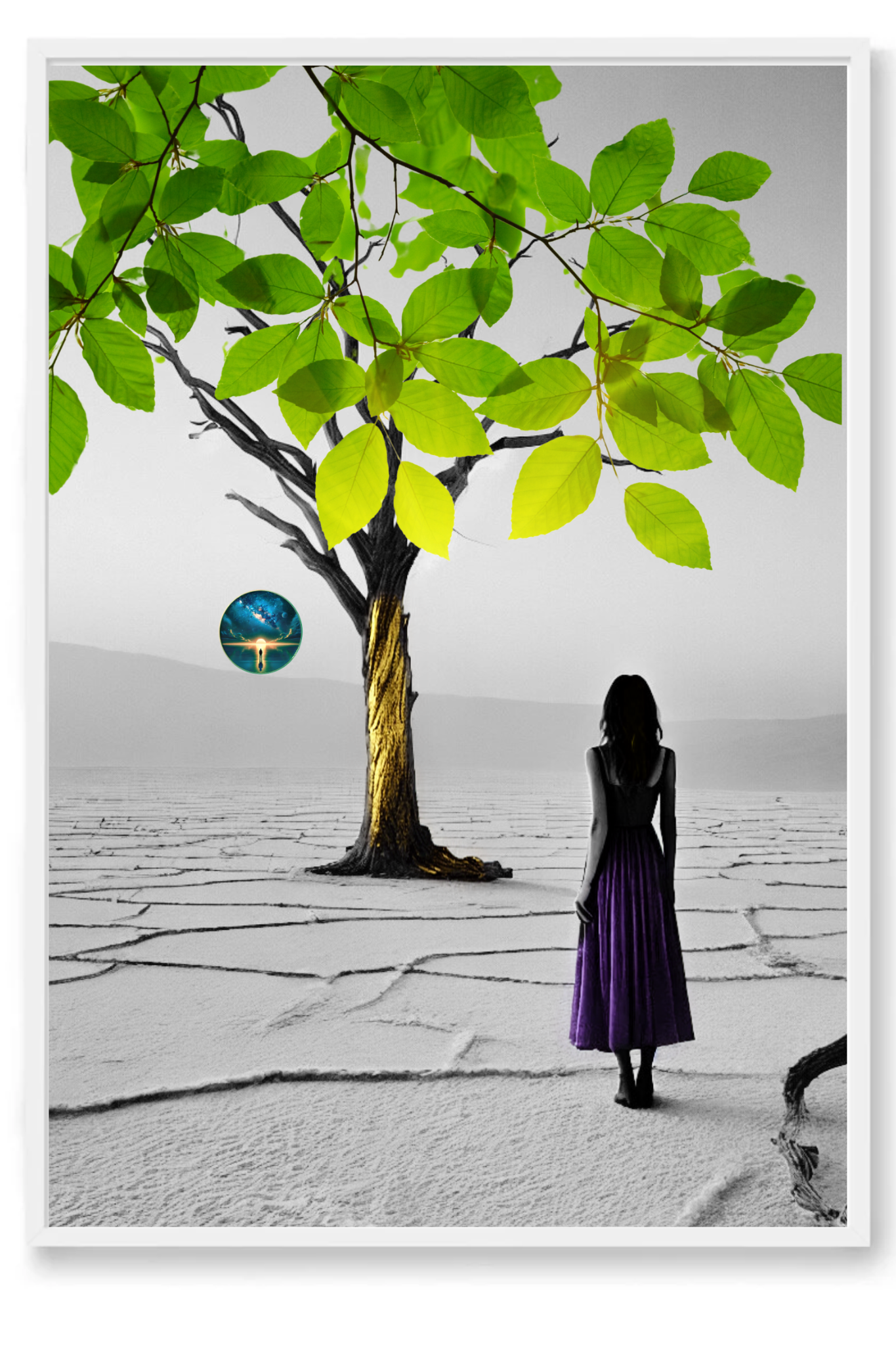 Embark on a visual journey with Portal of Seasons, a captivating art print where monochrome mystery meets vibrant discovery. This striking piece features a woman standing in a stark, snowy desert, facing a singular tree. Peering through its branches and glorious leaves, she gazes into a brilliant world awash in shades of blue, shimmering with the promise of a new earth within Eternity.