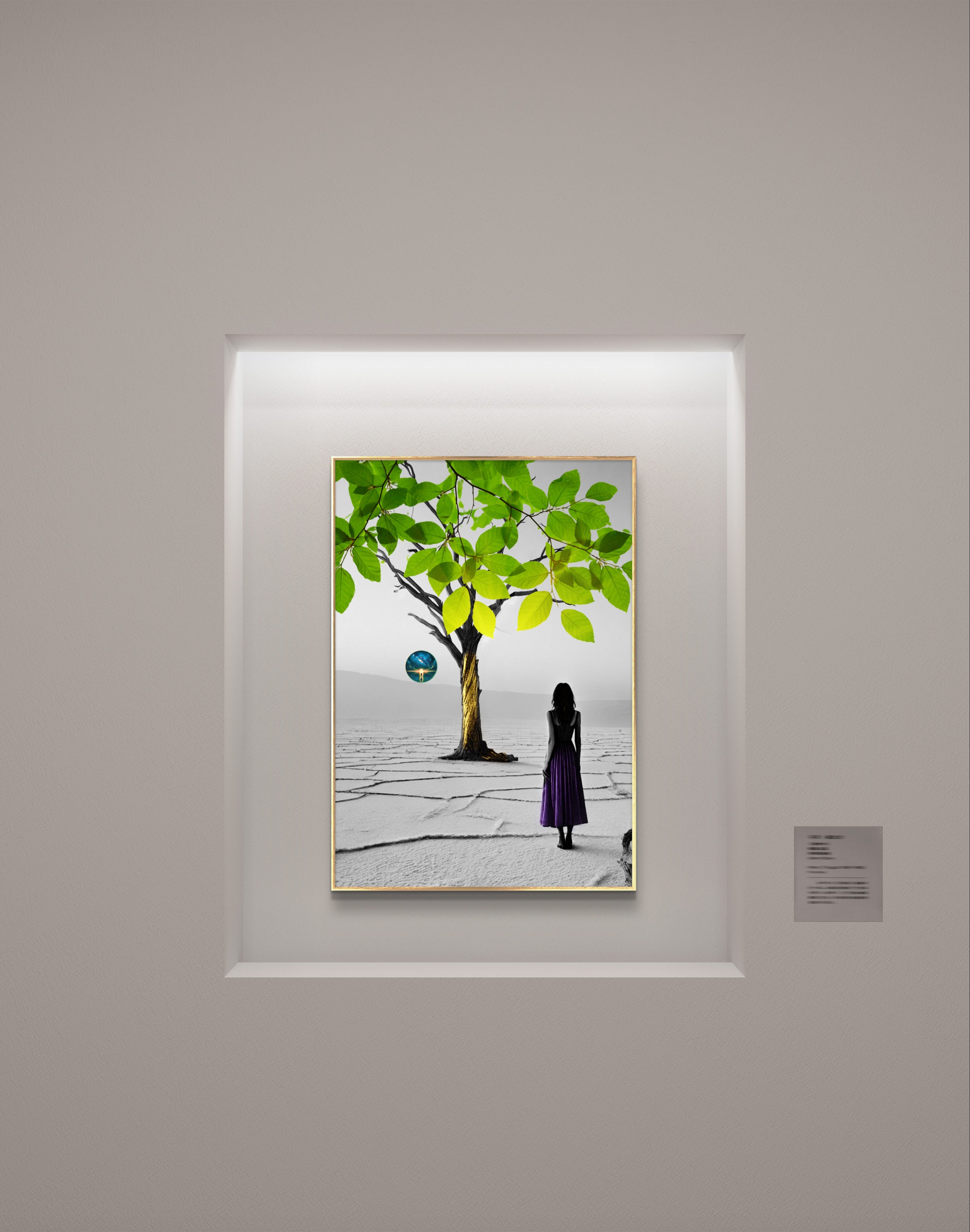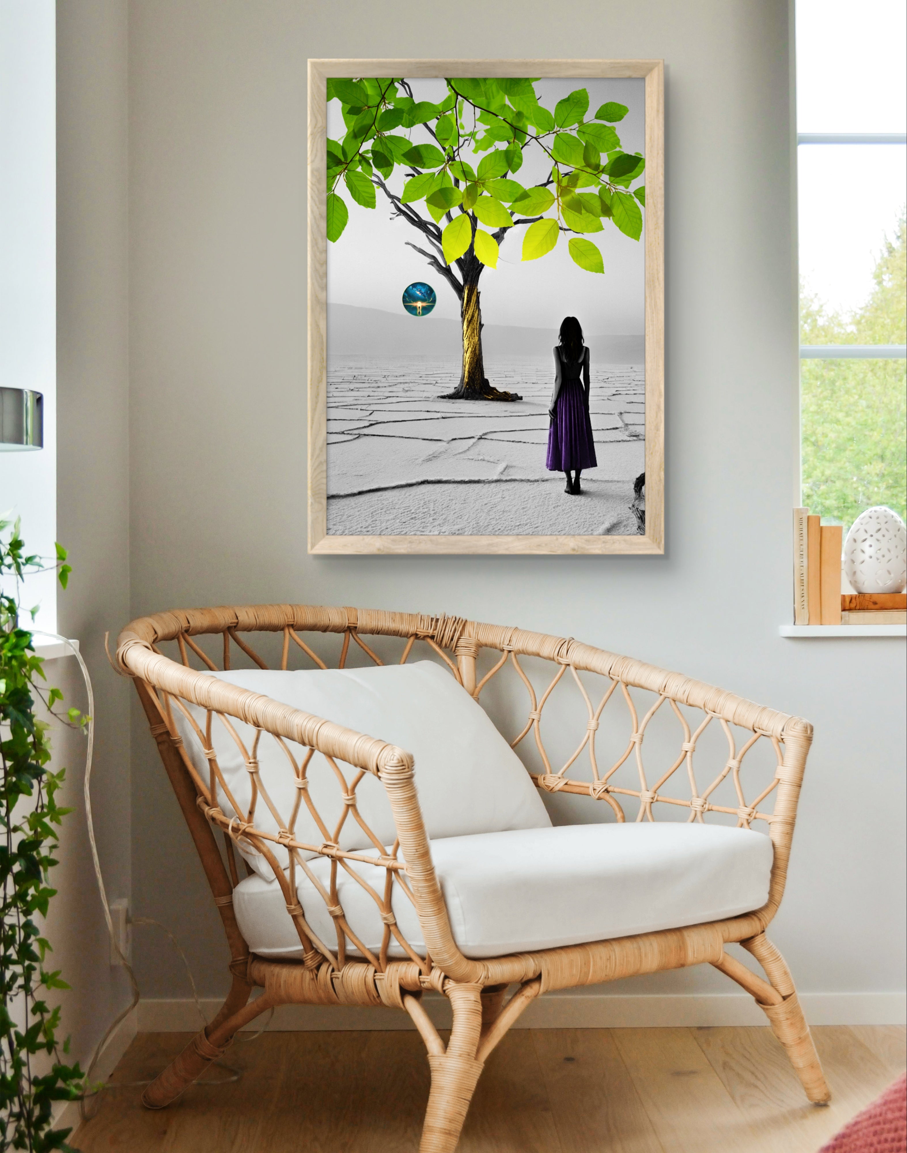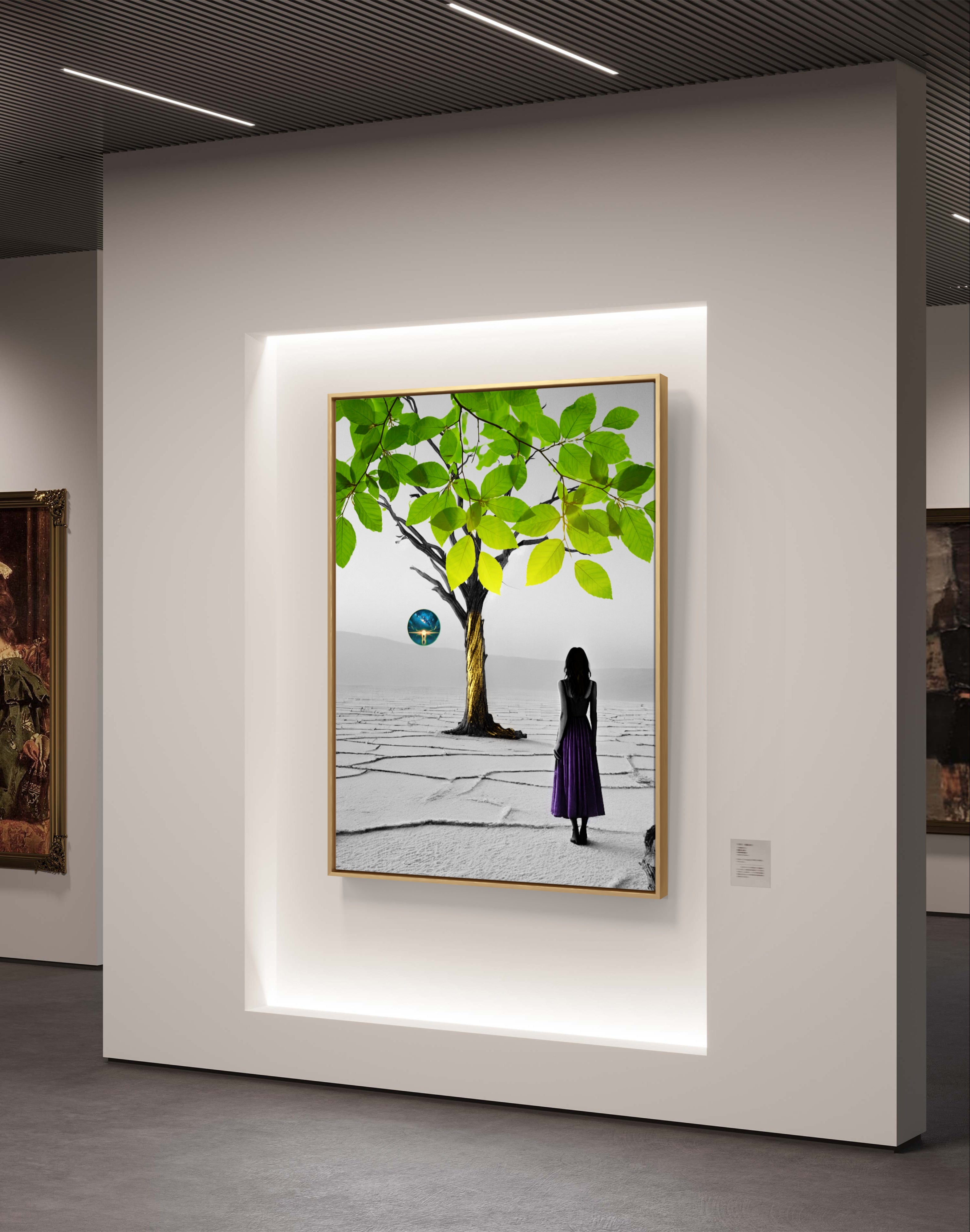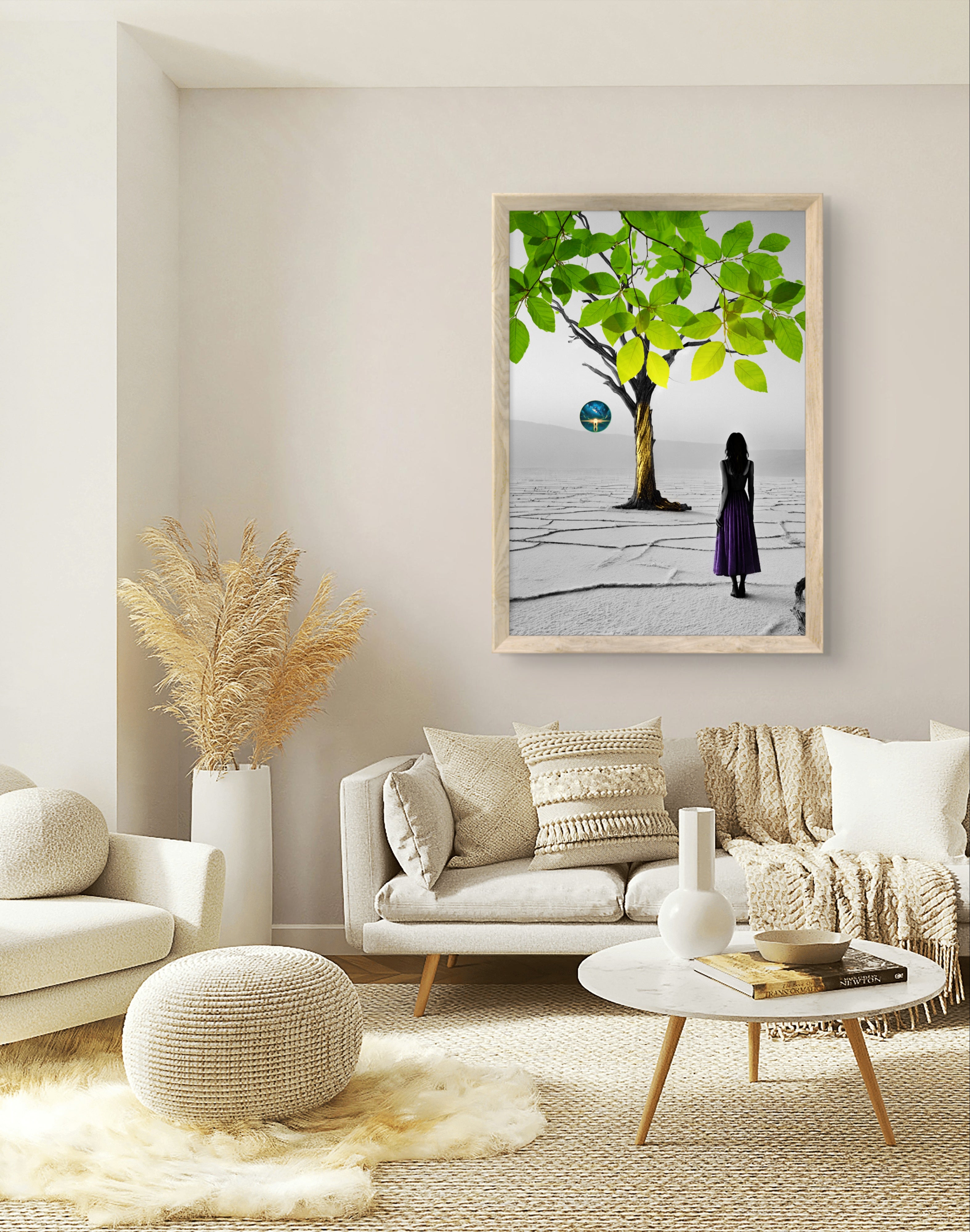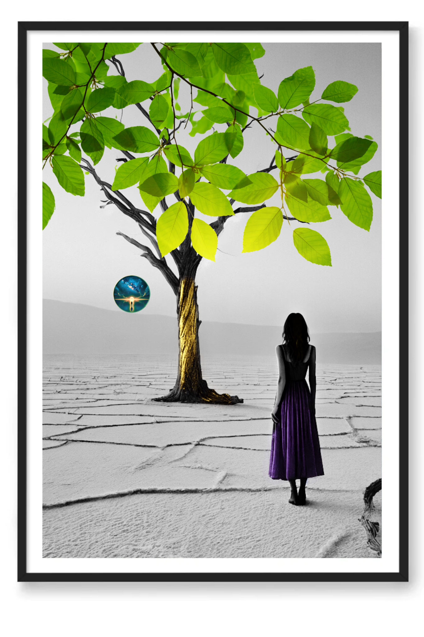 Embark on a visual journey with Portal of Seasons, a captivating art print where monochrome mystery meets vibrant discovery. This striking piece features a woman standing in a stark, snowy desert, facing a singular tree. Peering through its branches and glorious leaves, she gazes into a brilliant world awash in shades of blue, shimmering with the promise of a new earth within Eternity.