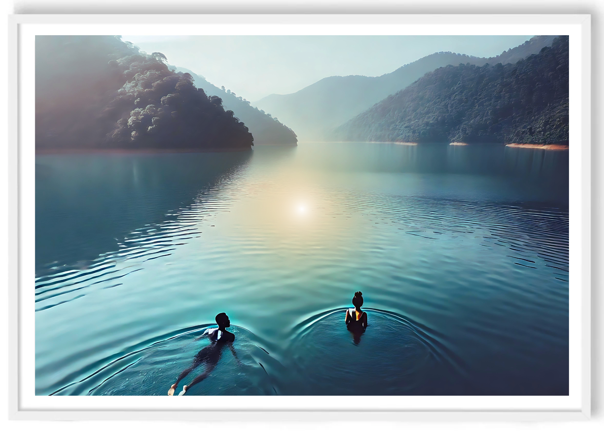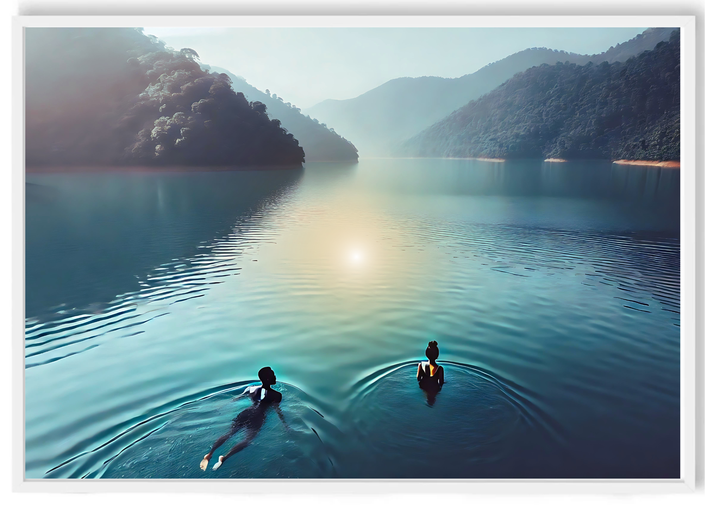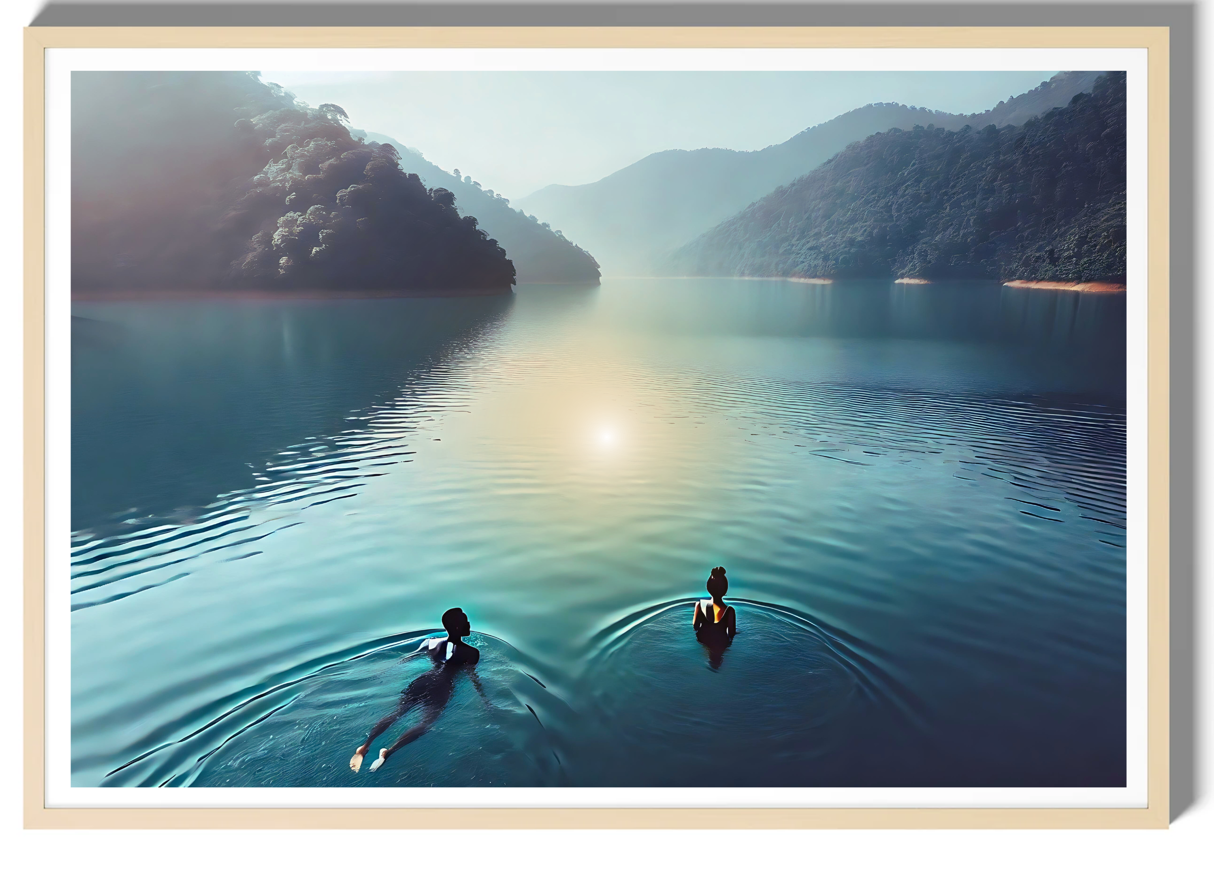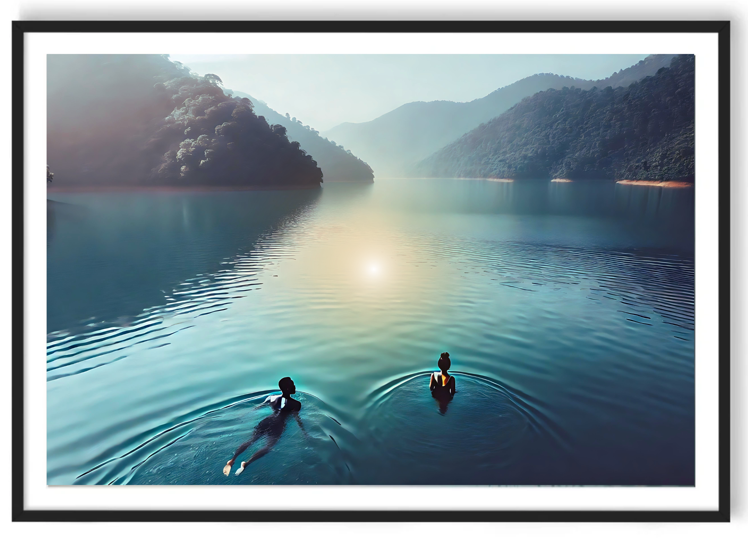Immerse yourself in the serene beauty of "Serenity," a fine art print that captures the essence of tranquil freedom. This stunning photograph features a man and woman swimming in the crystalline waters of a tropical lake, embodying a sense of peace and liberation that transcends the everyday hustle.
