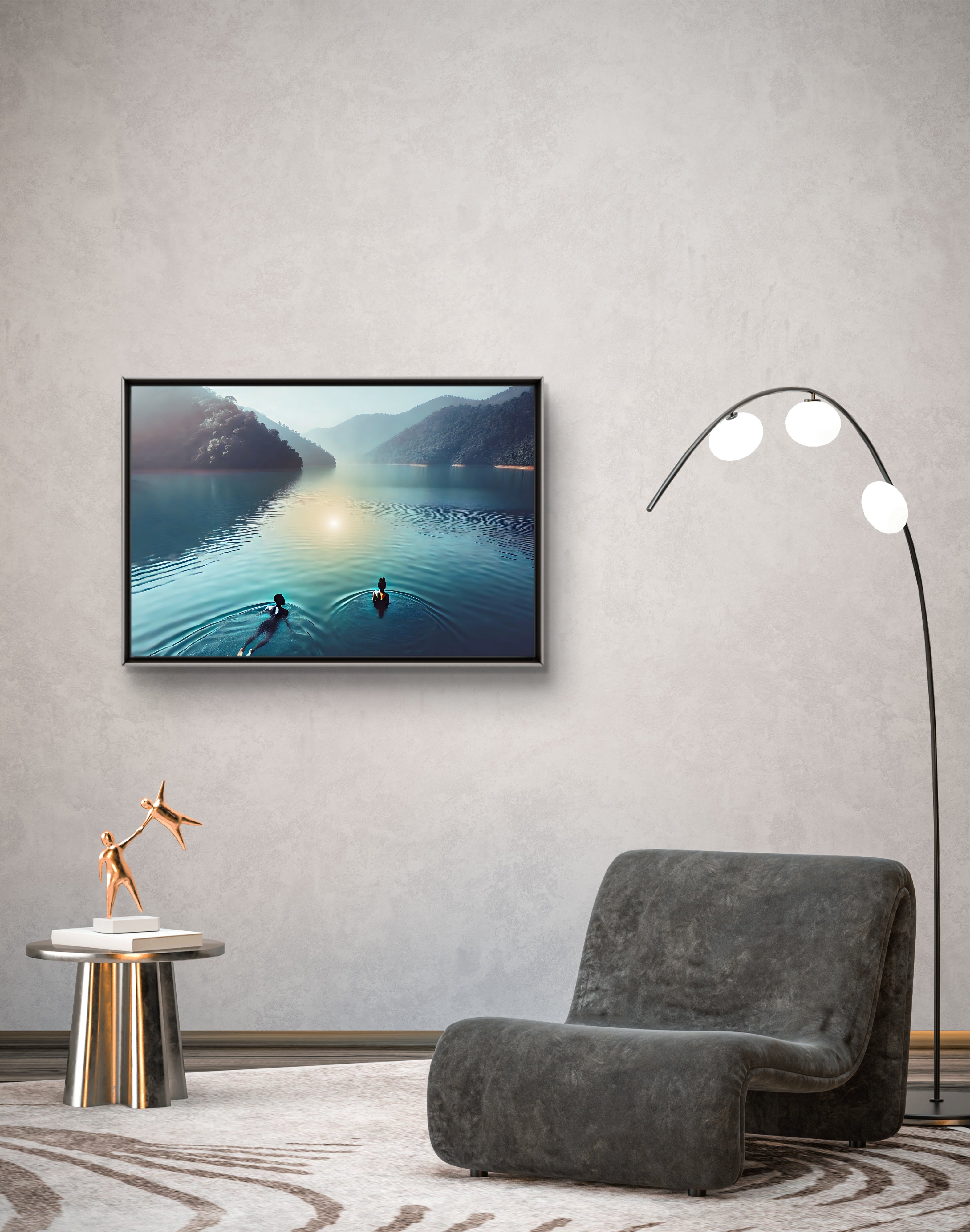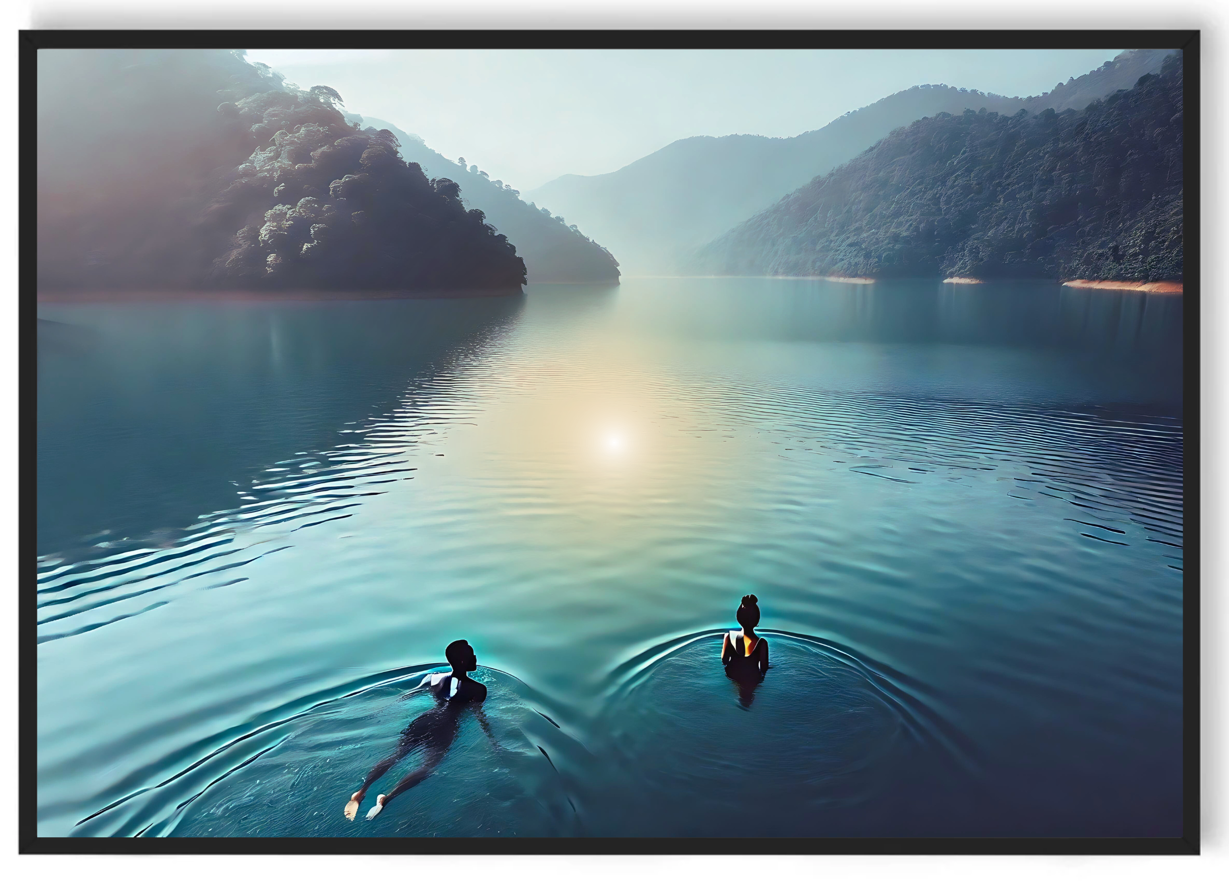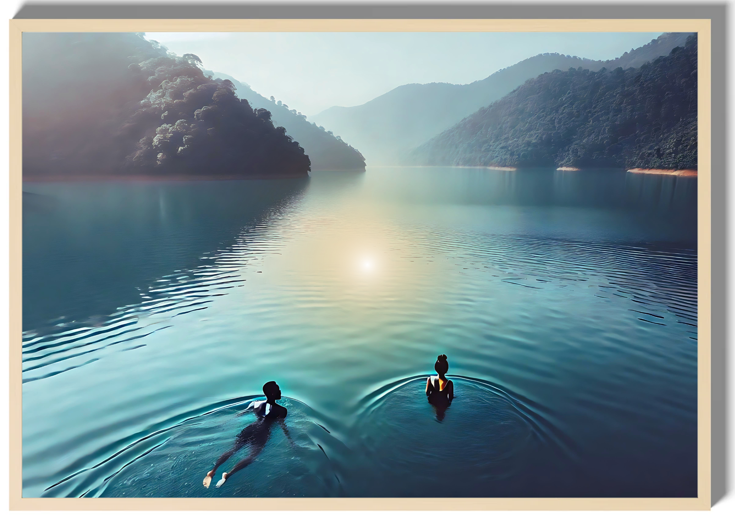Immerse yourself in the serene beauty of "Serenity," a fine art print that captures the essence of tranquil freedom. This stunning photograph features a man and woman swimming in the crystalline waters of a tropical lake, embodying a sense of peace and liberation that transcends the everyday hustle.