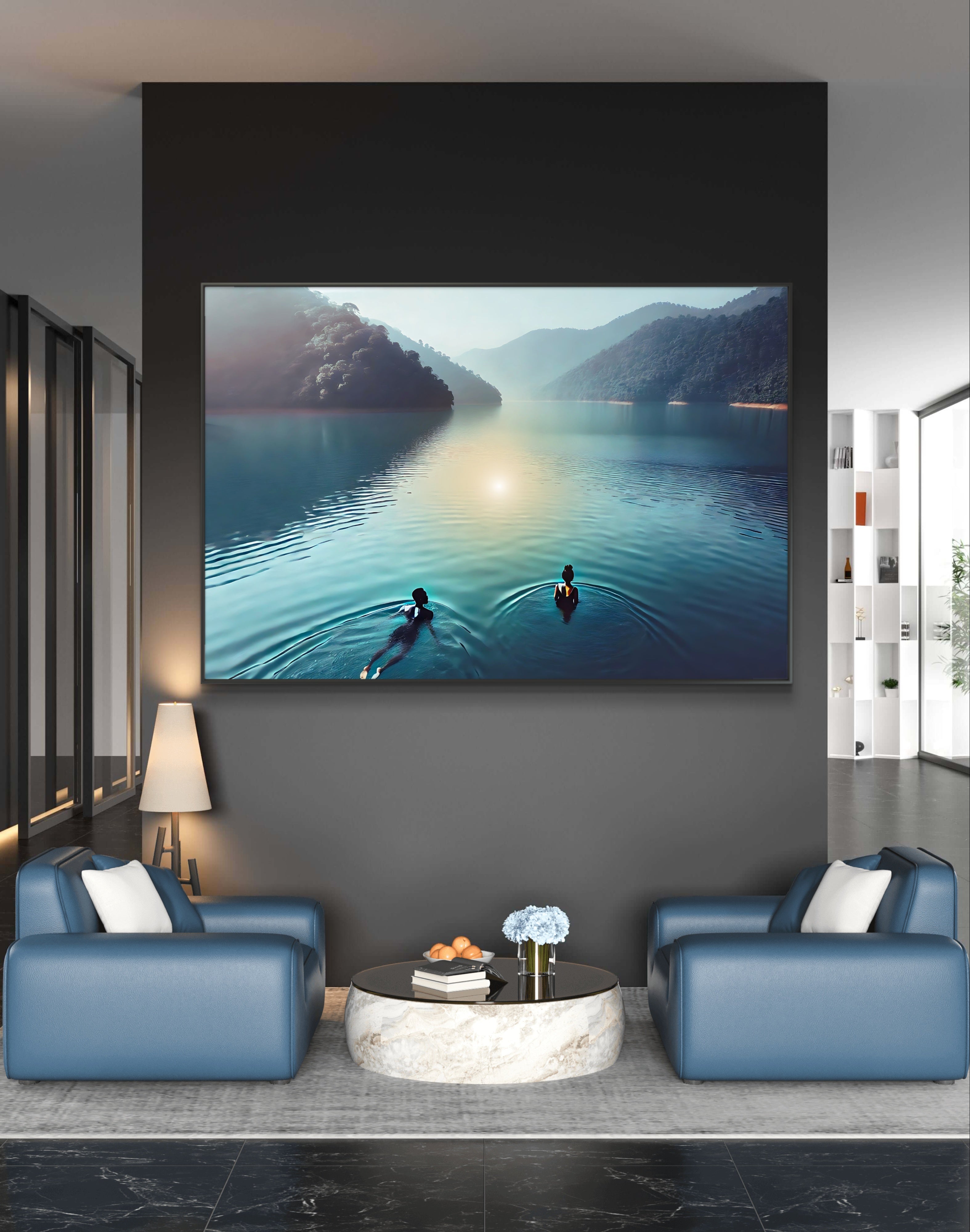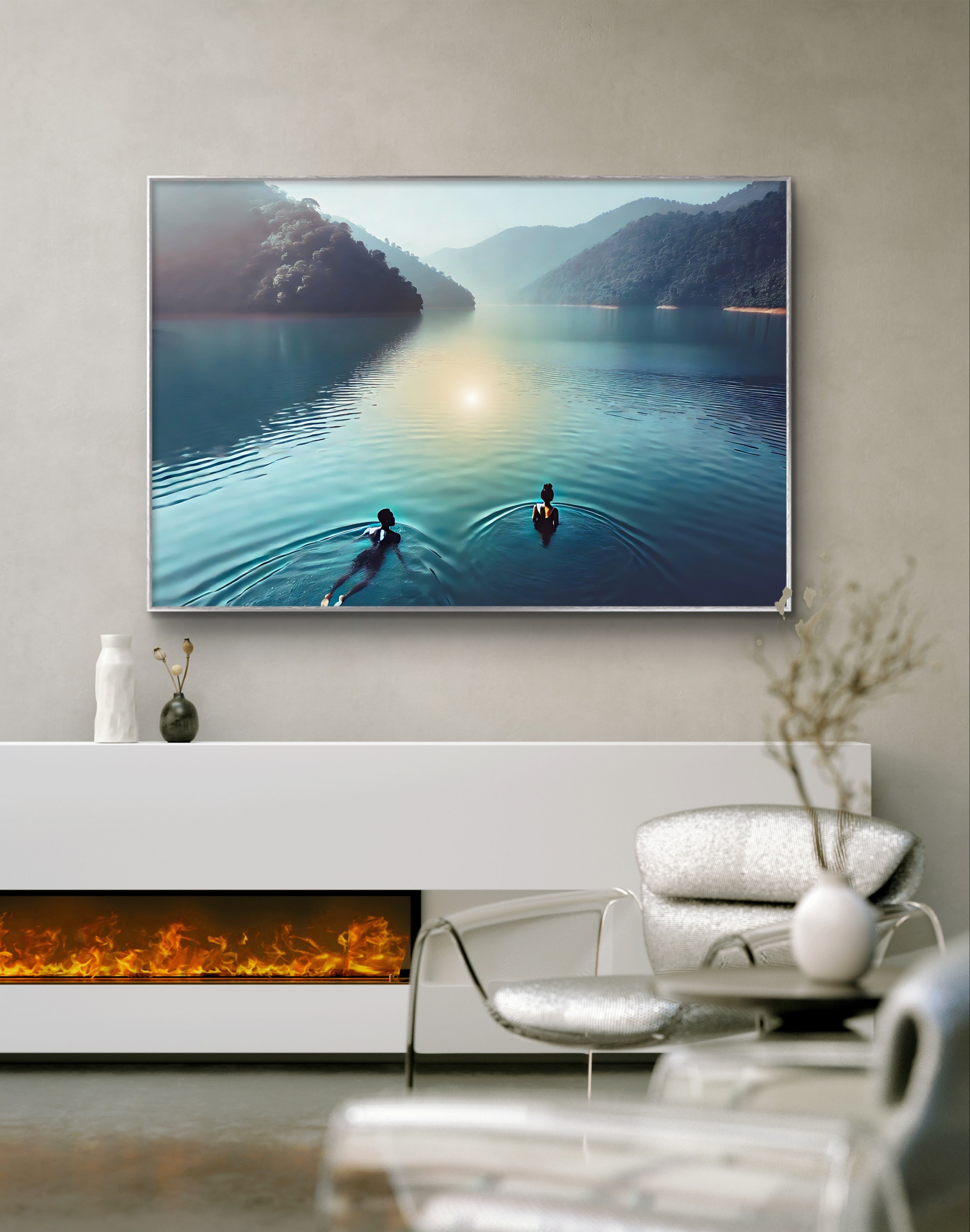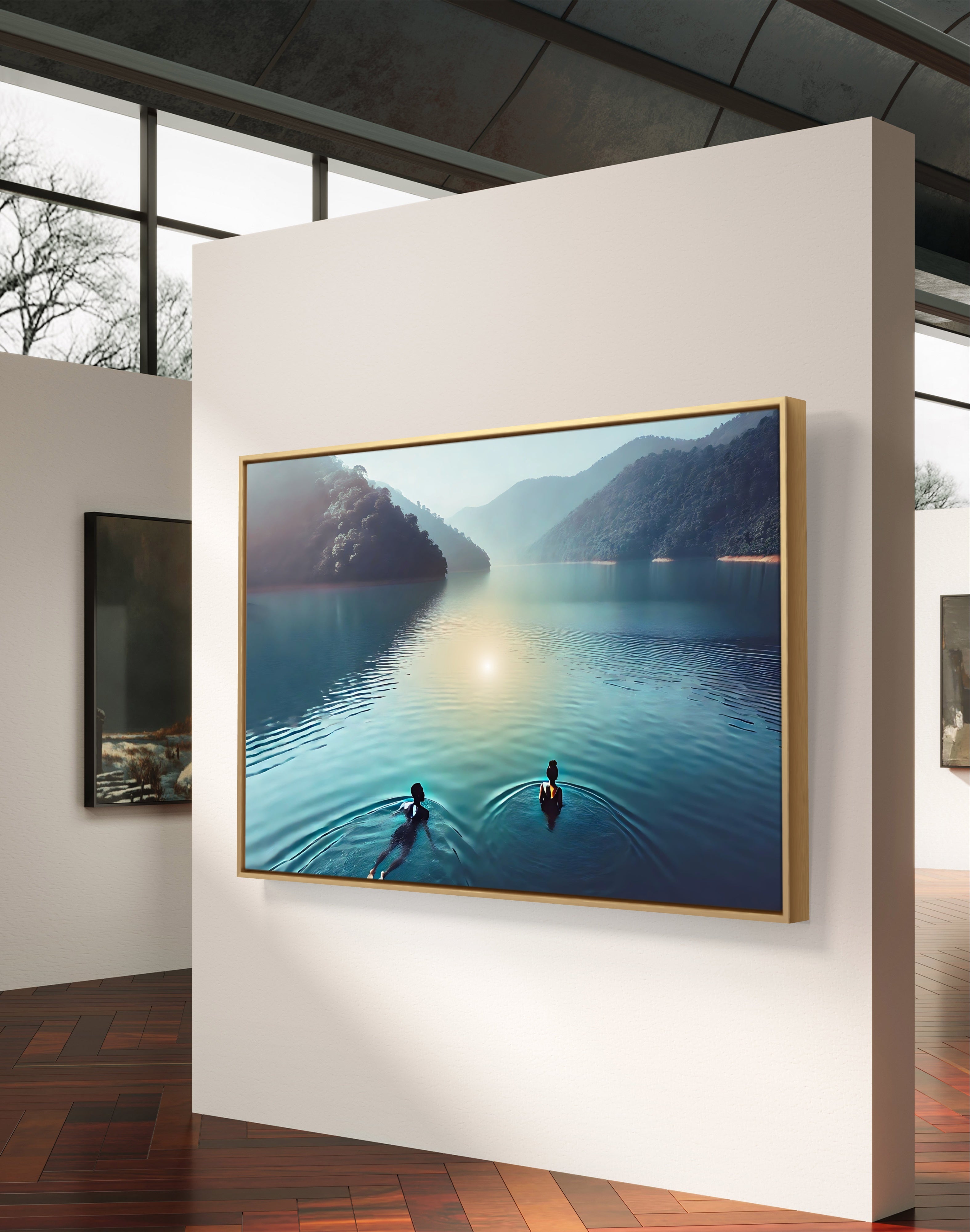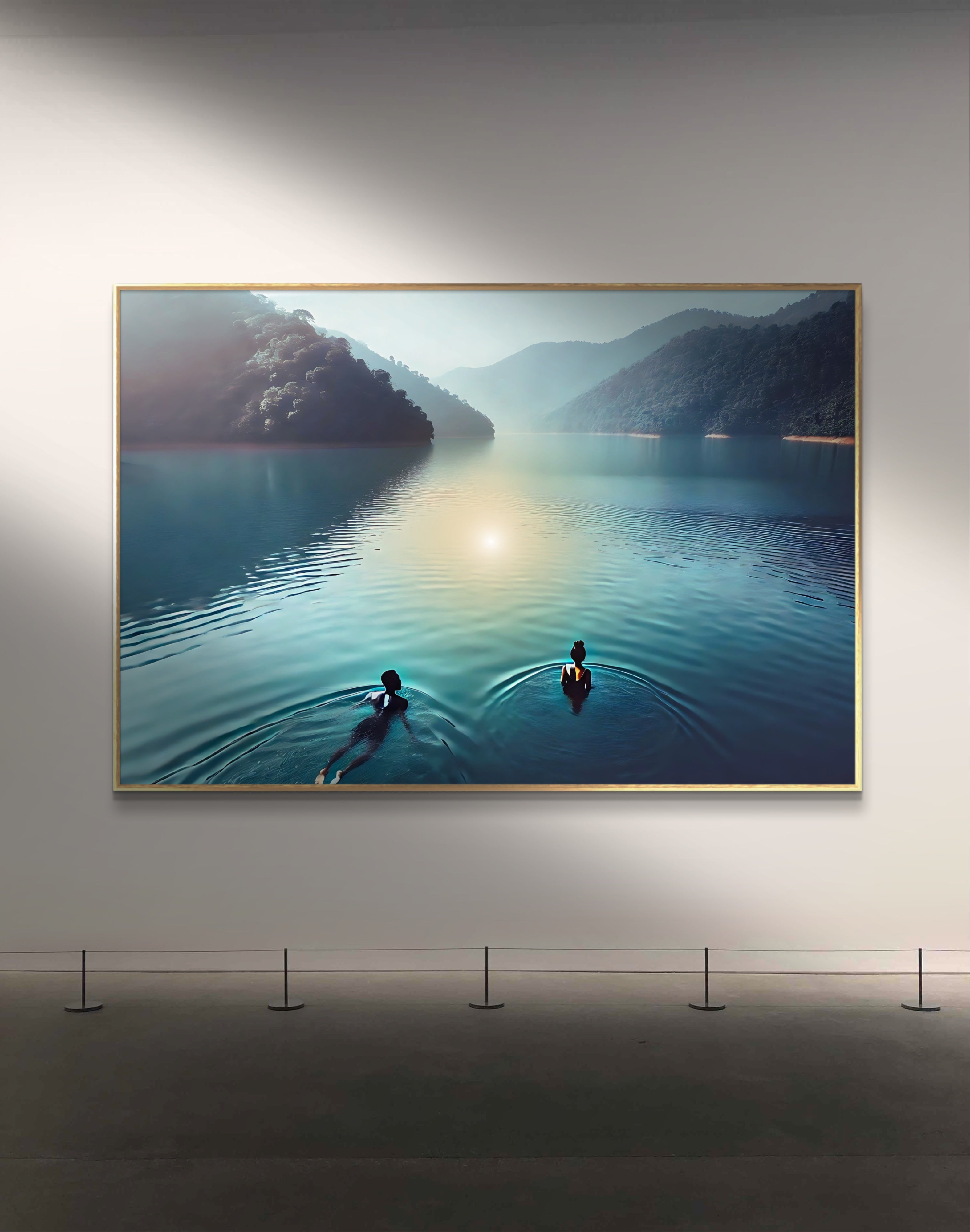 Immerse yourself in the serene beauty of "Serenity," a fine art print that captures the essence of tranquil freedom. This stunning photograph features a man and woman swimming in the crystalline waters of a tropical lake, embodying a sense of peace and liberation that transcends the everyday hustle.