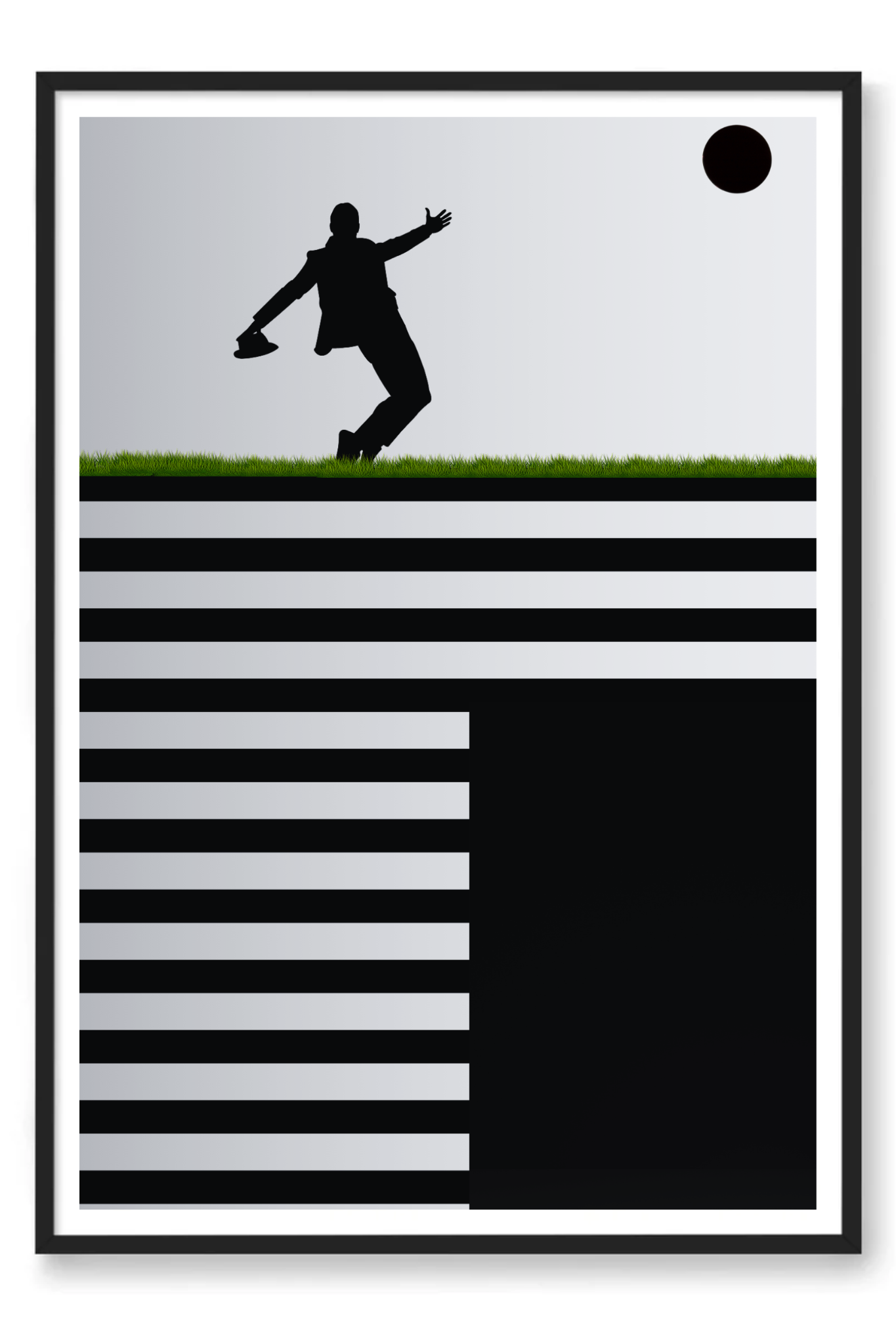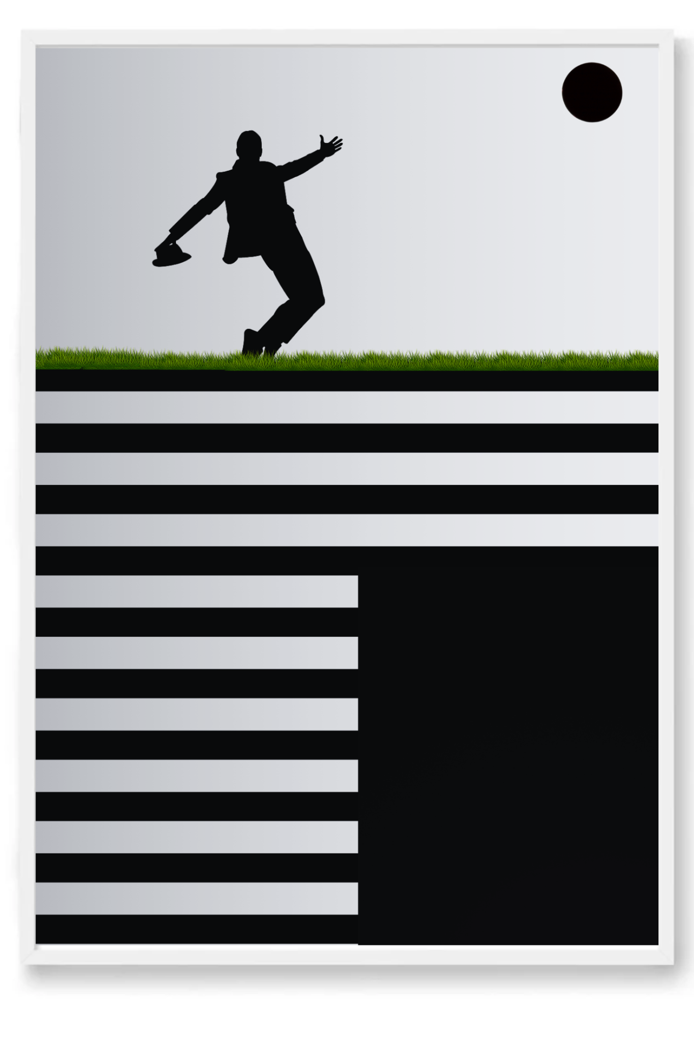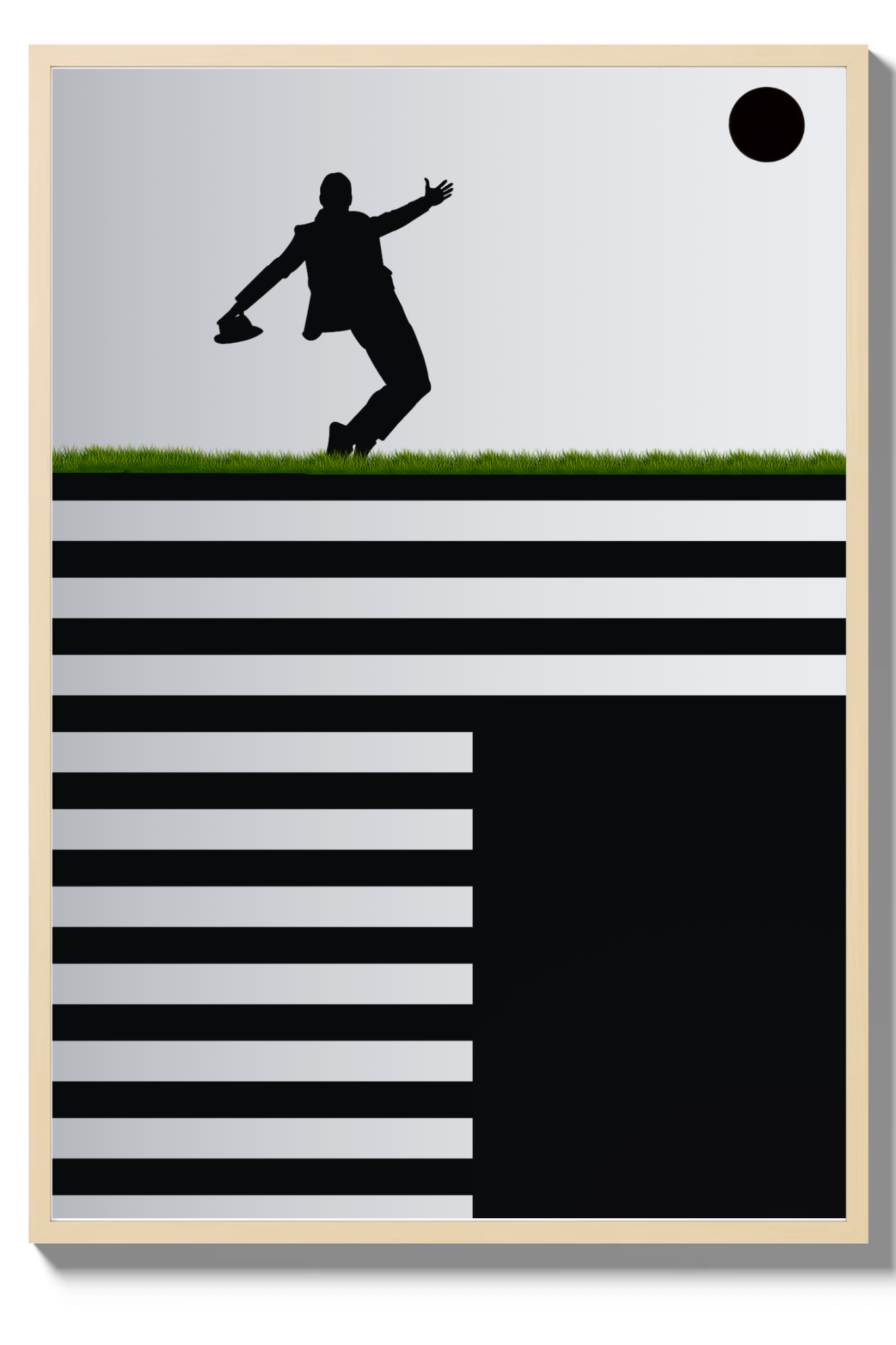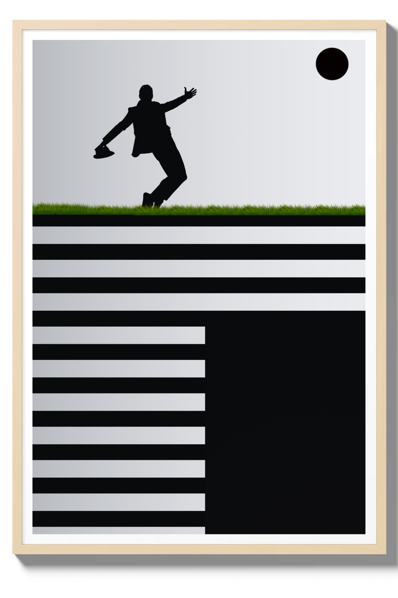 Immerse your space in the beauty of Song, an abstract art print that captures the essence of divine rhythm. This evocative image portrays a black figure of a man gracefully dancing in the grass beneath a black moon, standing firmly on black lines that guide his movement. The monochromatic color scheme of grey and black enhances the print’s dramatic and contemplative mood.