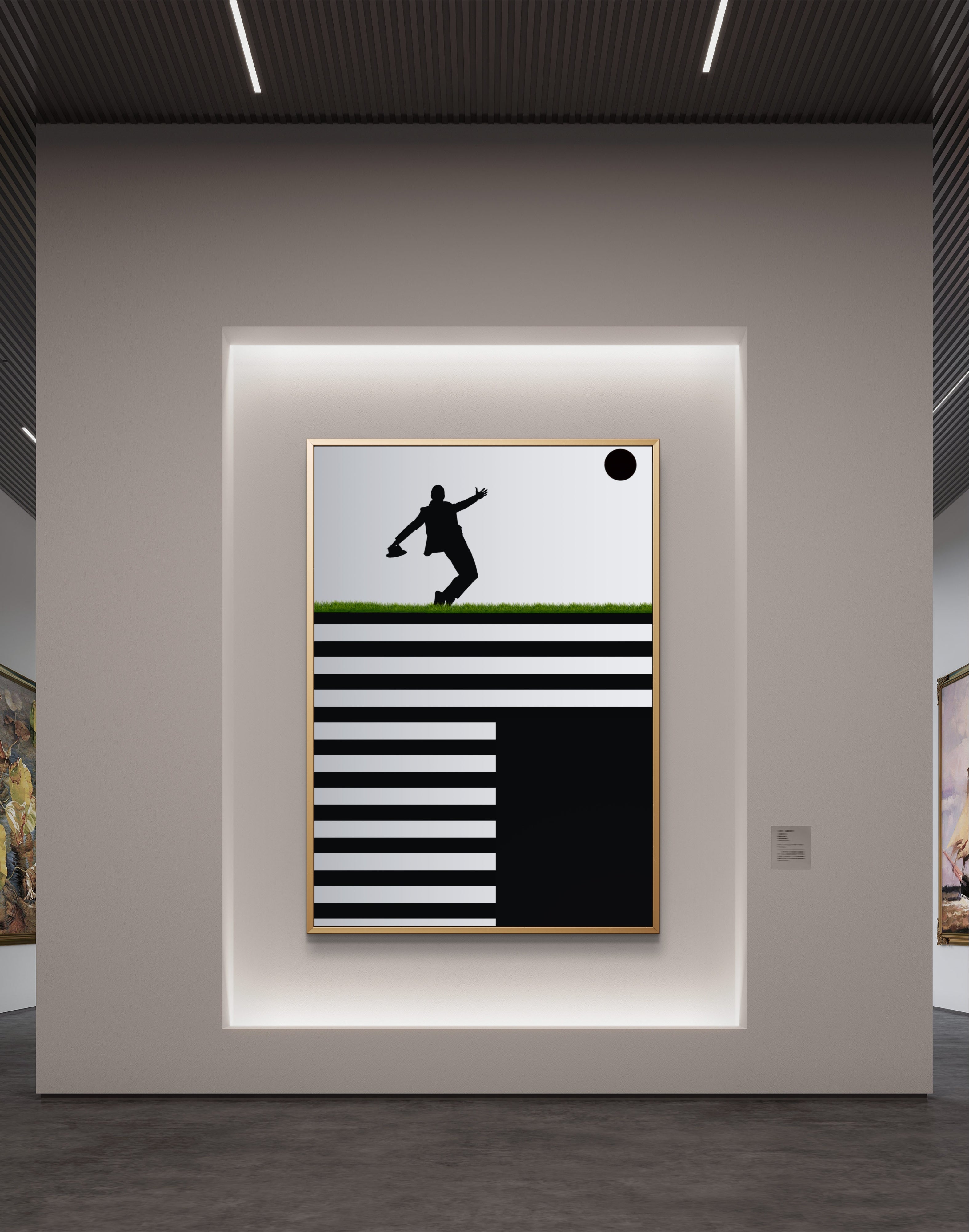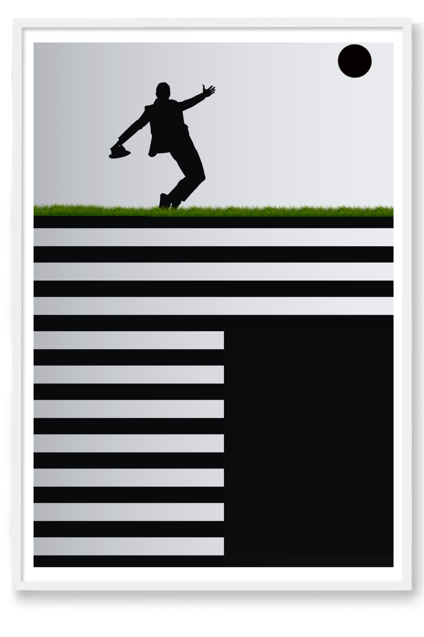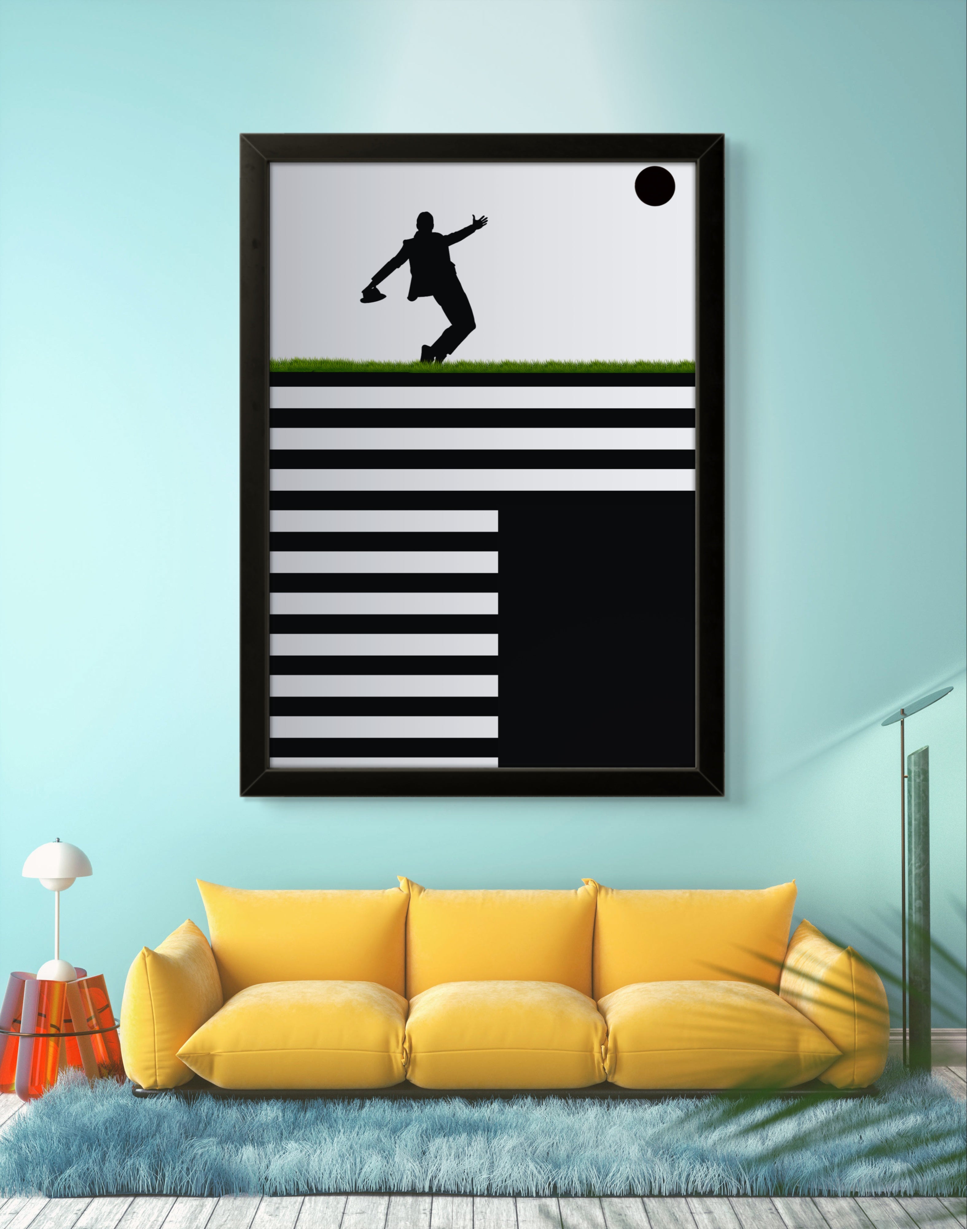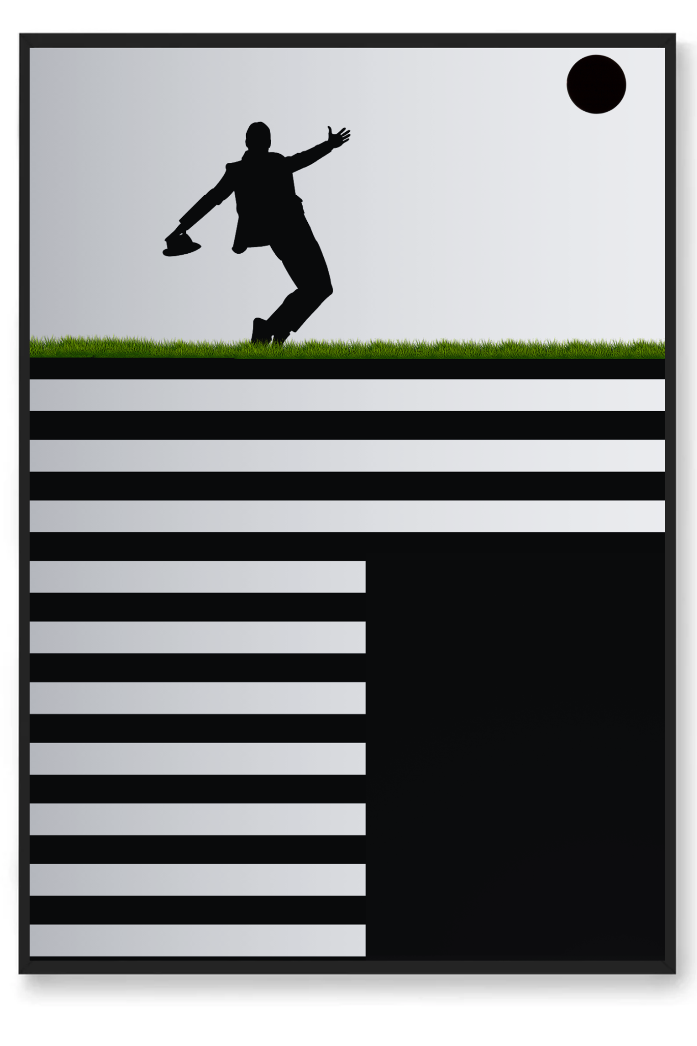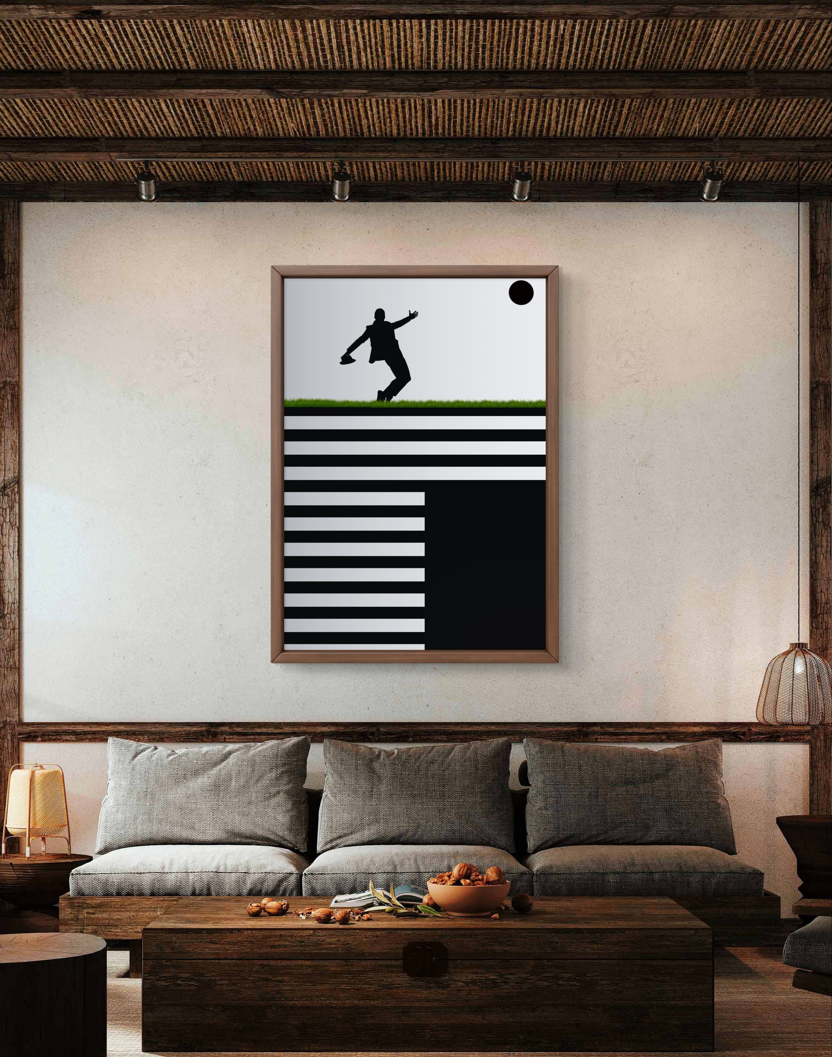 Immerse your space in the beauty of Song, an abstract art print that captures the essence of divine rhythm. This evocative image portrays a black figure of a man gracefully dancing in the grass beneath a black moon, standing firmly on black lines that guide his movement. The monochromatic color scheme of grey and black enhances the print’s dramatic and contemplative mood.