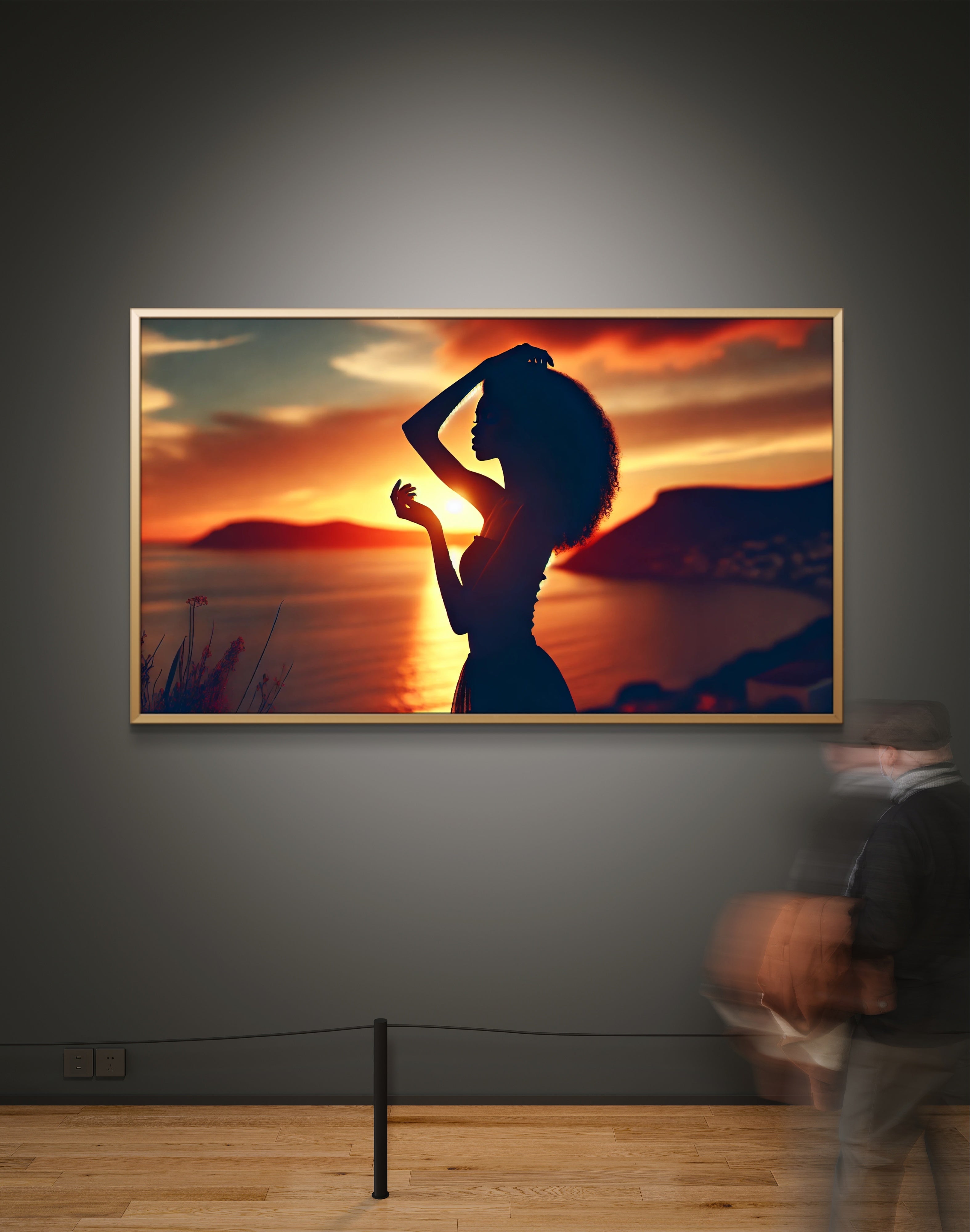 Transform your space with Sunset Glory, a captivating wall art print that beautifully captures a moment of profound serenity. This striking photograph features a woman poised gracefully against the backdrop of a vibrant sunset, where the sky is awash with hues of red, black, yellow, and gold. Her silhouette, illuminated by the setting sun, embodies the essence of letting go and finding peace.