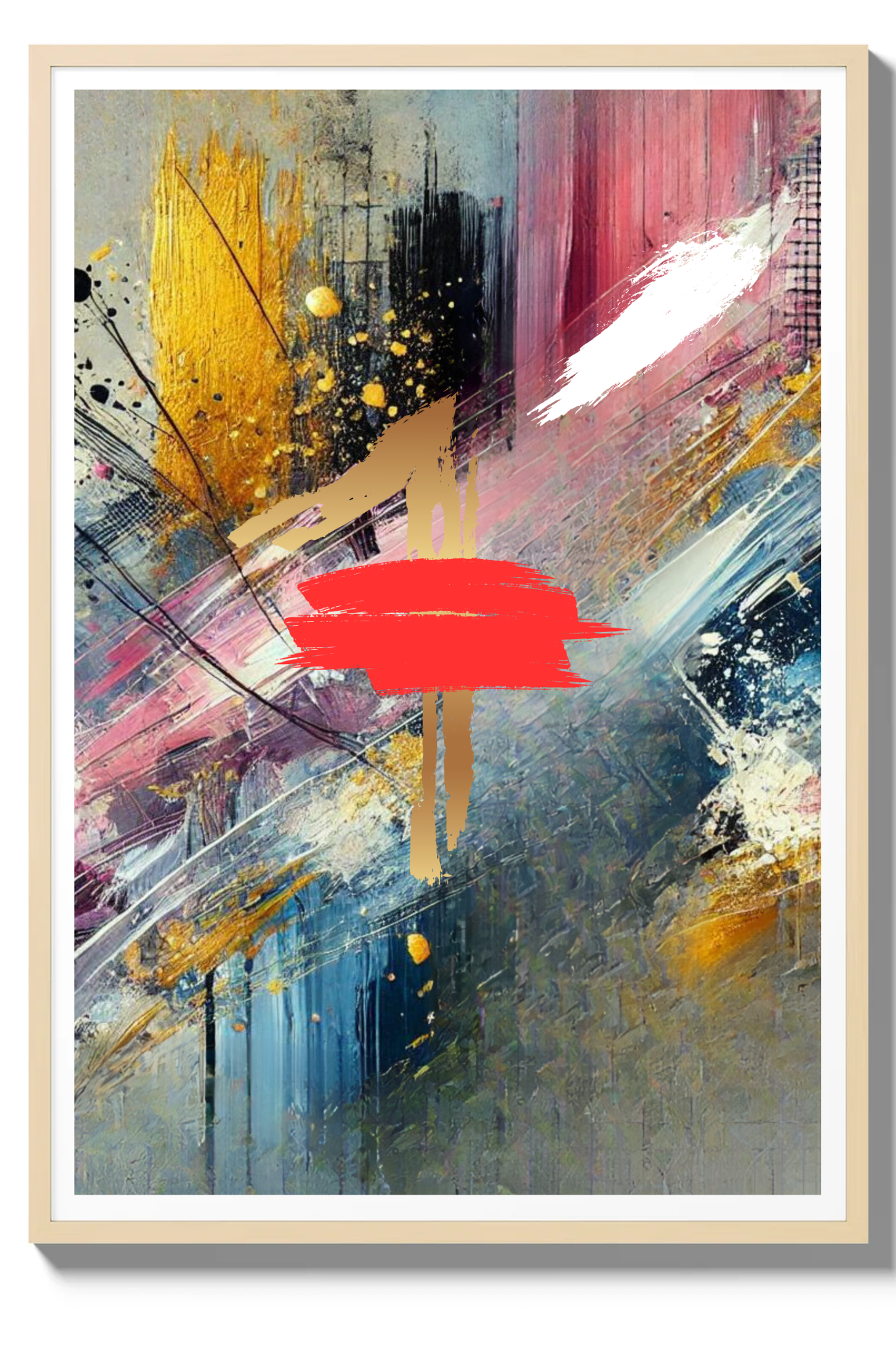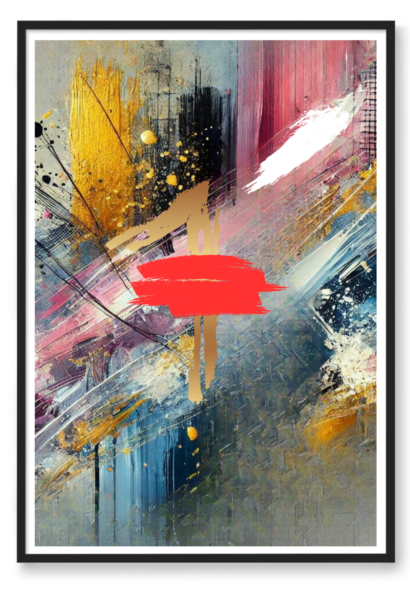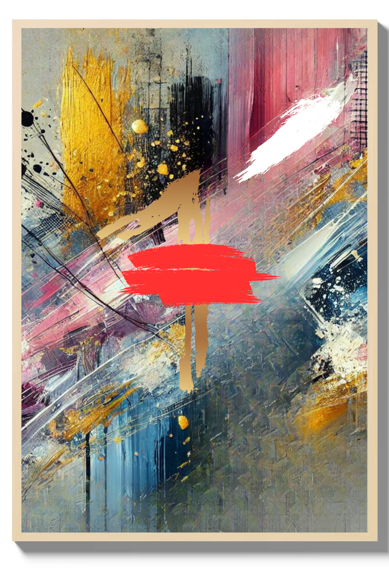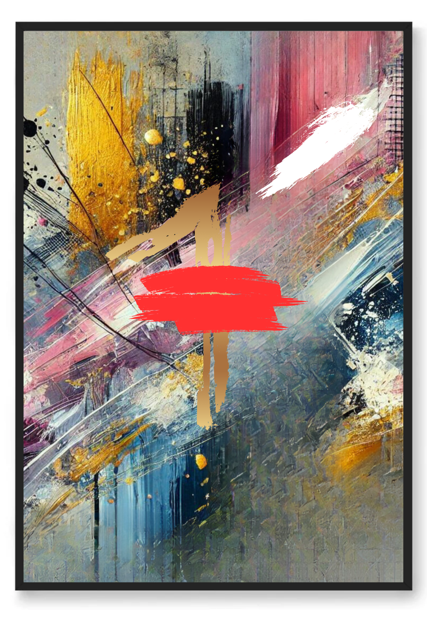 Infuse your space with a powerful symbol of divine protection and spiritual depth with The Blood abstract wall art print. This striking canvas captures a dynamic explosion of colors—black, white, pink, and gold—intertwining and diverging in an intricate dance, with a bold splash of red at its heart.