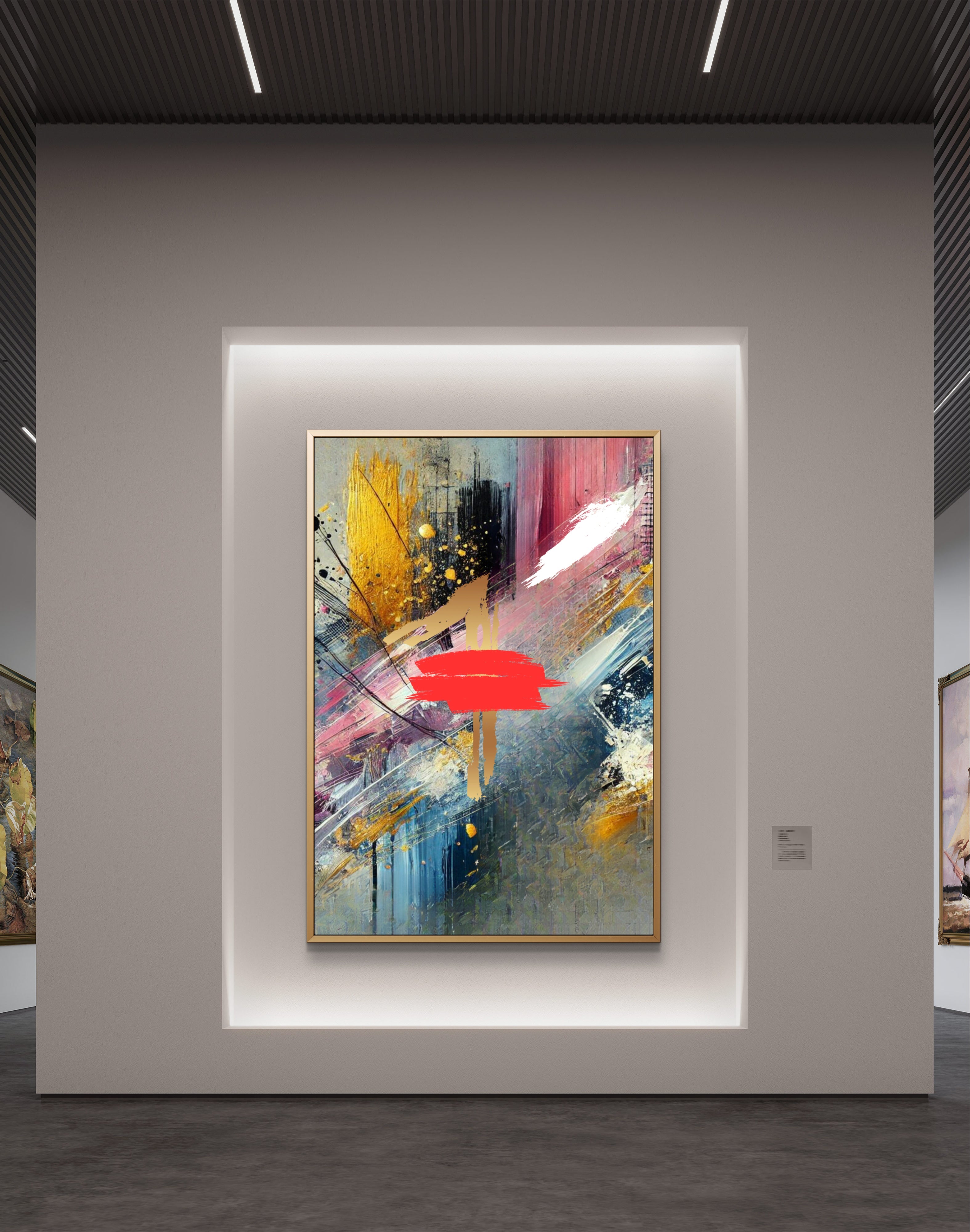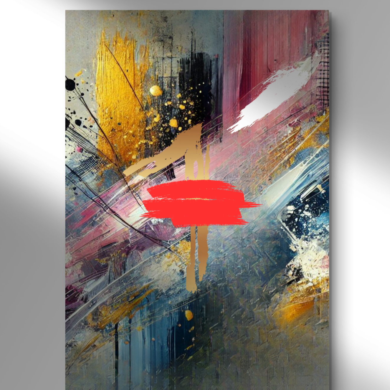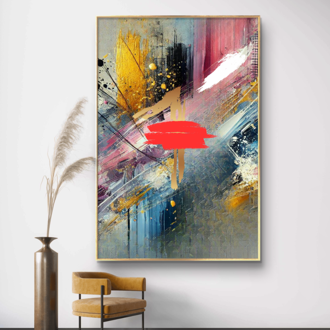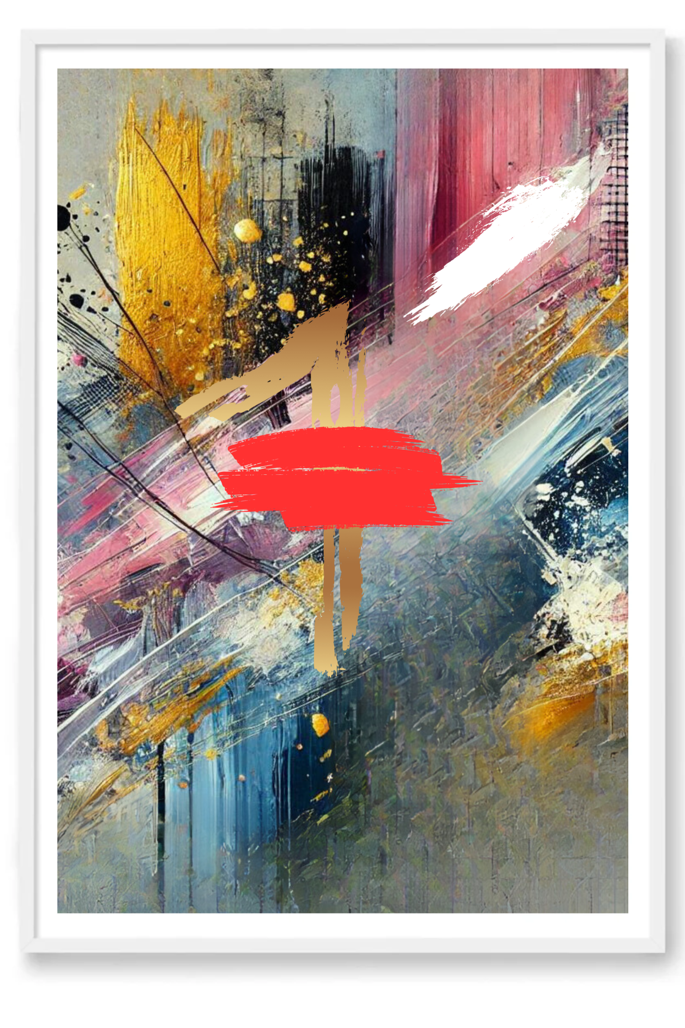 Infuse your space with a powerful symbol of divine protection and spiritual depth with The Blood abstract wall art print. This striking canvas captures a dynamic explosion of colors—black, white, pink, and gold—intertwining and diverging in an intricate dance, with a bold splash of red at its heart.