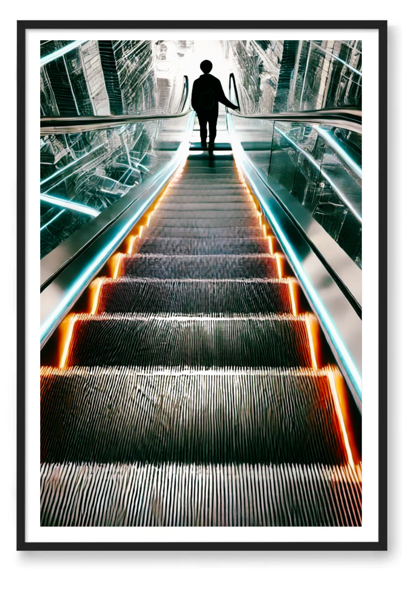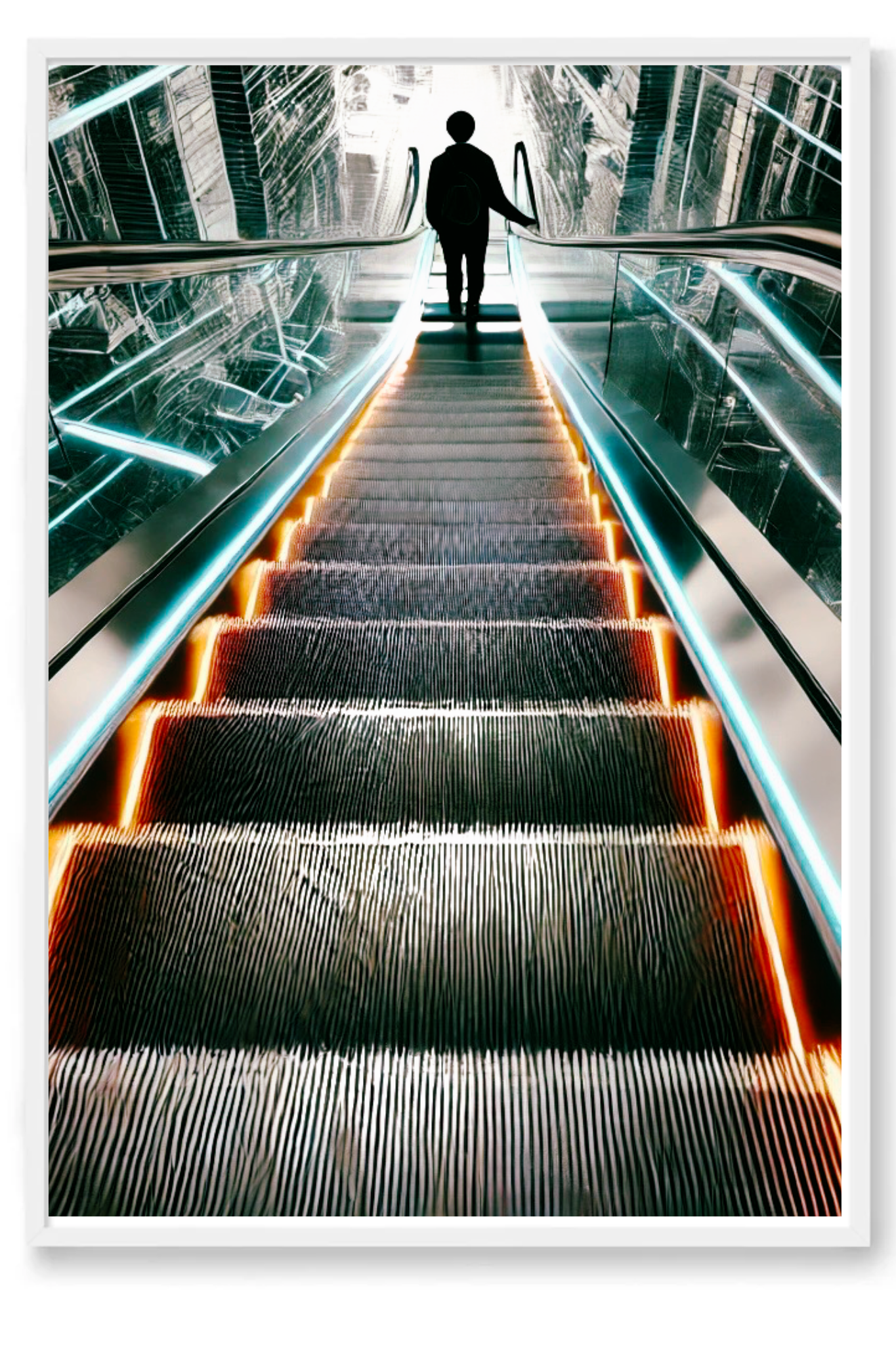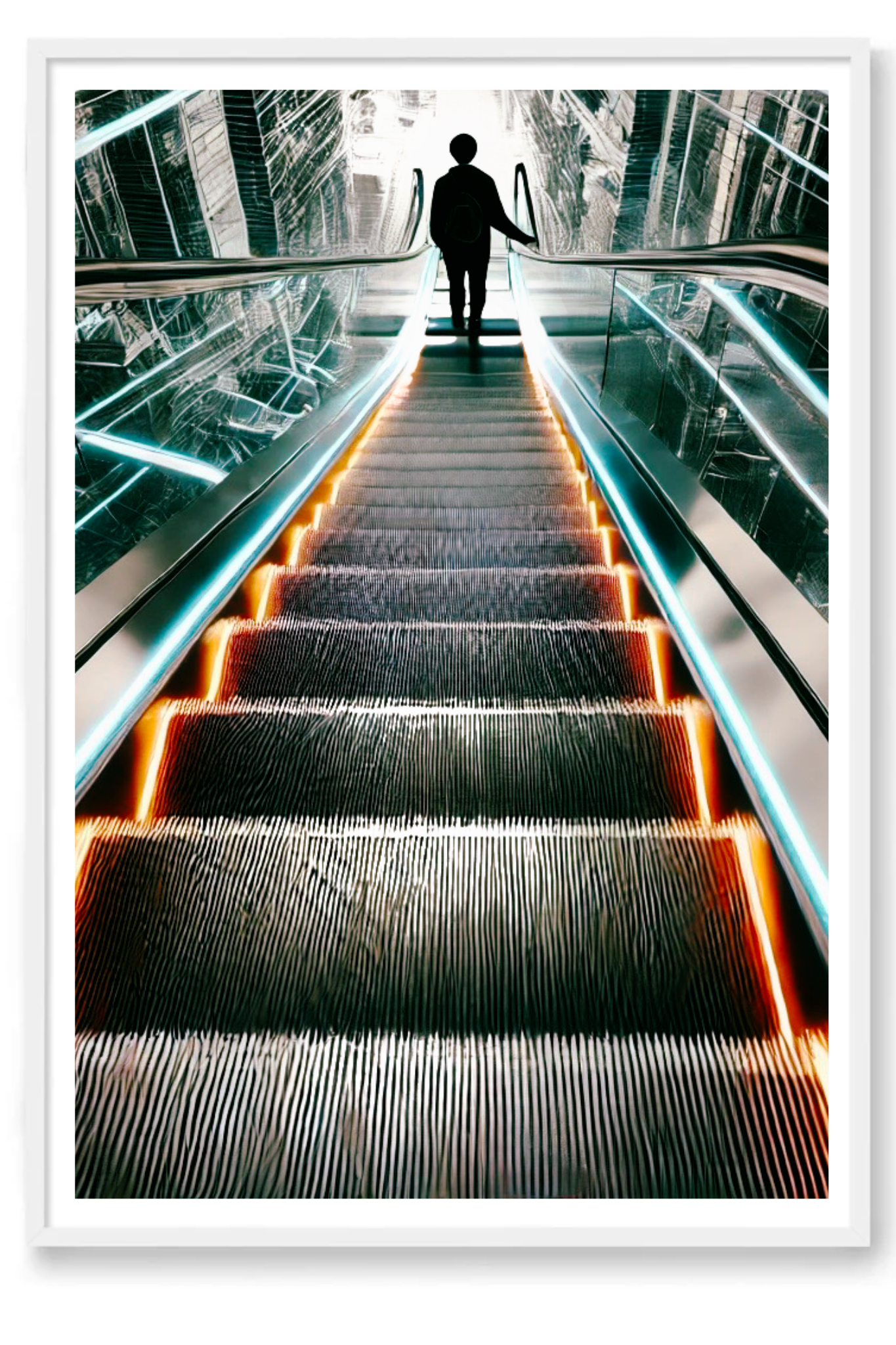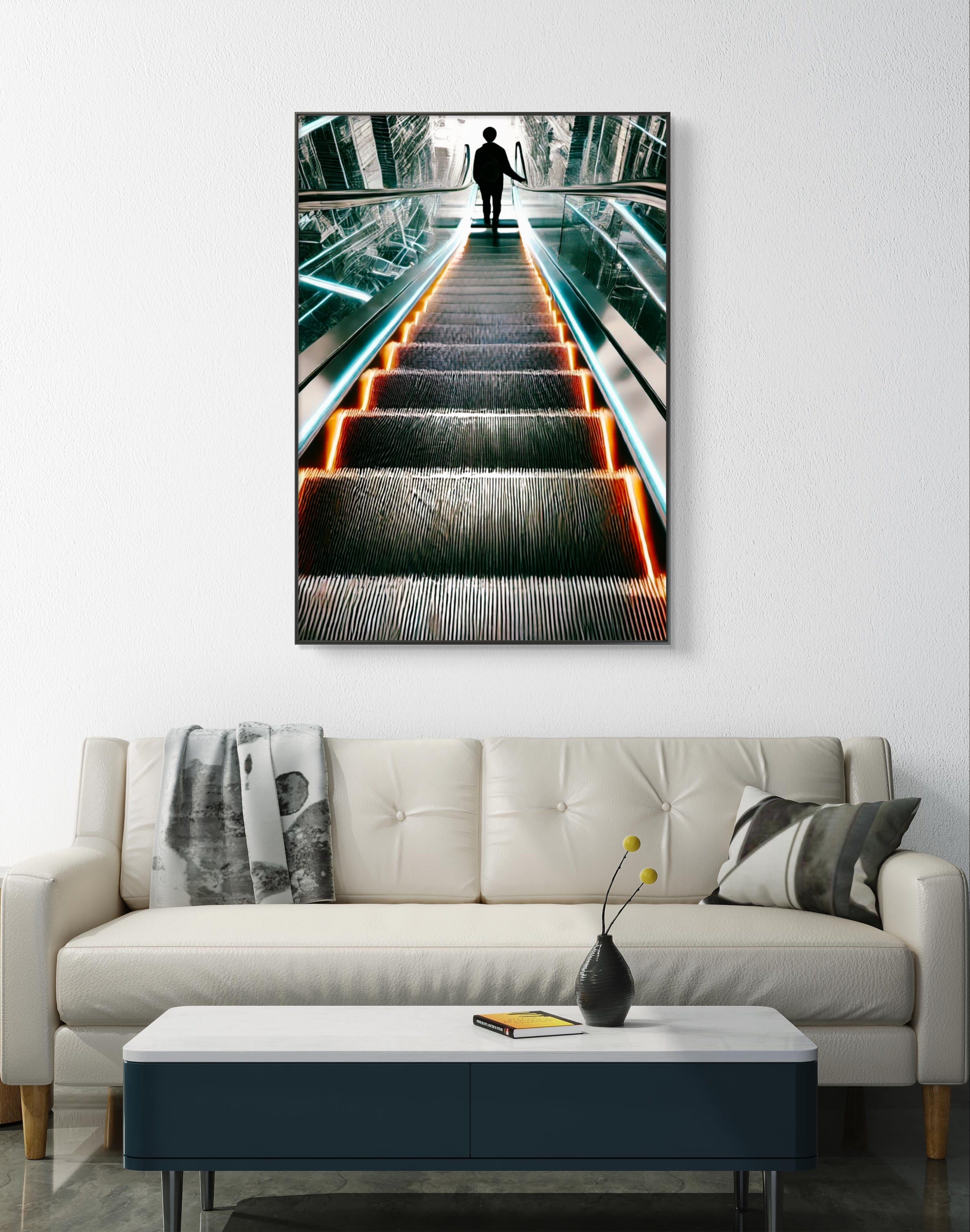 Unveil the beauty in transitions with The Upside of Down, a captivating art print that epitomizes the glory of descent as a pathway to elevation. This powerful photograph captures a momentous instant as a person descends an escalator into a radiant, luminous first floor. The escalator, depicted in striking shades of bright orange and blue, stands out boldly against a backdrop of muted greys and blacks, conveying a futuristic and visionary feel.
