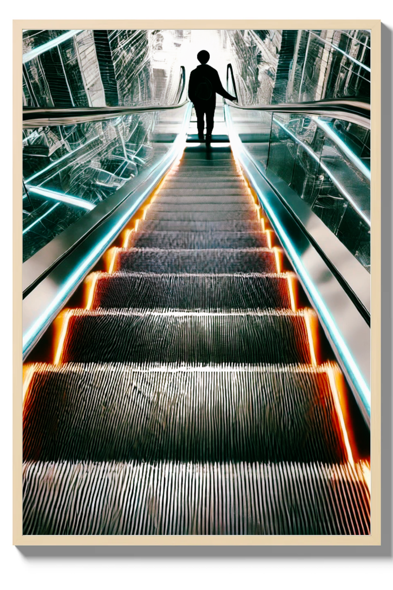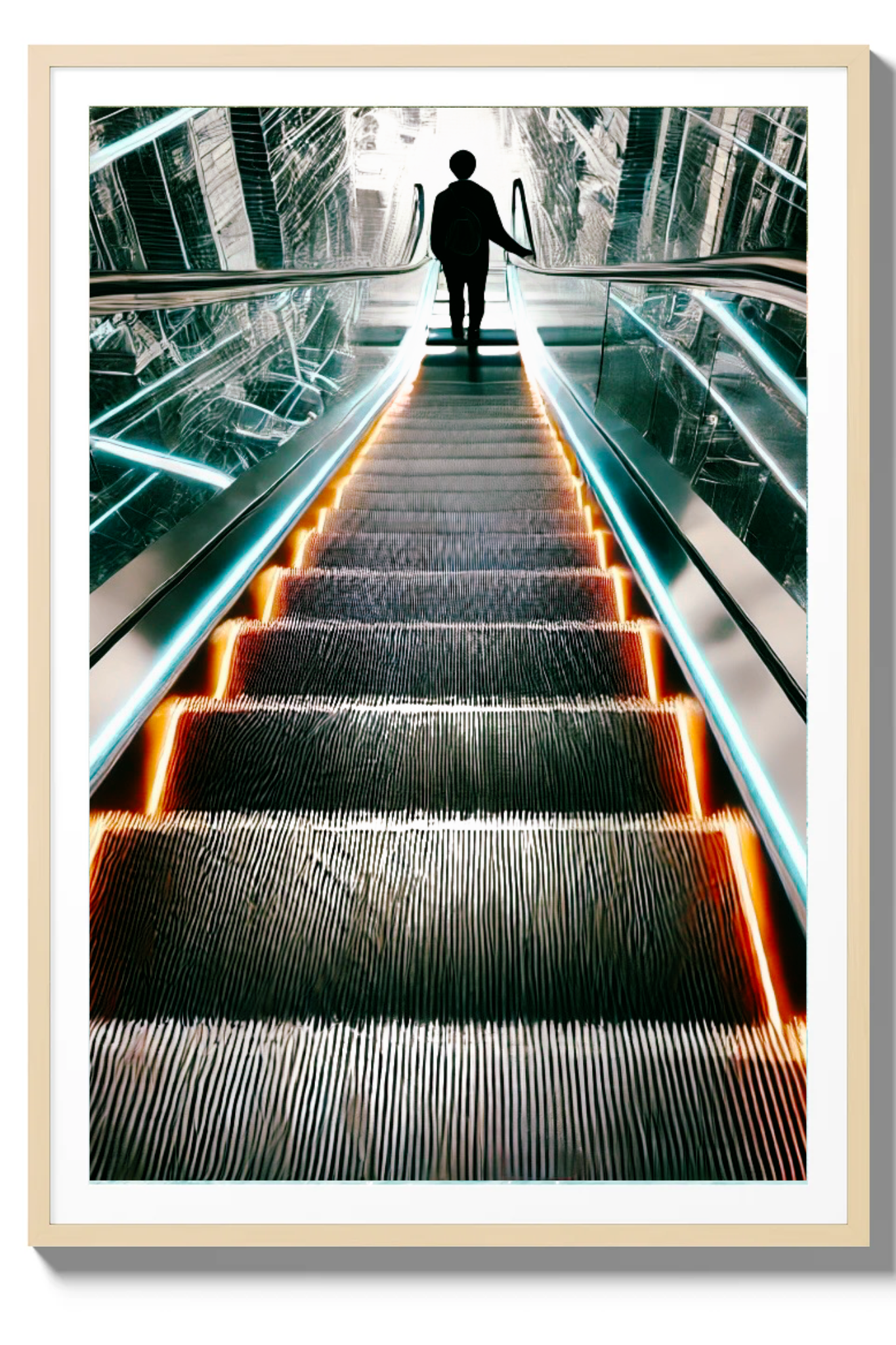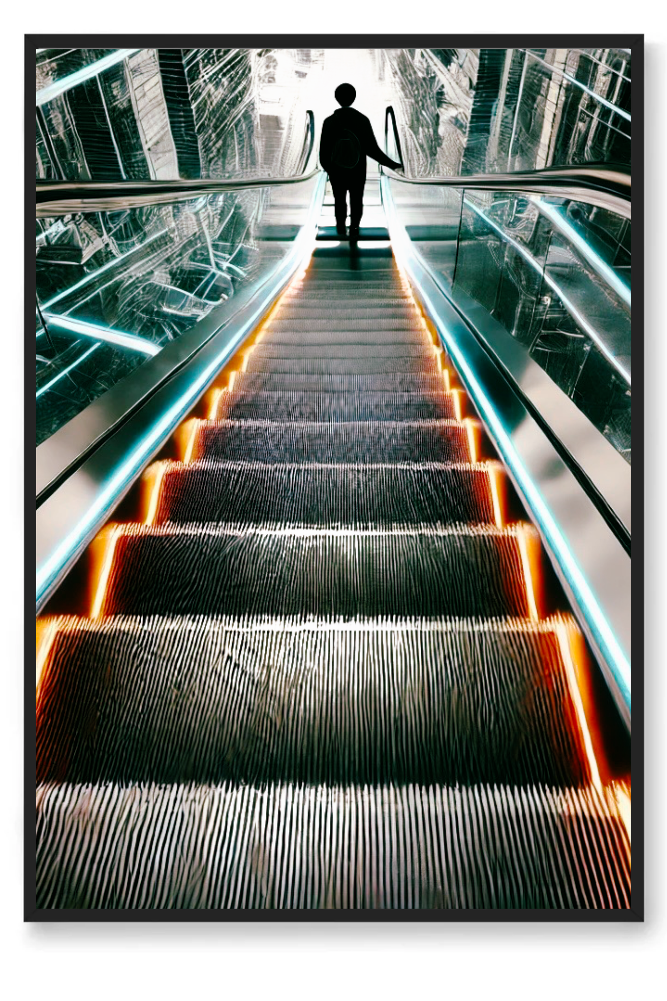 Unveil the beauty in transitions with The Upside of Down, a captivating art print that epitomizes the glory of descent as a pathway to elevation. This powerful photograph captures a momentous instant as a person descends an escalator into a radiant, luminous first floor. The escalator, depicted in striking shades of bright orange and blue, stands out boldly against a backdrop of muted greys and blacks, conveying a futuristic and visionary feel.