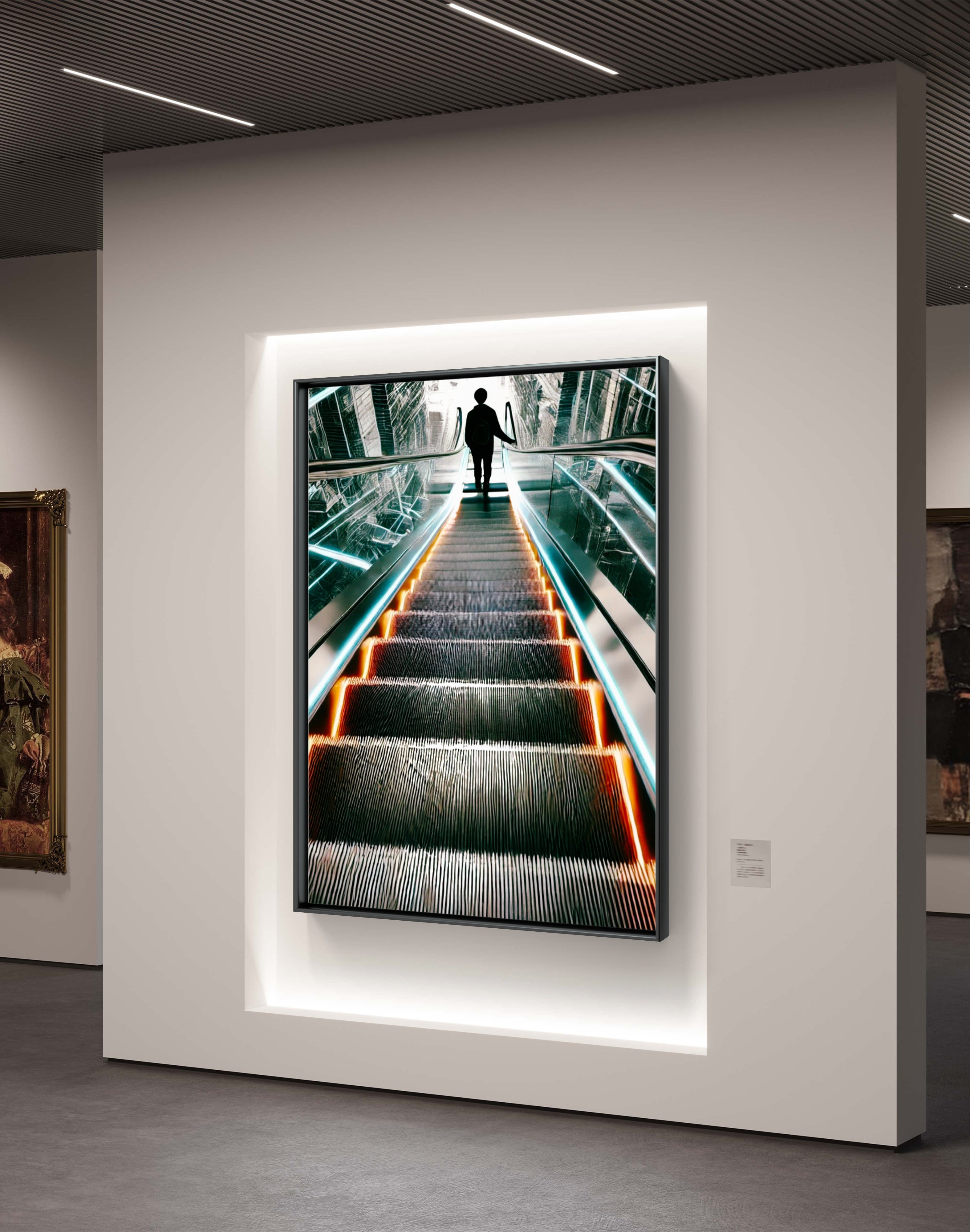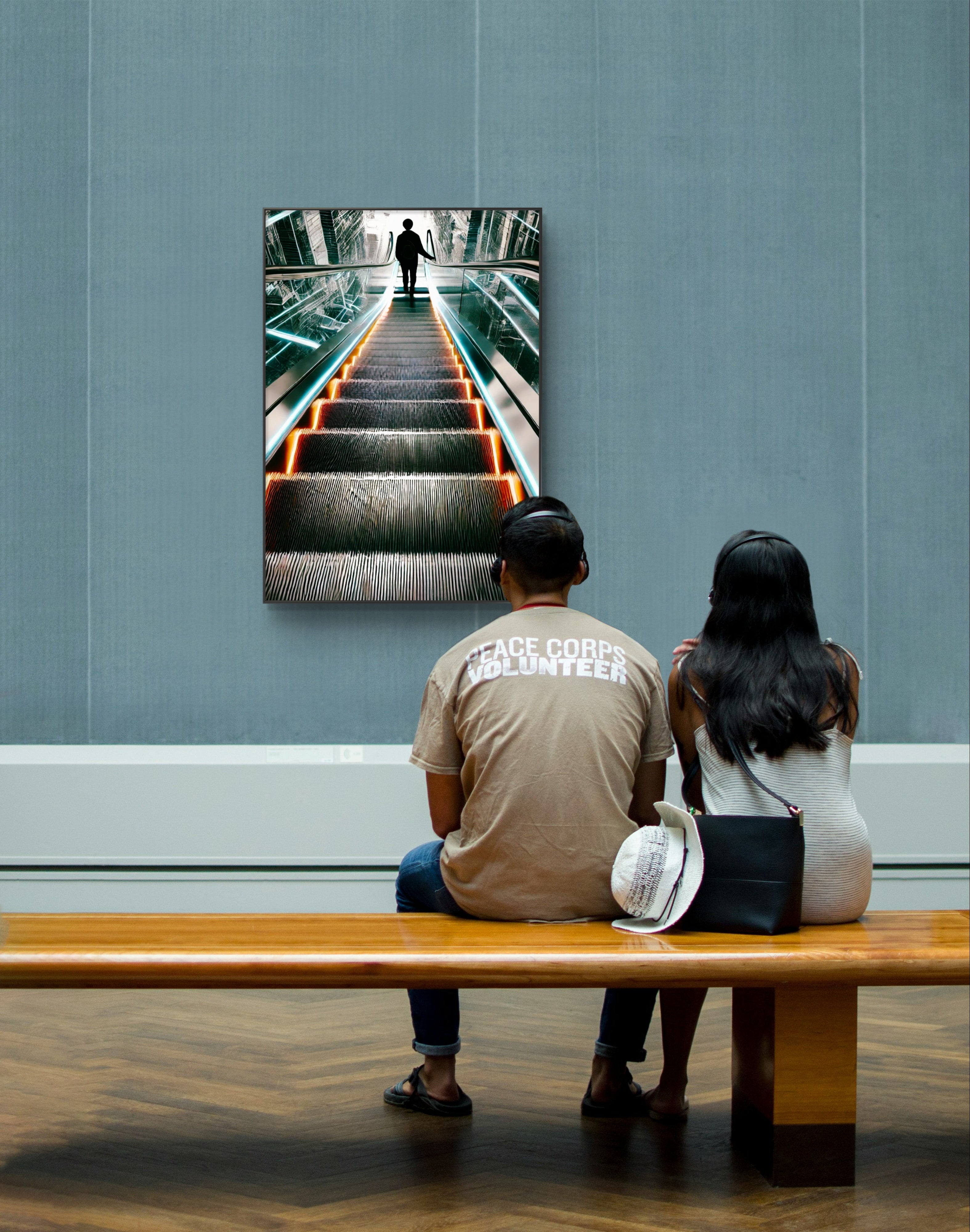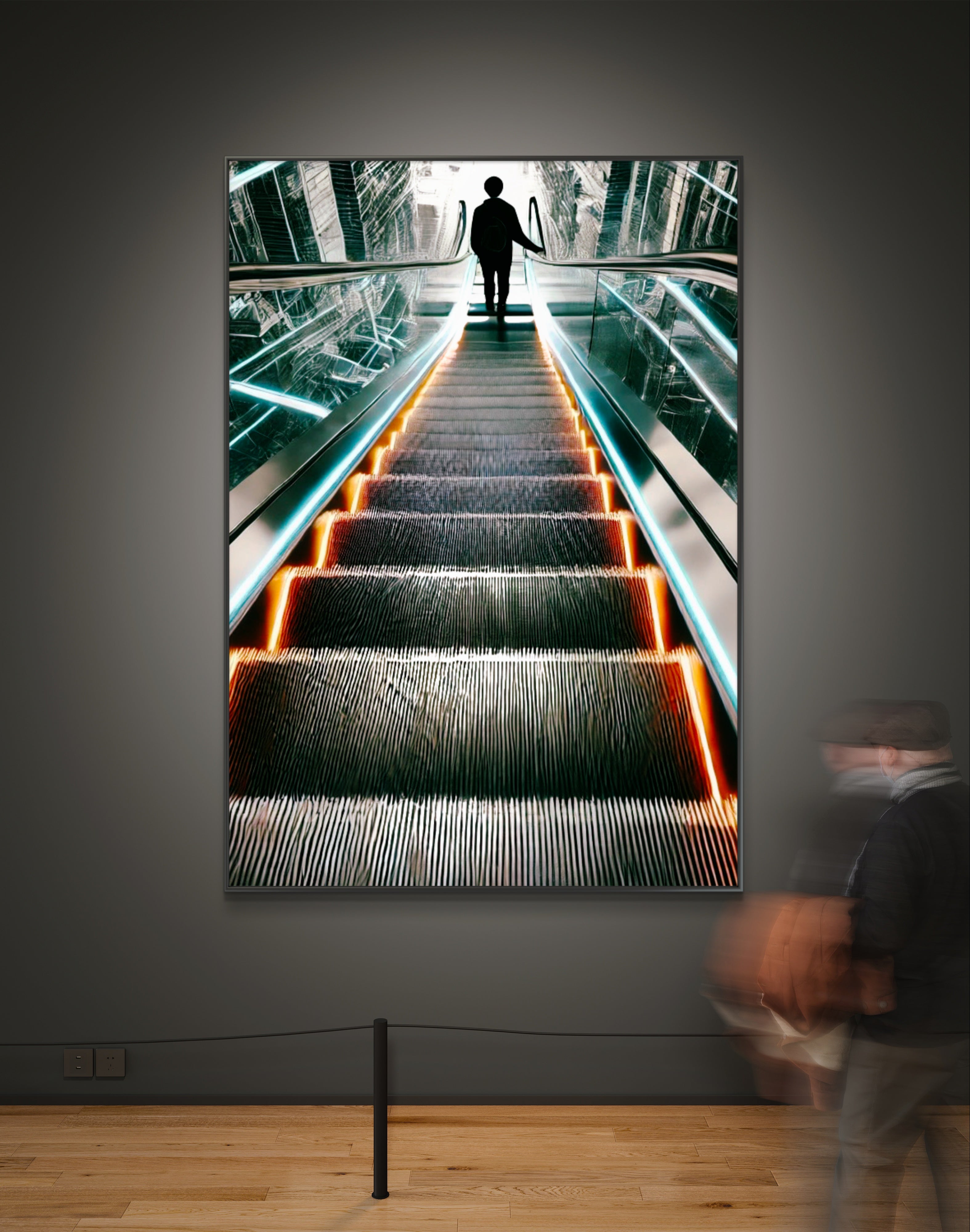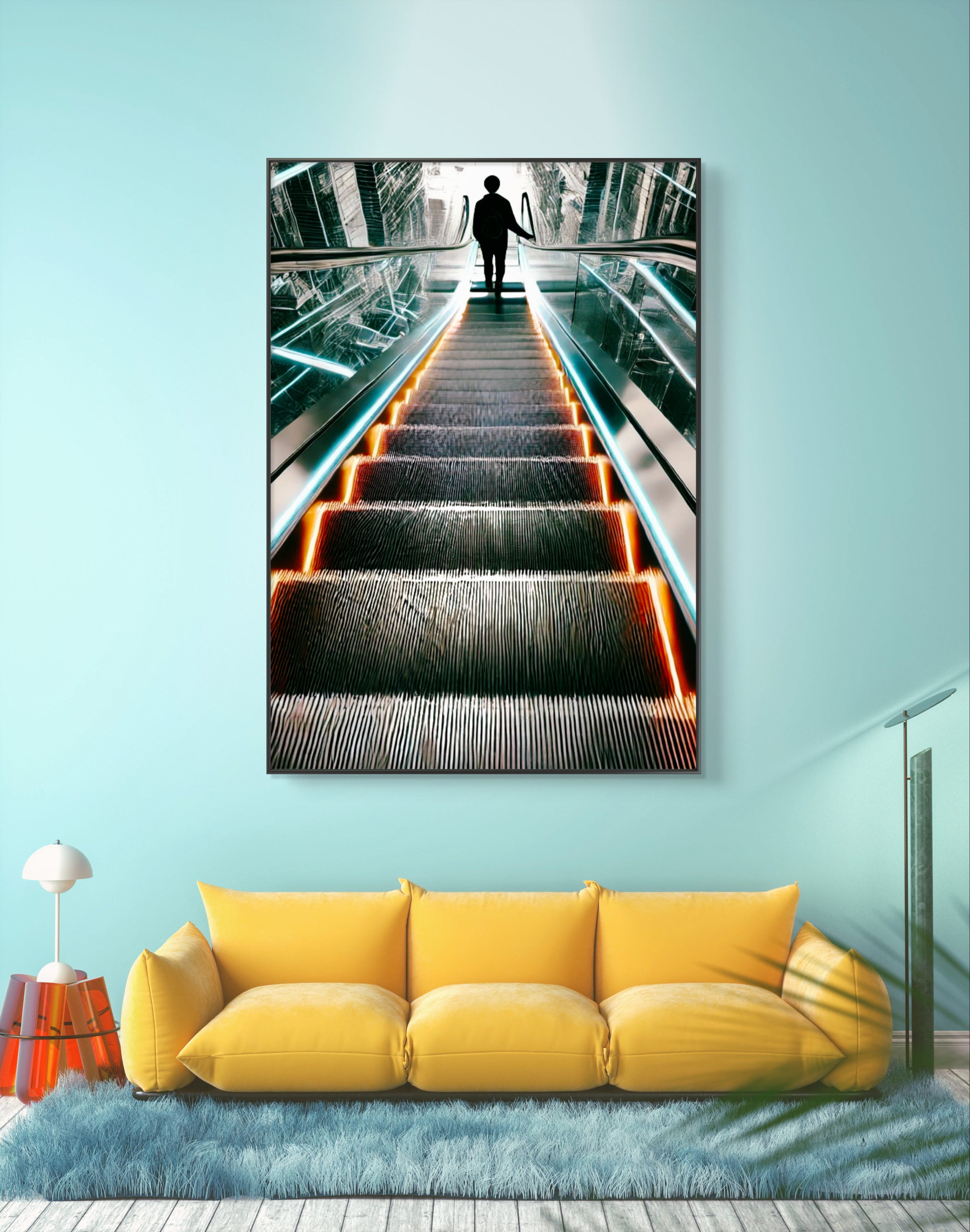 Unveil the beauty in transitions with The Upside of Down, a captivating art print that epitomizes the glory of descent as a pathway to elevation. This powerful photograph captures a momentous instant as a person descends an escalator into a radiant, luminous first floor. The escalator, depicted in striking shades of bright orange and blue, stands out boldly against a backdrop of muted greys and blacks, conveying a futuristic and visionary feel.