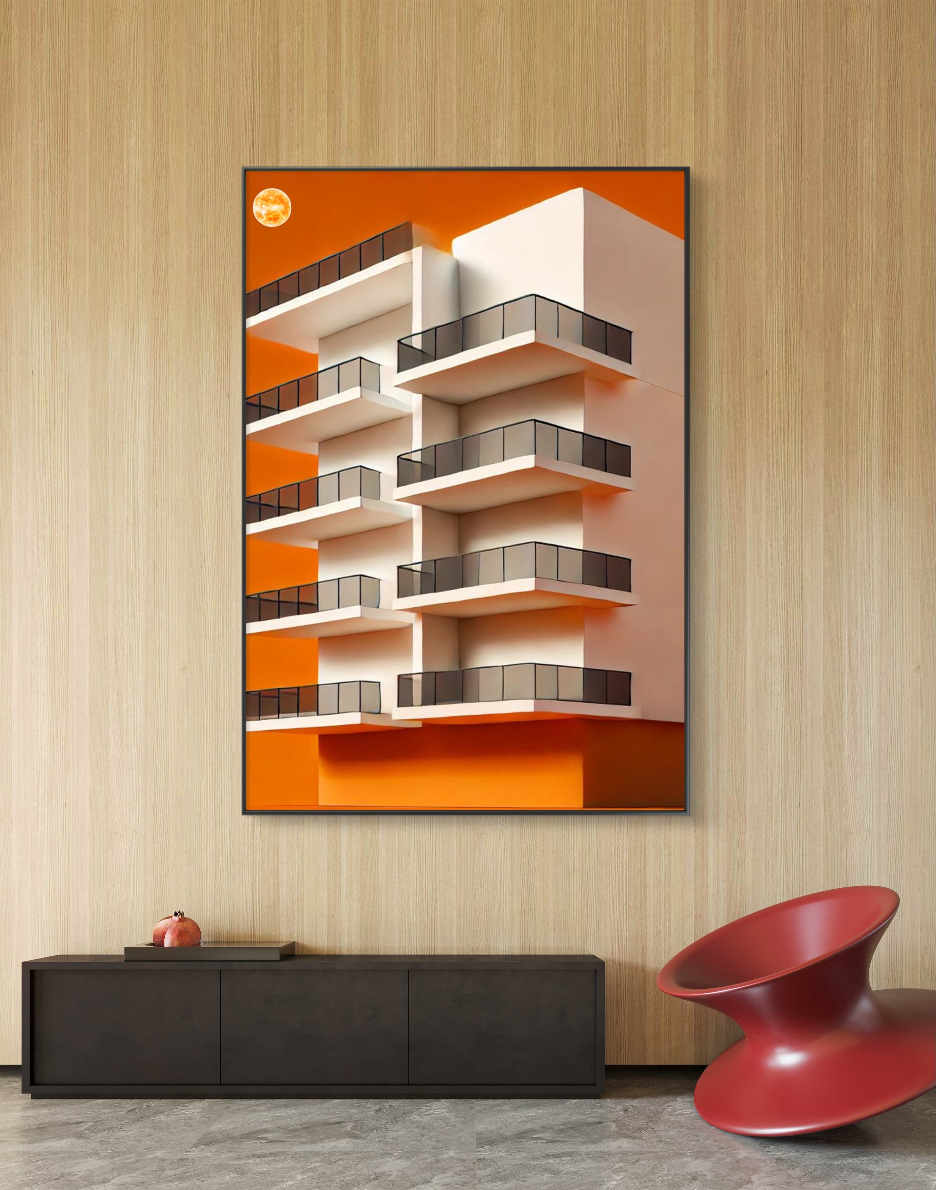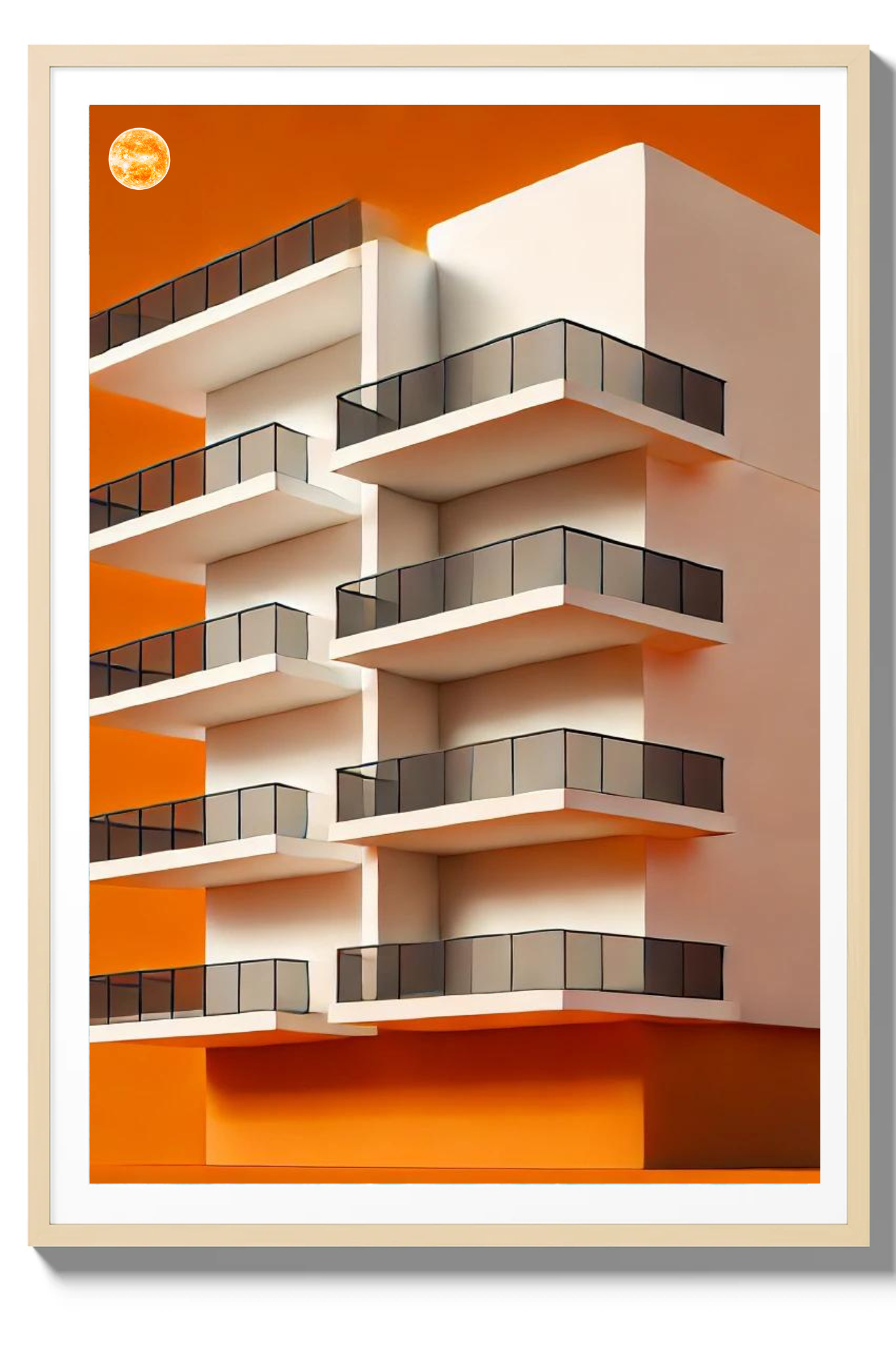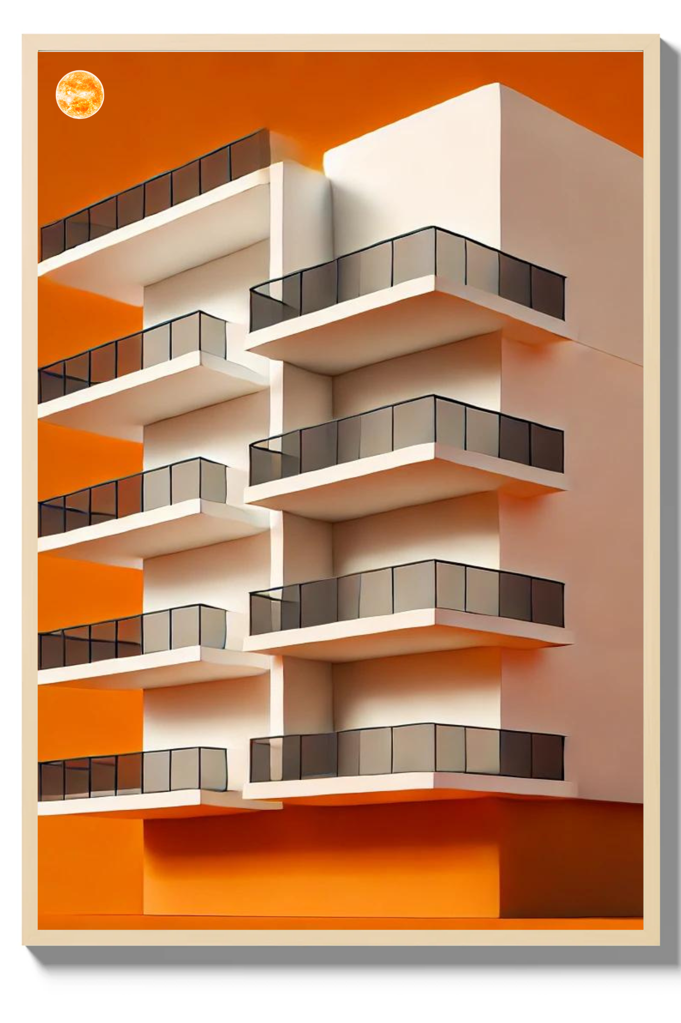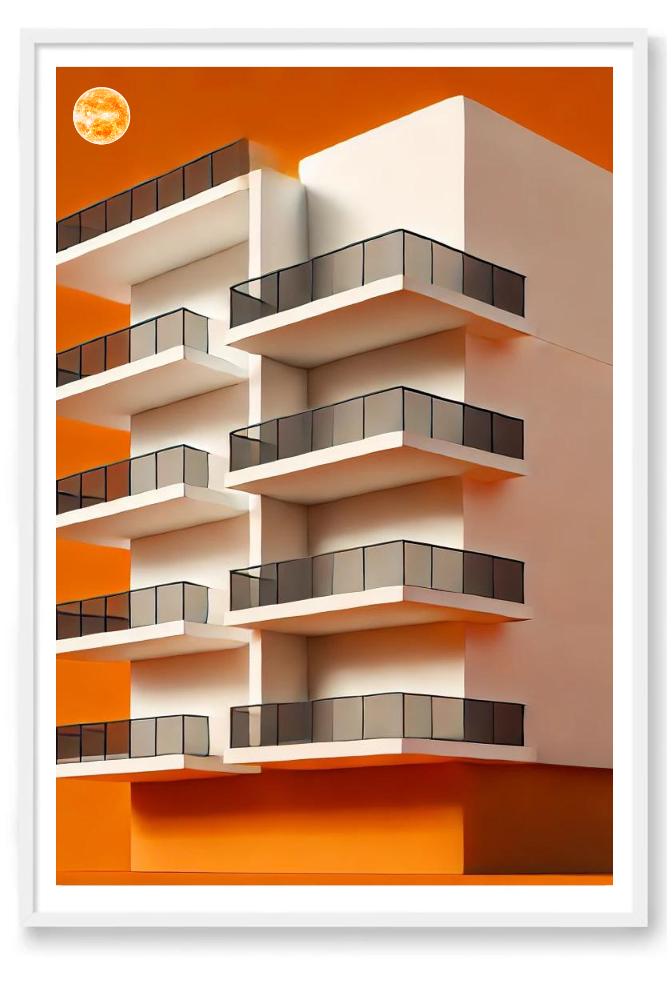 Illuminate your space with the compelling message of Under the Sun, a striking art print that captures the essence of resilience and enduring faith. This powerful image depicts a tall, multi-layered building set against a radiant orange background, with a glowing orangish sun casting its warm light from above.
